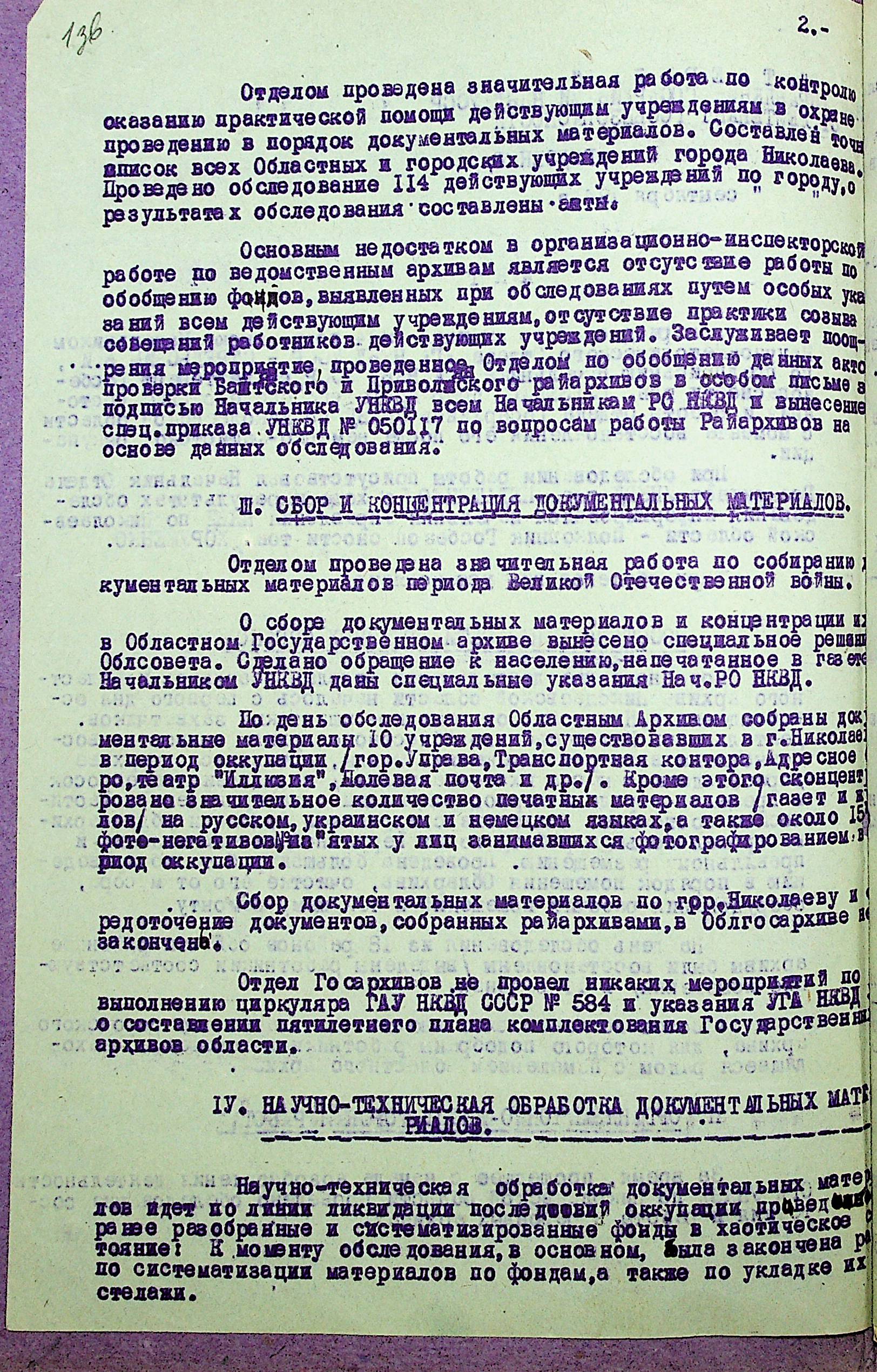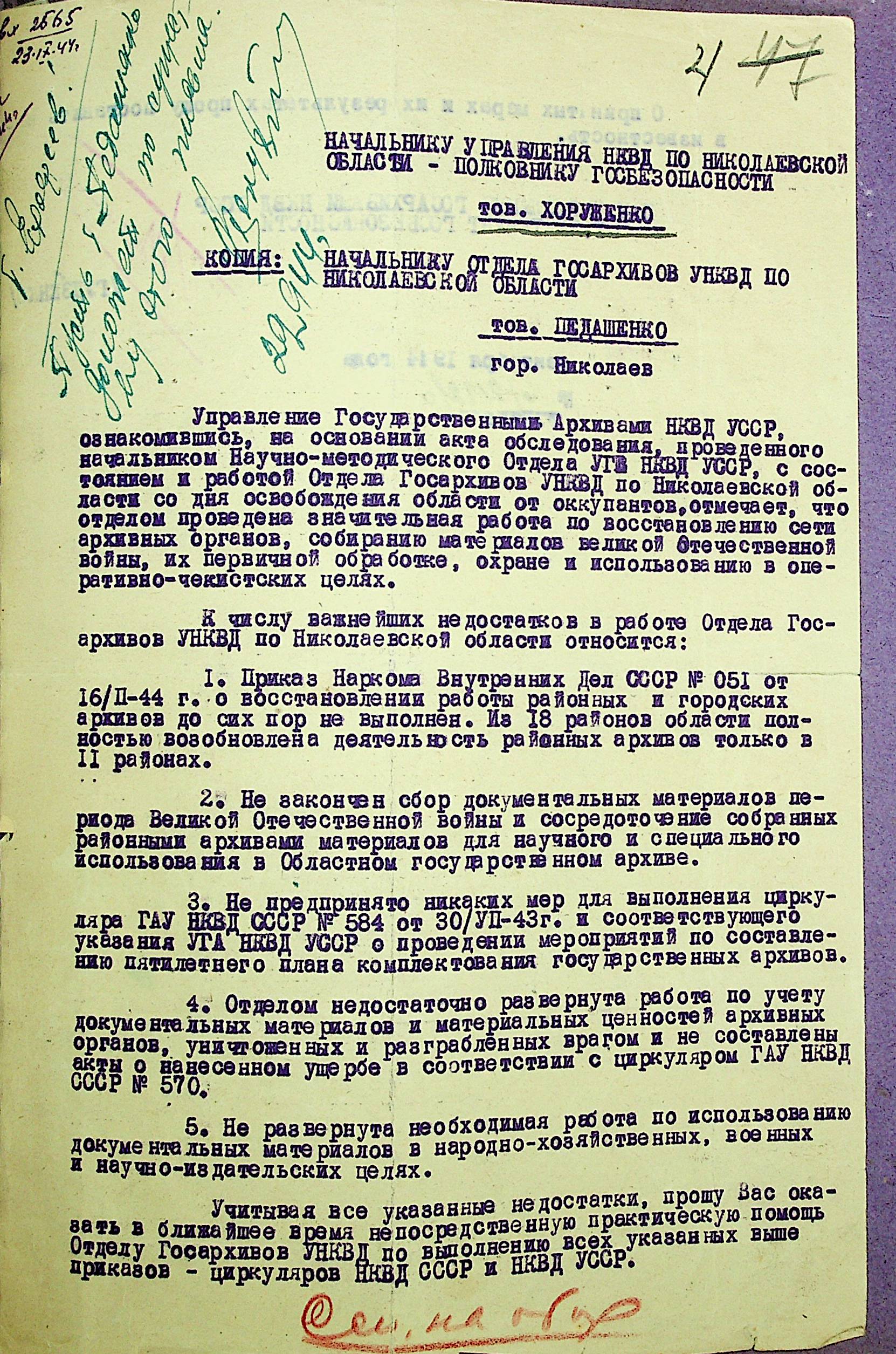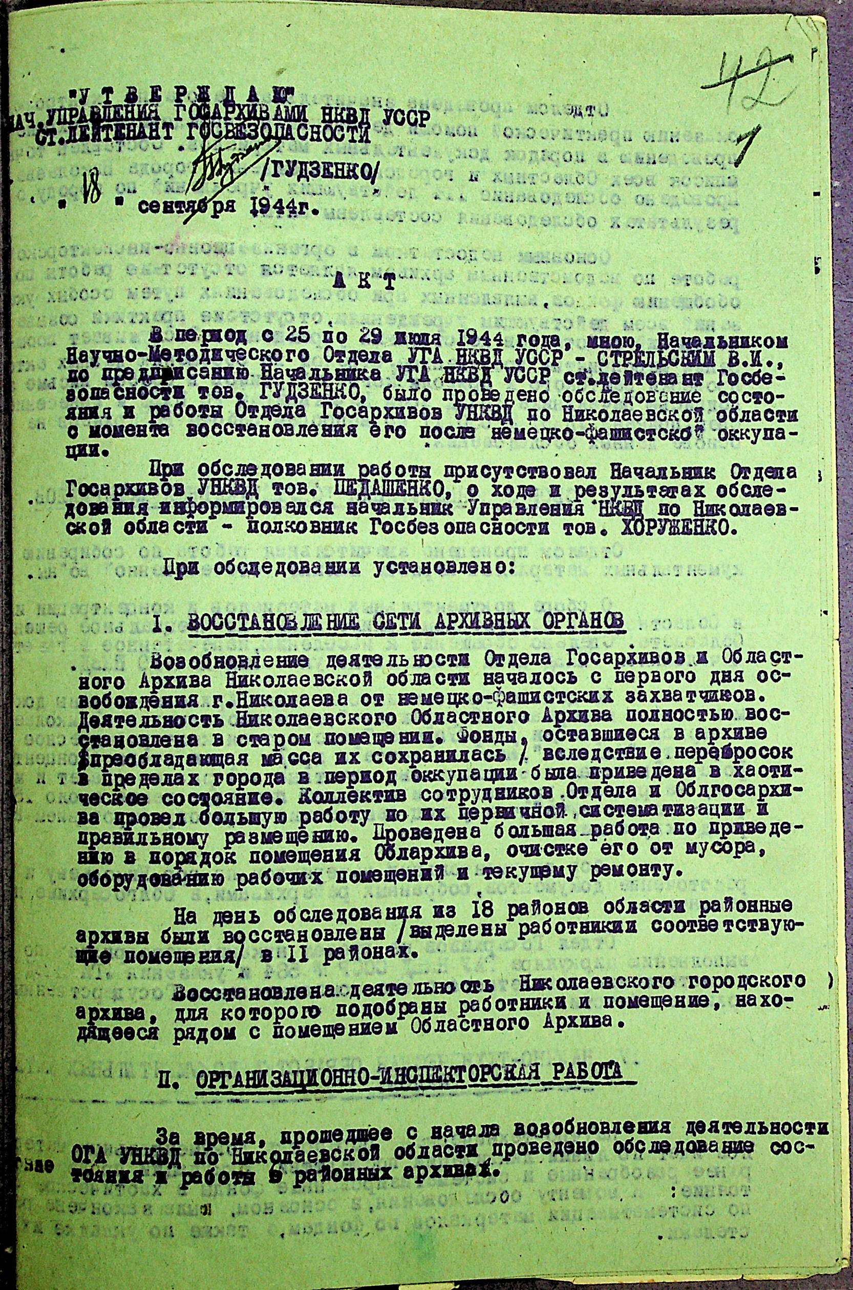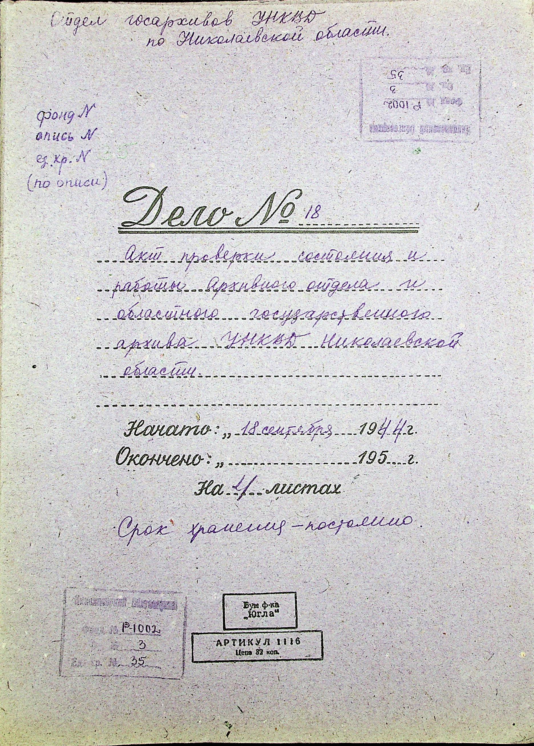 • • • • Справа № 35 “Акти перевірки стану та роботи архівного відділу та обласного державного архіву УНКВС Миколаївської області”