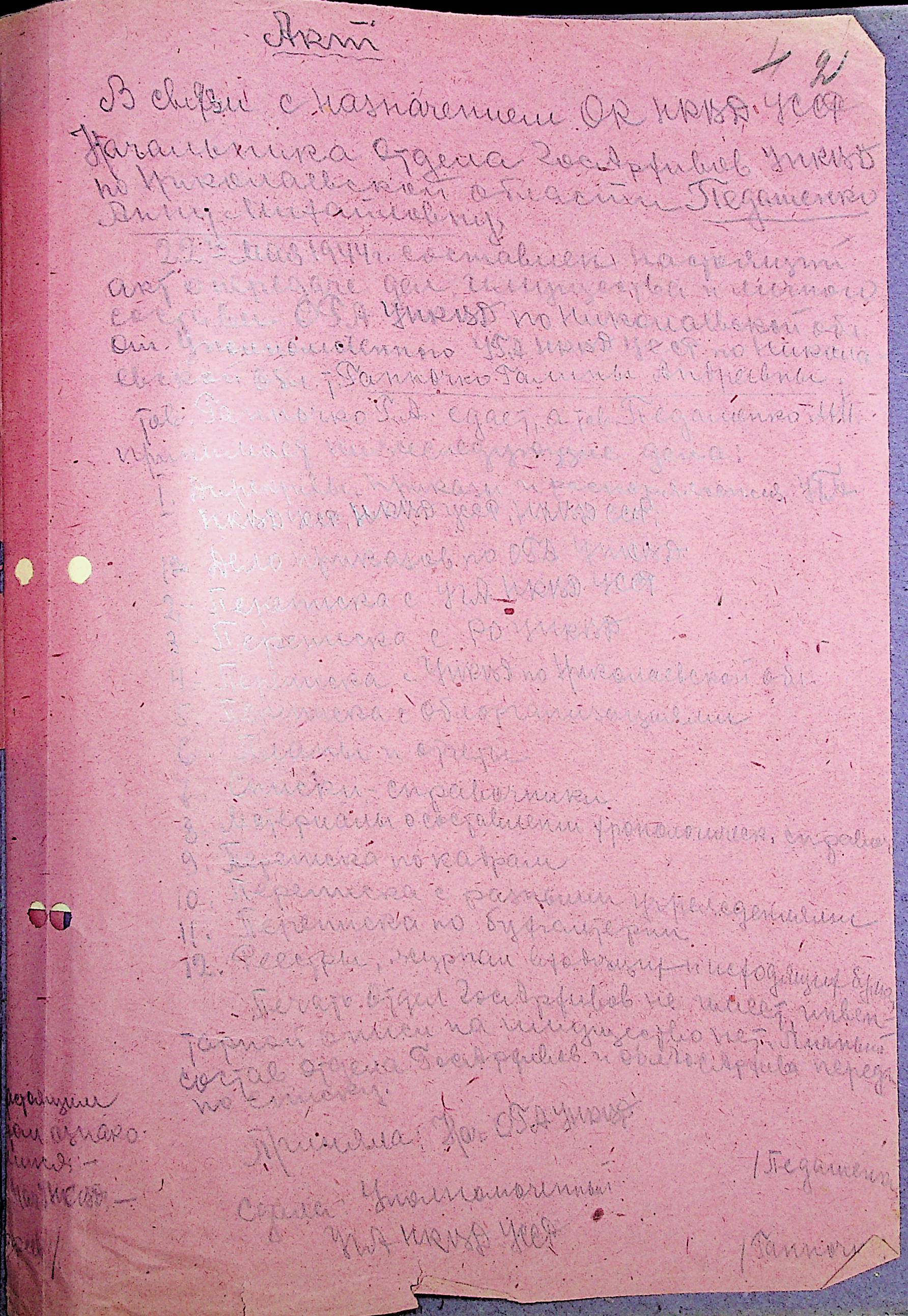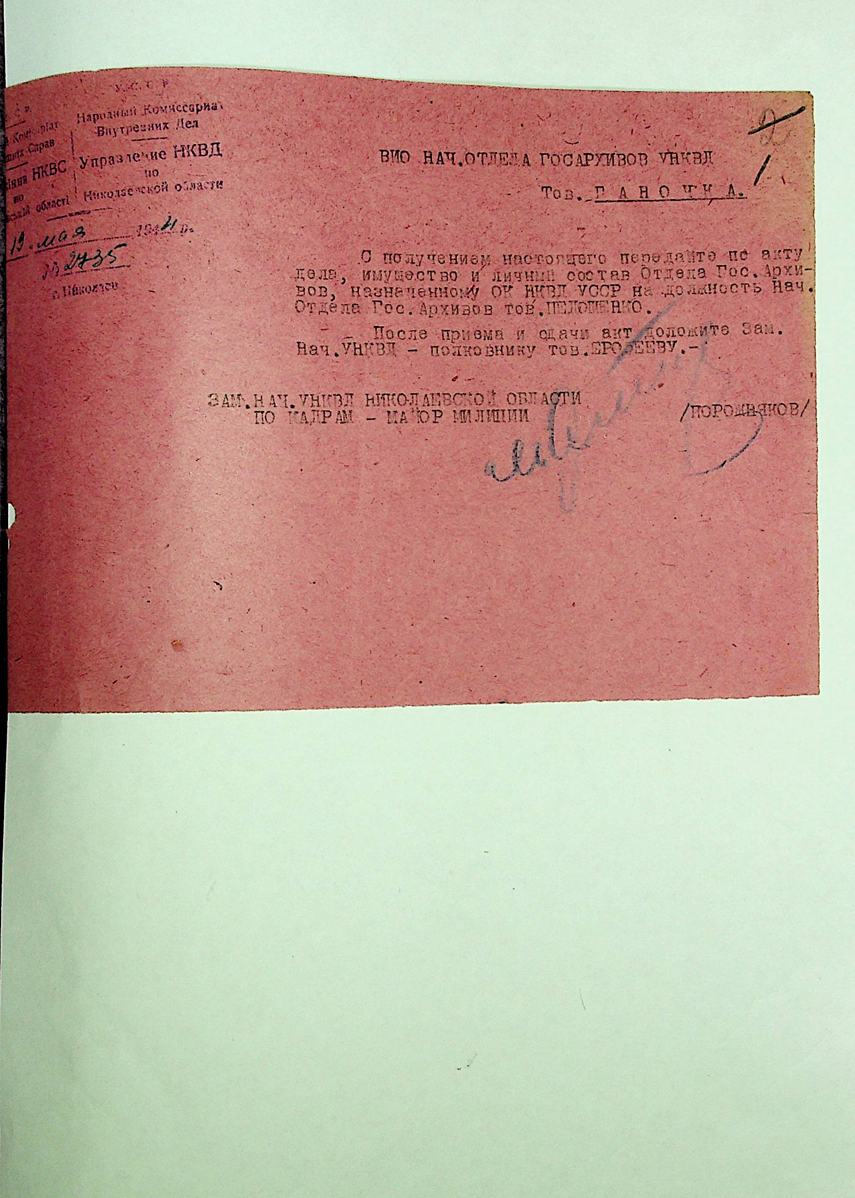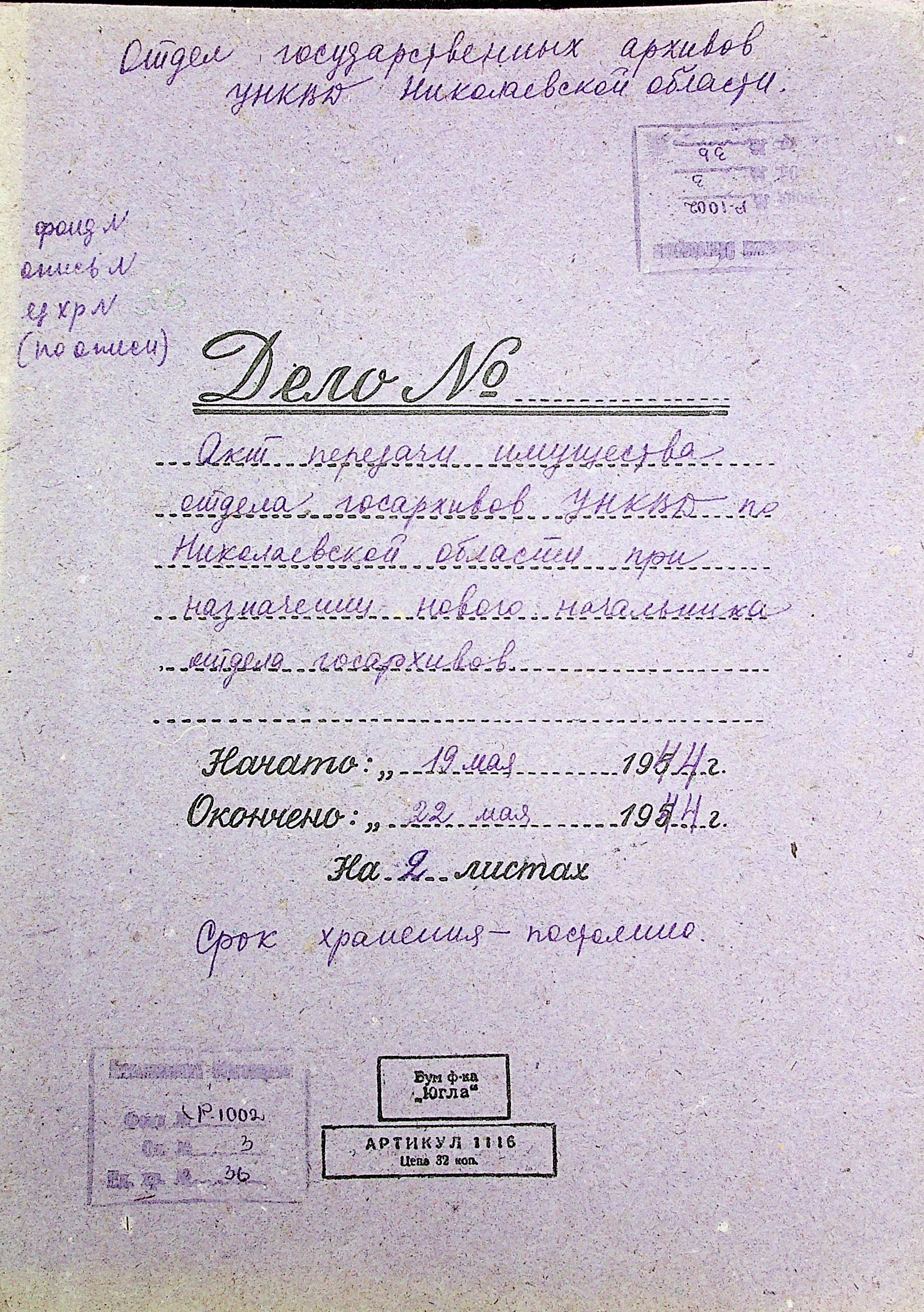 • • • • Справа № 36 “Акт передачі майна відділу державних архівів УНКВС у Миколаївській області при призначенні нового начальника відділу державних архівів”