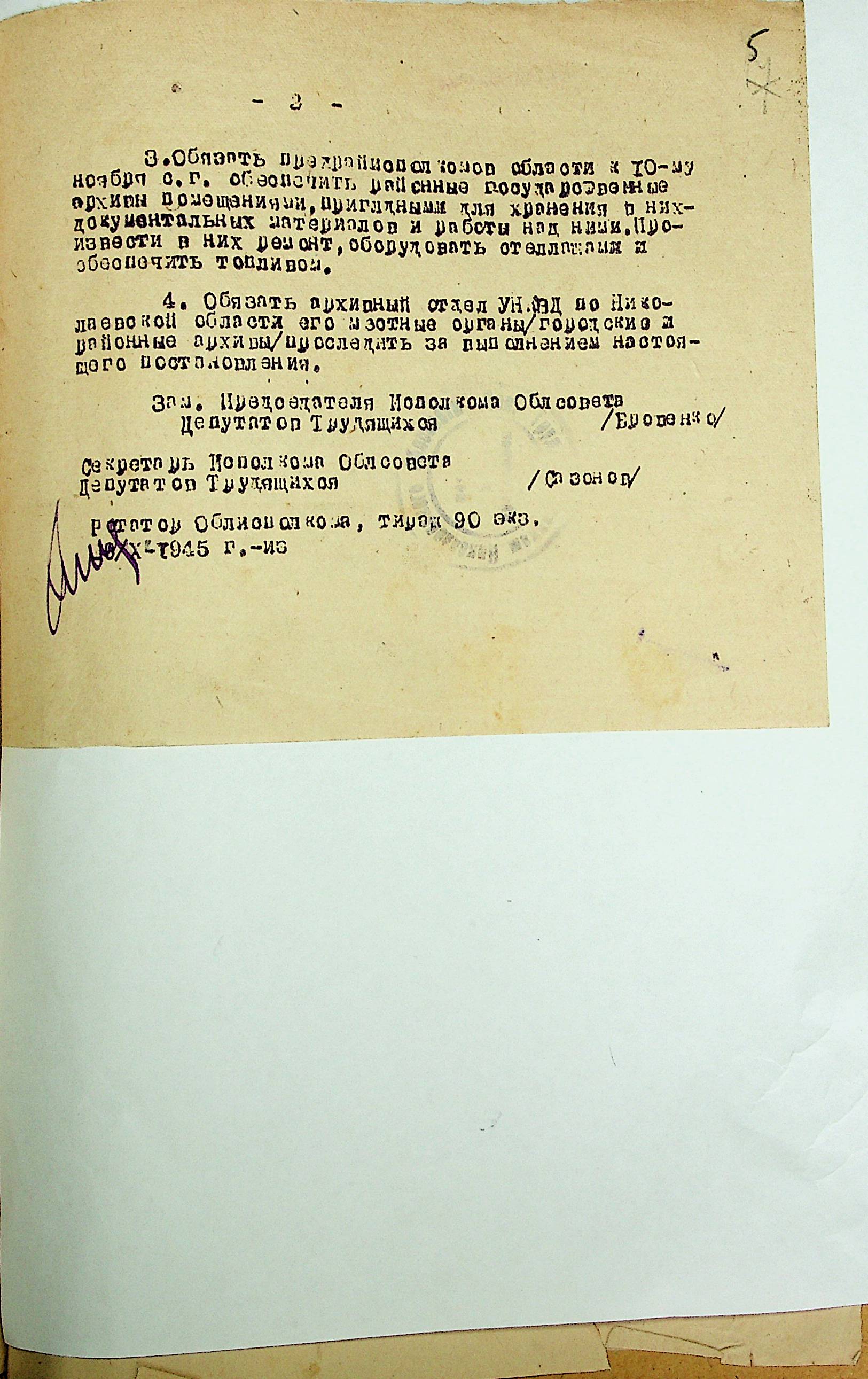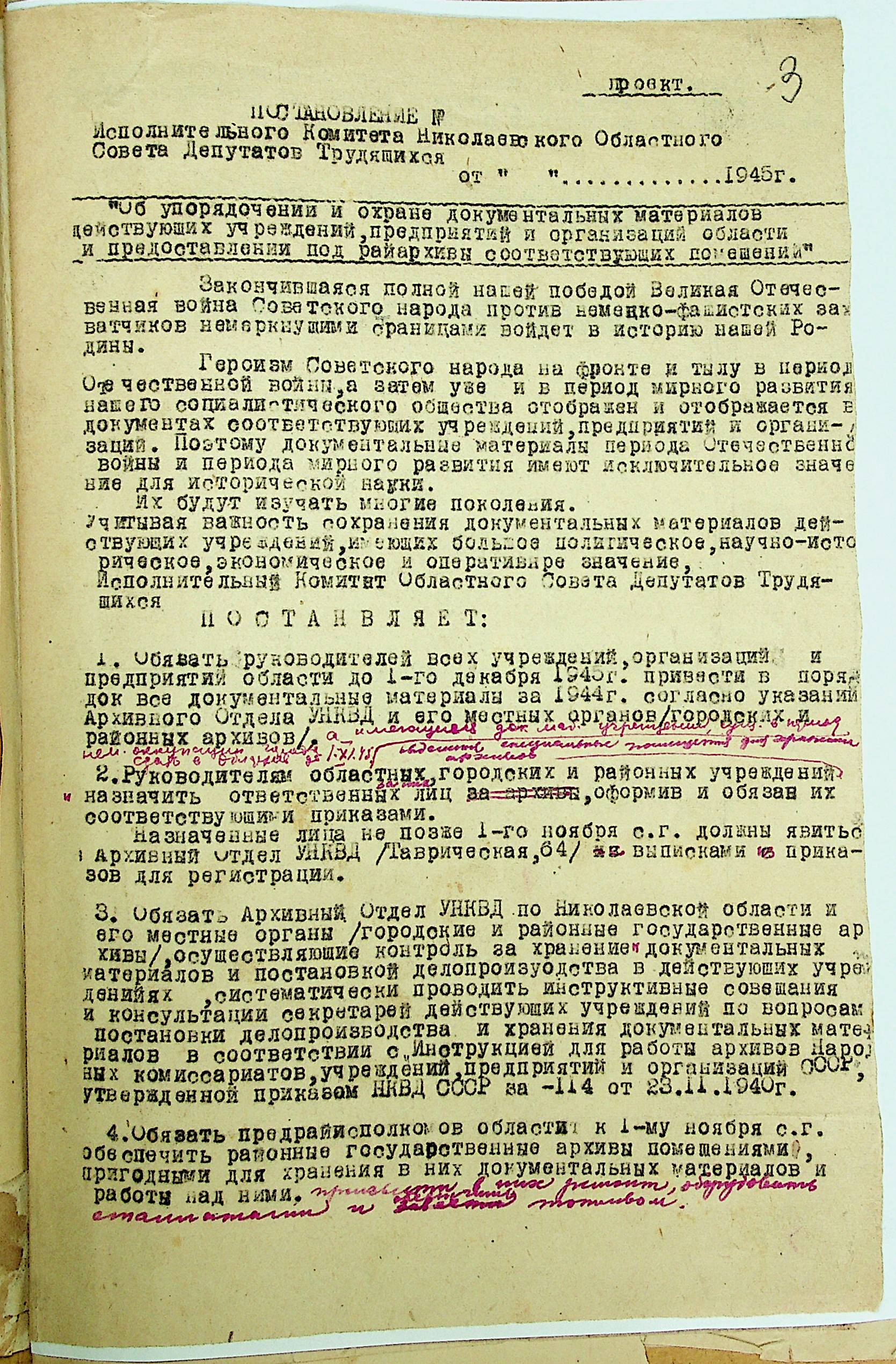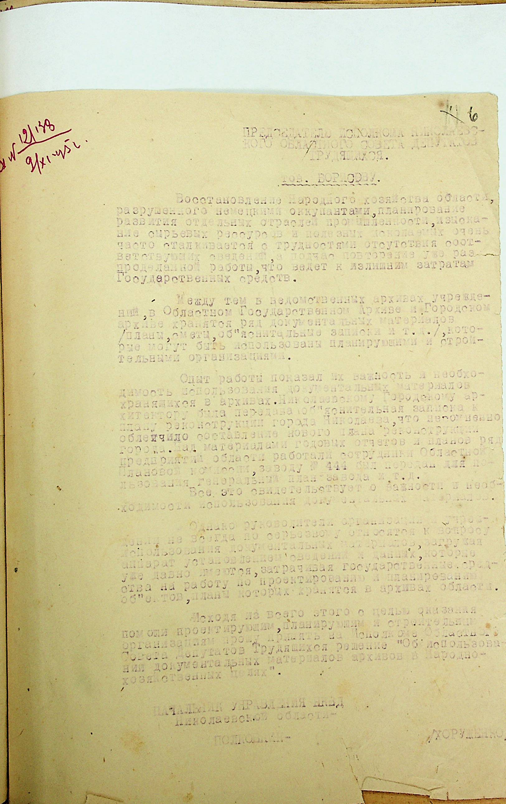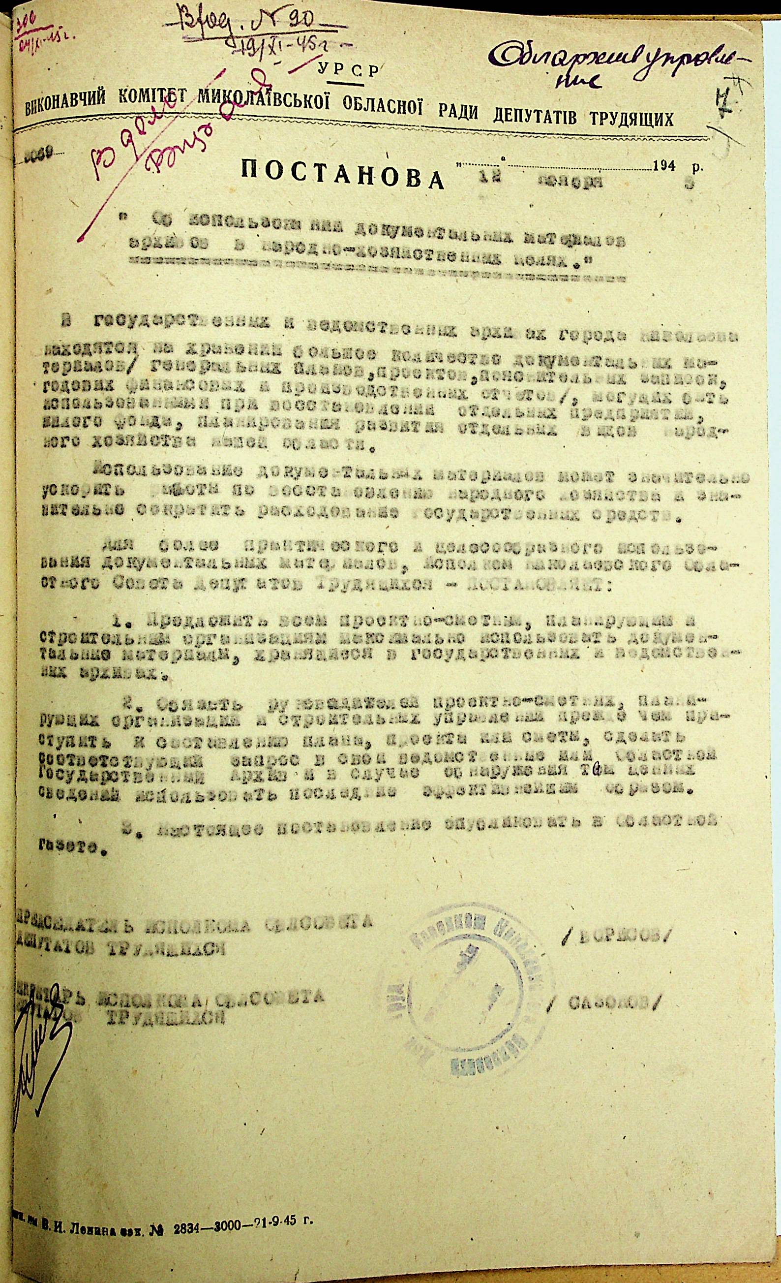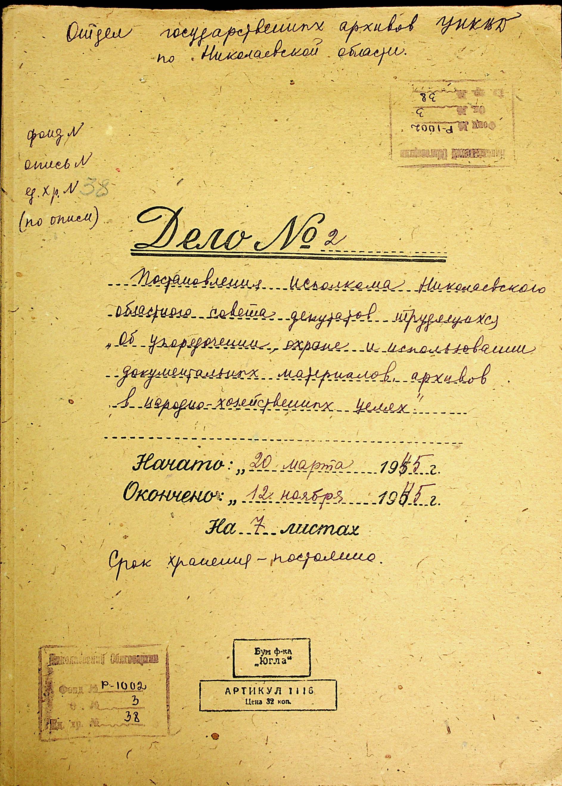 • • • • Справа № 38 “Постанови Виконкому Миколаївської Облради Депутатів Працівників про впорядкування, охорону та використання документальних матеріалів архівів у народно-господарських цілях”