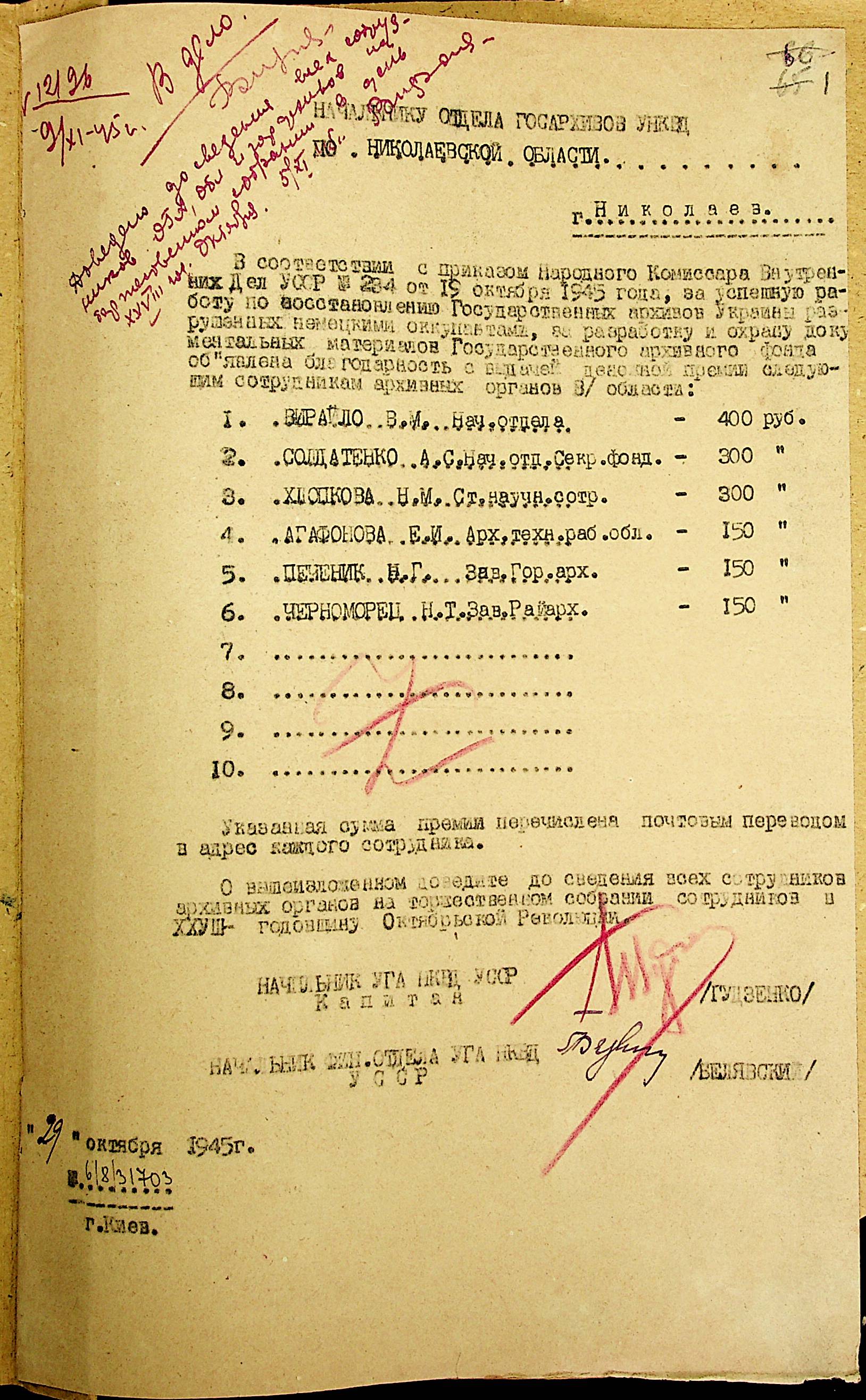 • • • • Справа № 39 “Наказ начальника Управління державних архівів НКВС УРСР про премованих співробітників архівних органів області за успішну роботу з відновлення державних архівів України, зруйнованих німецькими окупантами”