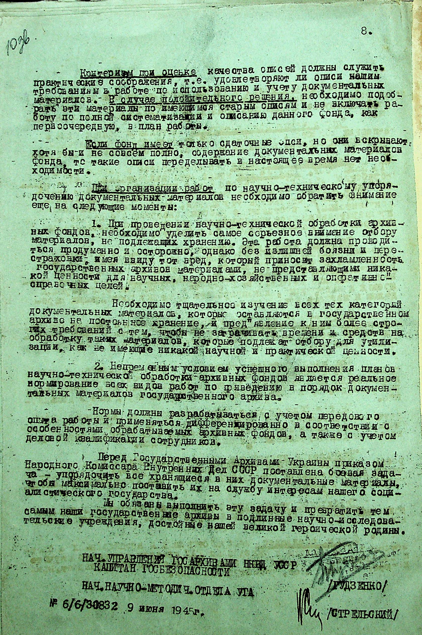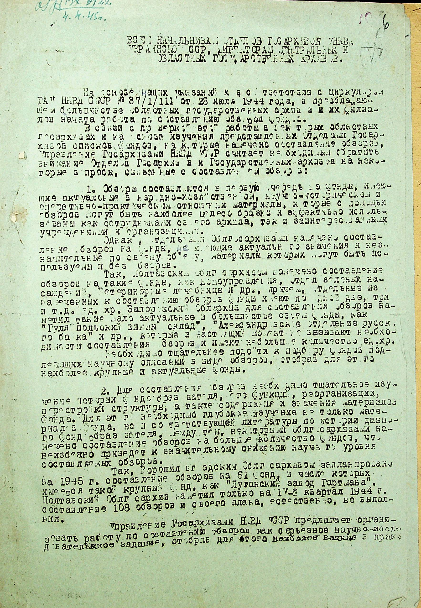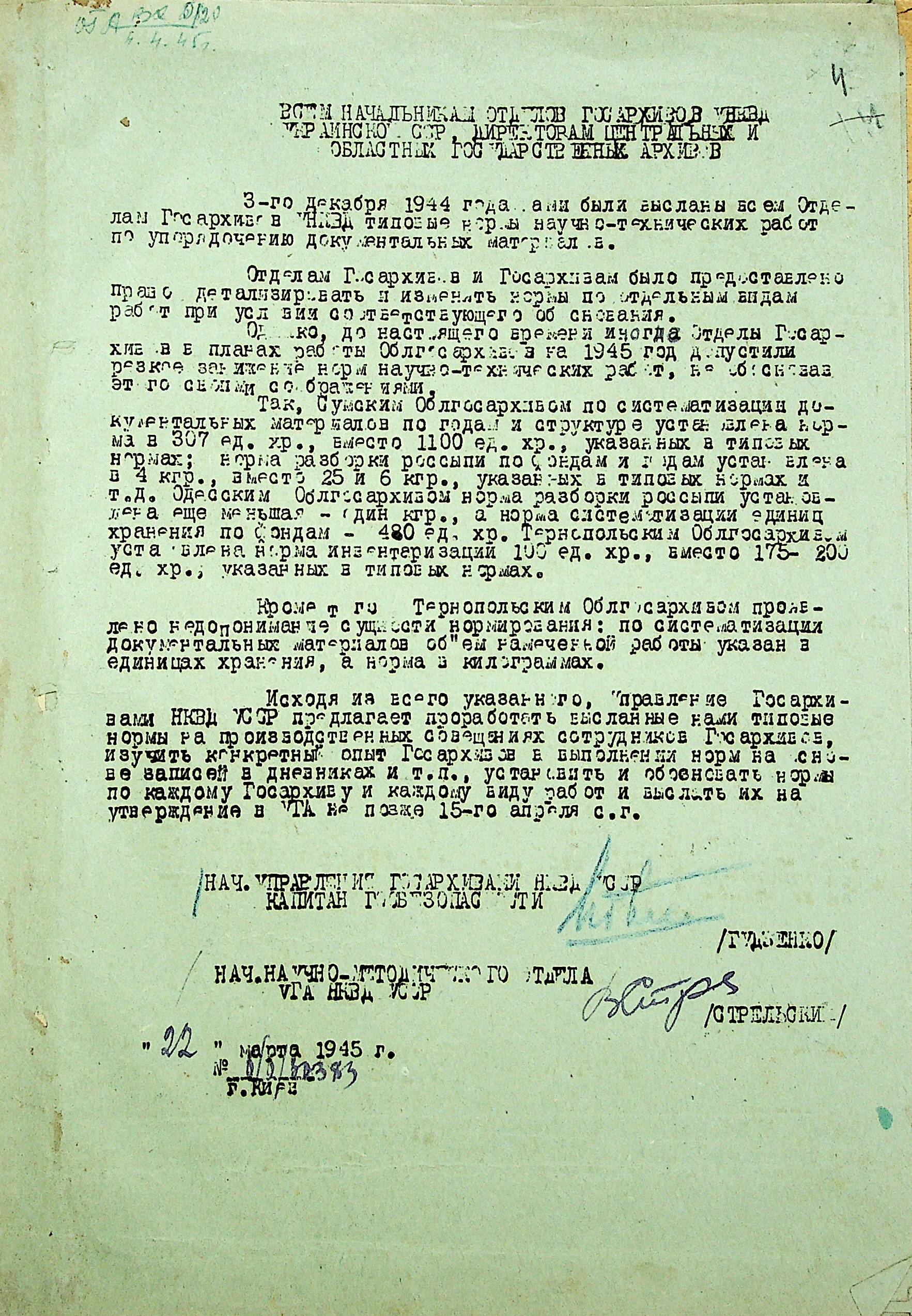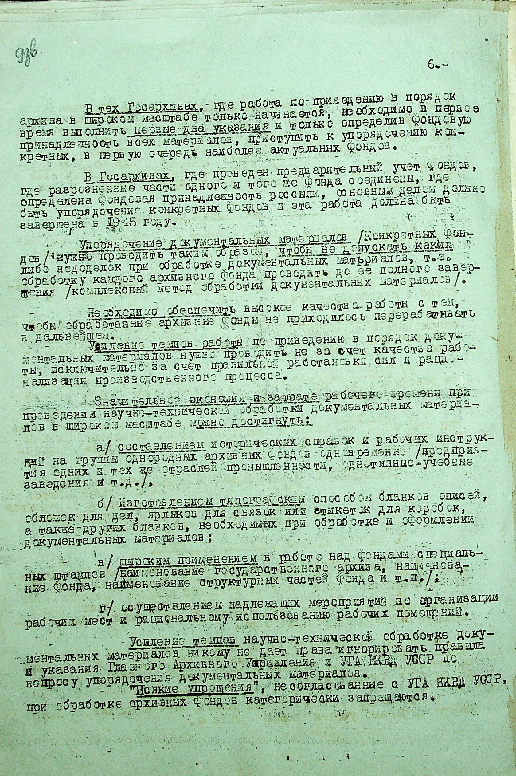 • • • • Справа № 40 “Вказівки управління державними архівами НКВС УРСР про організацію науково-технічних робіт з упорядкування документальних матеріалів архівних органів”