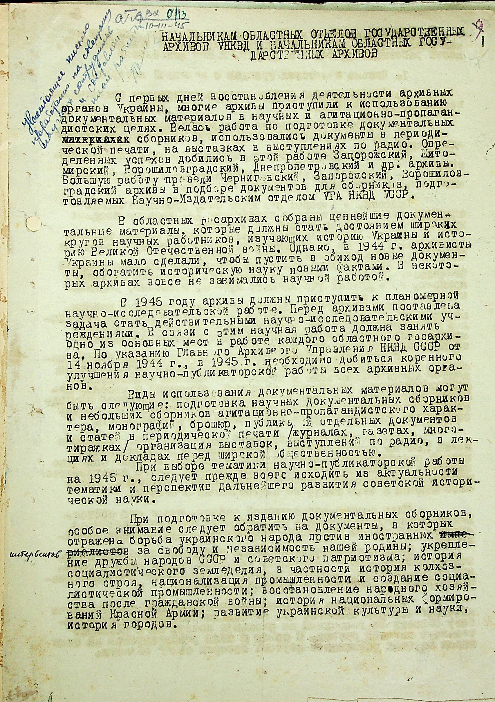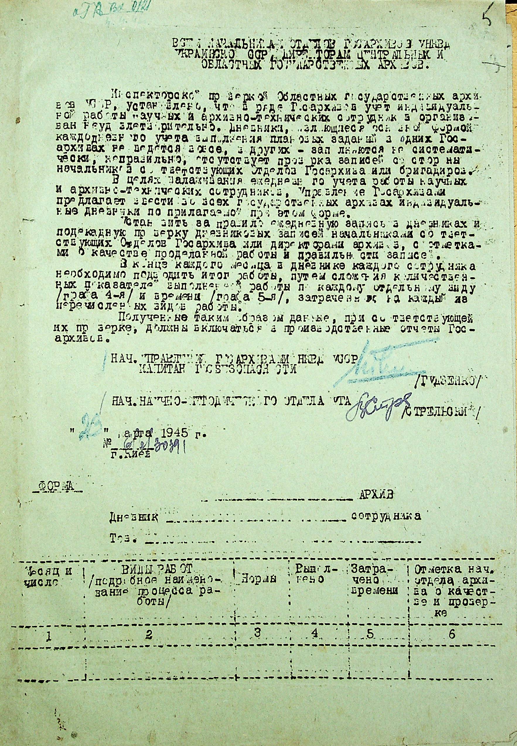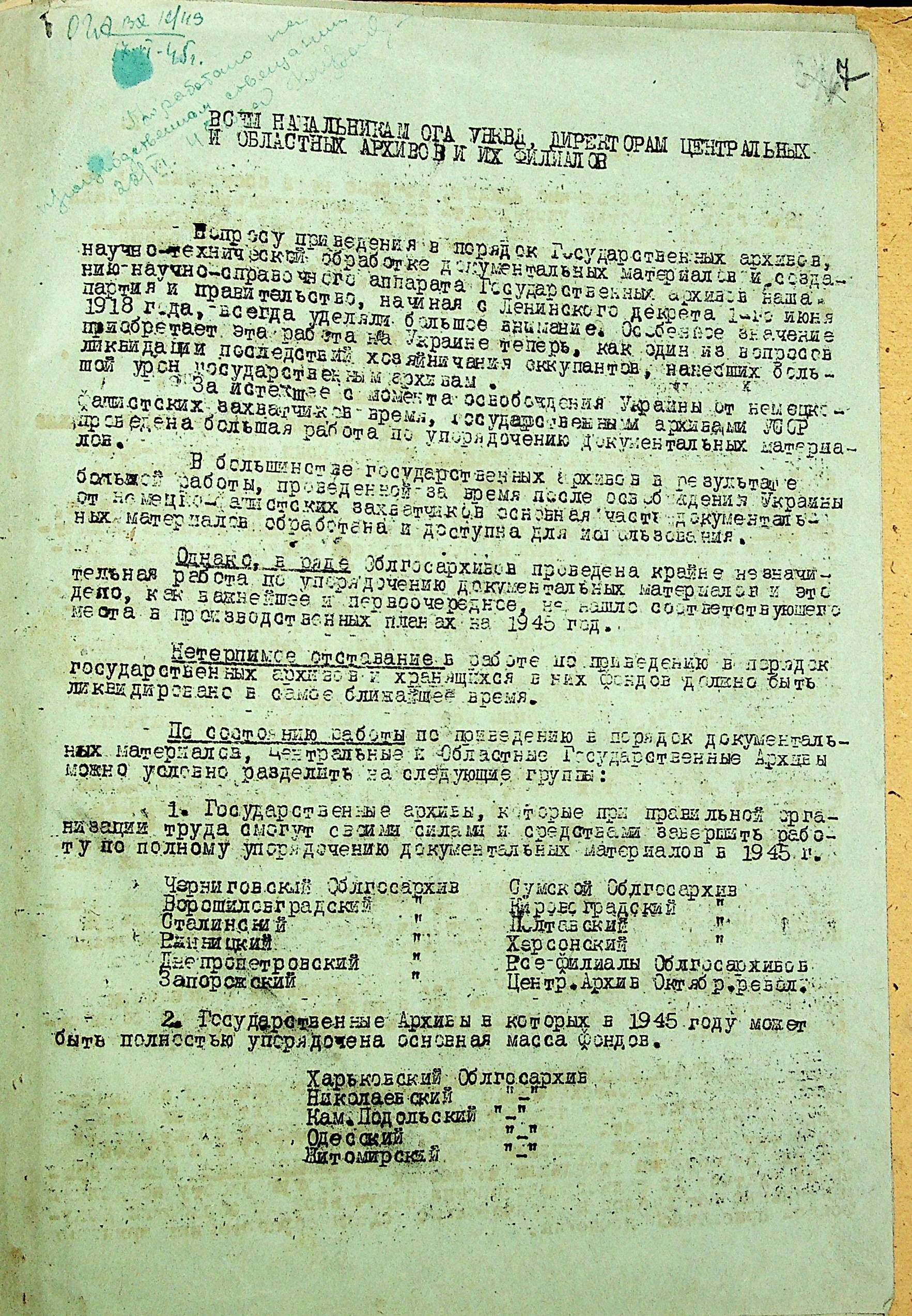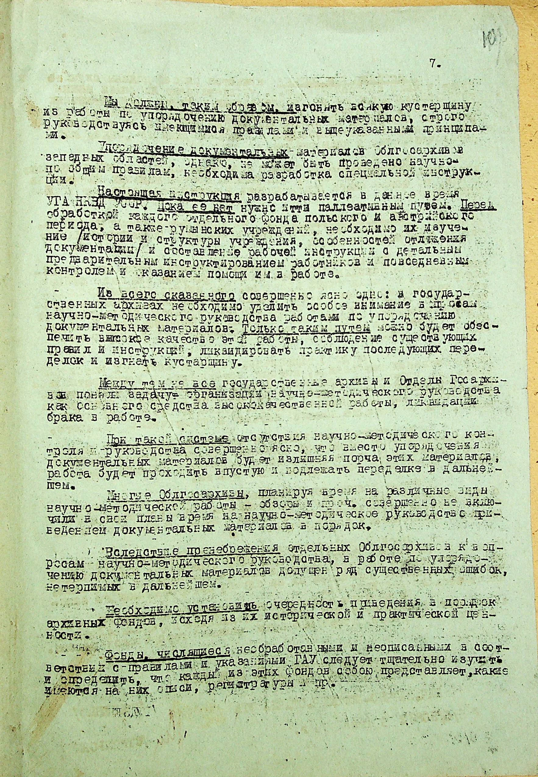 • • • • Справа № 40 “Вказівки управління державними архівами НКВС УРСР про організацію науково-технічних робіт з упорядкування документальних матеріалів архівних органів”