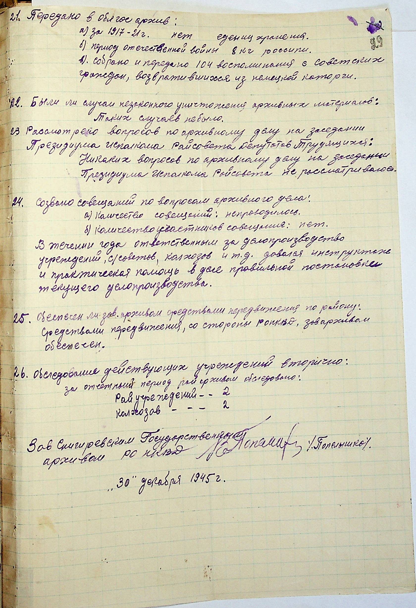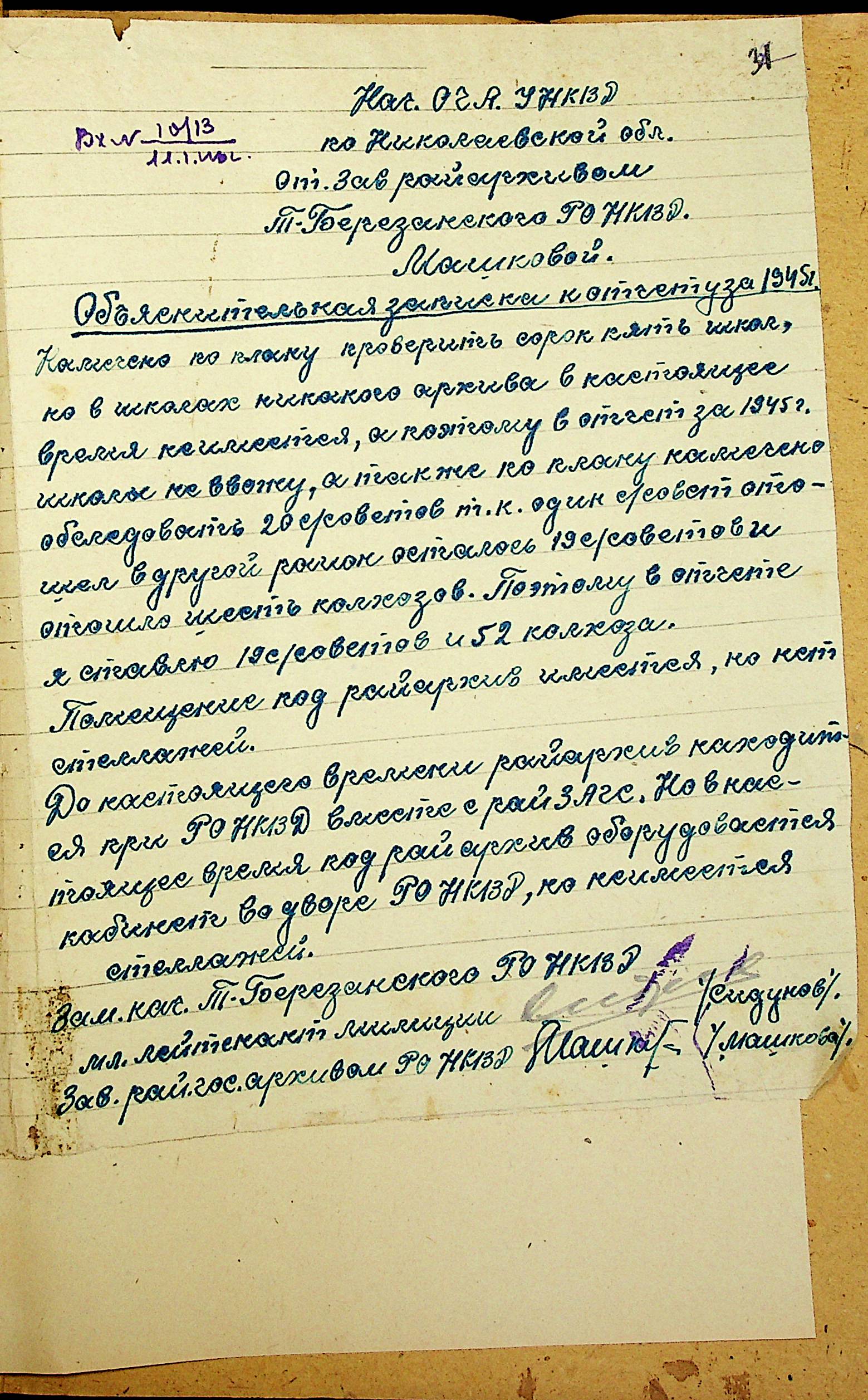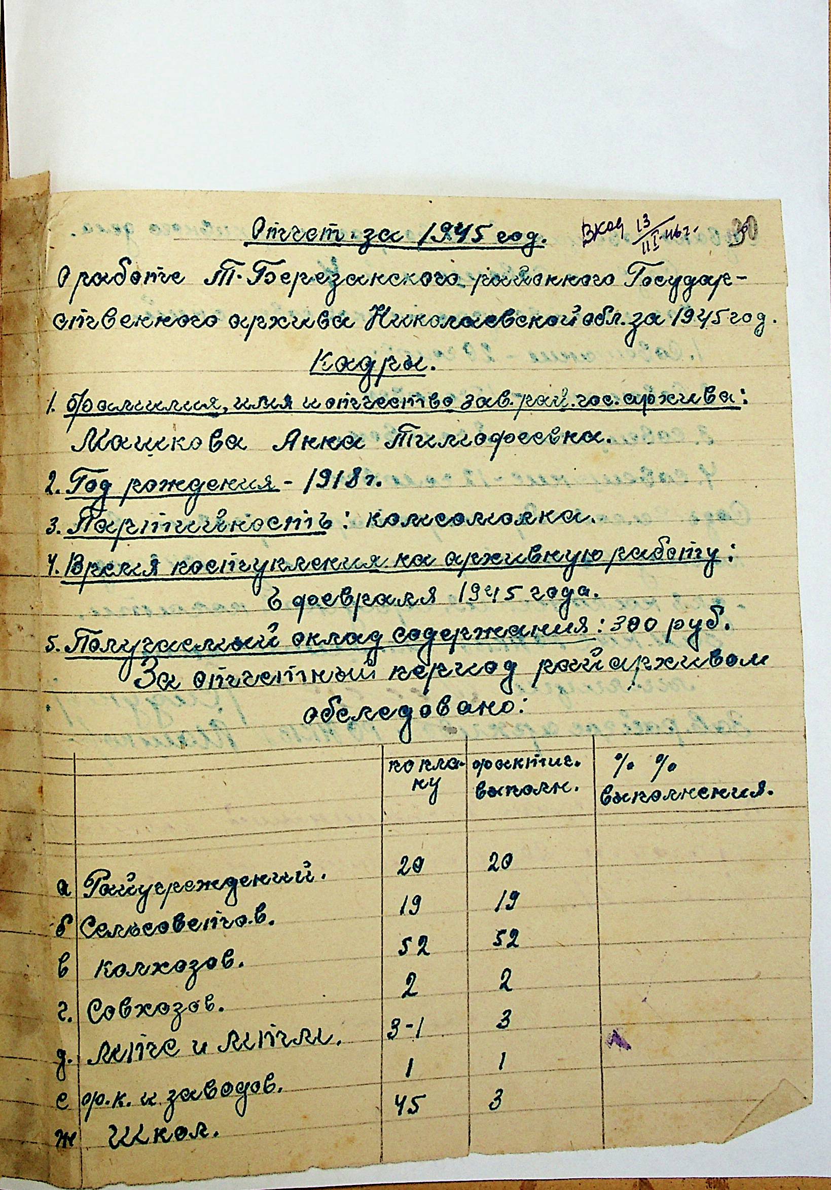 • • • • Справа № 47 “Річні звіти про роботу районних та міських архівів Миколаївської області за 1945 р.”