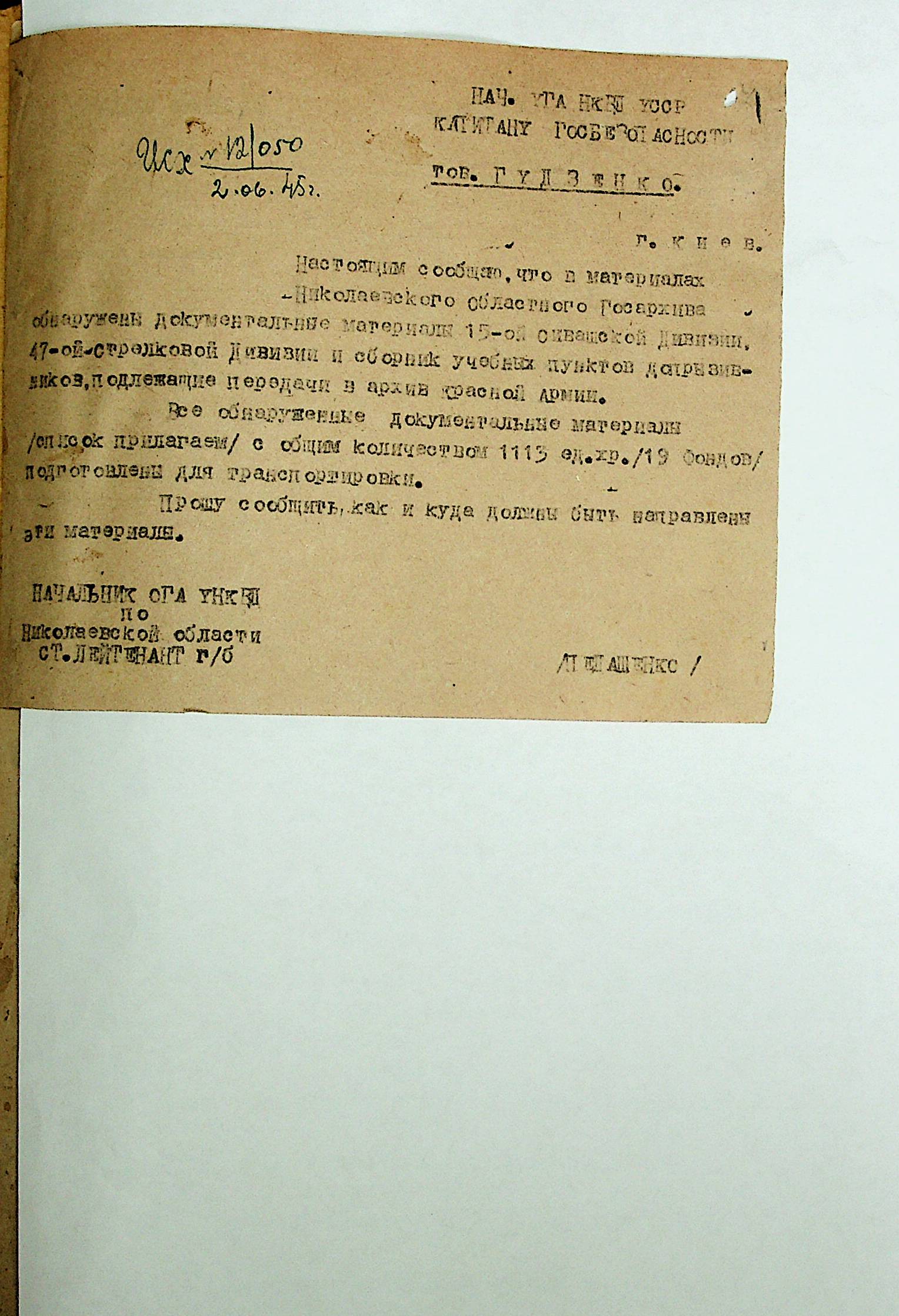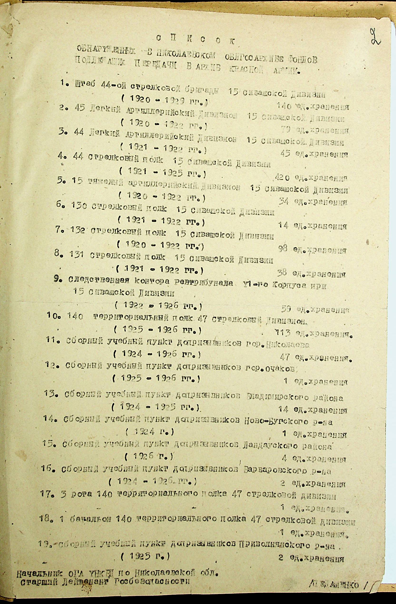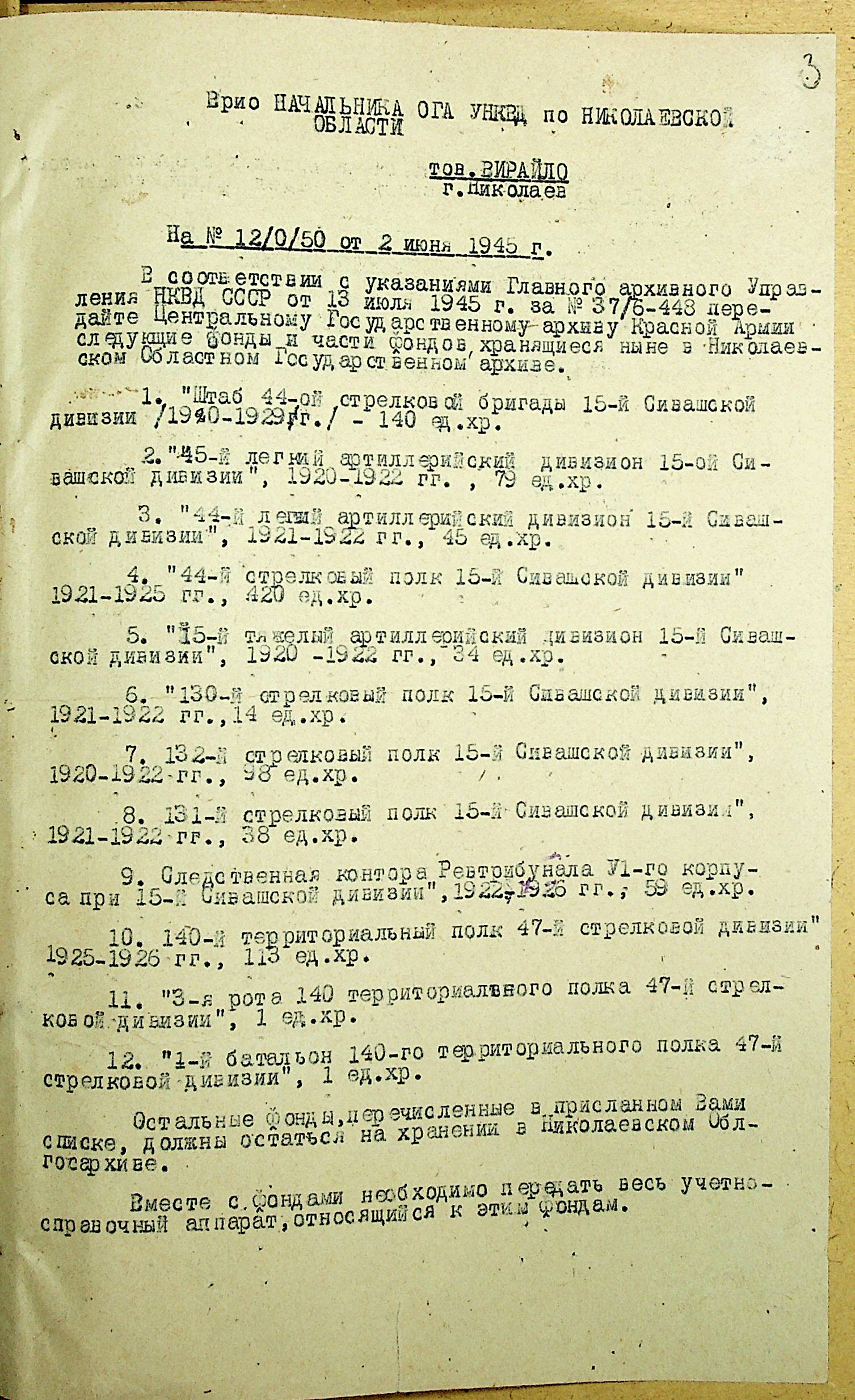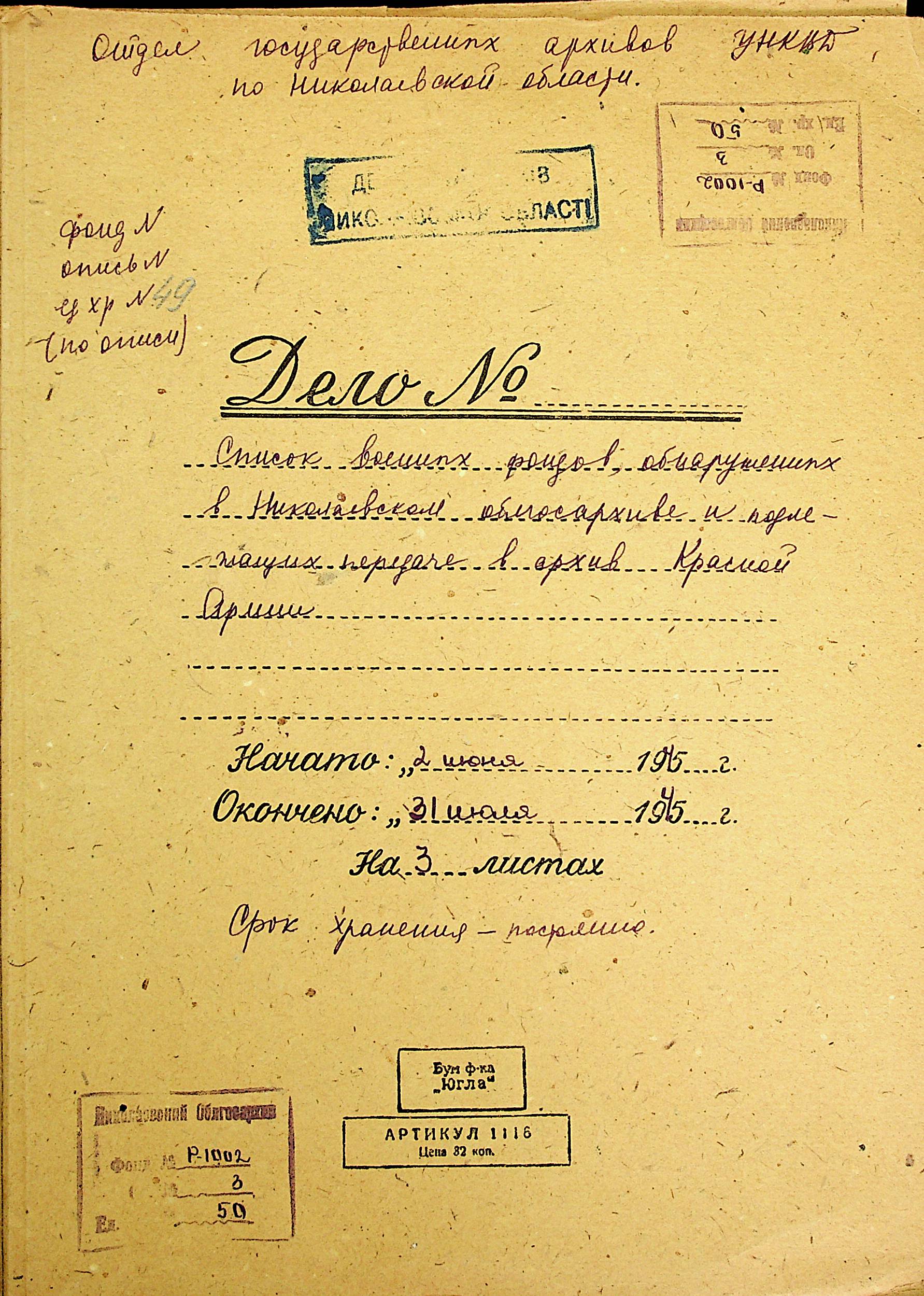 • • • • Справа № 50 “Списки військових фондів, виявлених у Миколаївському обласному державному архіві, які підлягають передачі до архіву Червоної Армії”