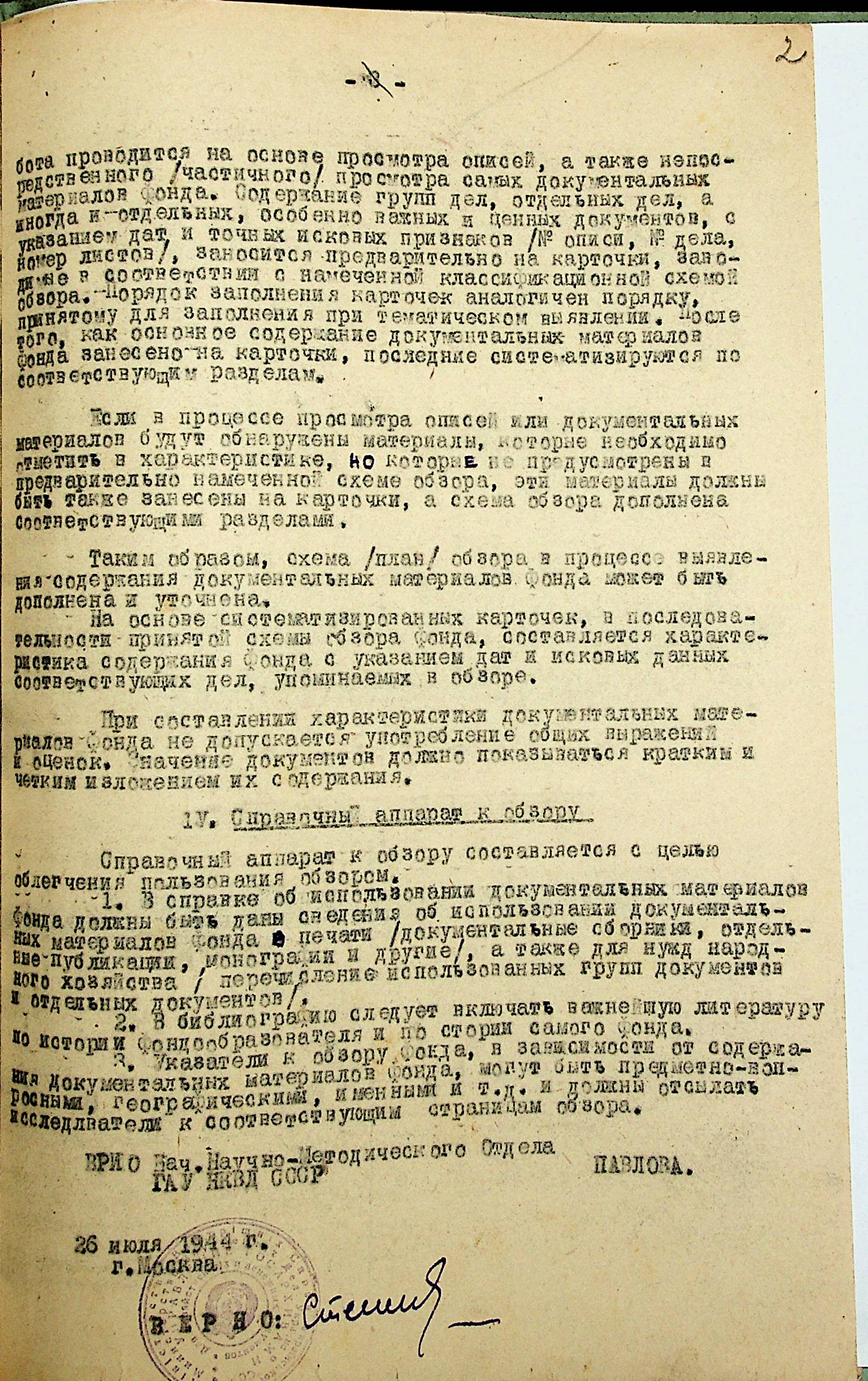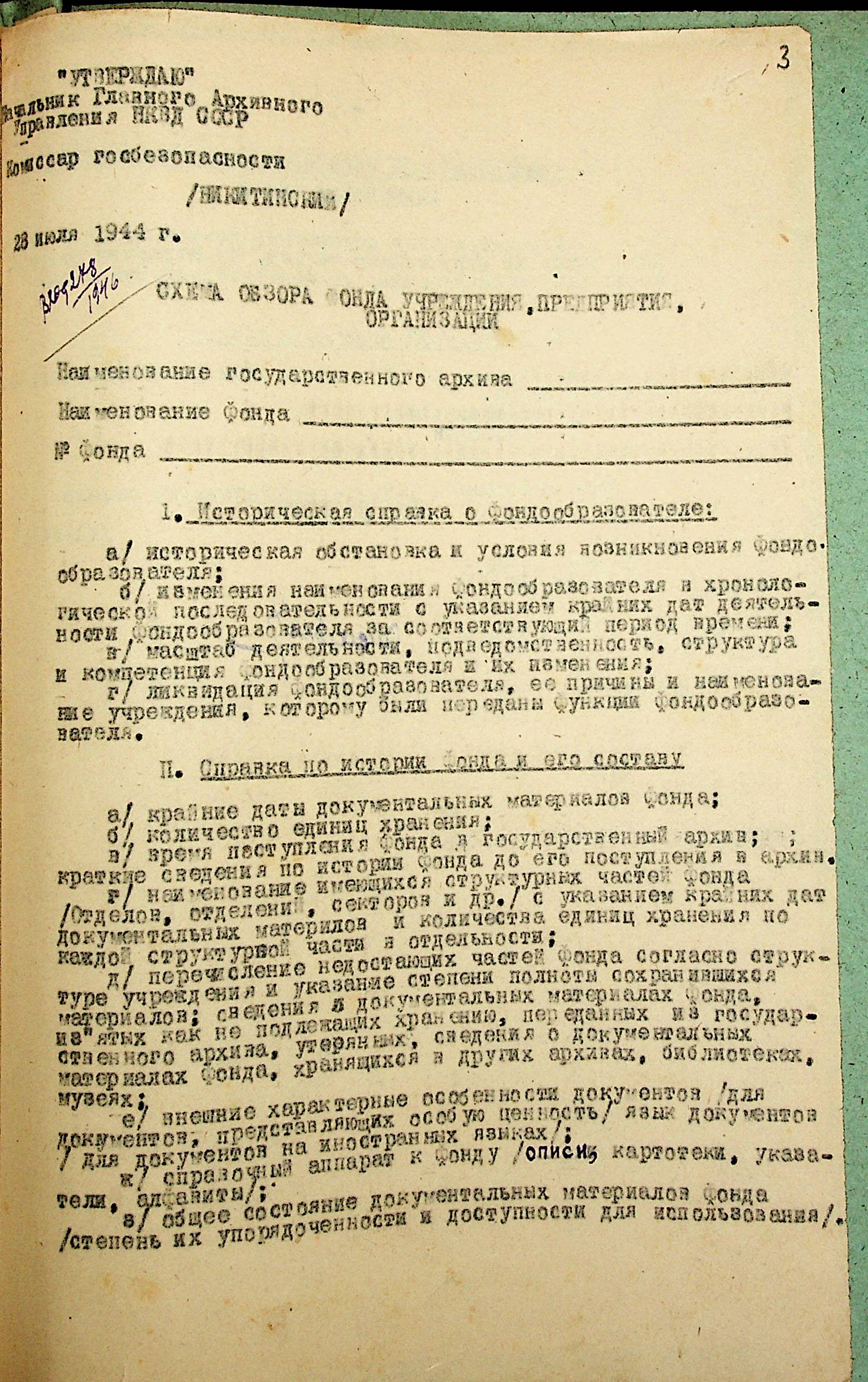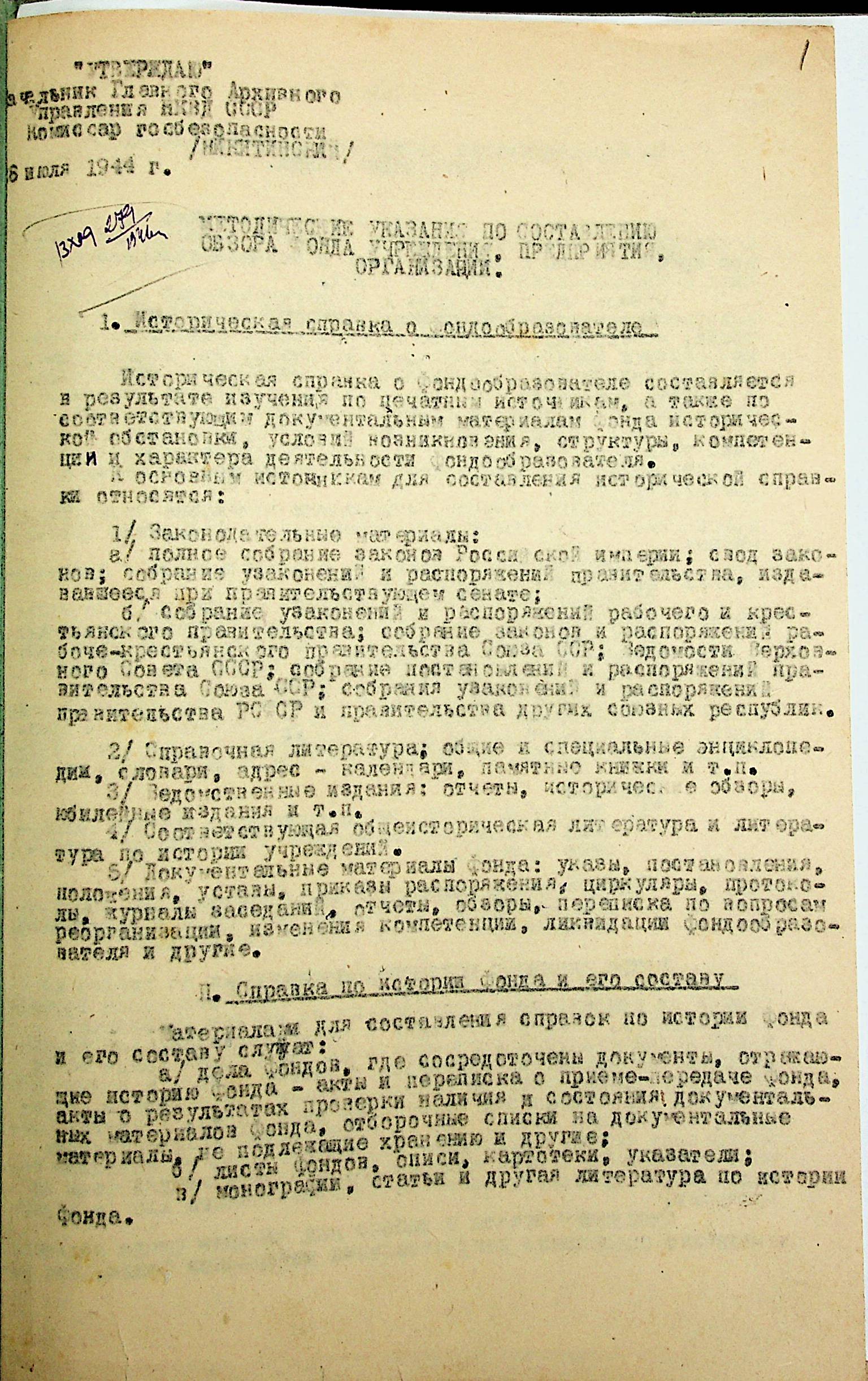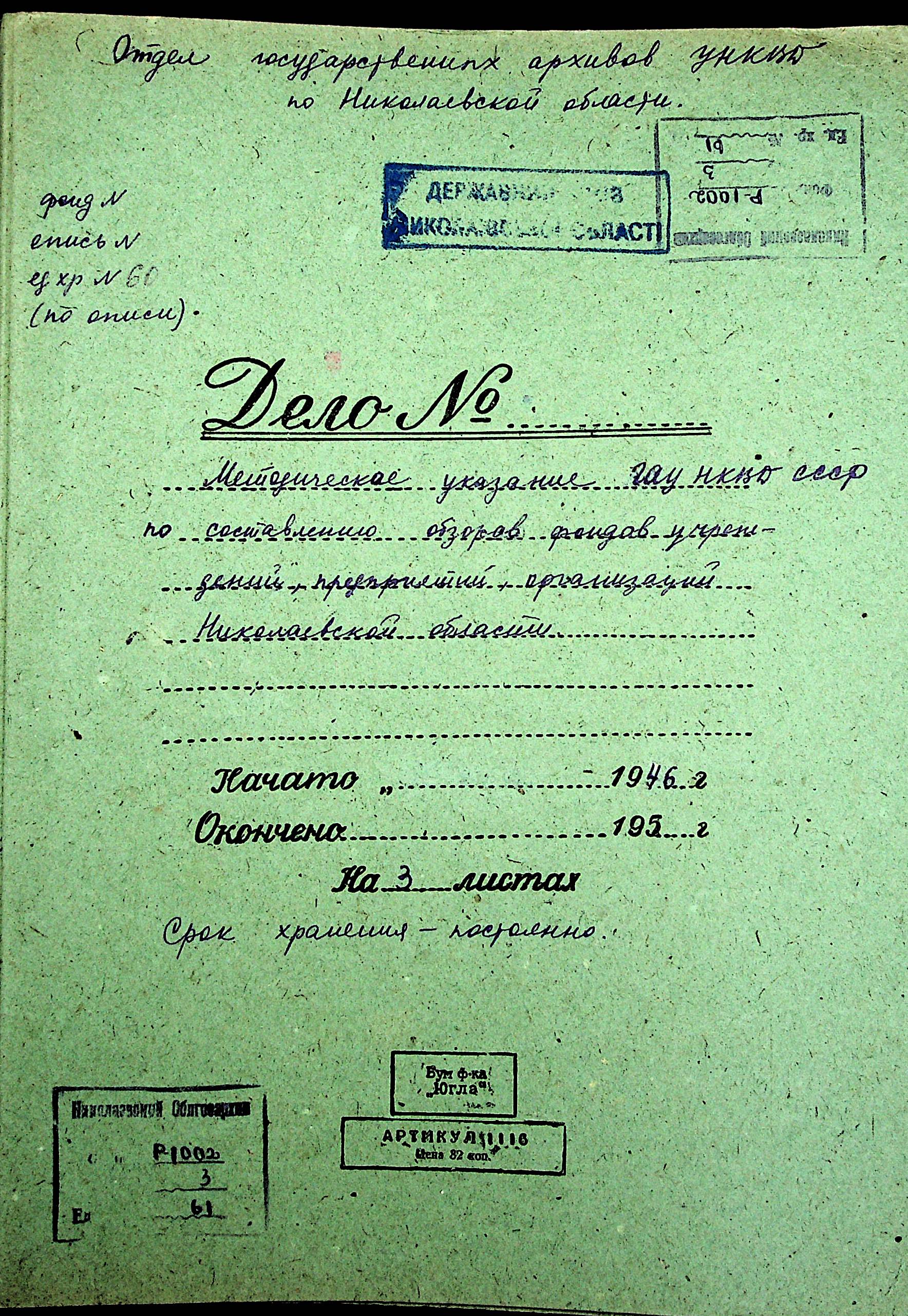 • • • • Справа № 61 “Методична вказівка Головного архівного управління НКВС СРСР щодо складання оглядів фондів установ, підприємств, організацій Миколаївської області”