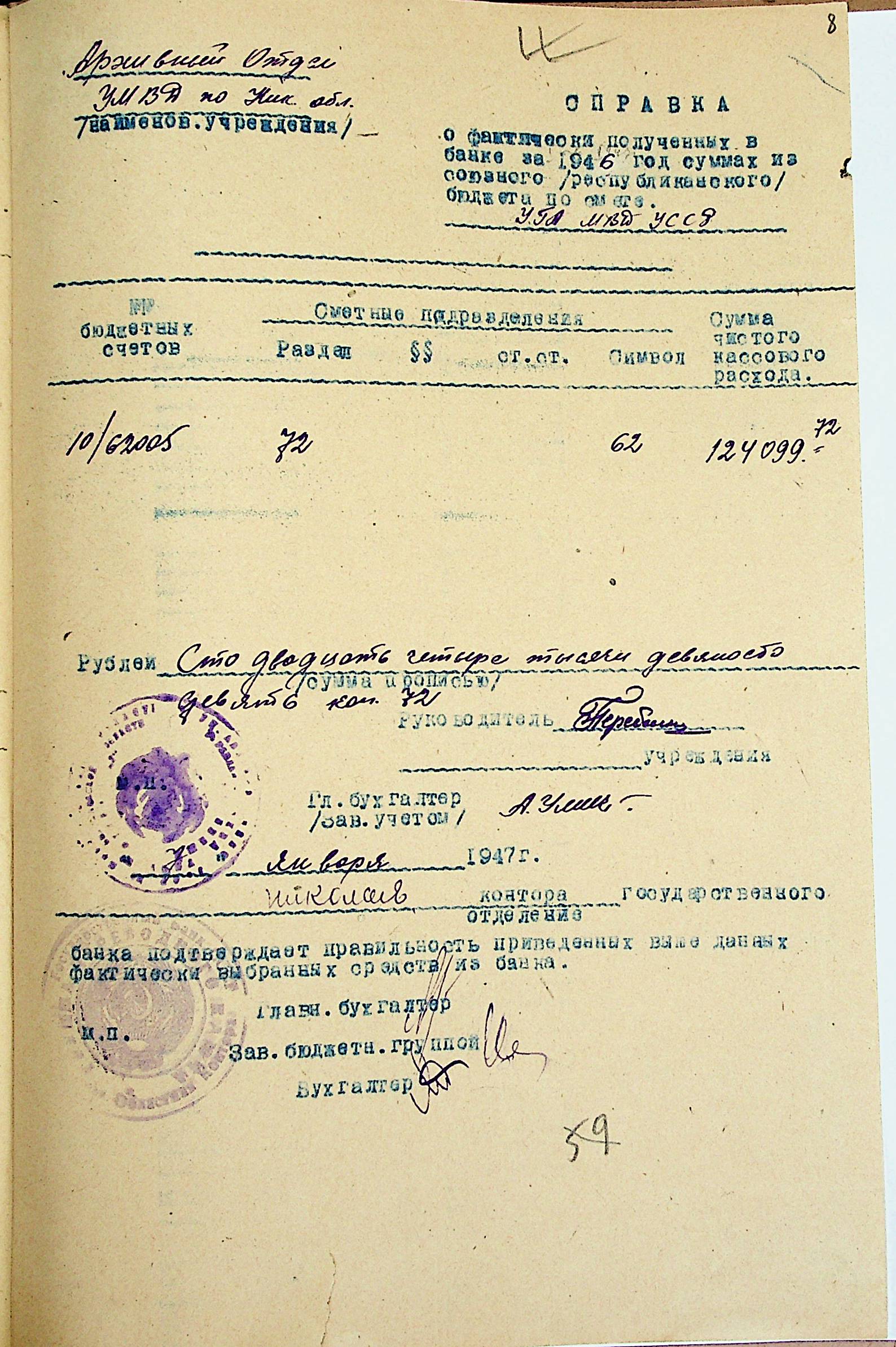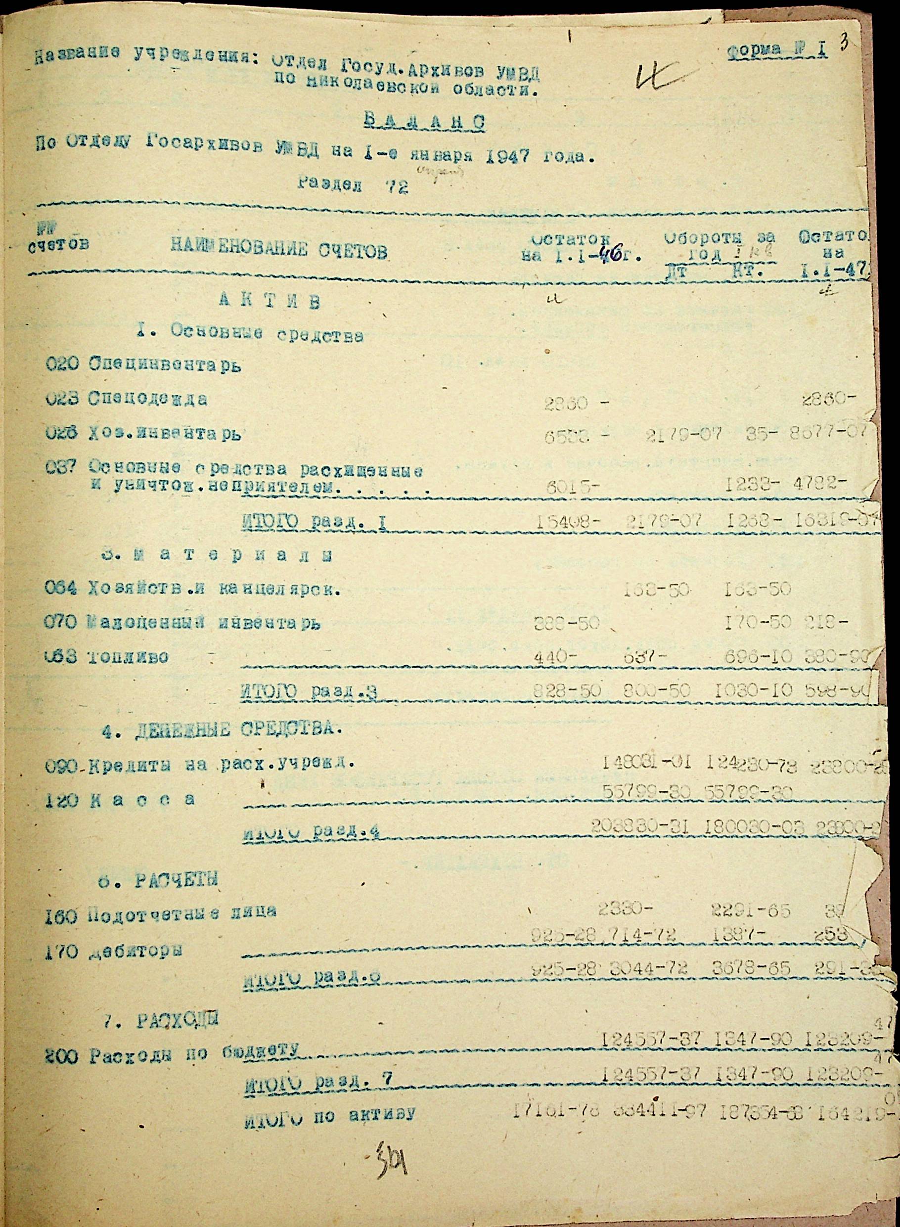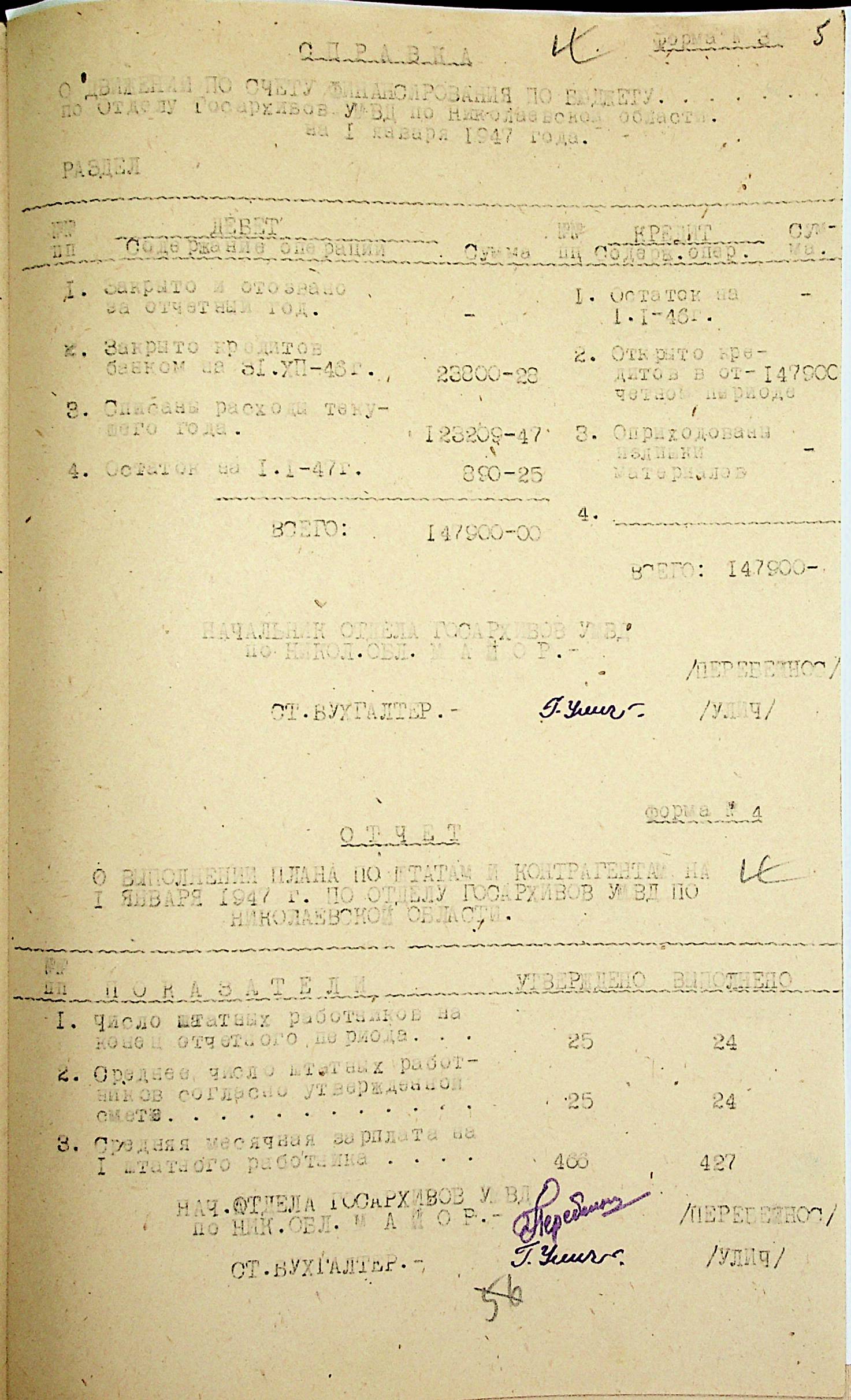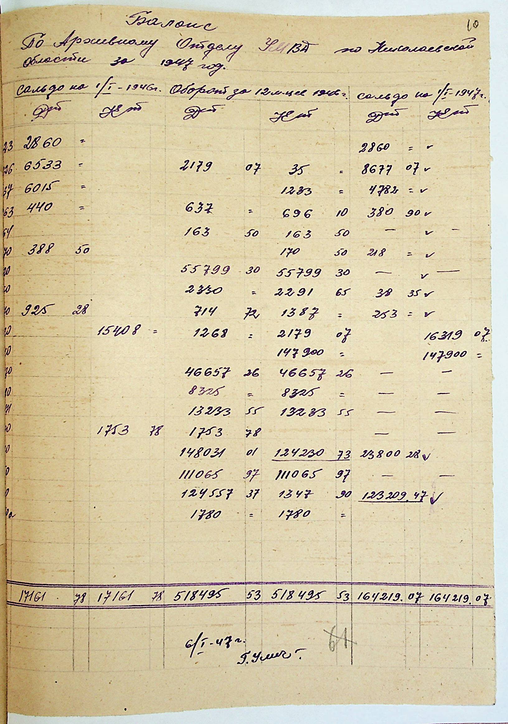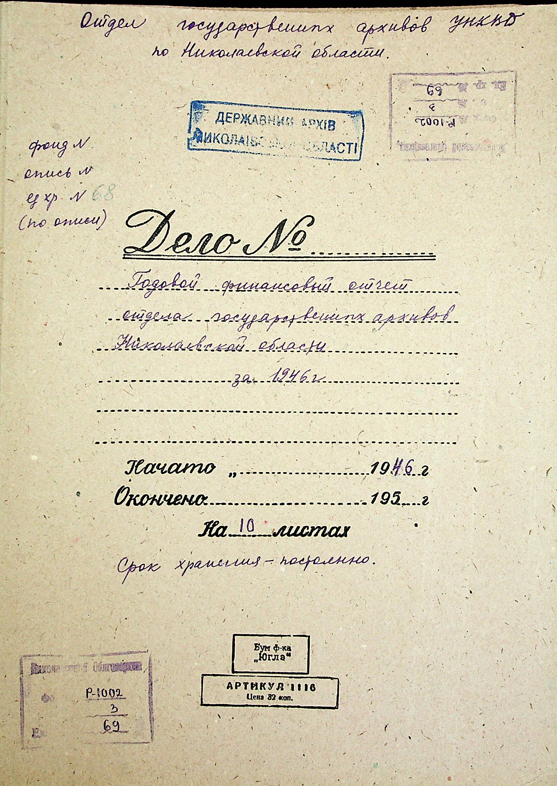 • • • • Справа № 69 “Річний фінансовий звіт відділу державних архівів Миколаївської області за 1946 р.”
