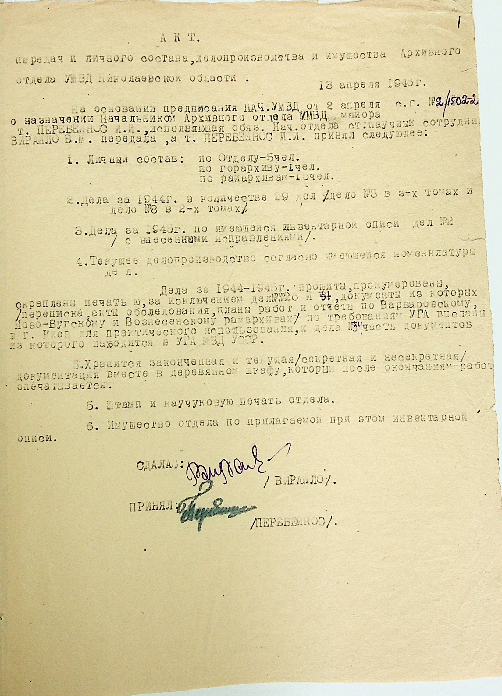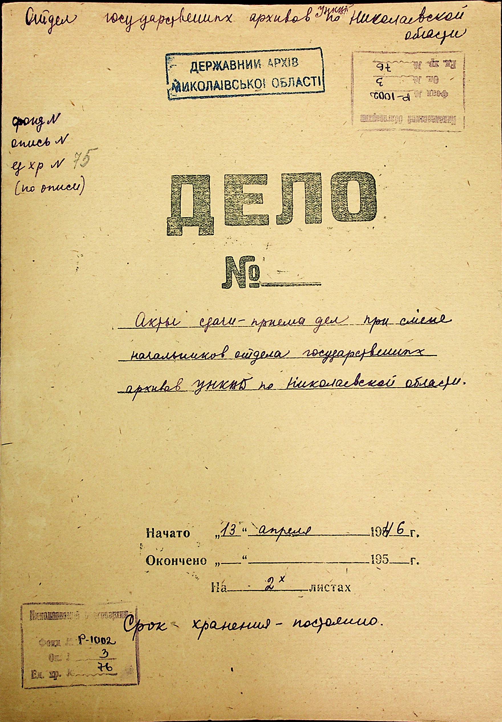 • • • • Справа № 76 “Акти здачі-прийому справ при зміні начальників відділу державних архівів УНКВС по Миколаївській області”