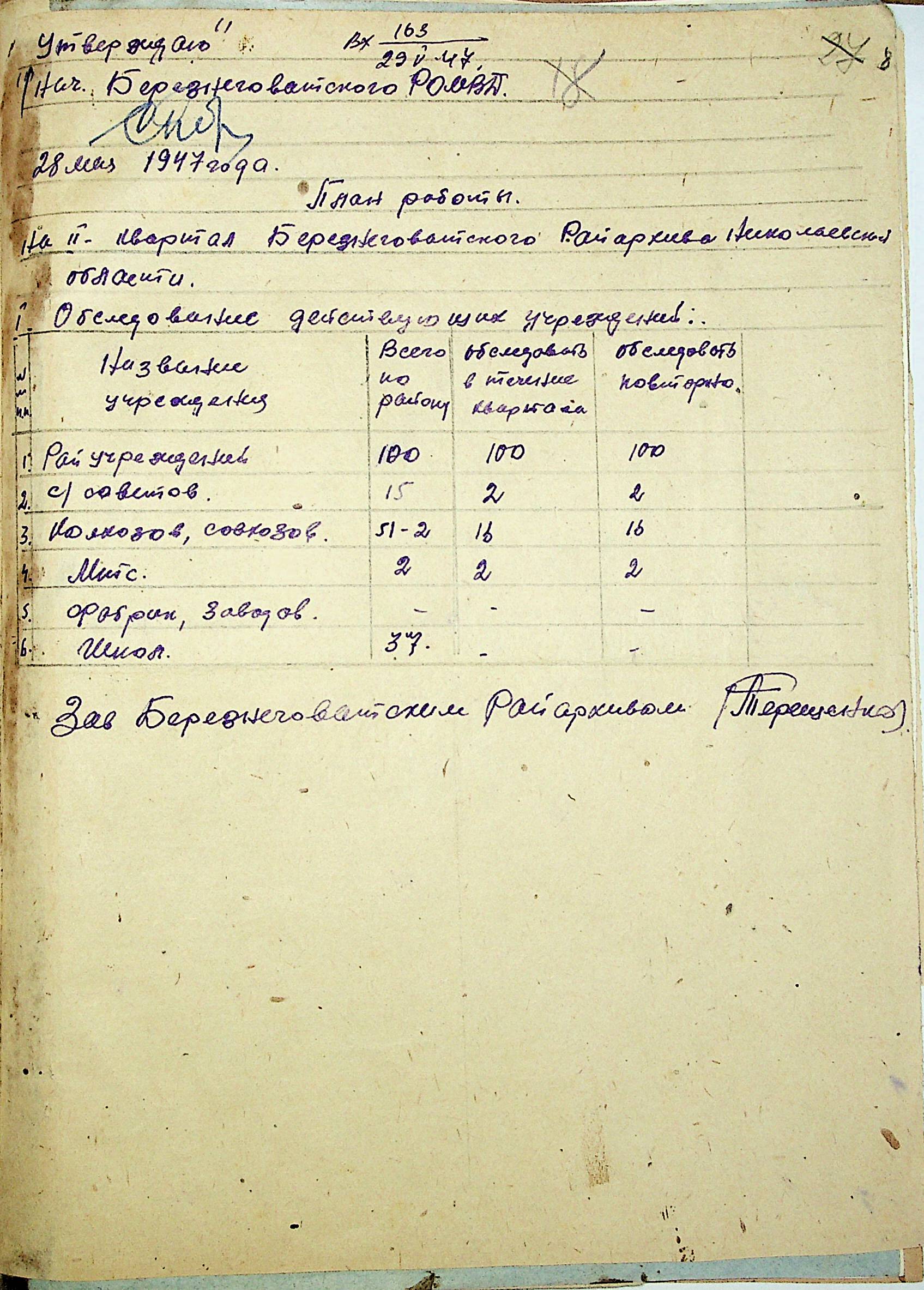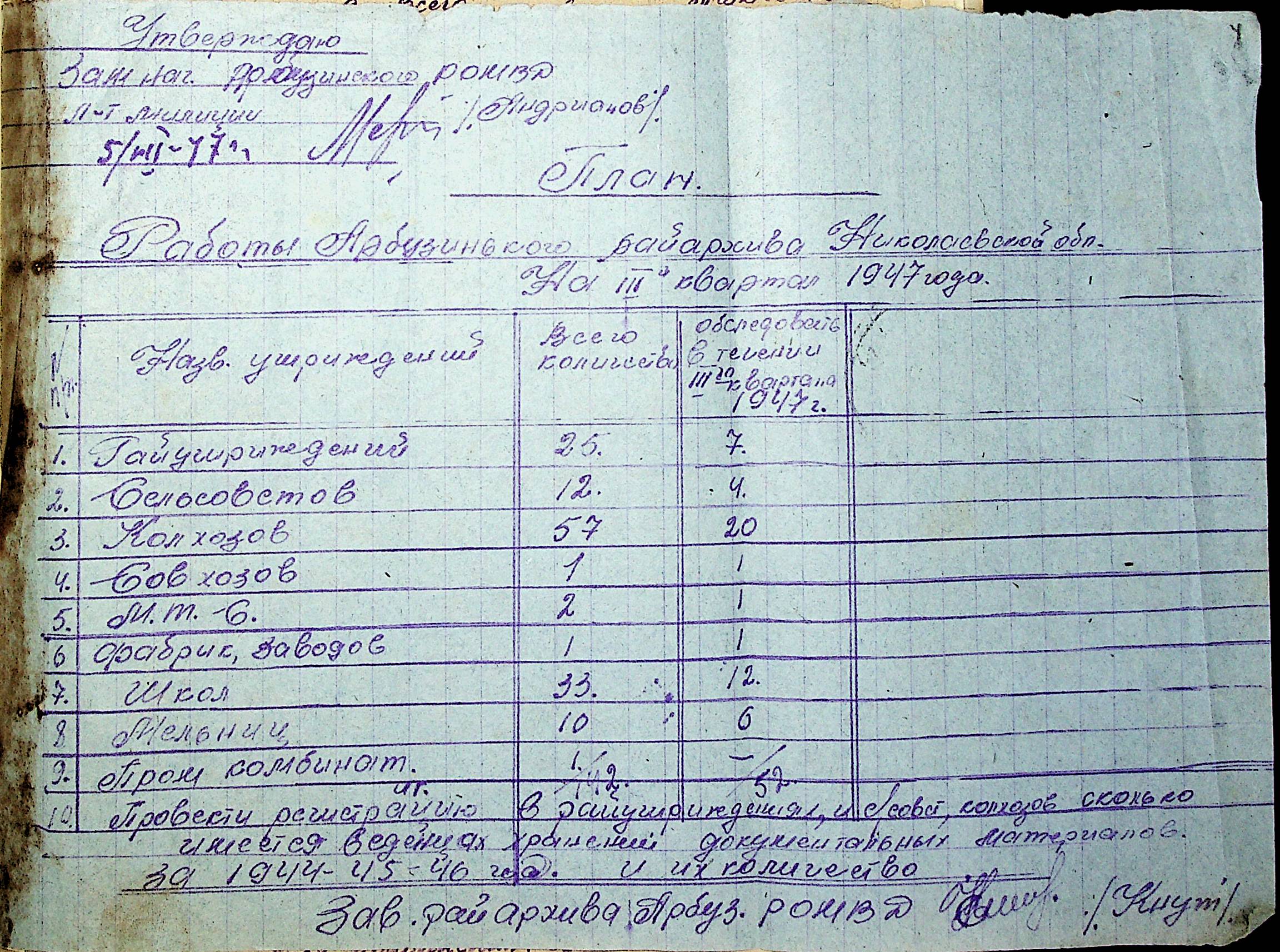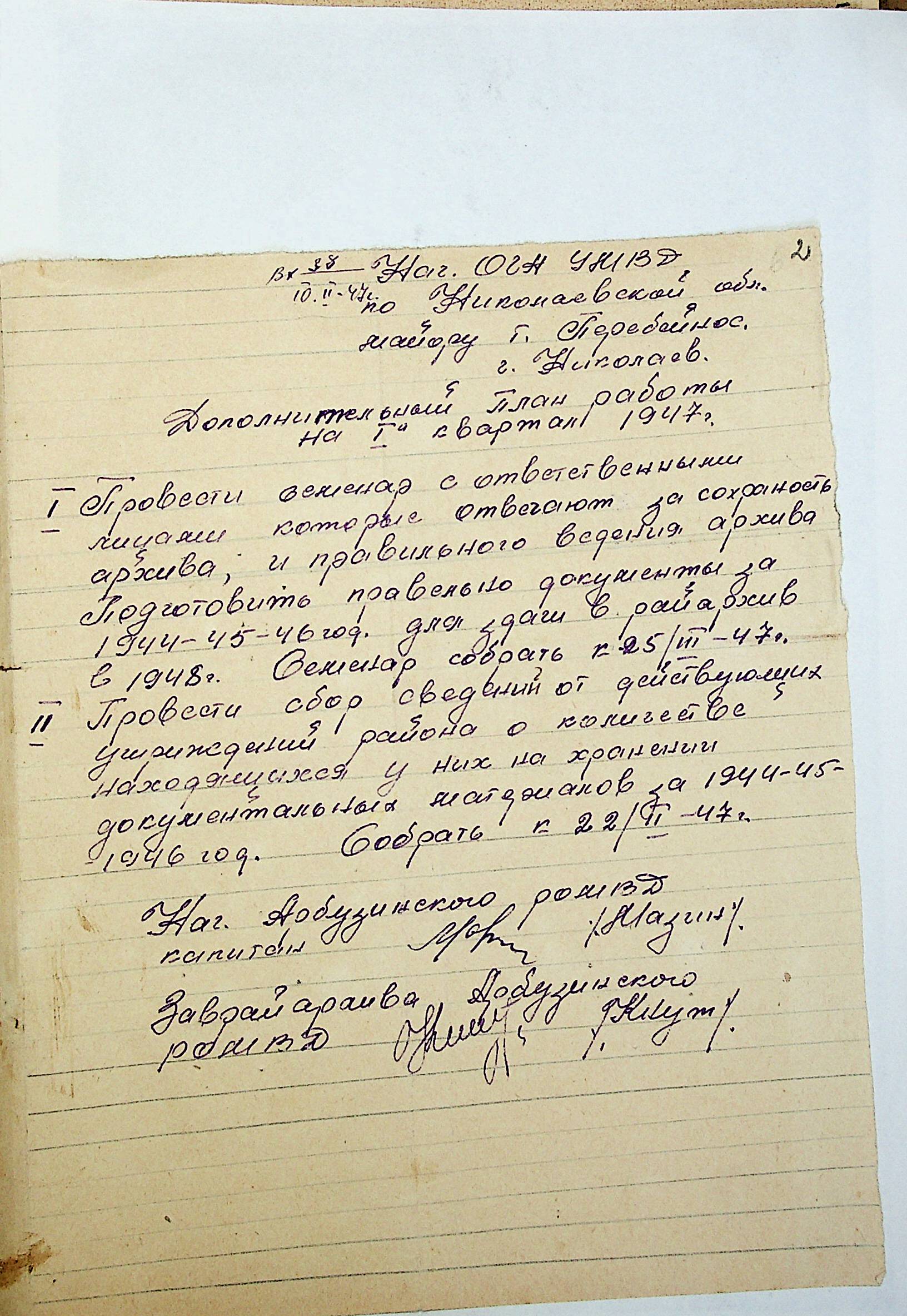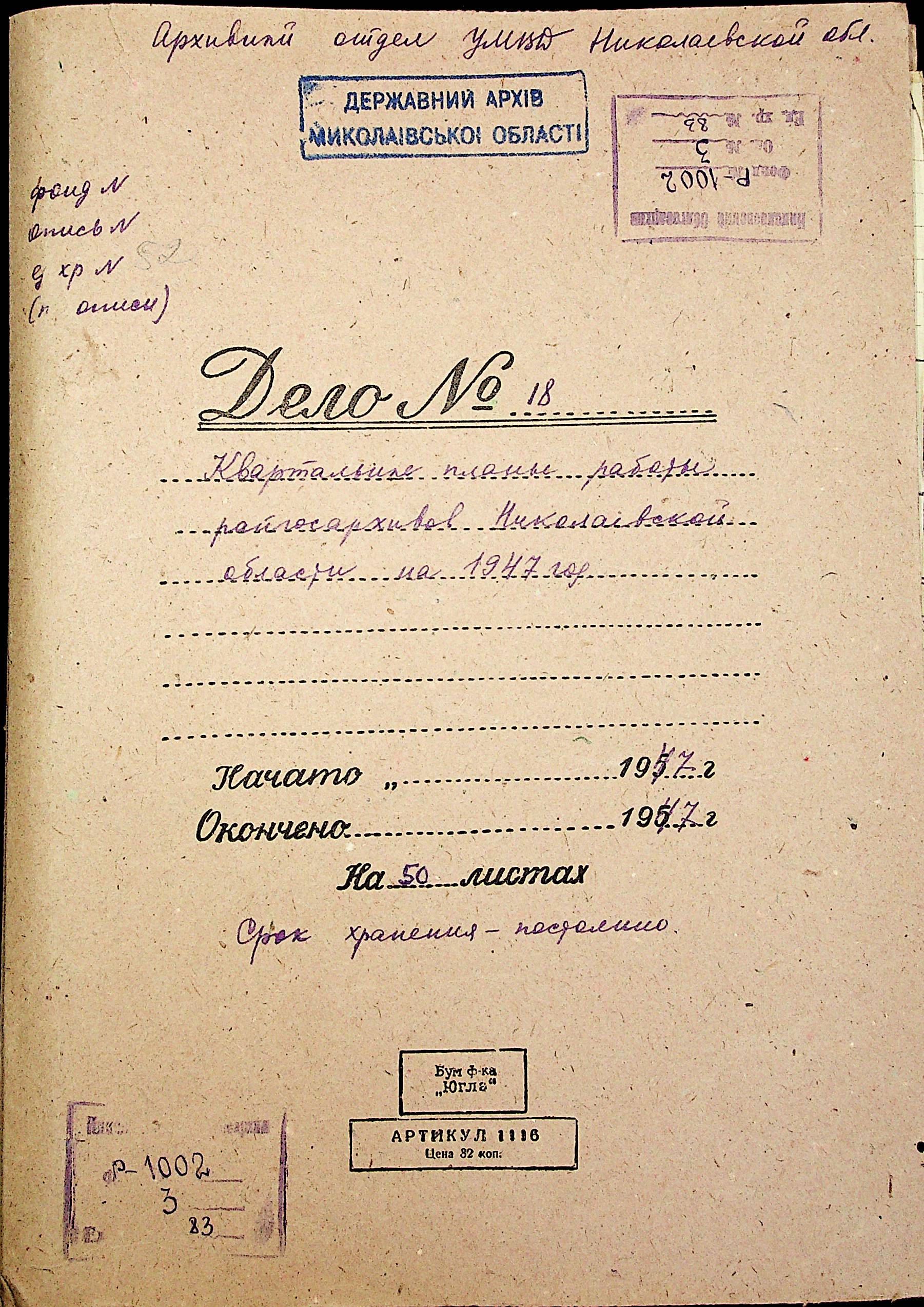 • • • • Справа № 83 “Квартальні плани роботи районних державних архівів Миколаївської області на 1947 р.”