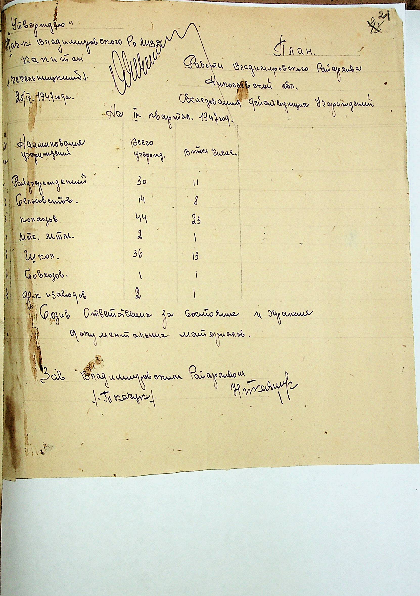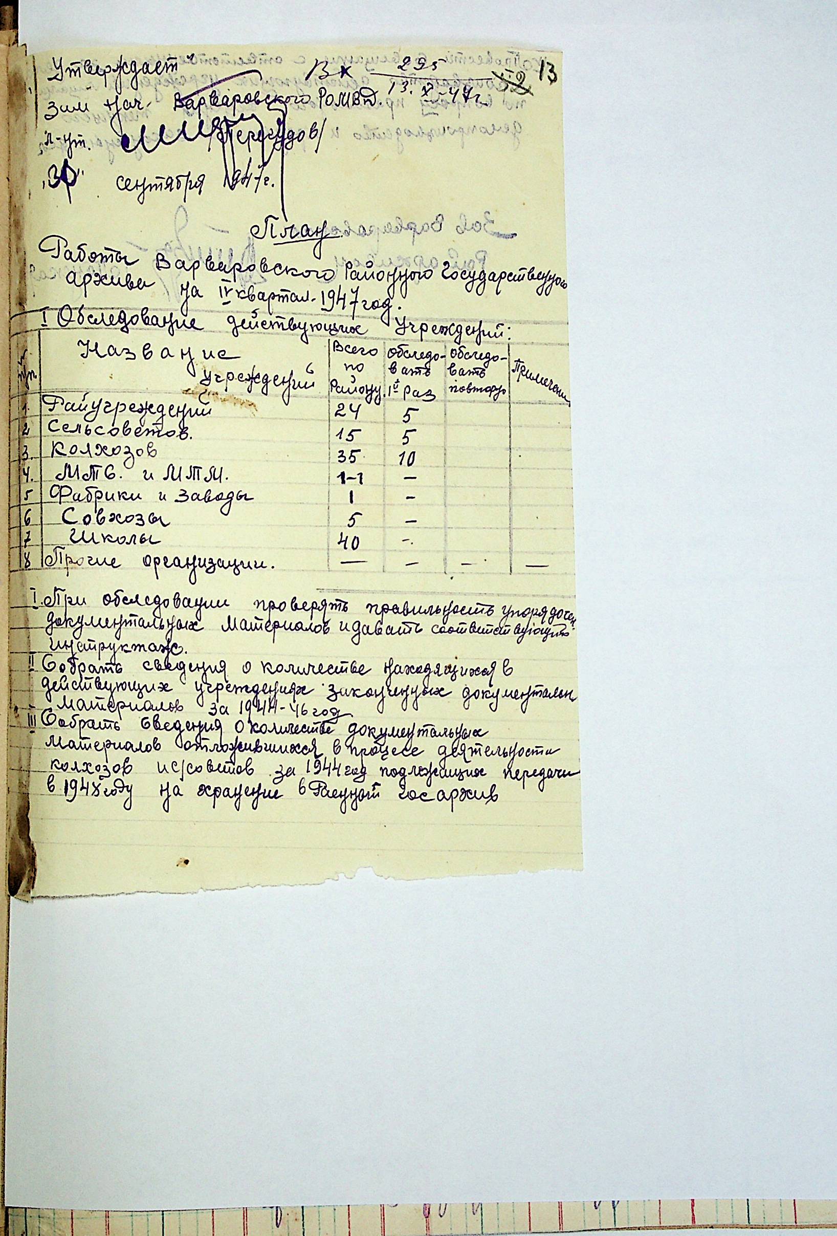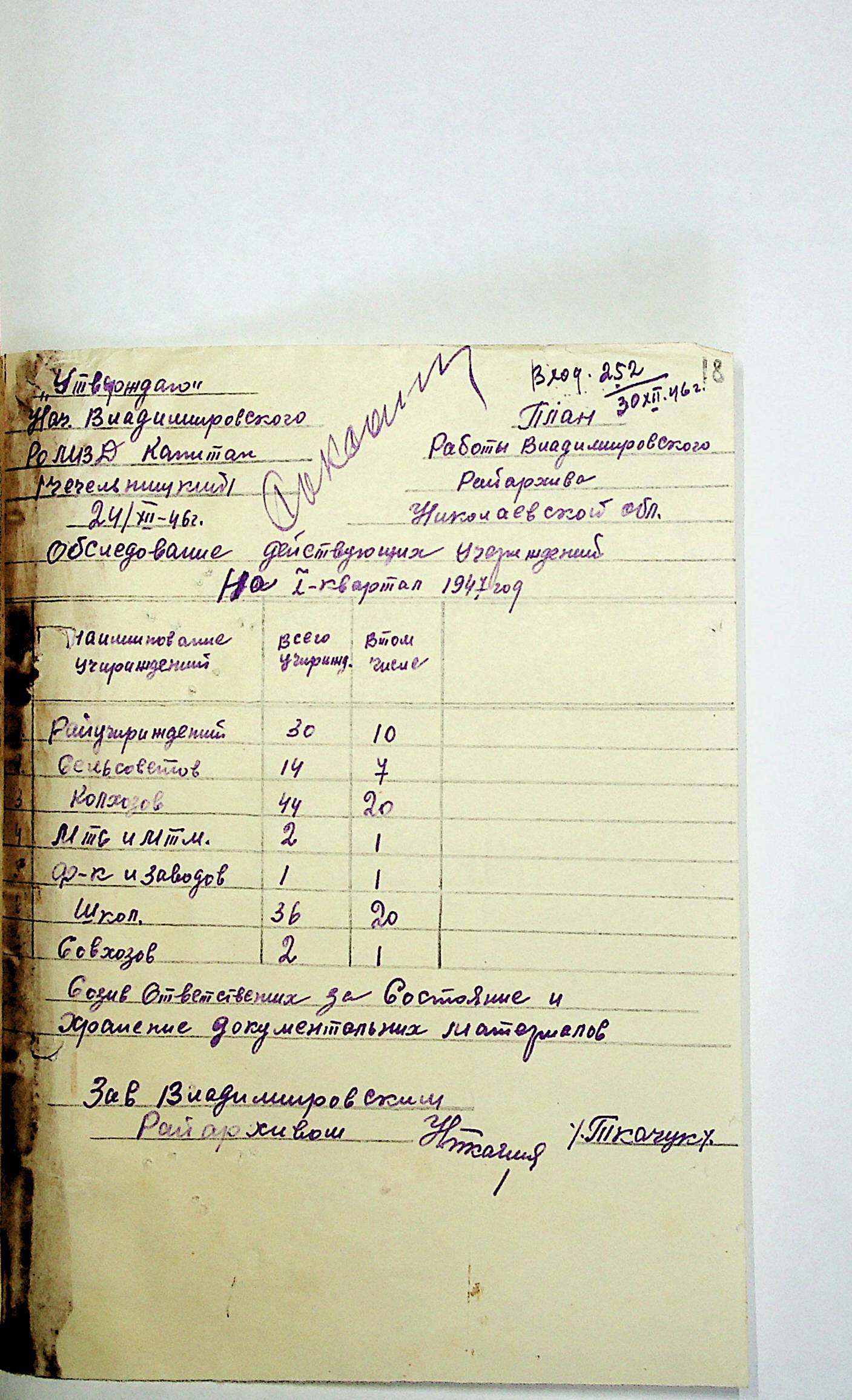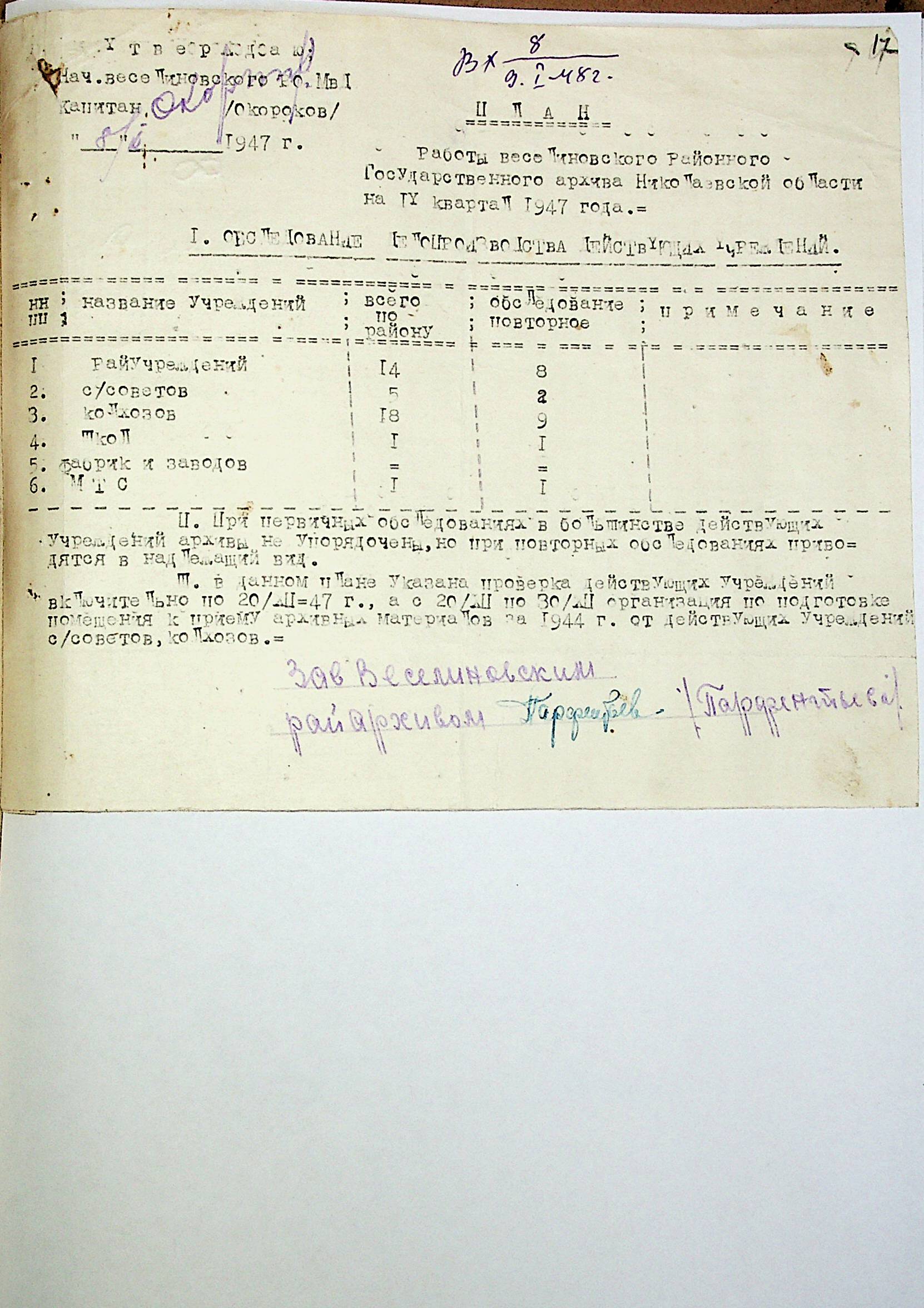 • • • • Справа № 83 “Квартальні плани роботи районних державних архівів Миколаївської області на 1947 р.”