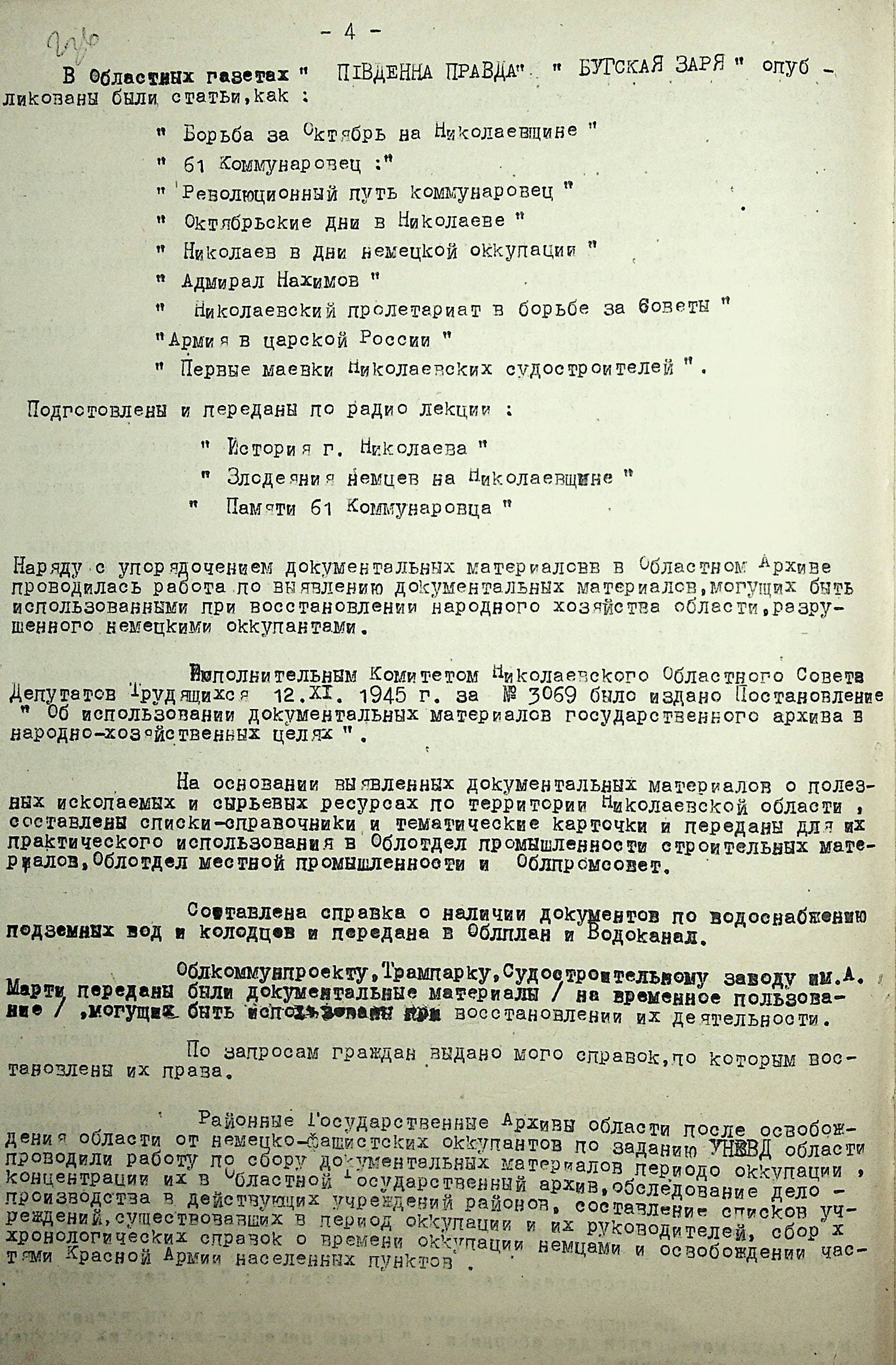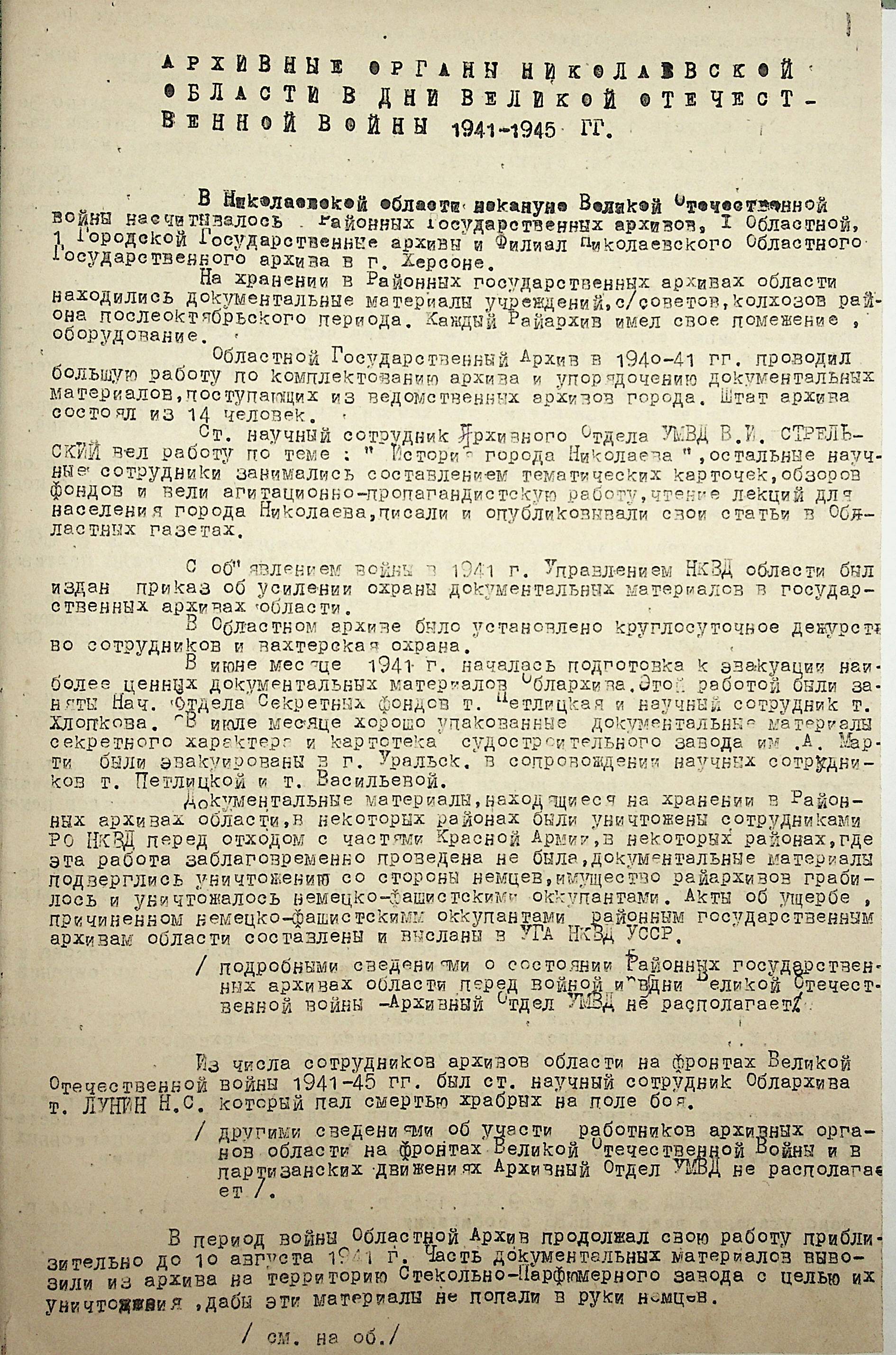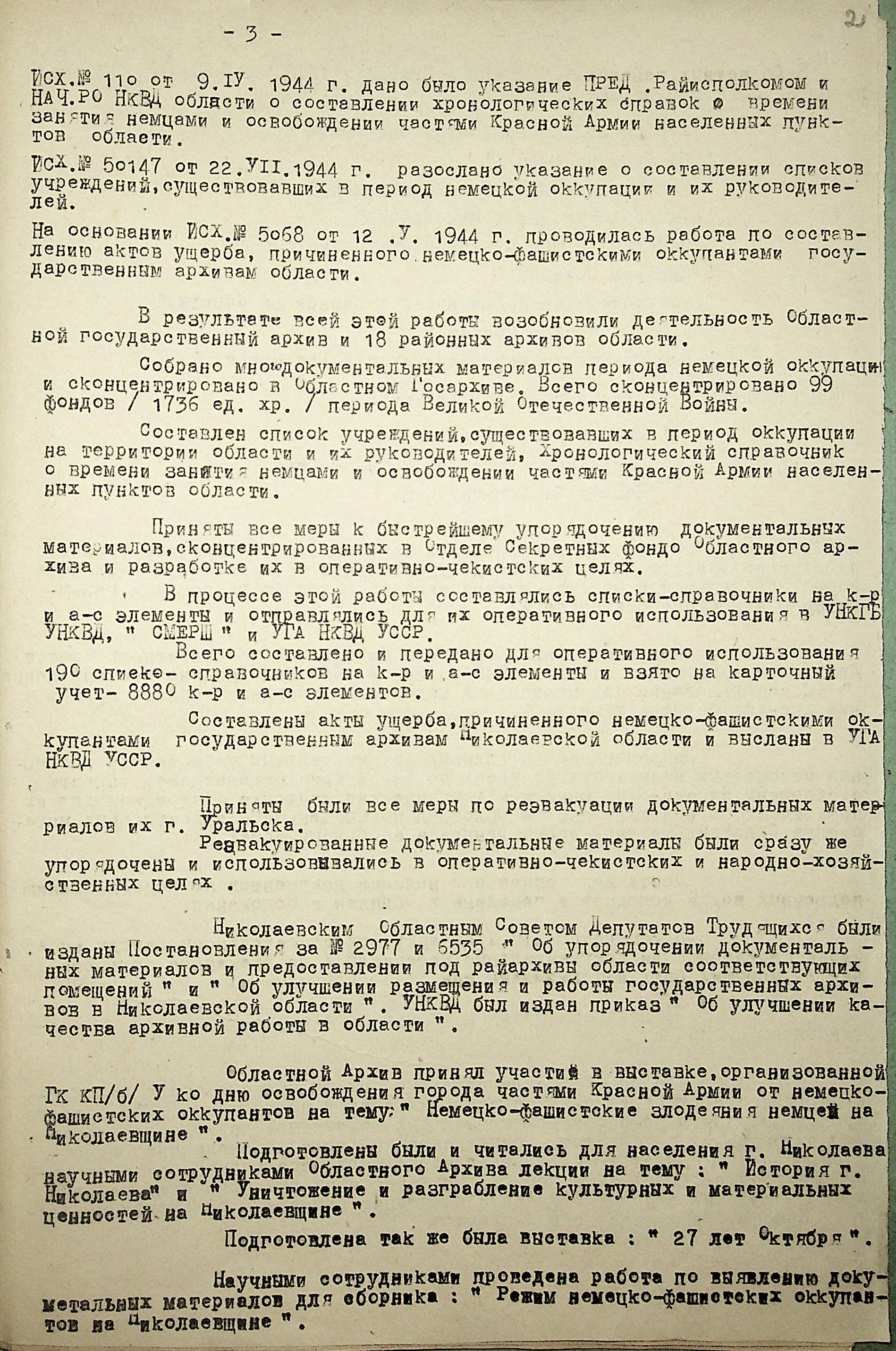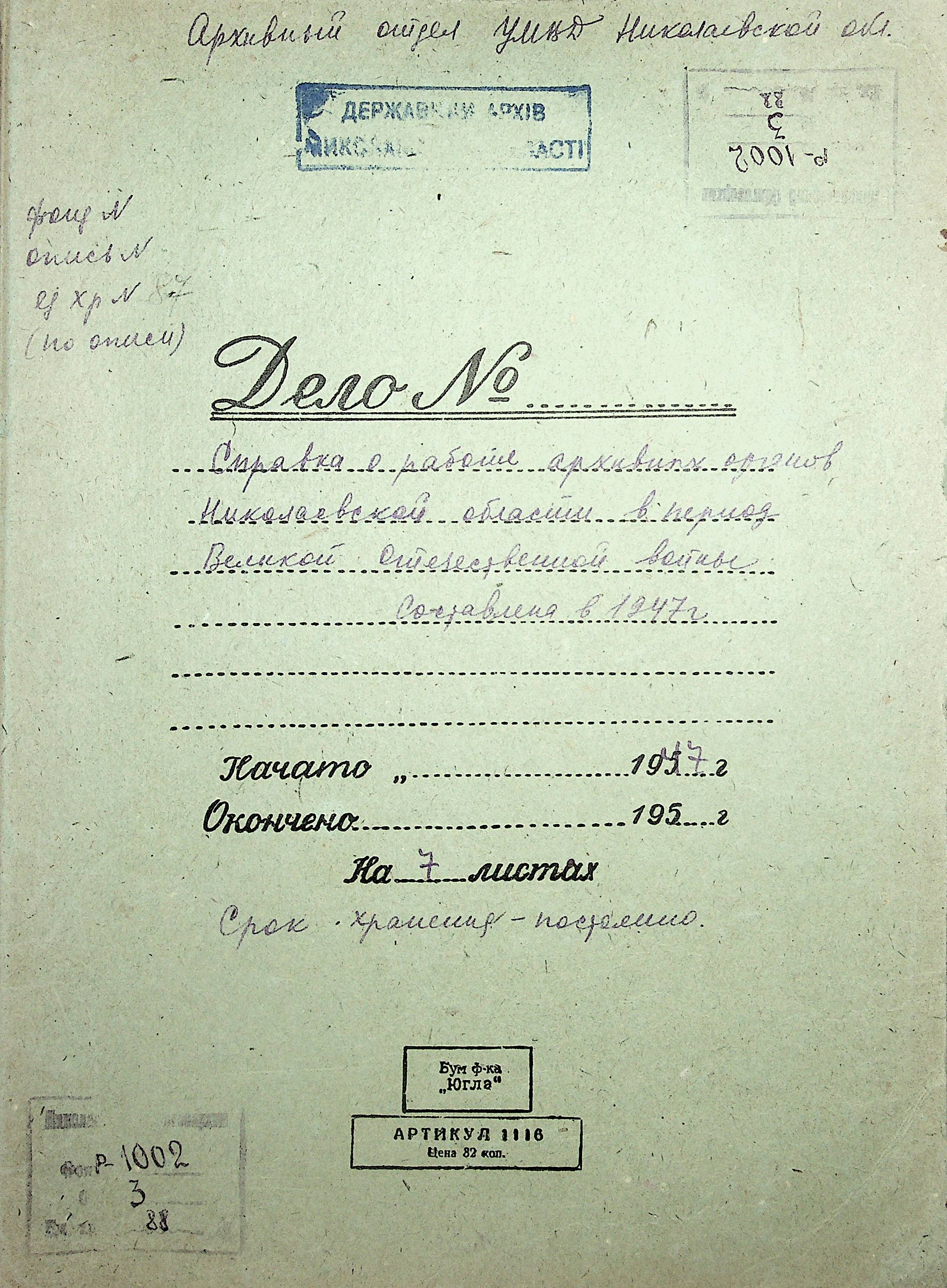 • • • • Справа № 88 “Довідка про роботу архівних організацій Миколаївської області під час Другої Світової війни. Складено 1947 р.”