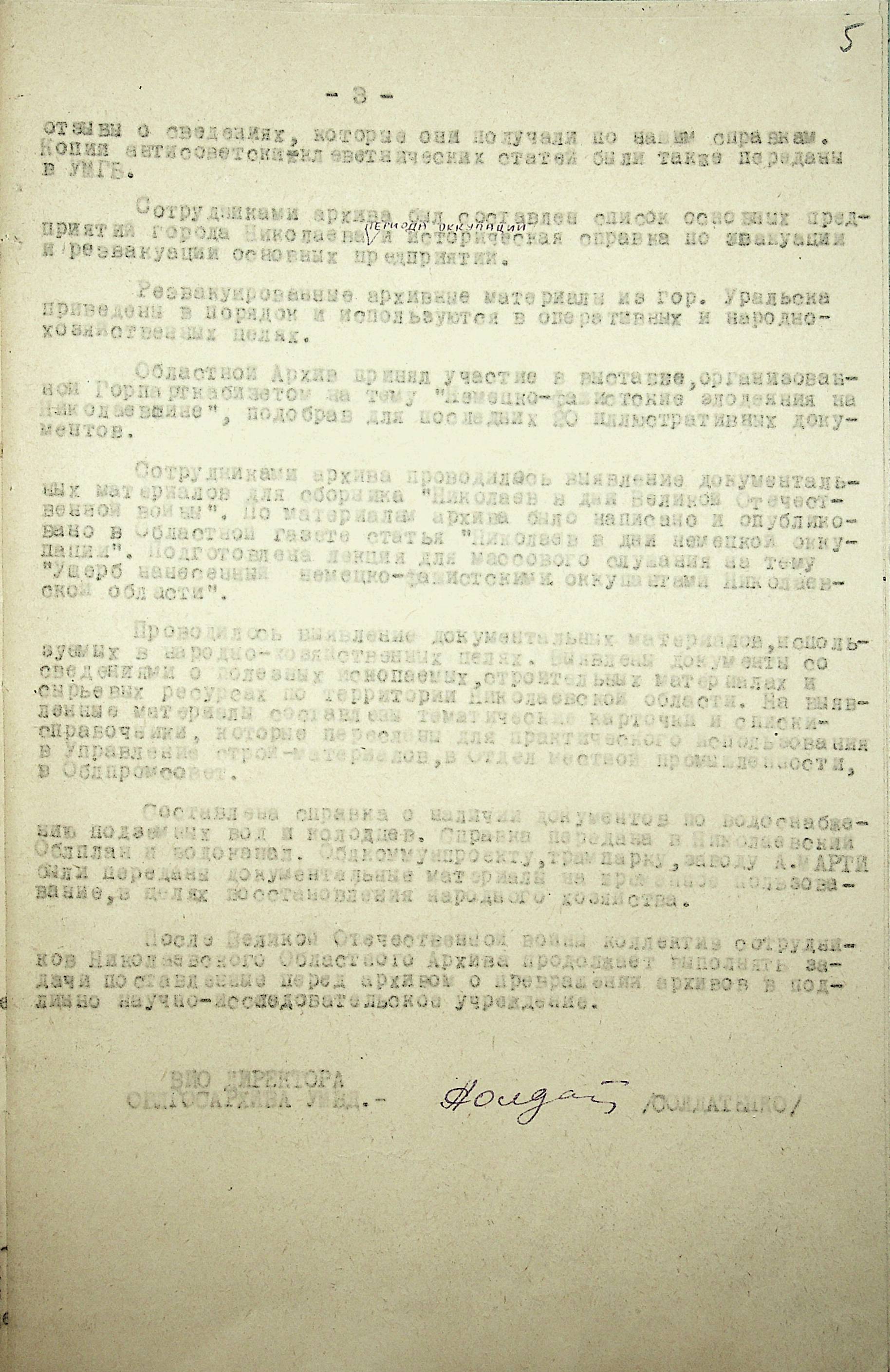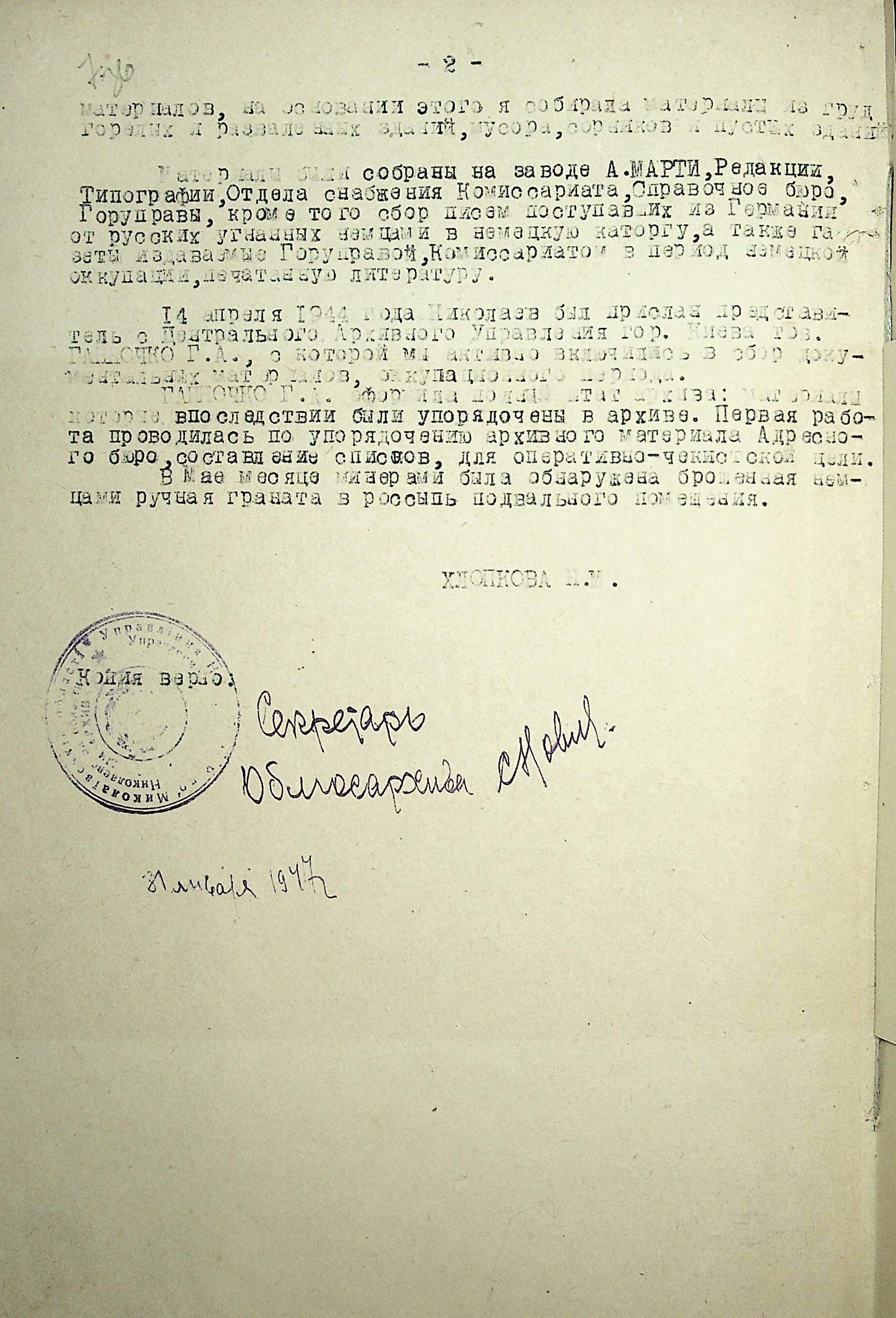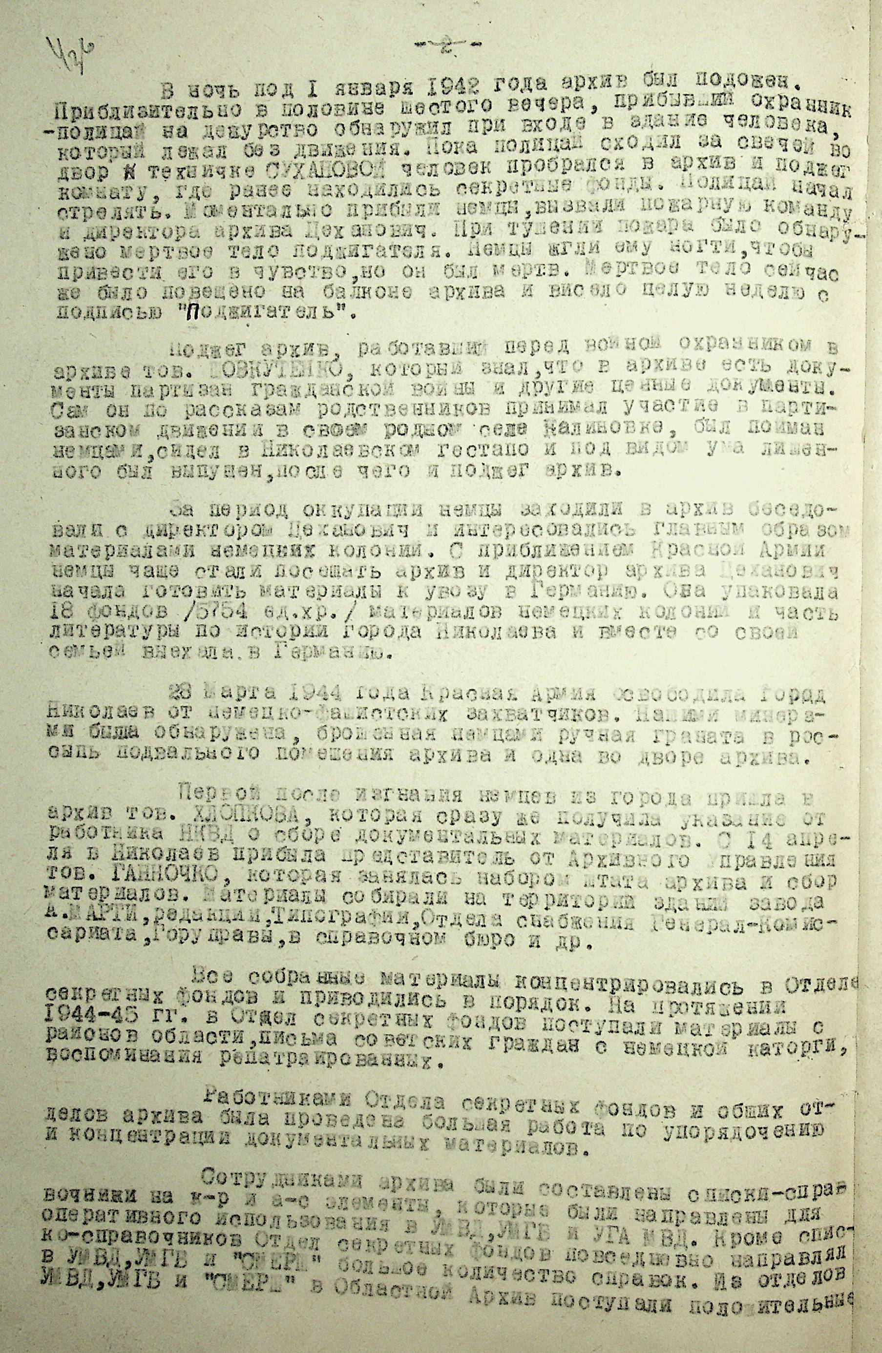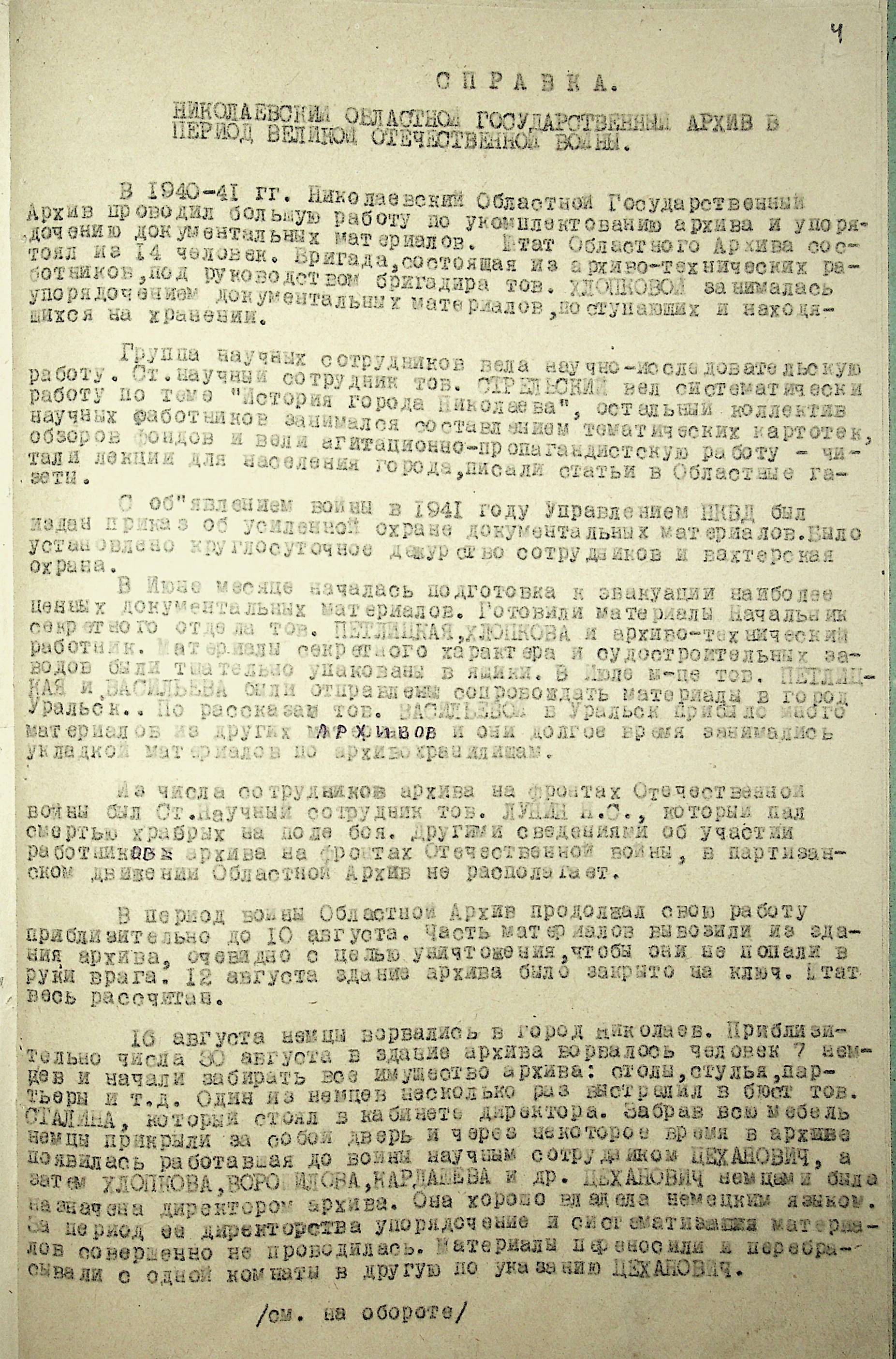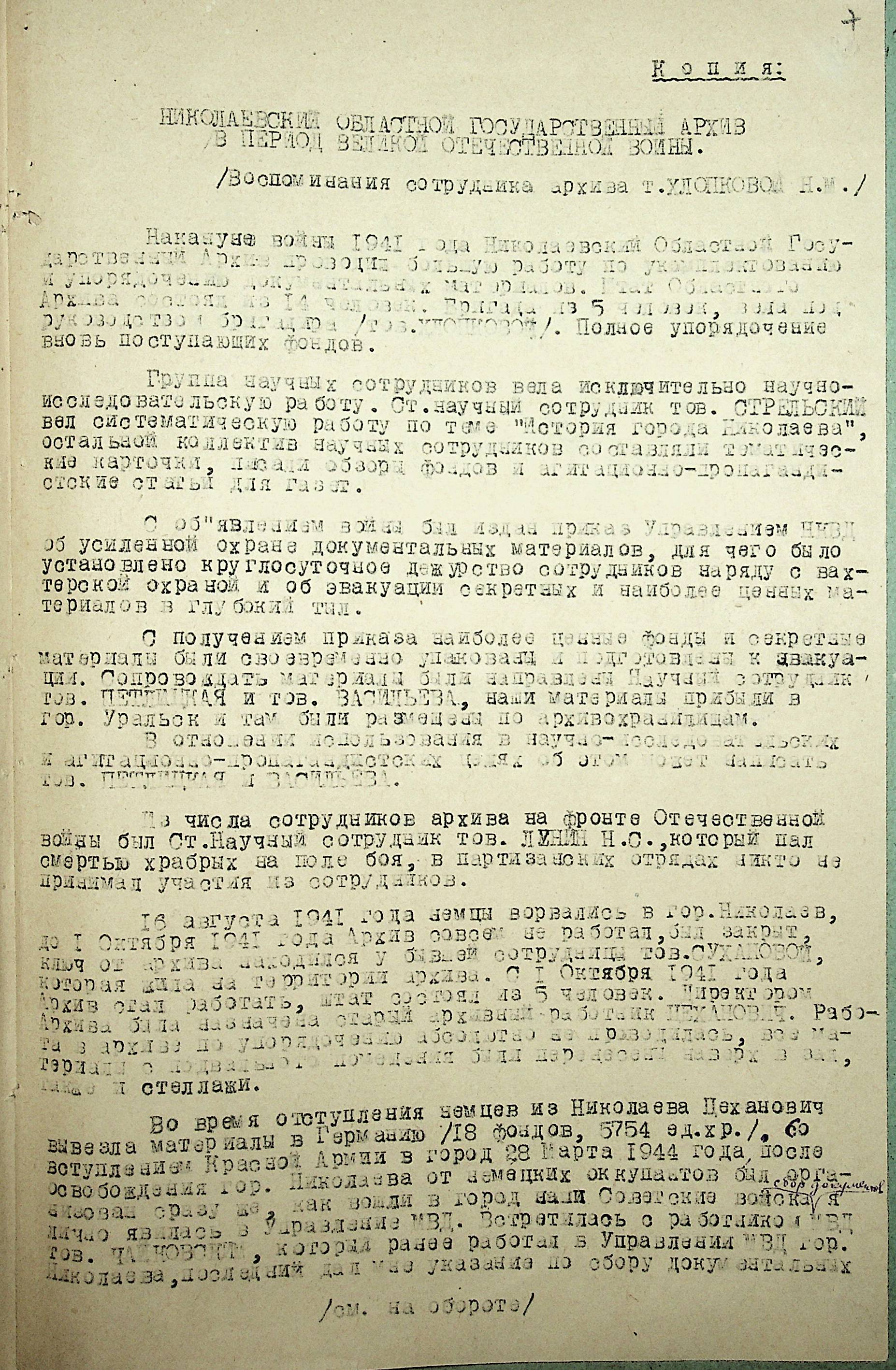 • • • • Справа № 88 “Довідка про роботу архівних організацій Миколаївської області під час Другої Світової війни. Складено 1947 р.”