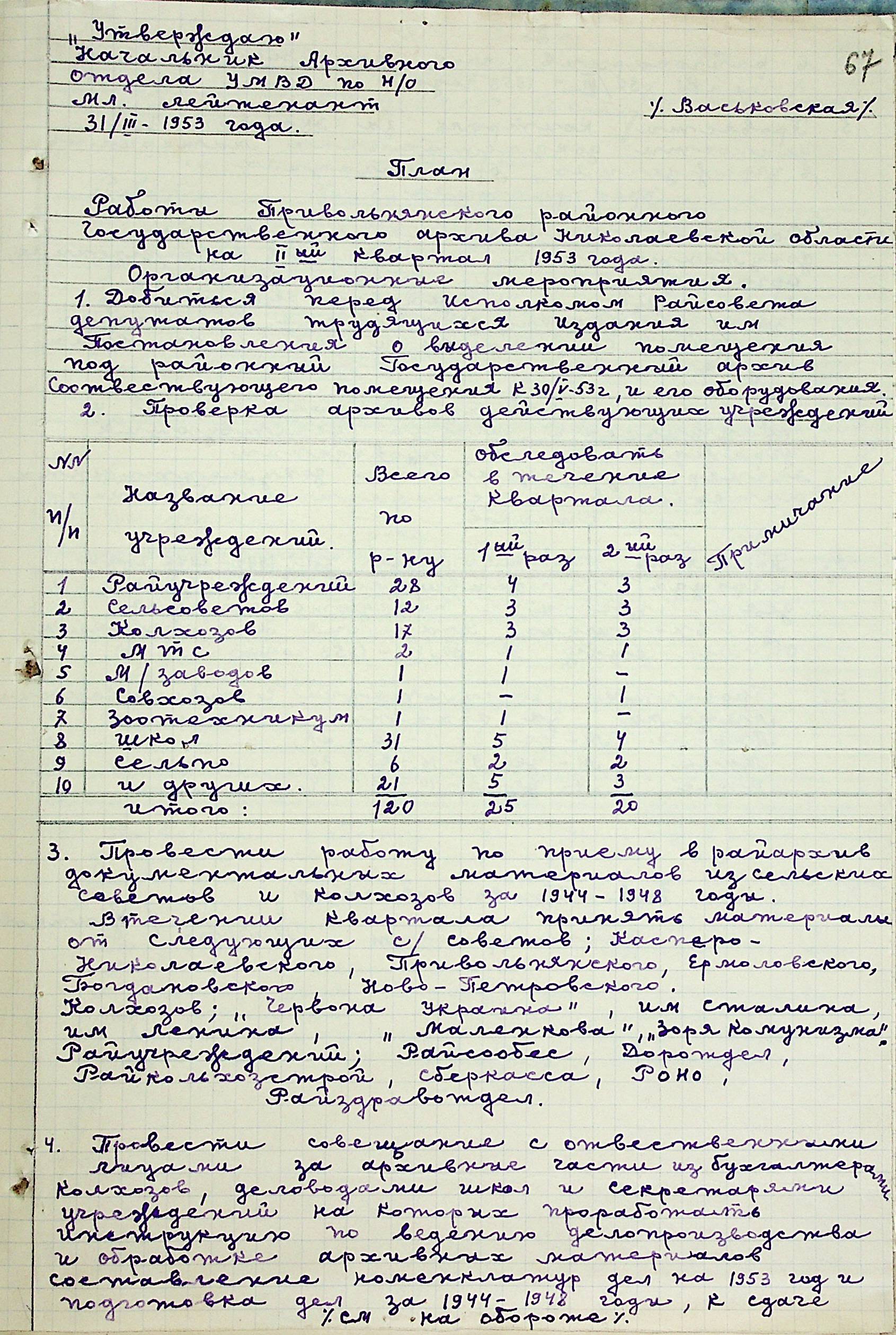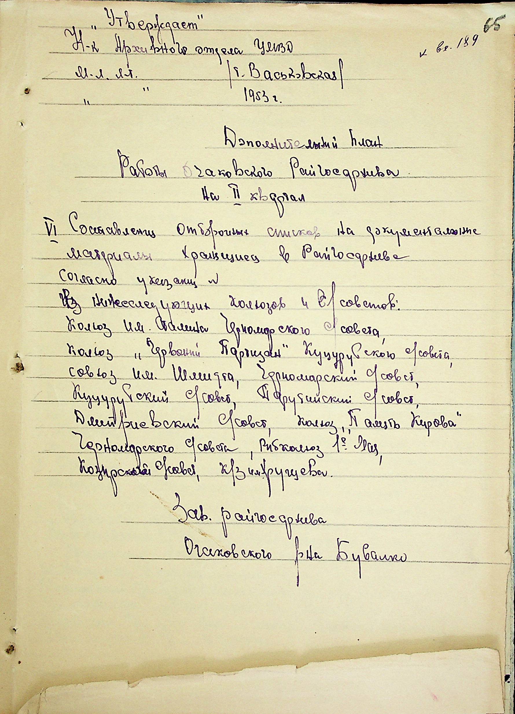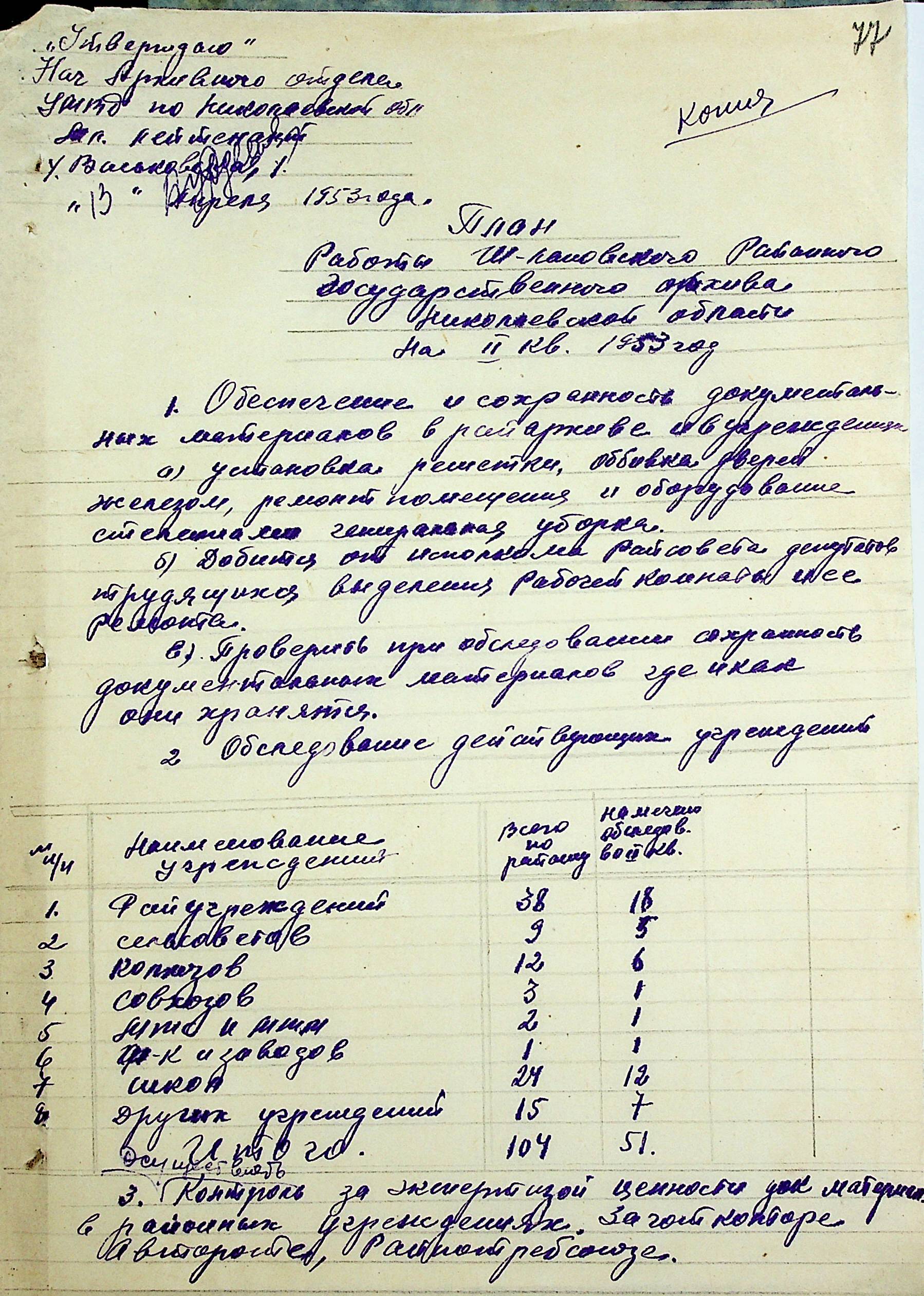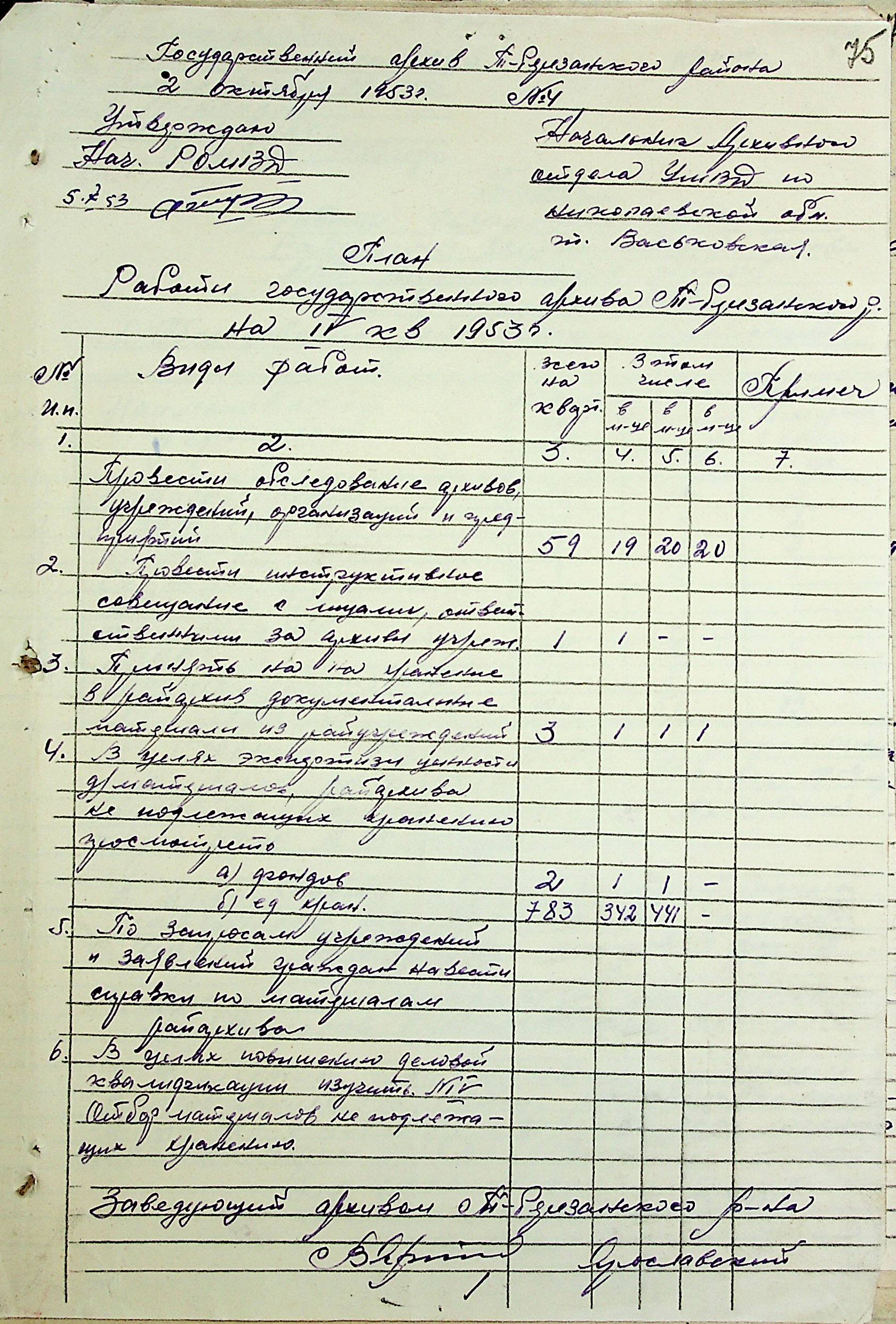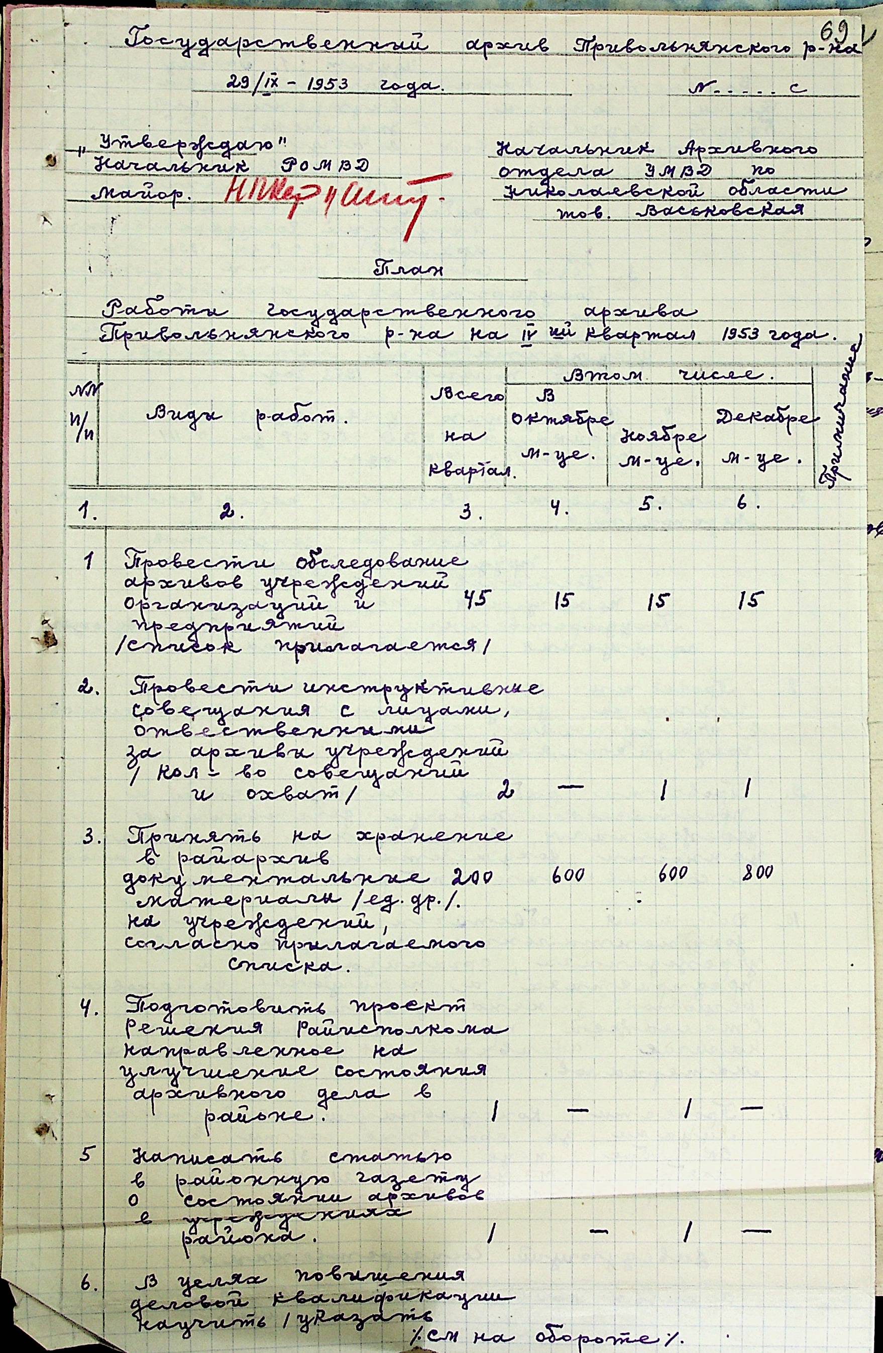 • • • • Справа № 205 “Квартальні плани роботи міських та районних архівів Миколаївської області за 1953 р.”