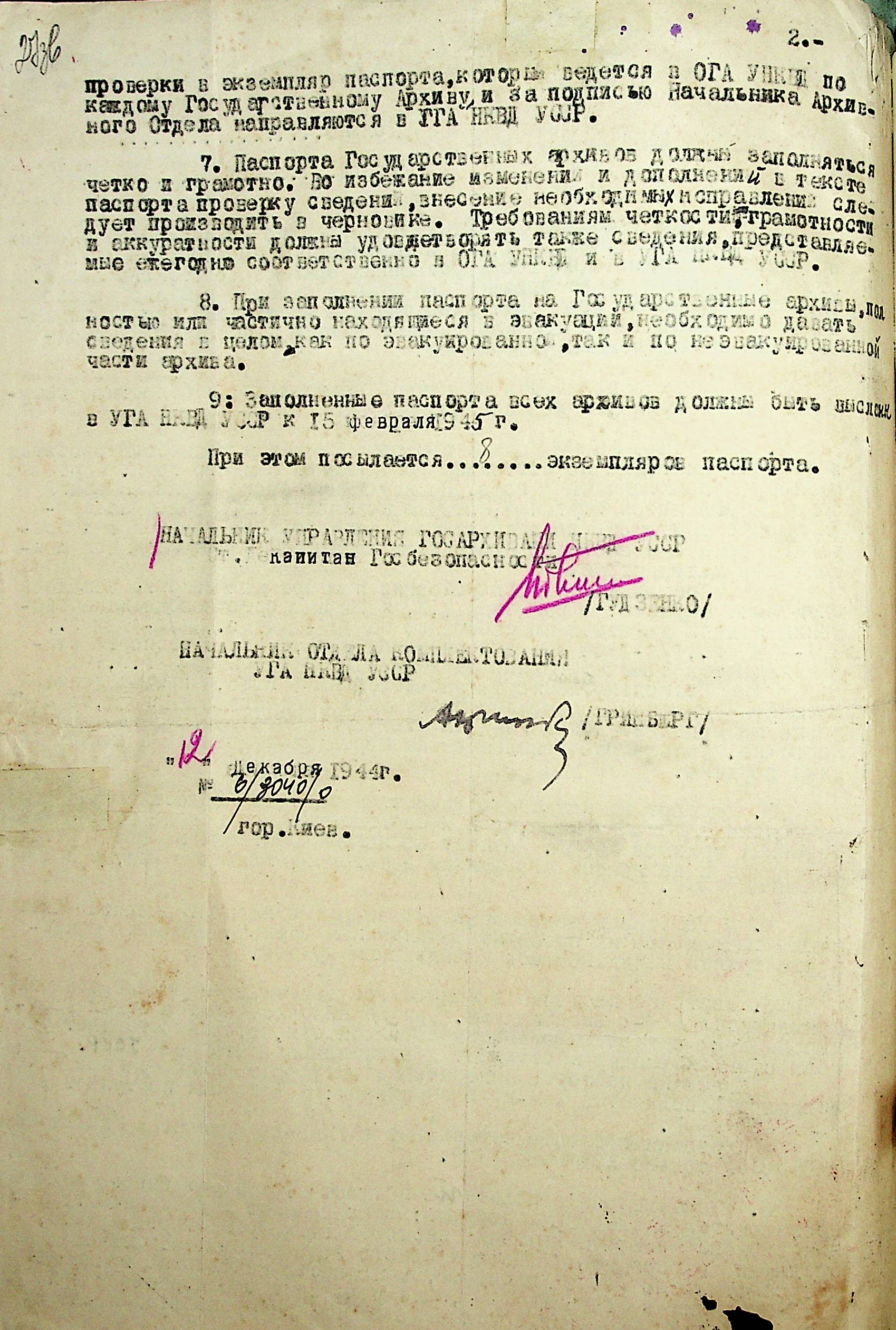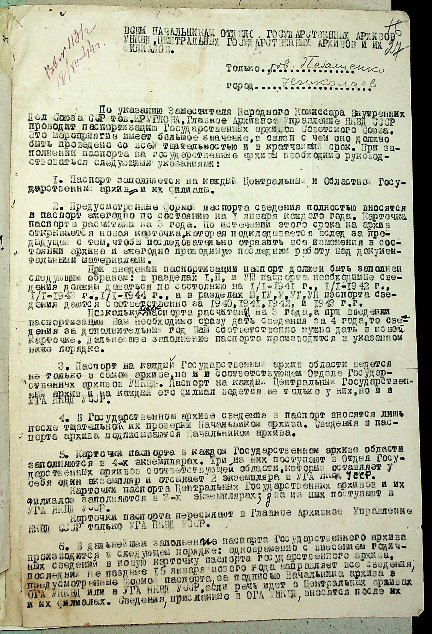 • • • • Справа № 211 “Листування з відділом Державних архівів Управління НКВС УРСР про забезпечення створення документальної бази з історії Другої Світової війни; проведення паспортизації державних архівів; про стан архівних довідок; про шкоду завдану німецько-фашистськими загарбниками”