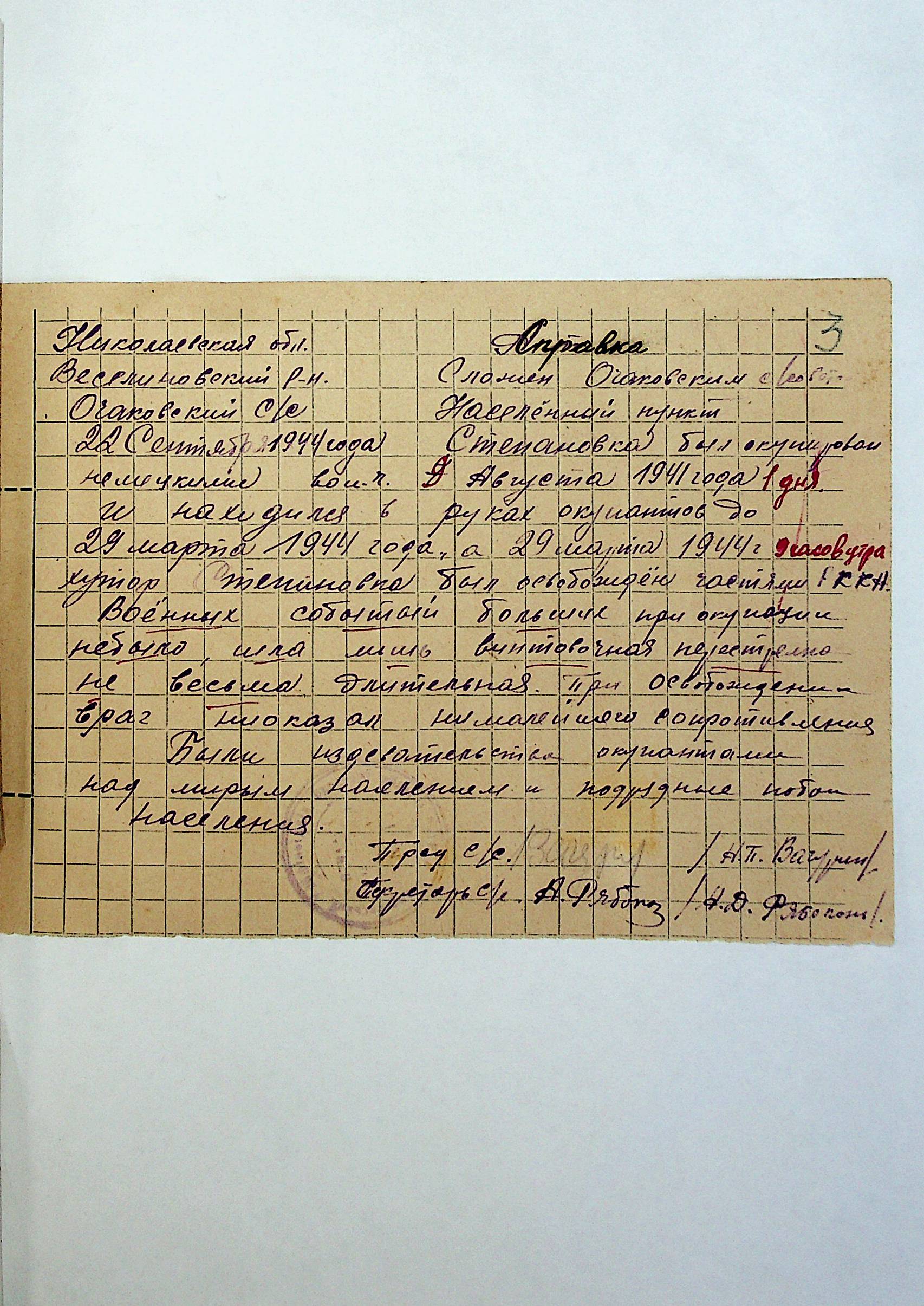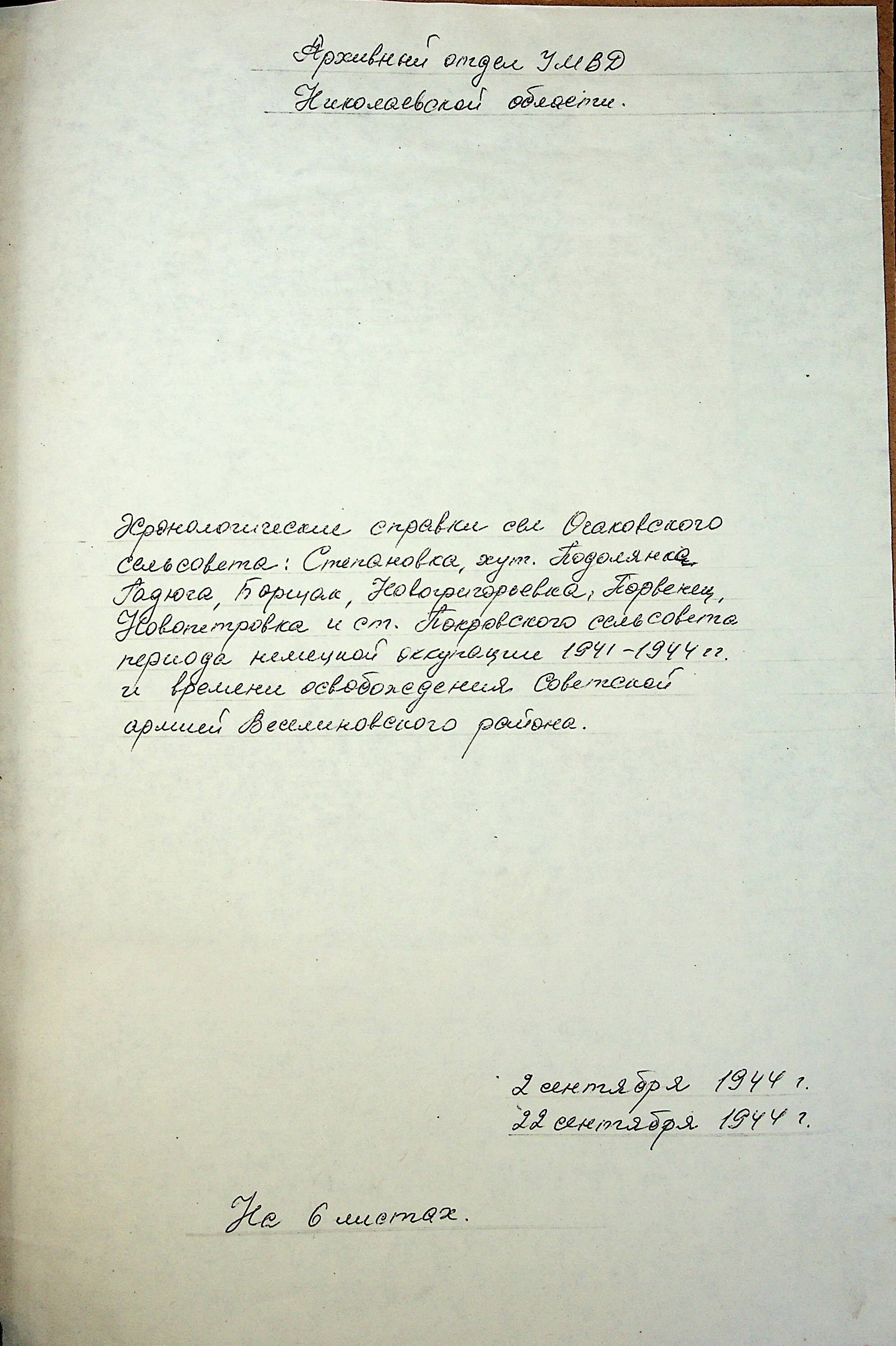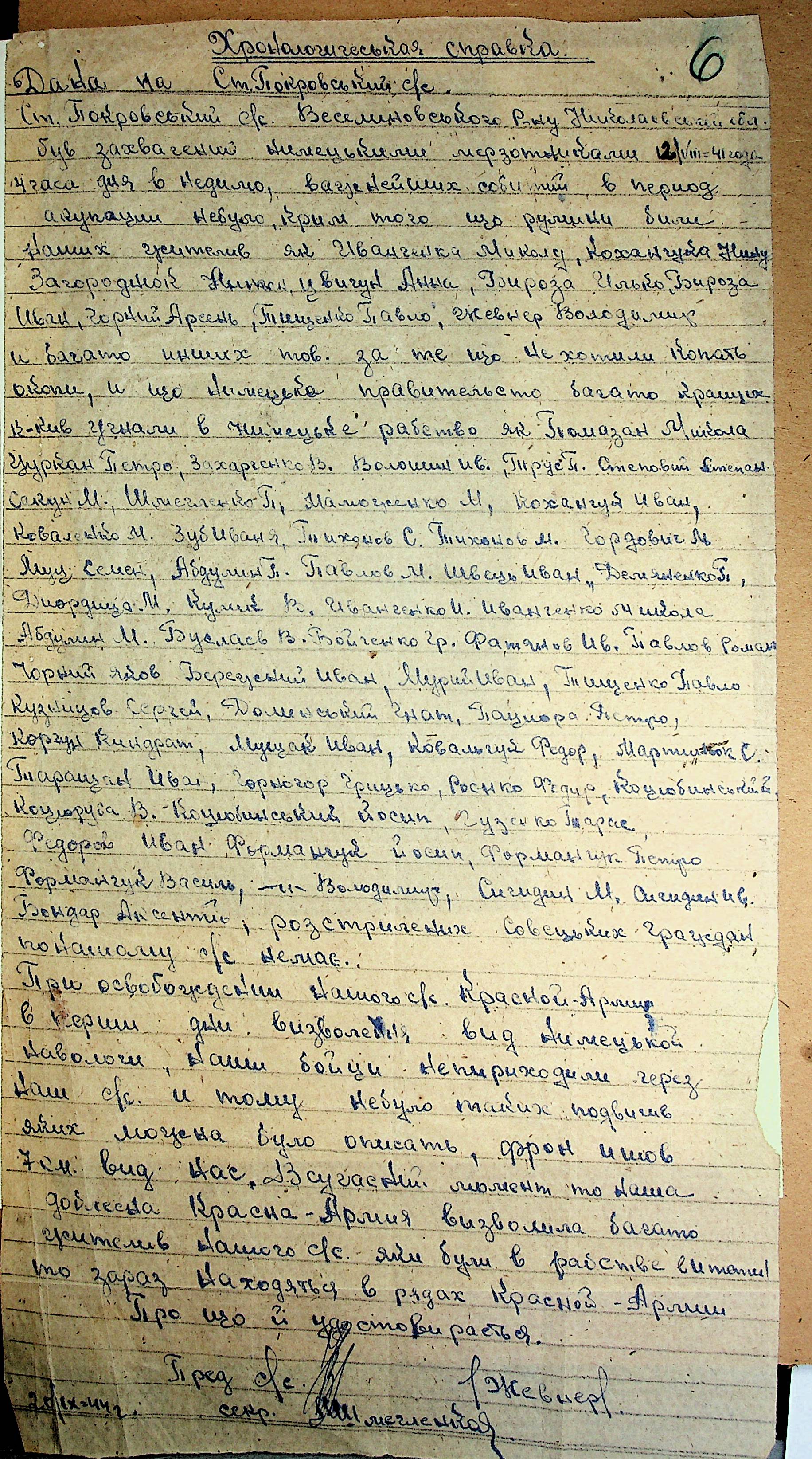 • • • • Справа № 212 “Хронологічні довідки сіл Очаківської сільради та Покровської сільради періоду німецької окупації 1941-1944 рр. та часу визволення Радянською армією Веселинівського району”