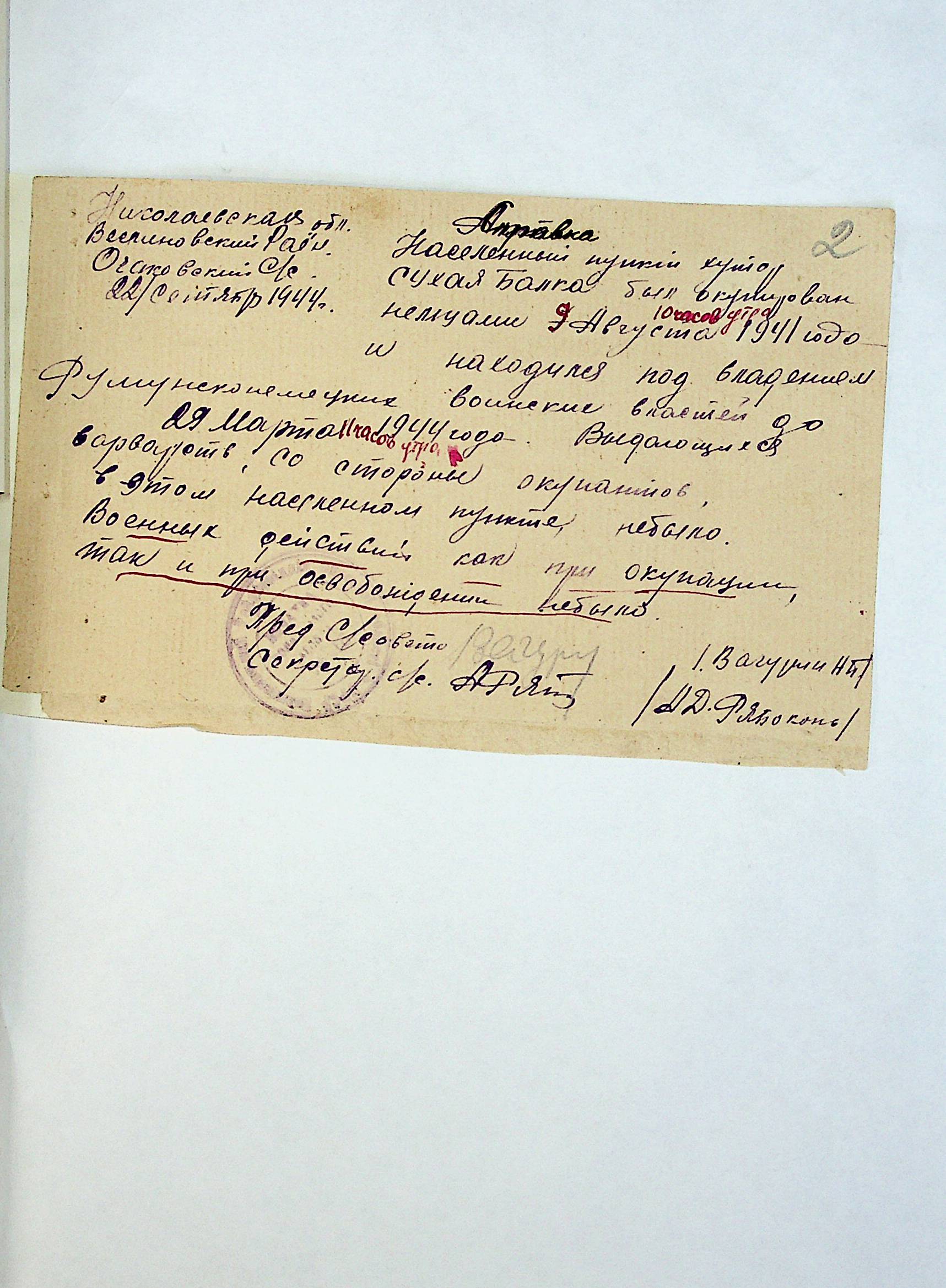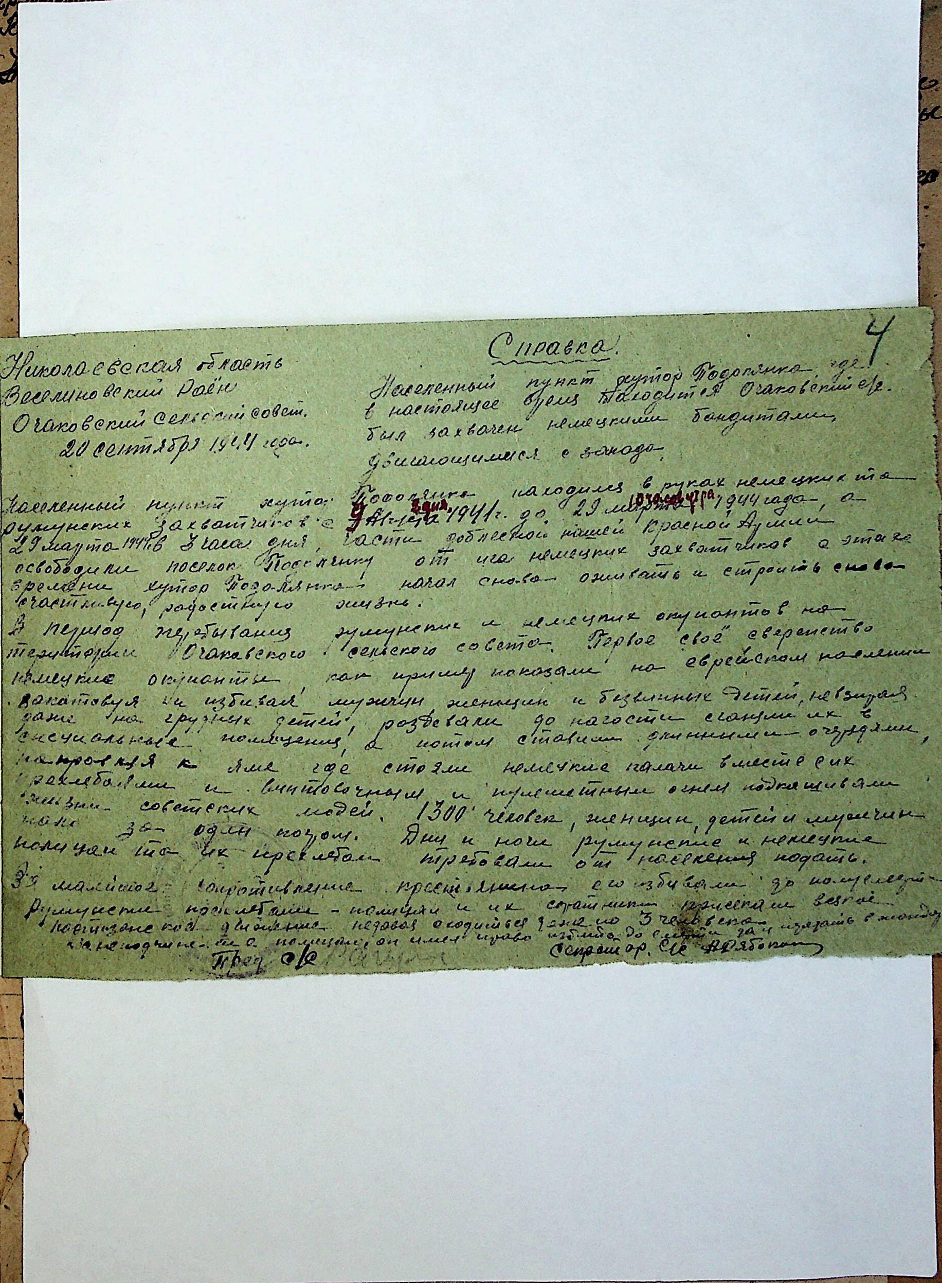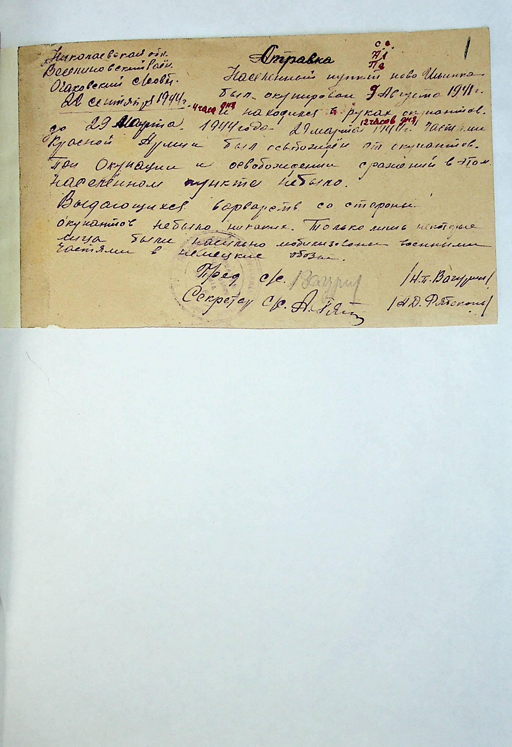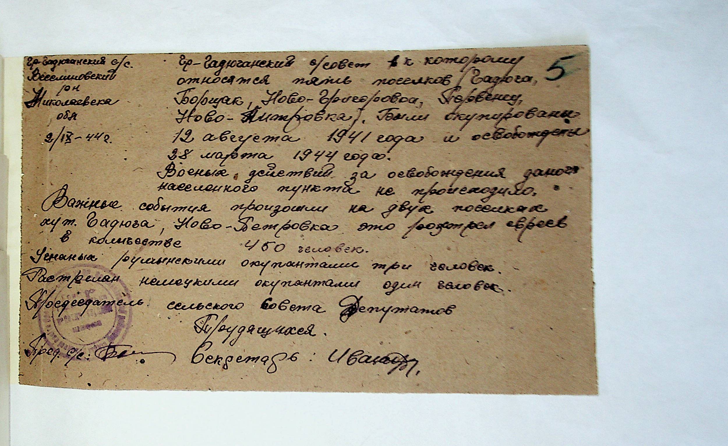 • • • • Справа № 212 “Хронологічні довідки сіл Очаківської сільради та Покровської сільради періоду німецької окупації 1941-1944 рр. та часу визволення Радянською армією Веселинівського району”