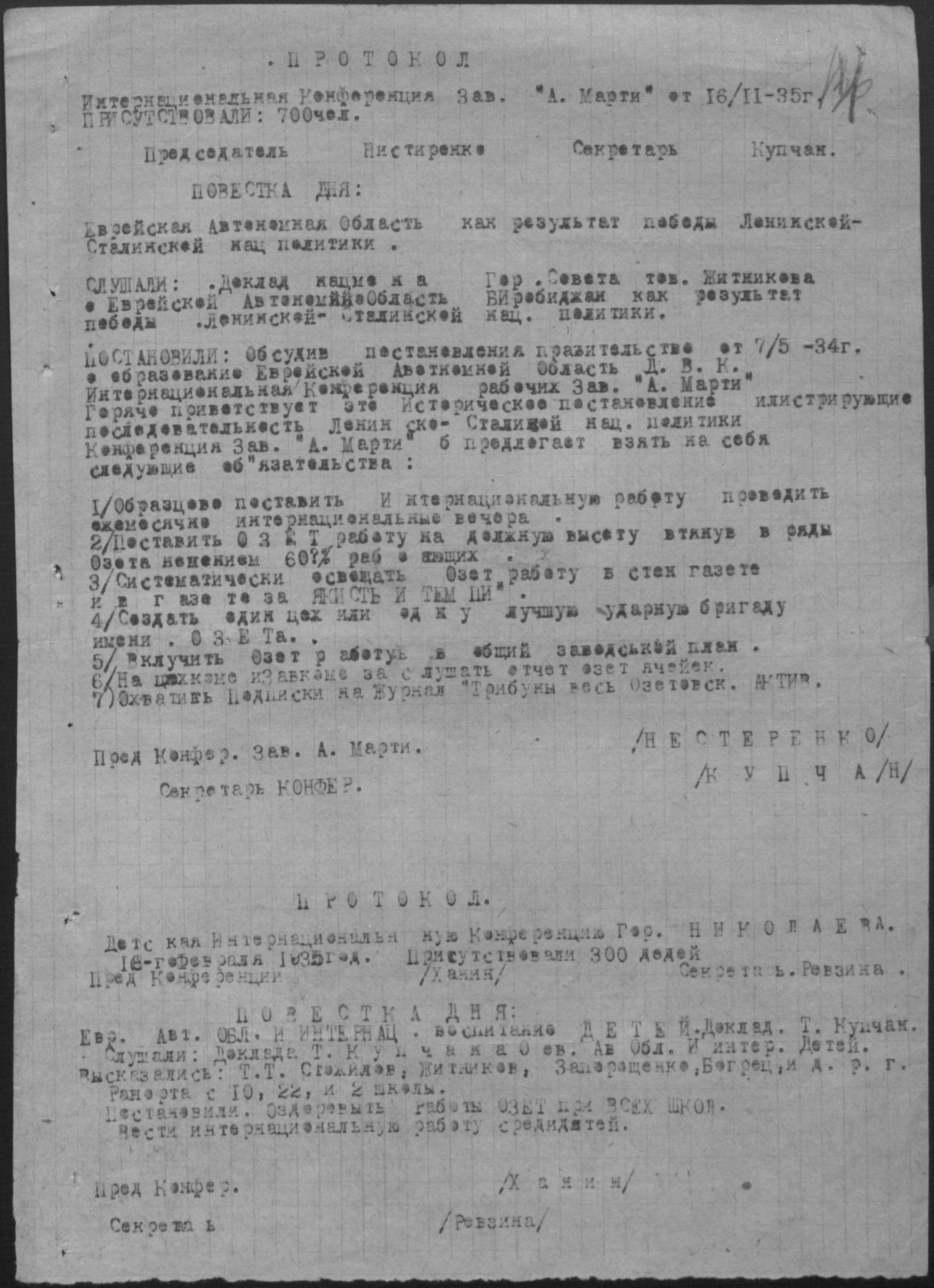 • • • • Справа № 2 “Протоколи загальних зборів осередків, загальної міської конференції та інтернаціональної конференції заводу А. Марті про підготовку до І-го з’їзду Рад Єврейської автономної області”