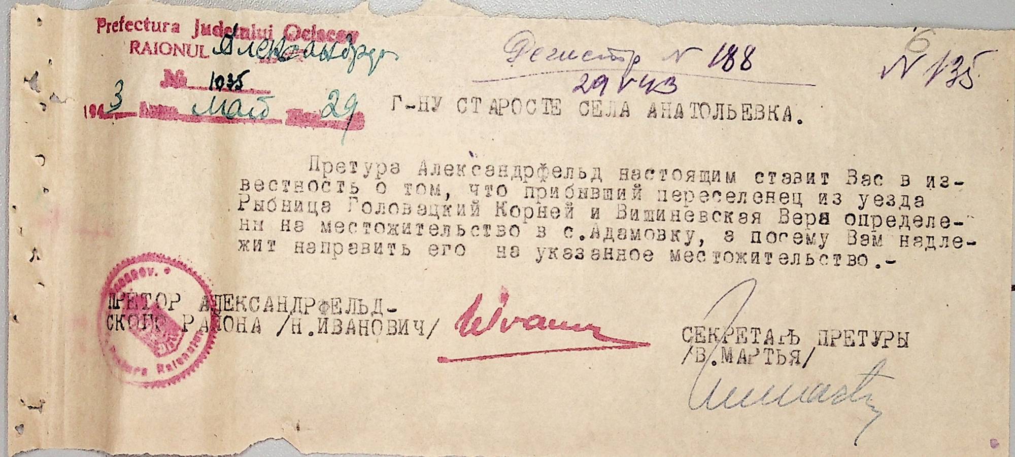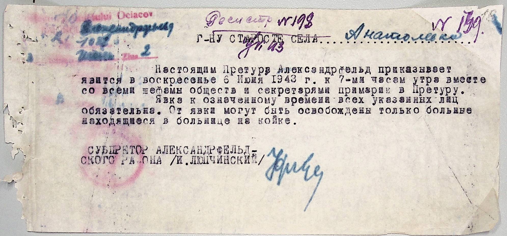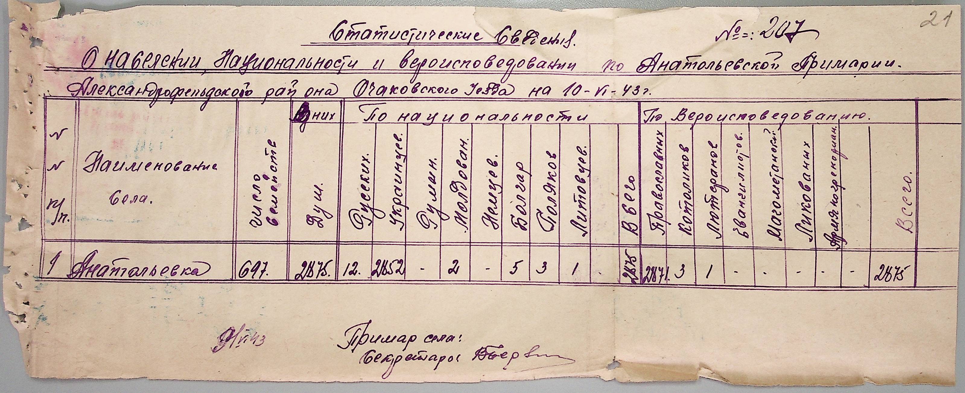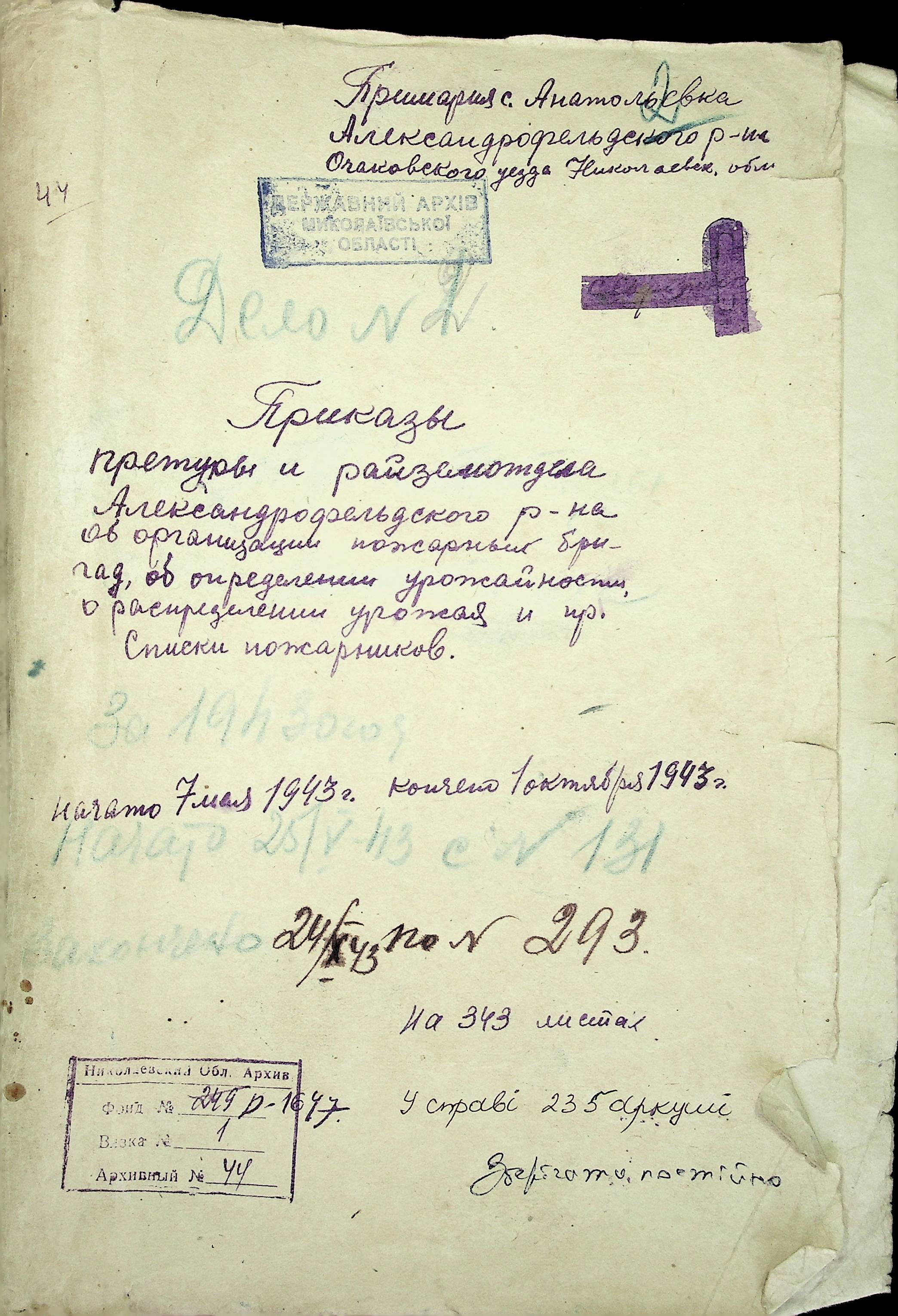 ◦ ◦ Фонд № Н-1647 “Примарія с. Анатолівка Александрфельдського району Очаківського повіту”