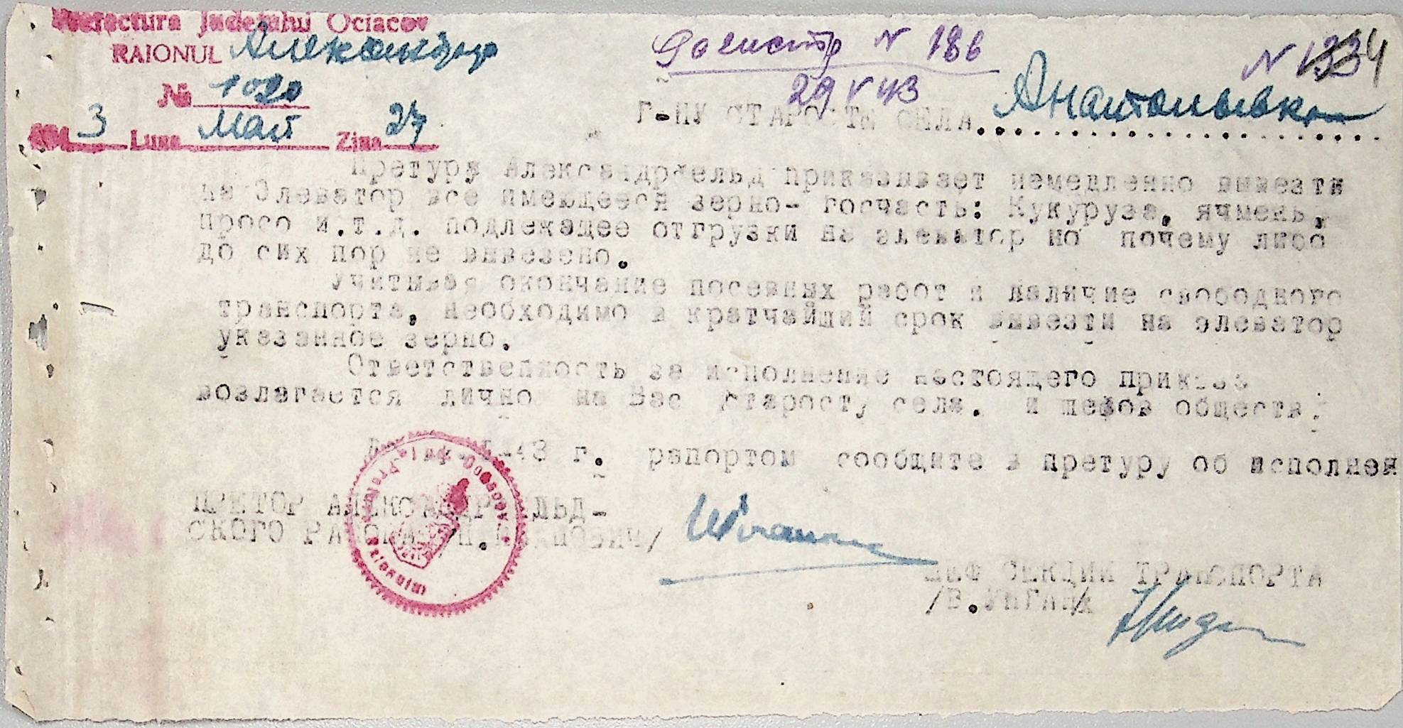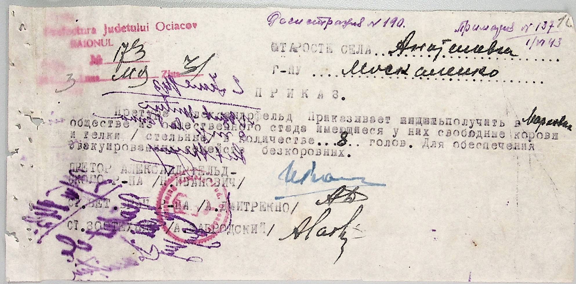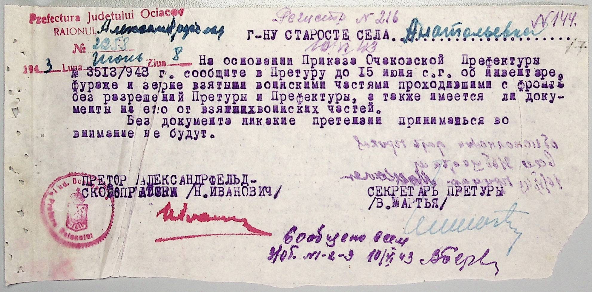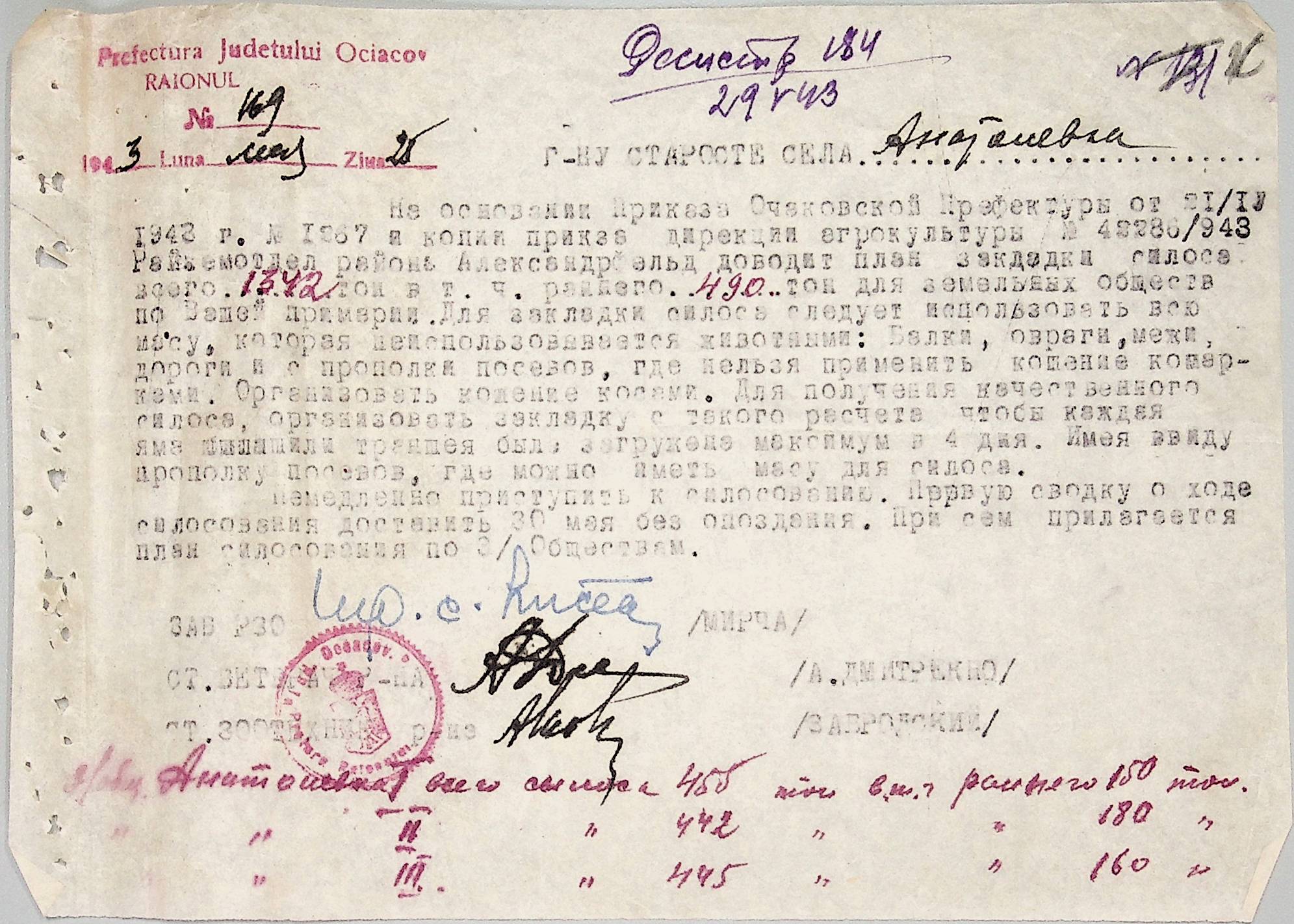 • • • • Справа № 44 “Документи (обіжники, накази, рапорти, інструкції, листування) префектури Очаківського повіту, претури і райземвідділу Александрфельдського району про протихолерне щеплення, боротьбу зі сказом тварин, визначення врожайності і розподіл врожаю, норми відгодівлі тварин; про порядок складання поліцейських звітів, організацію пожежних бригад та інш. питань”