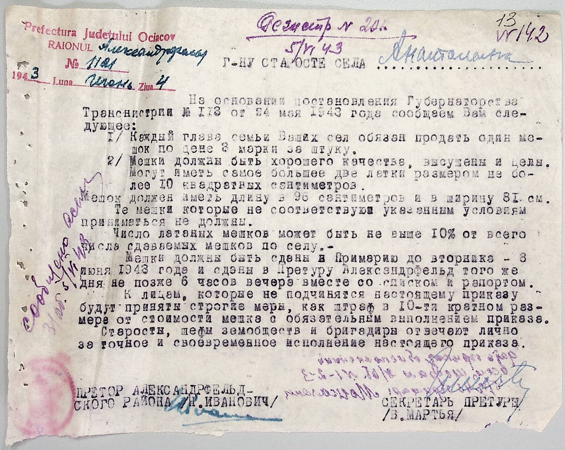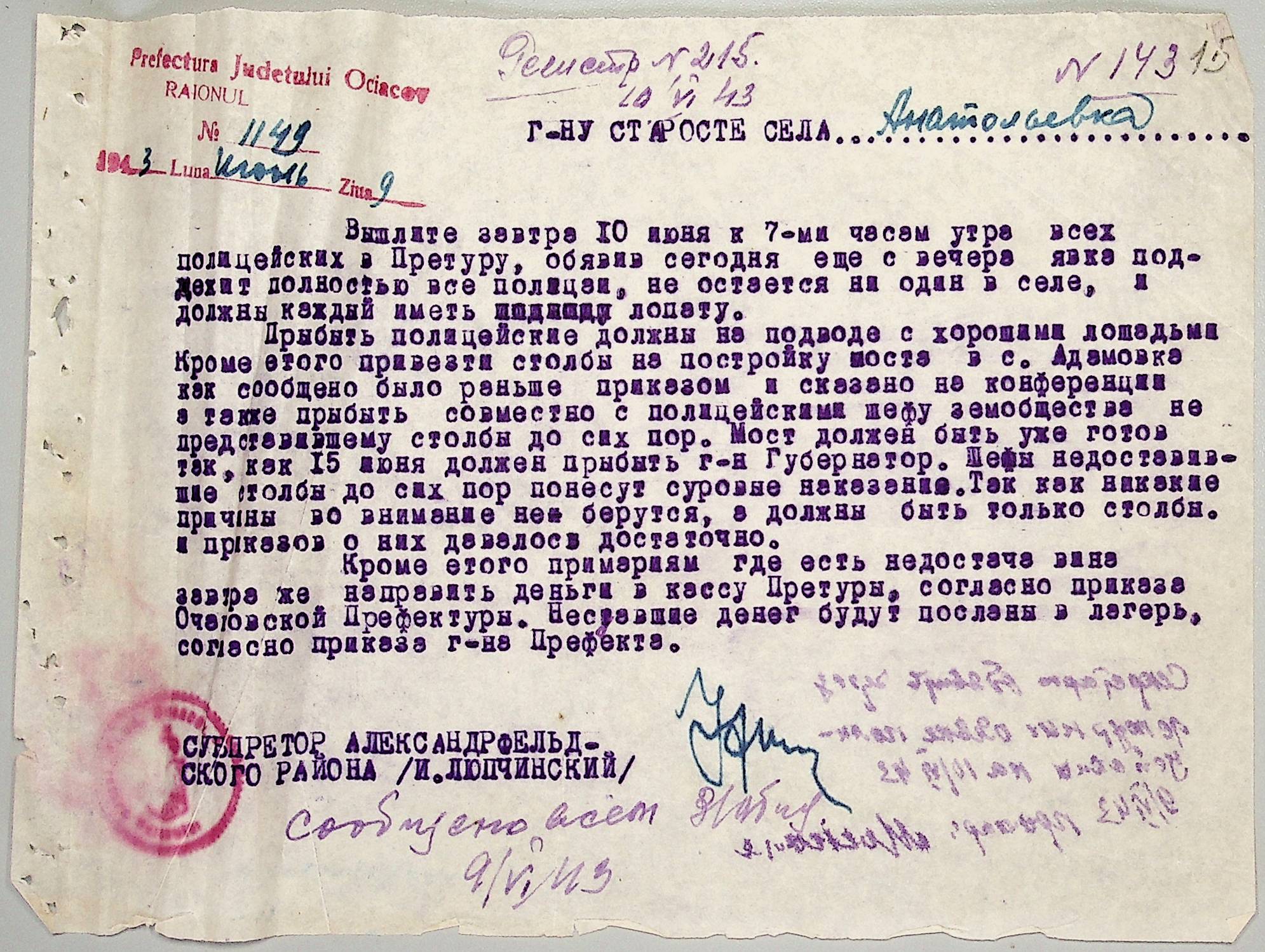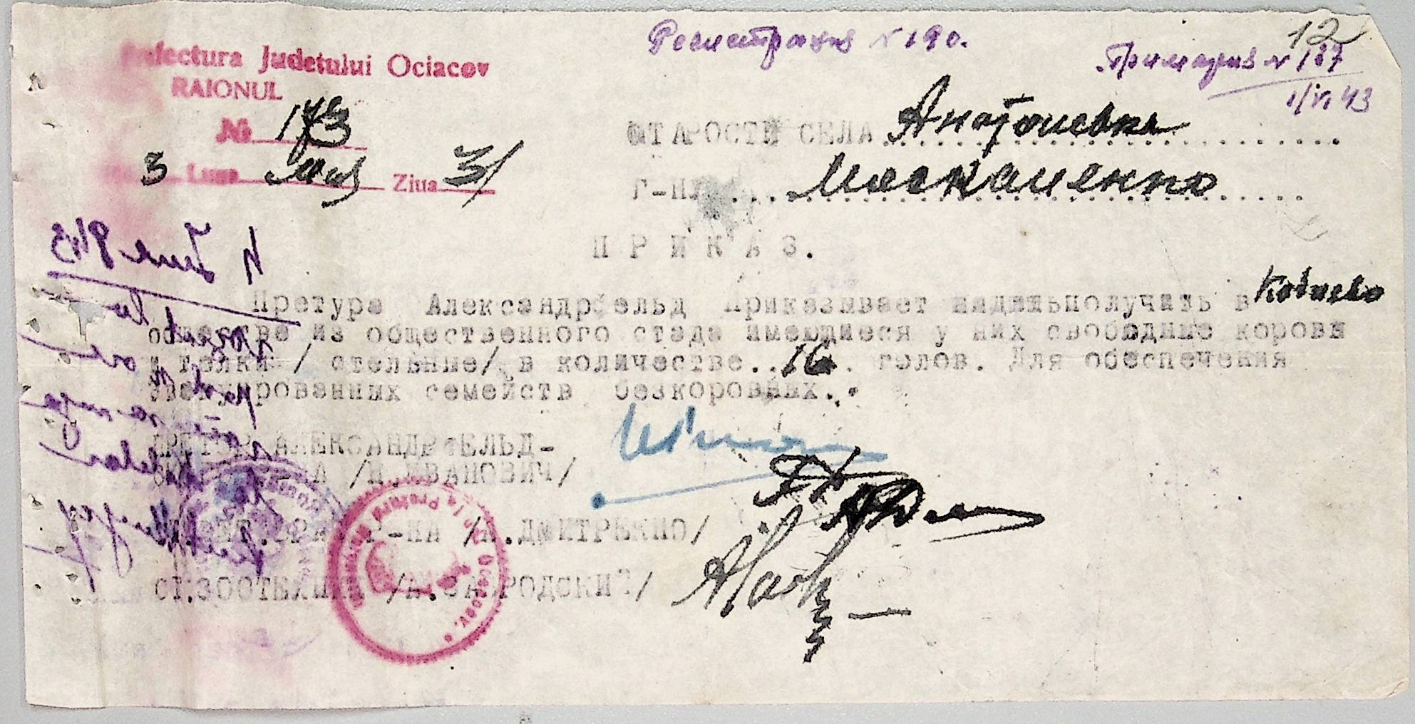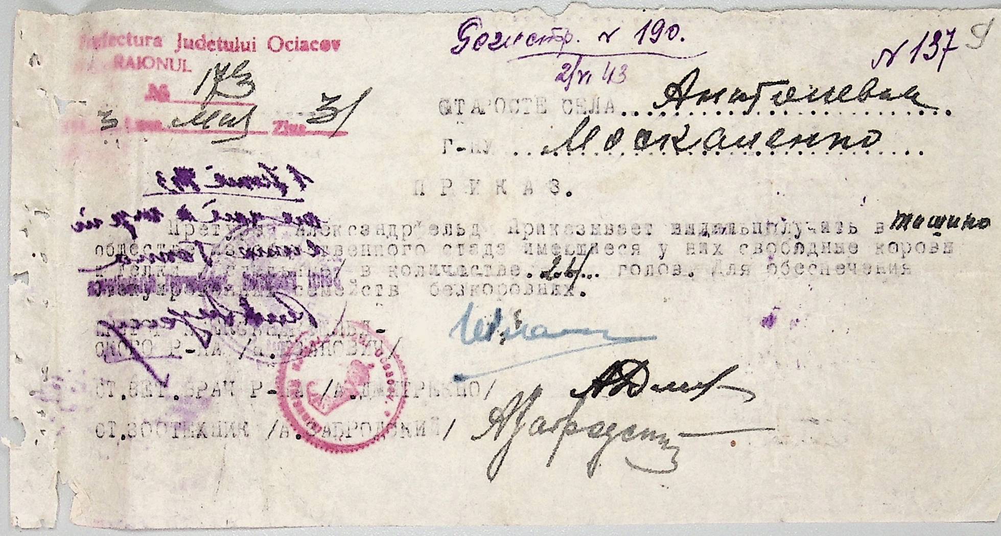 • • • • Справа № 44 “Документи (обіжники, накази, рапорти, інструкції, листування) префектури Очаківського повіту, претури і райземвідділу Александрфельдського району про протихолерне щеплення, боротьбу зі сказом тварин, визначення врожайності і розподіл врожаю, норми відгодівлі тварин; про порядок складання поліцейських звітів, організацію пожежних бригад та інш. питань”