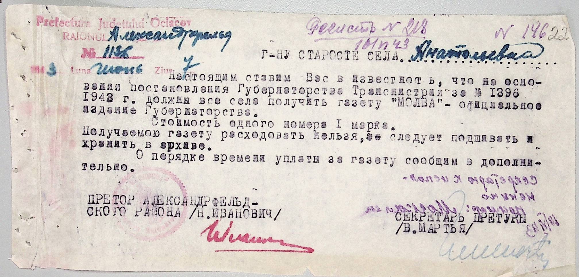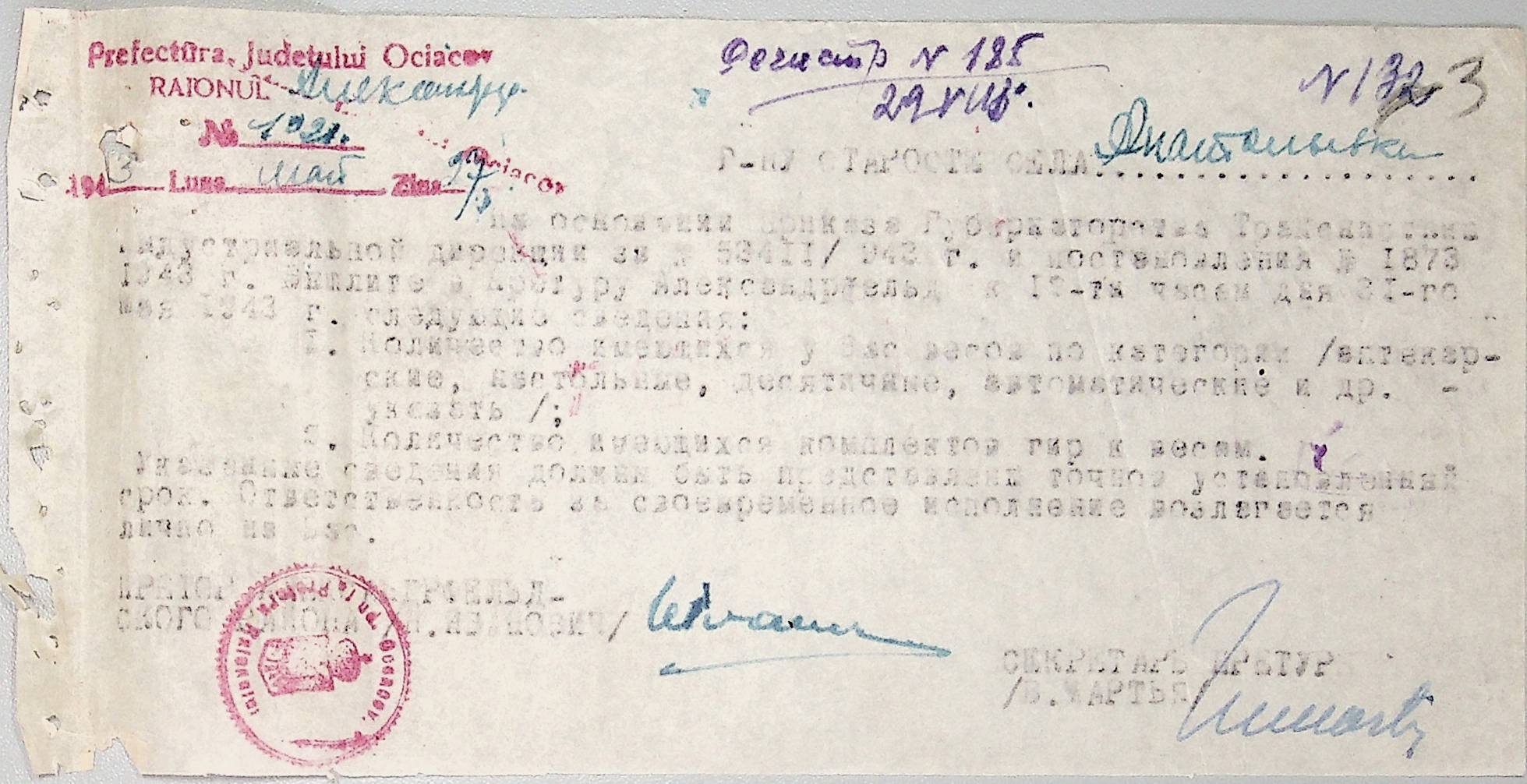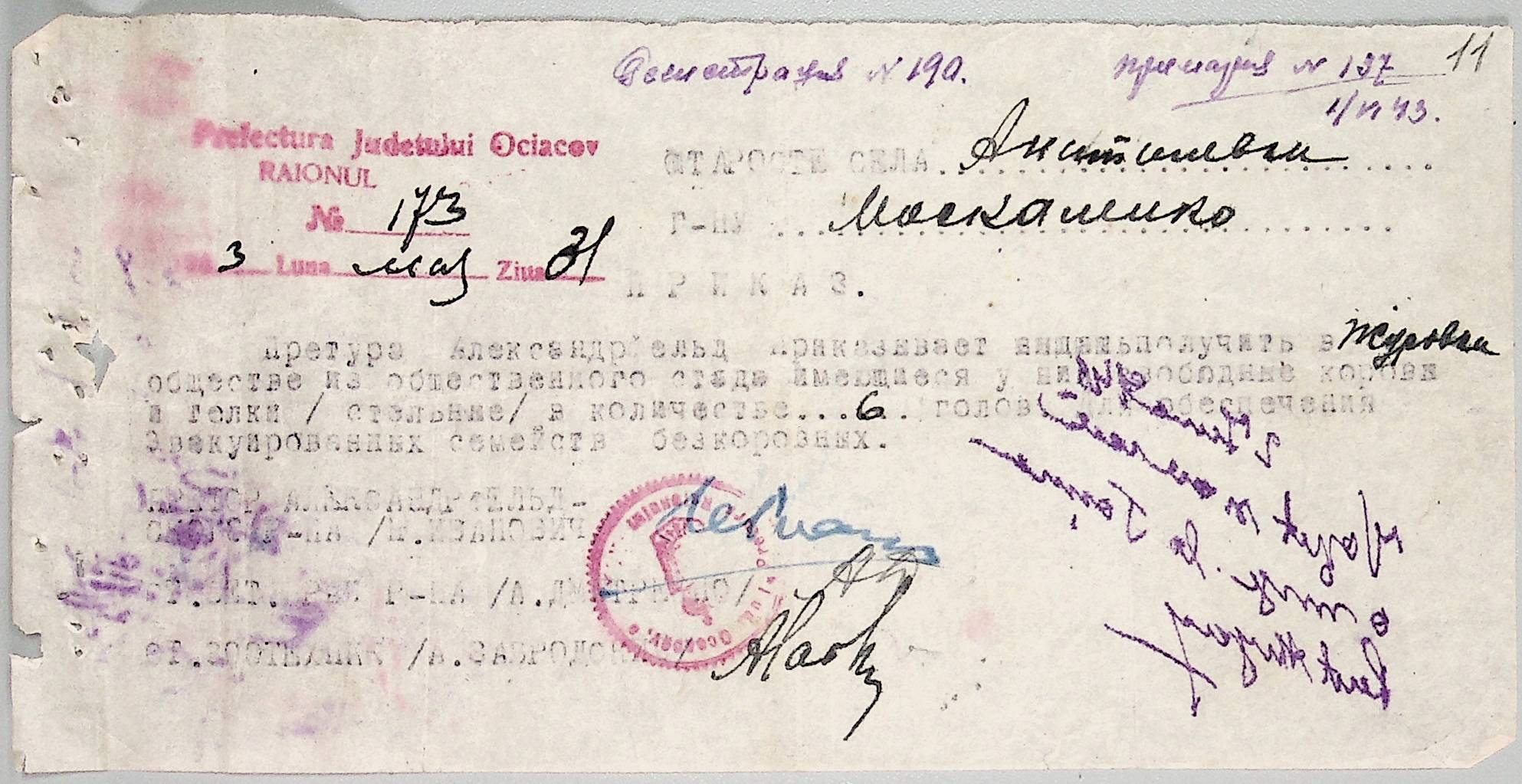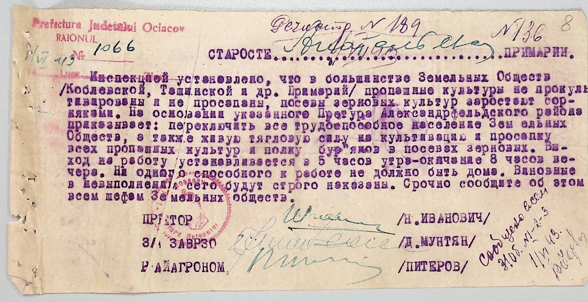 • • • • Справа № 44 “Документи (обіжники, накази, рапорти, інструкції, листування) префектури Очаківського повіту, претури і райземвідділу Александрфельдського району про протихолерне щеплення, боротьбу зі сказом тварин, визначення врожайності і розподіл врожаю, норми відгодівлі тварин; про порядок складання поліцейських звітів, організацію пожежних бригад та інш. питань”