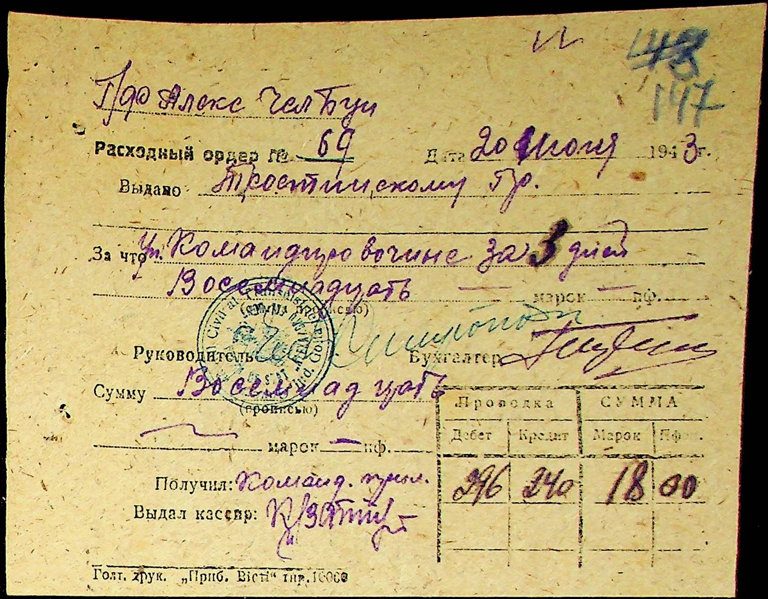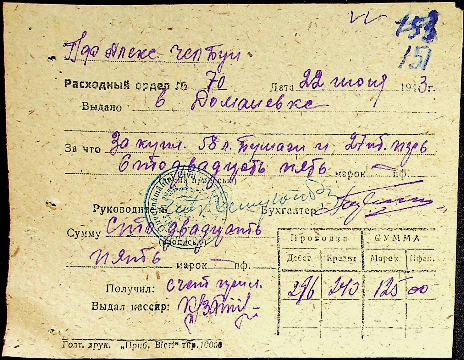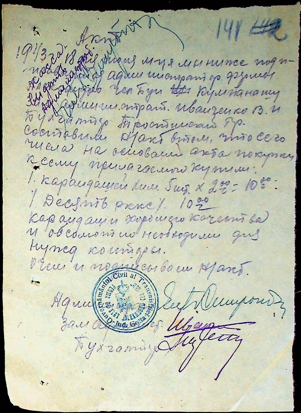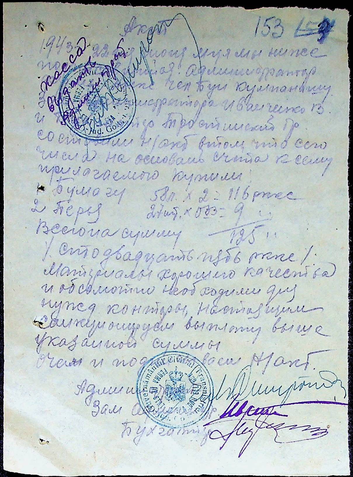 • • • • Справа № 25 “Відомості виплати зарплатні адміністративному і технічному персоналу, сезонним робітникам ферми за 1943 рік”