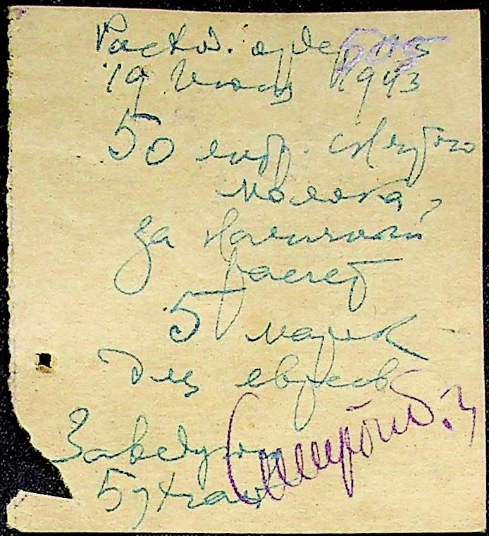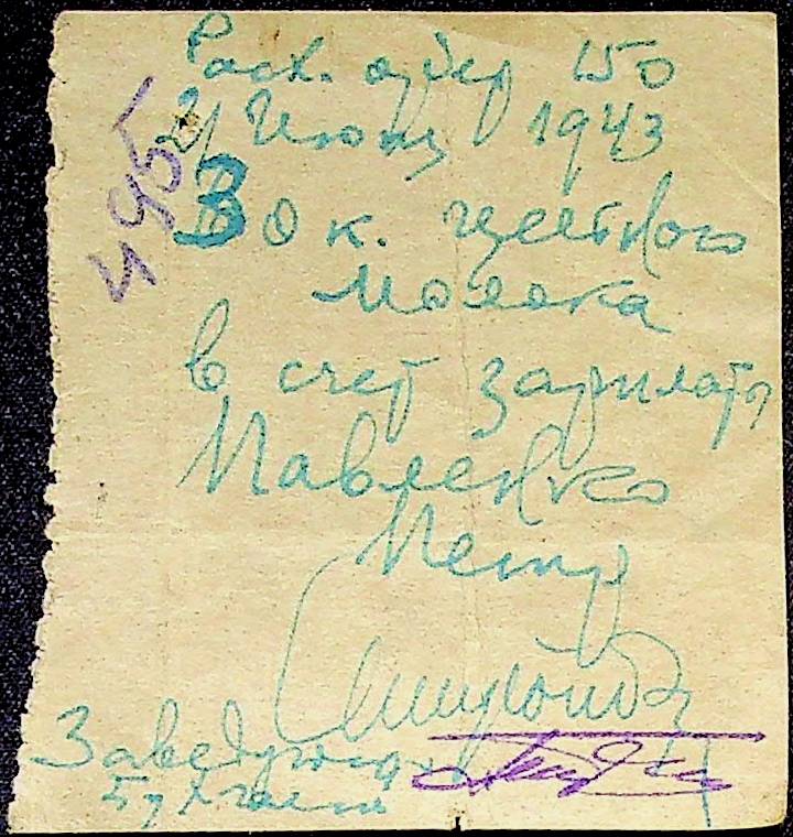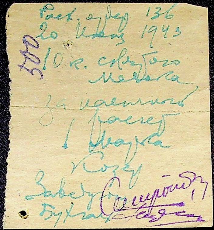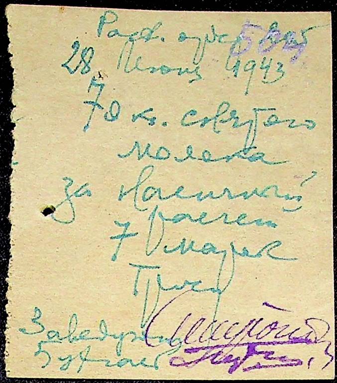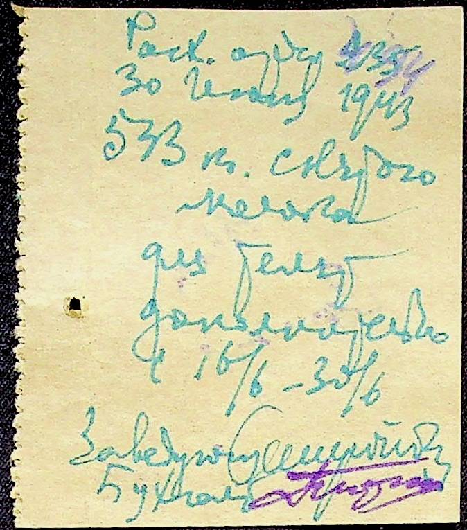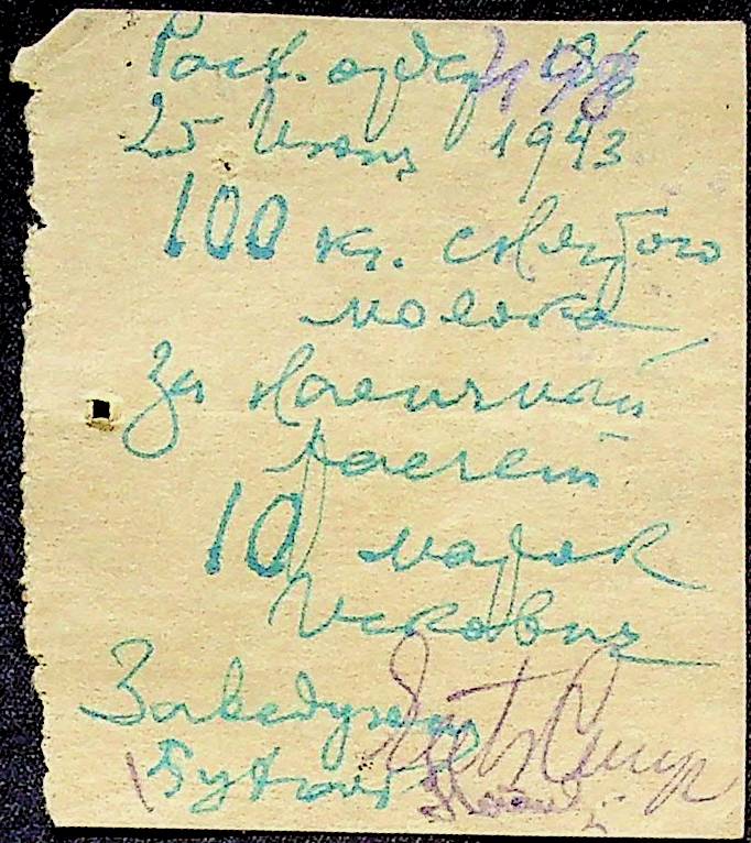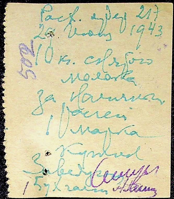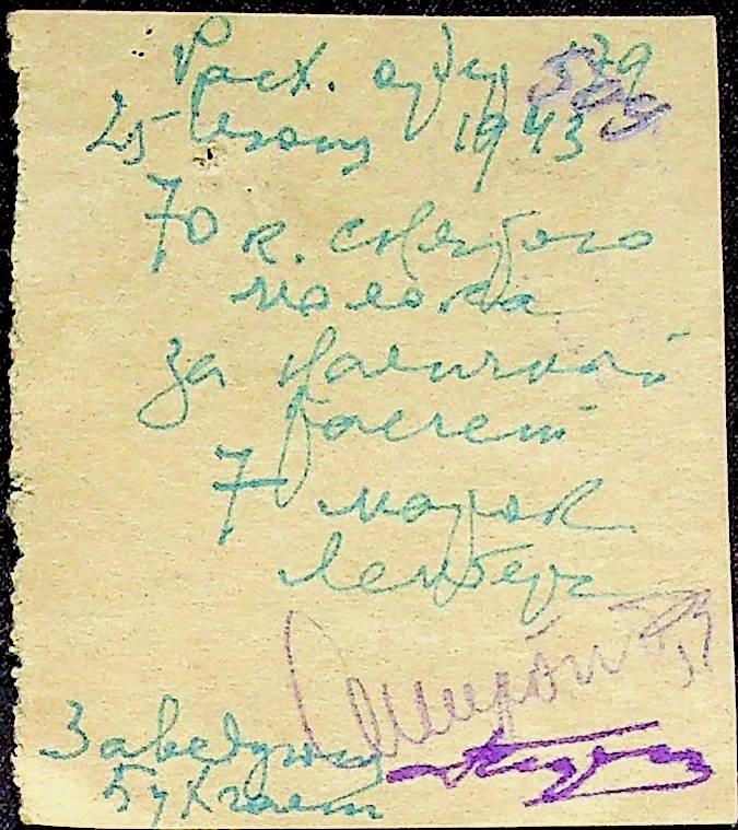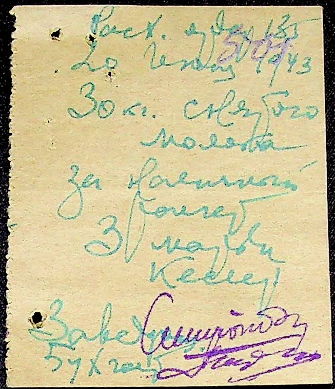 • • • • Справа № 33 “Відомості видавання продуктів робітникам ферми, ордери надходжень і видатків за 1943 рік”