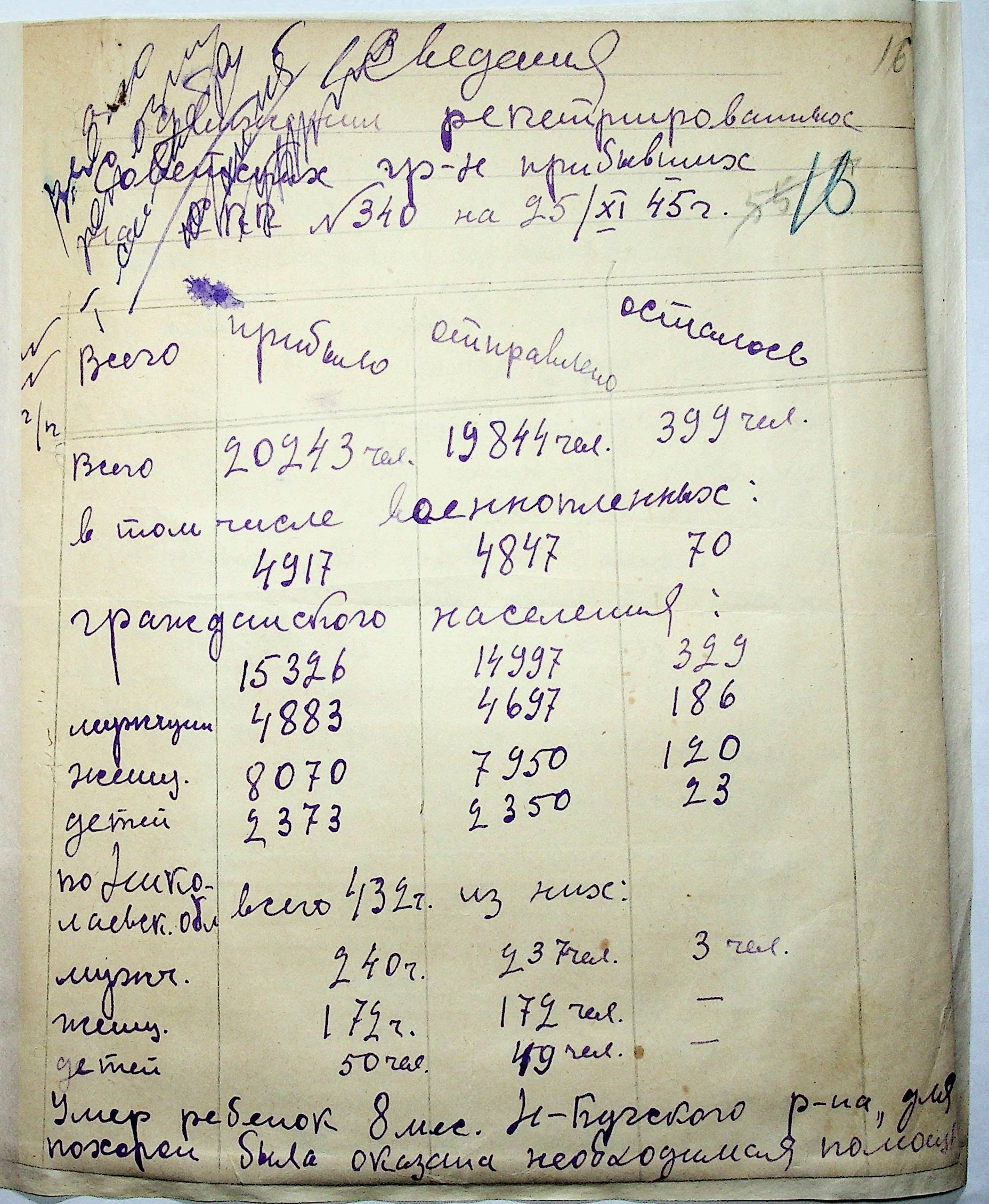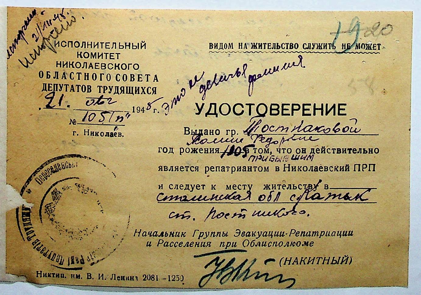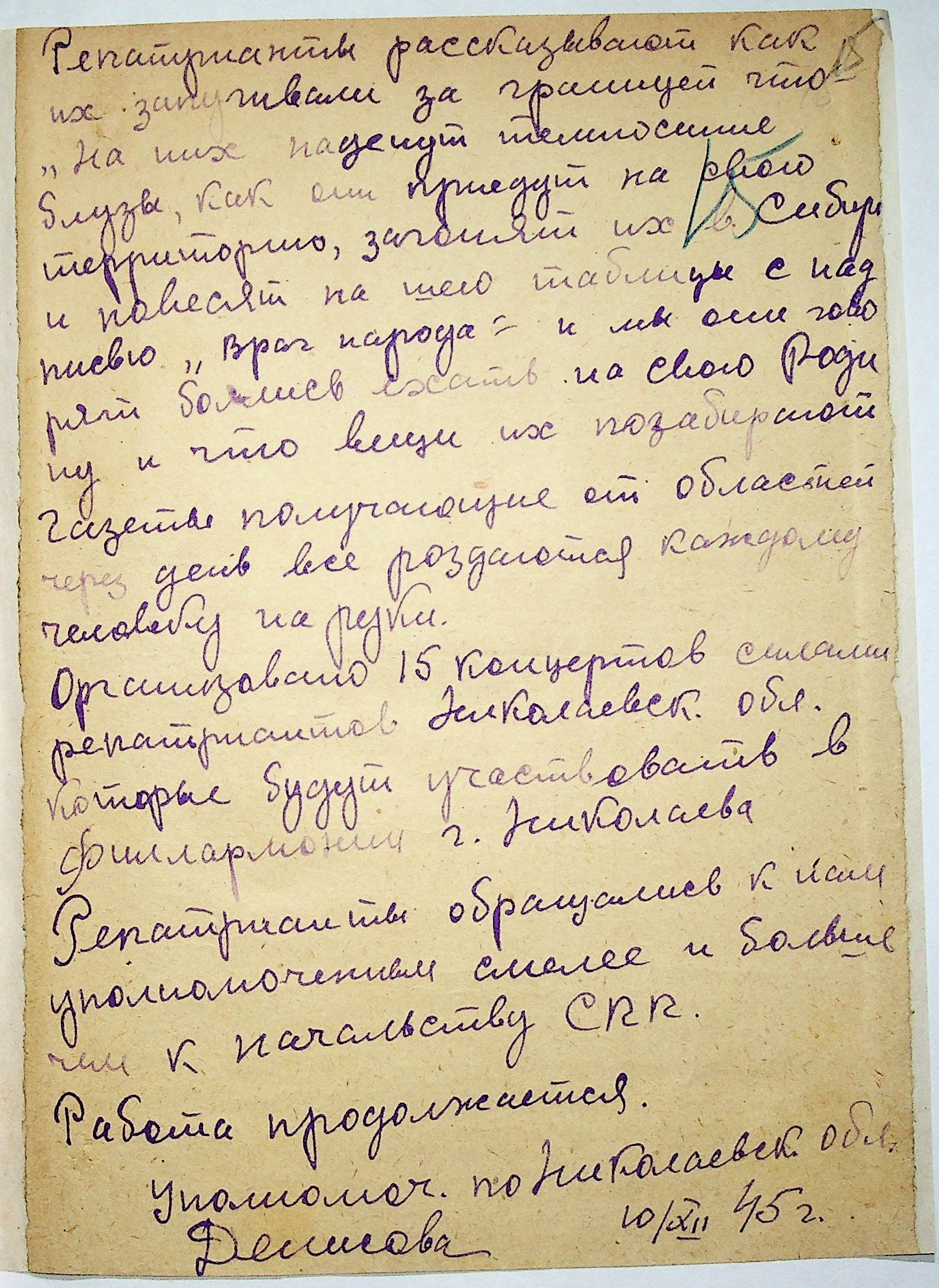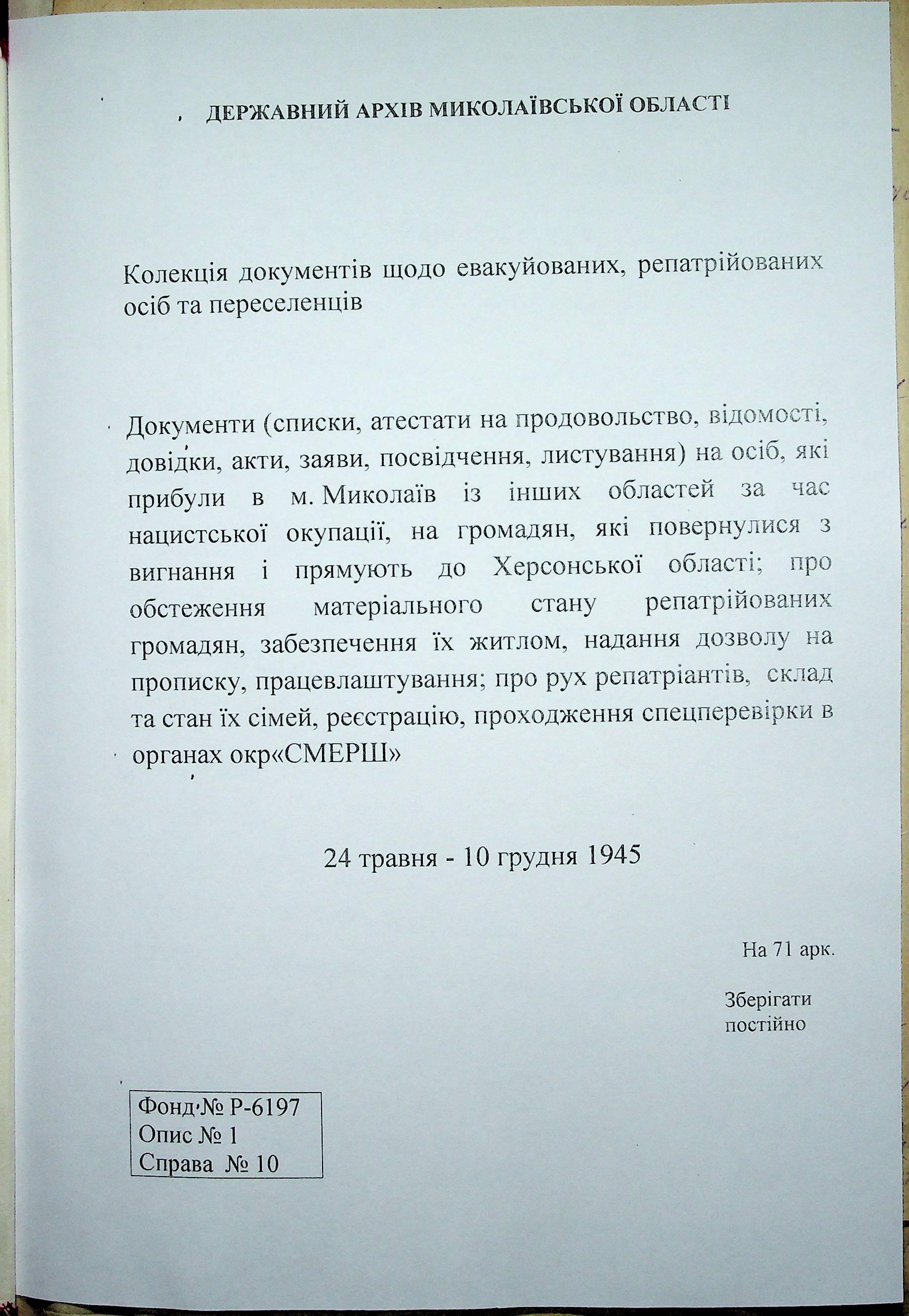 • • • • Справа № 10 “Документи (списки, атестати на продовольство, відомості, довідки, акти, заяви, посвідчення, листу-вання) на осіб, які прибули в м. Миколаїв із інших областей за час нацистської окупації, на громадян, які повернулися з вигнання і прямують до Херсонської області; про обстеження матеріального стану репатрійованих громадян, забезпе-чення їх житлом, надання дозволу на прописку, працевлаштування; про рух репатріантів, склад та стан їх сімей, реєстрацію, проходження спецперевірки в органах окр«СМЕРШ»”