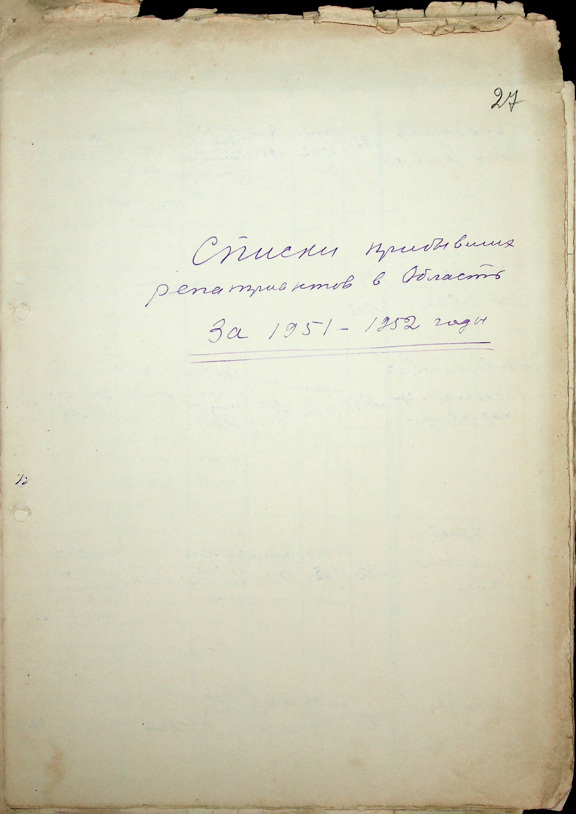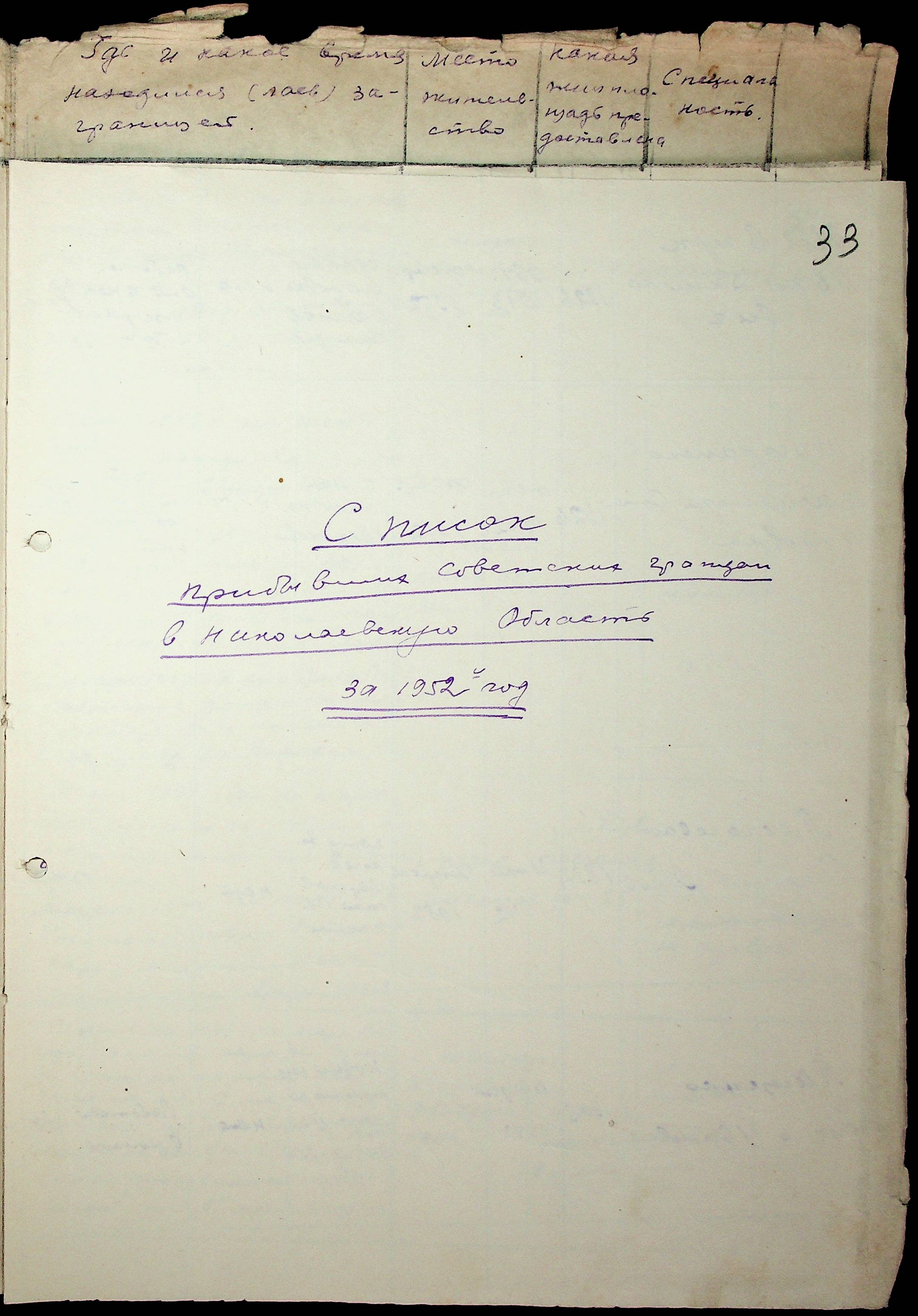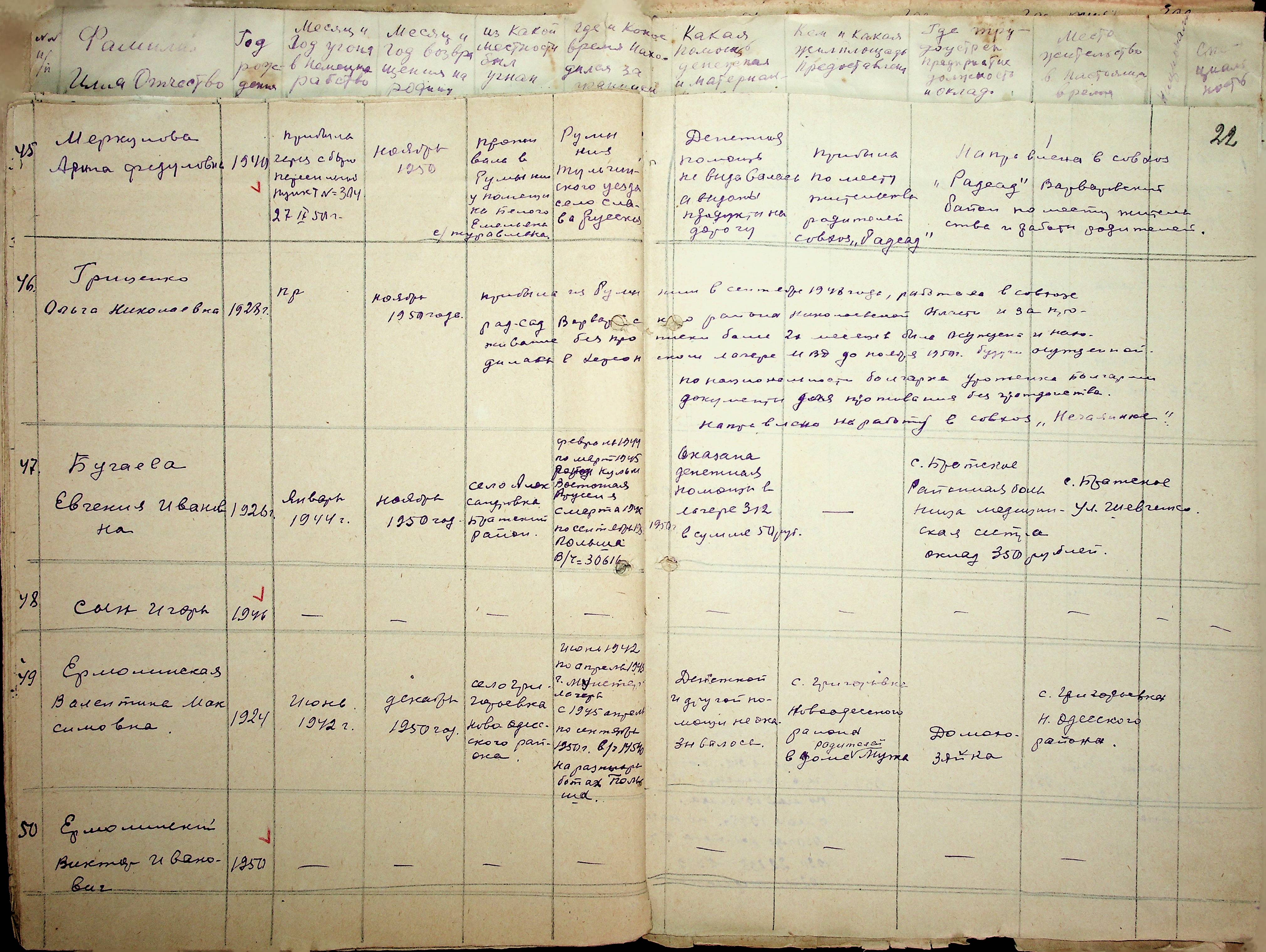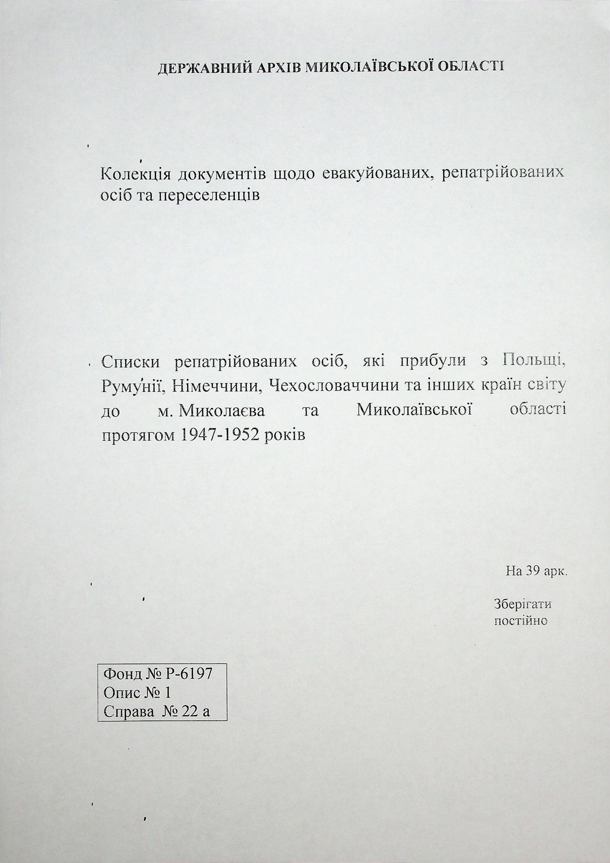 • • • • Справа № 22а “Списки репатрійованих осіб, які прибули з Польщі, Румунії, Німеччини, Чехословаччини та інших країн світу до м. Миколаєва та Миколаївської області протягом 1947-1952 років”