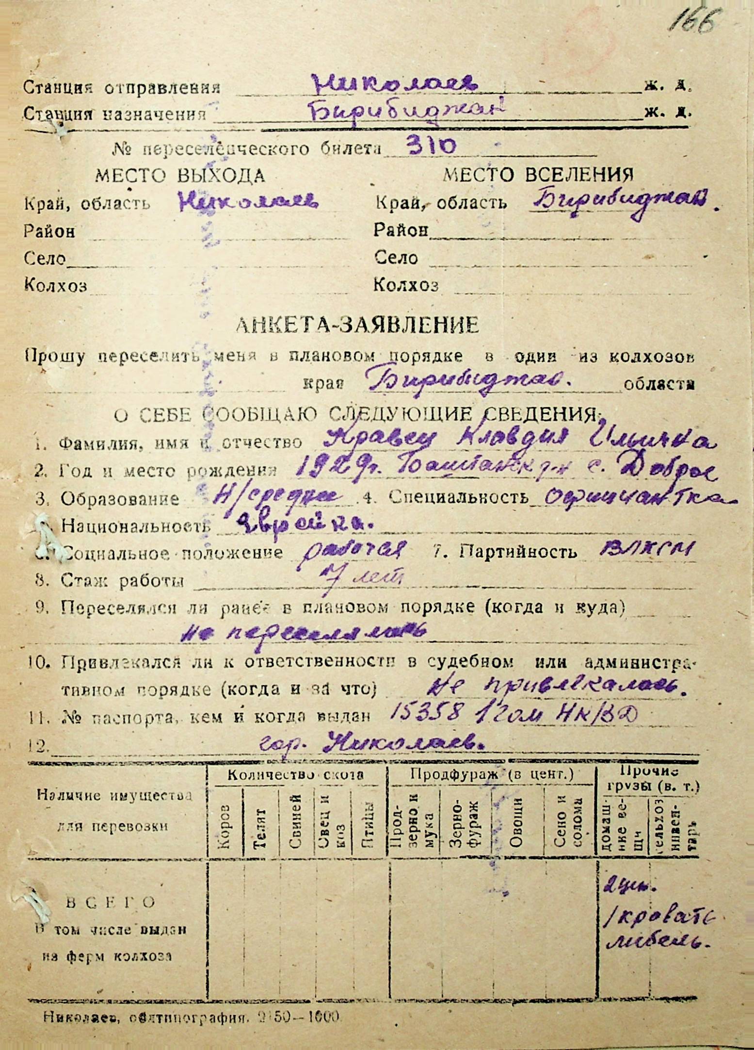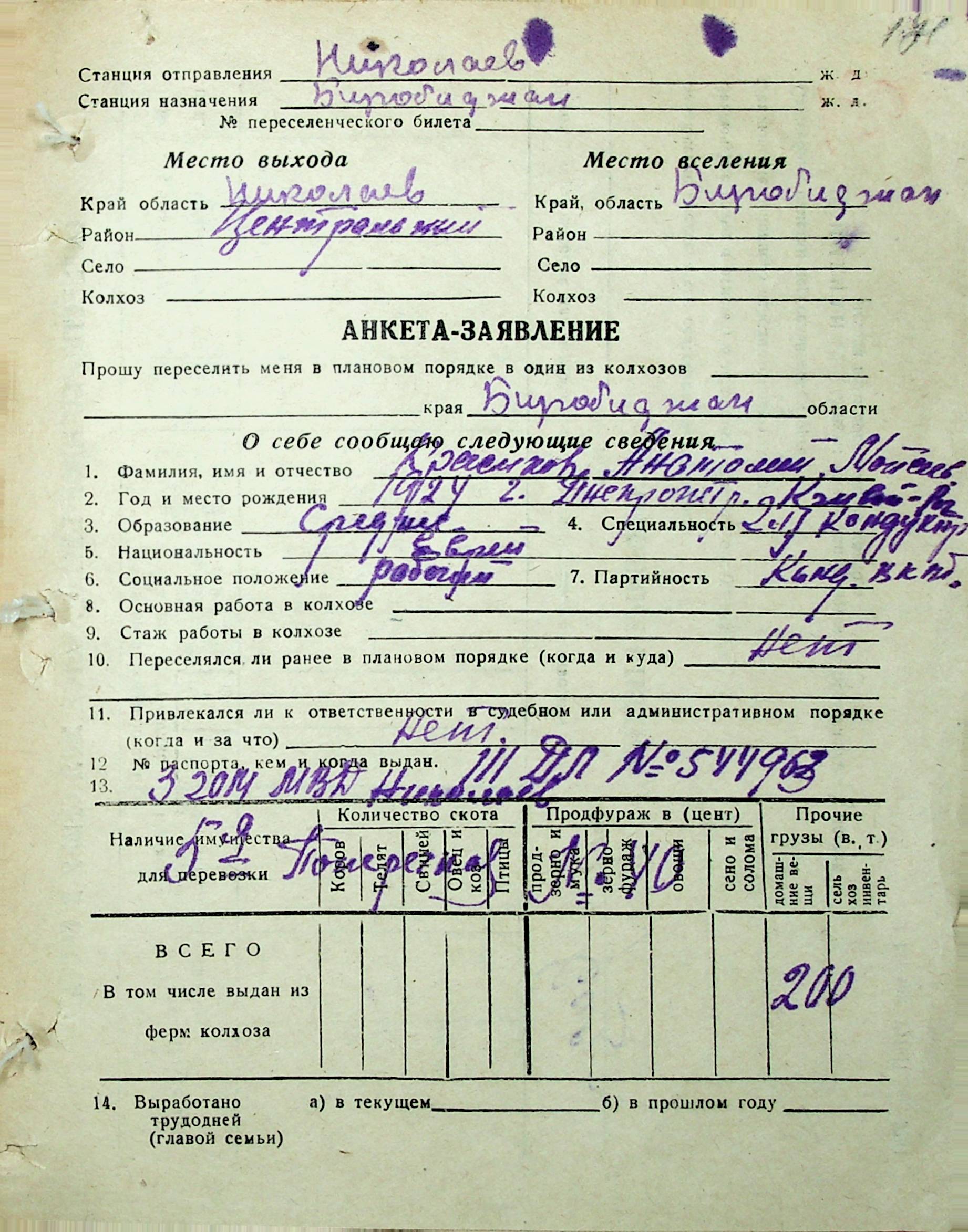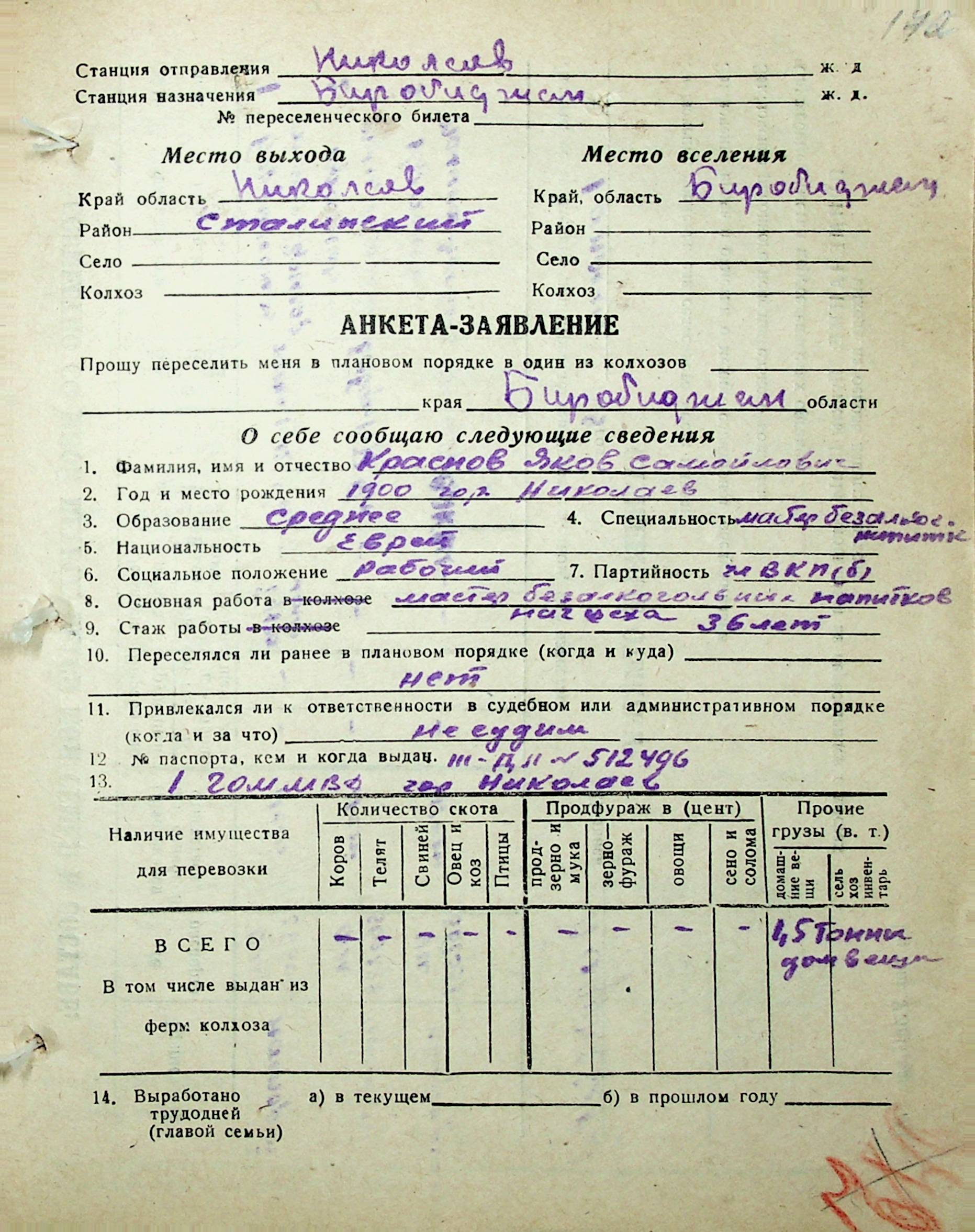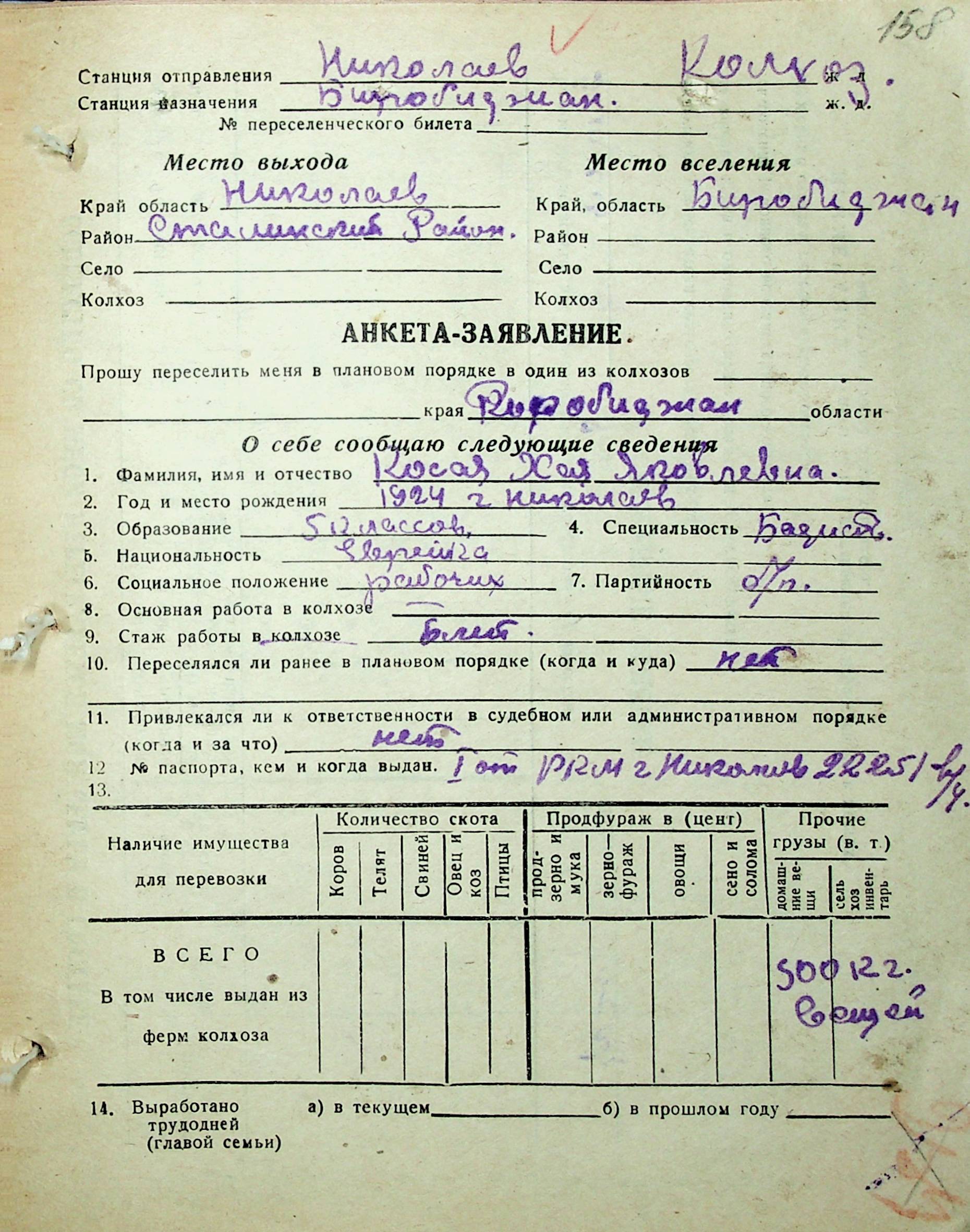 • • • • Справа № 30 “Анкети-заяви осіб, від’їжджаючих до Єврейської автономної області у 1948 році. Прізвища з літери «Д» по літеру «К»”