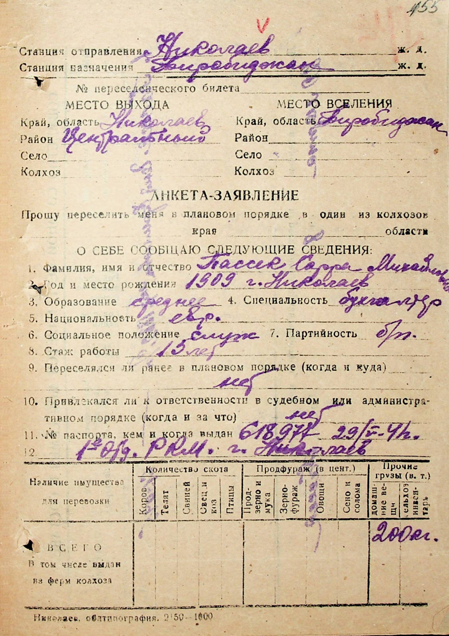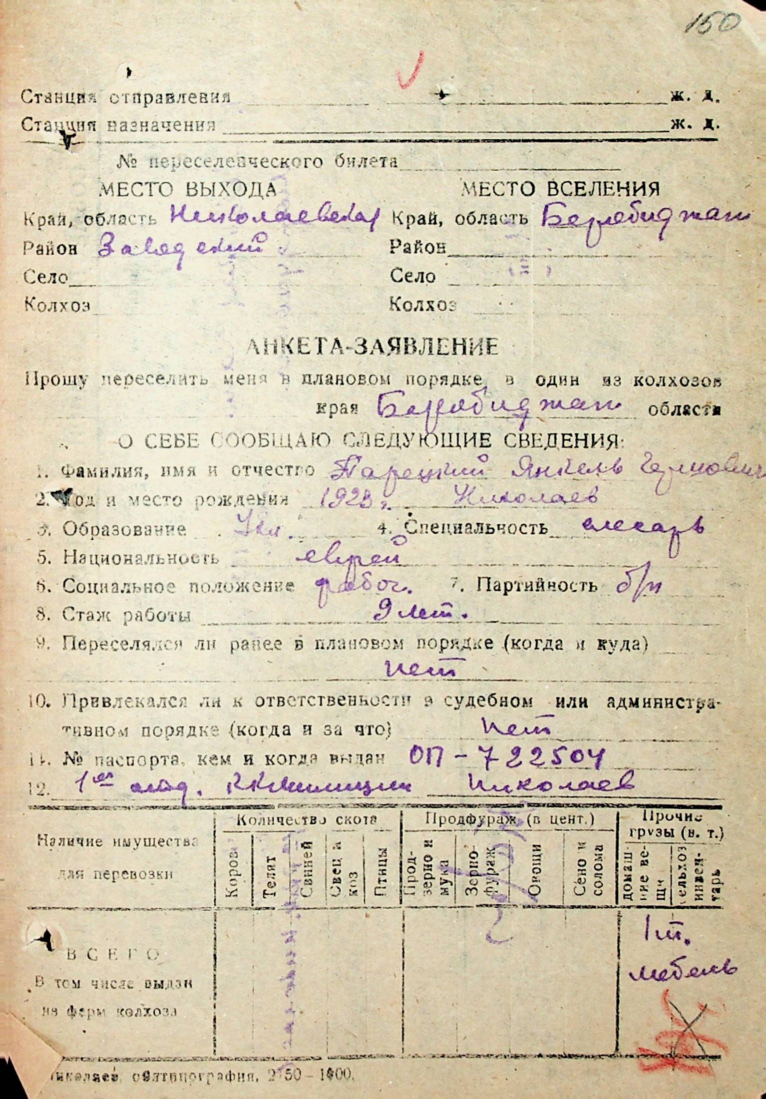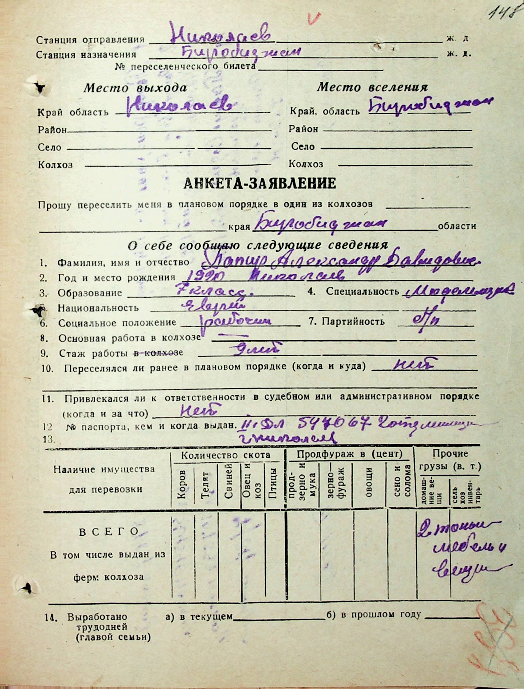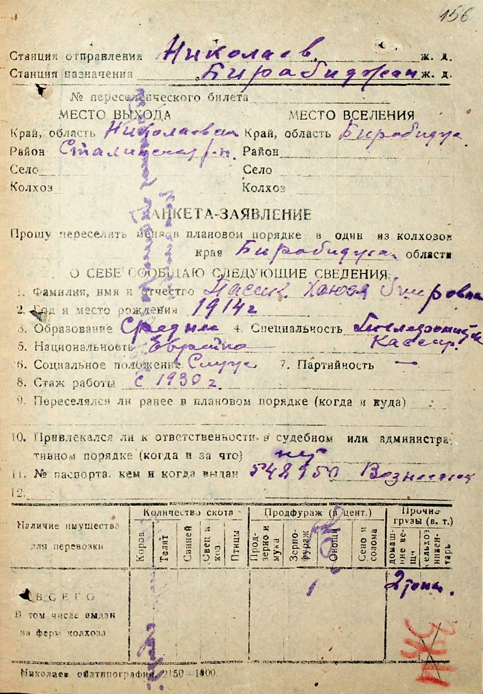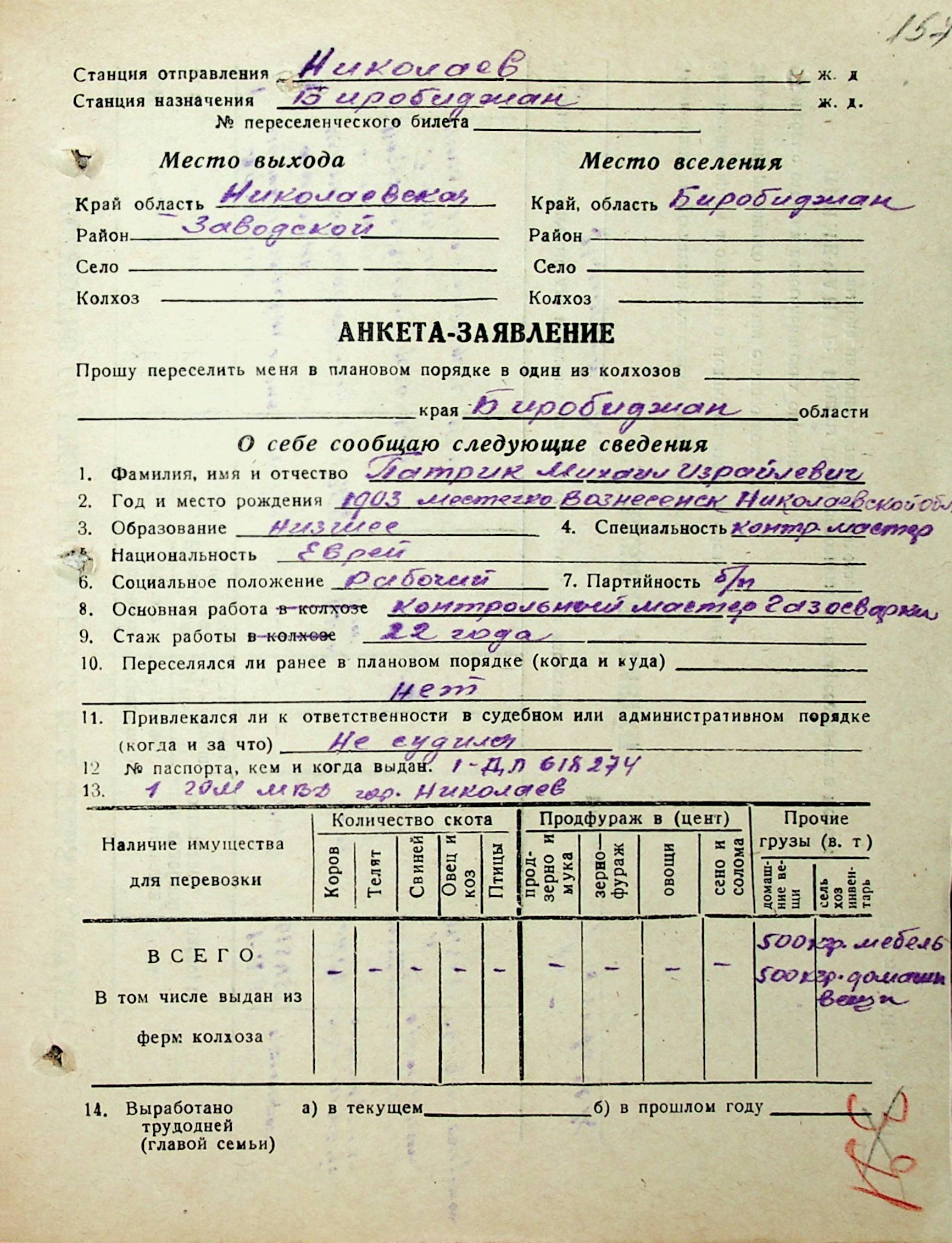 • • • • Справа № 31 “Анкети-заяви осіб, від’їжджаючих до Єврейської автономної області у 1948 році. Прізвища з літери «Л» по літеру «П»”