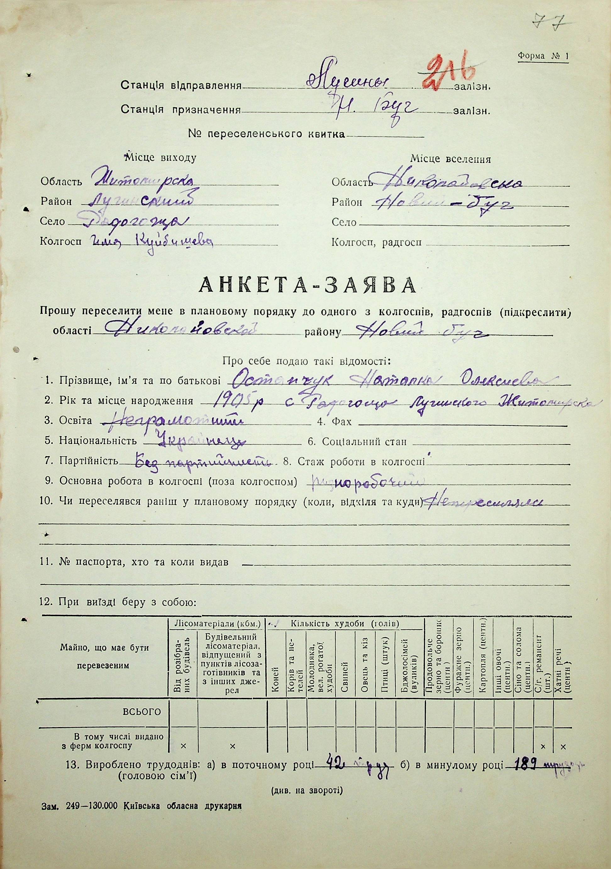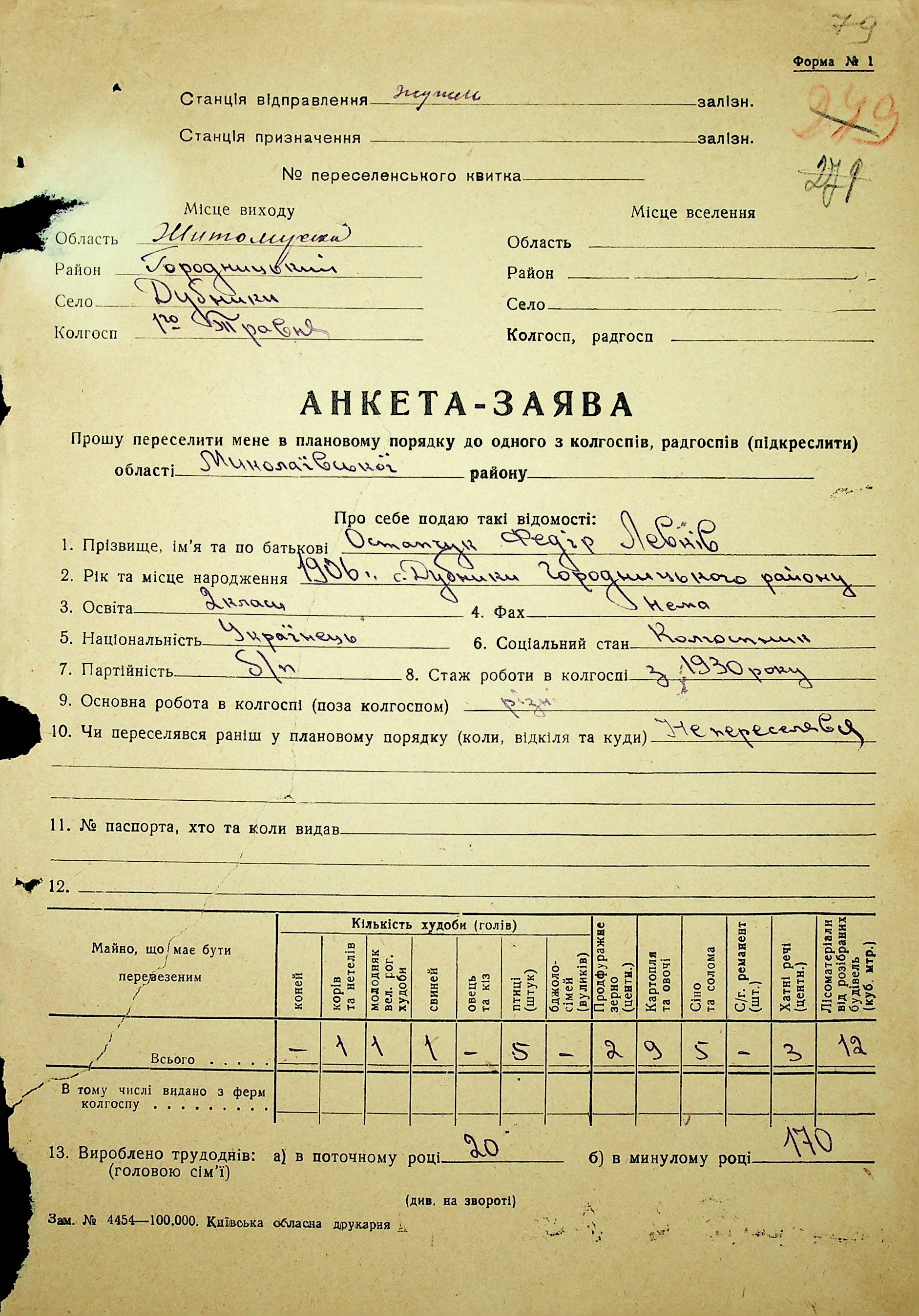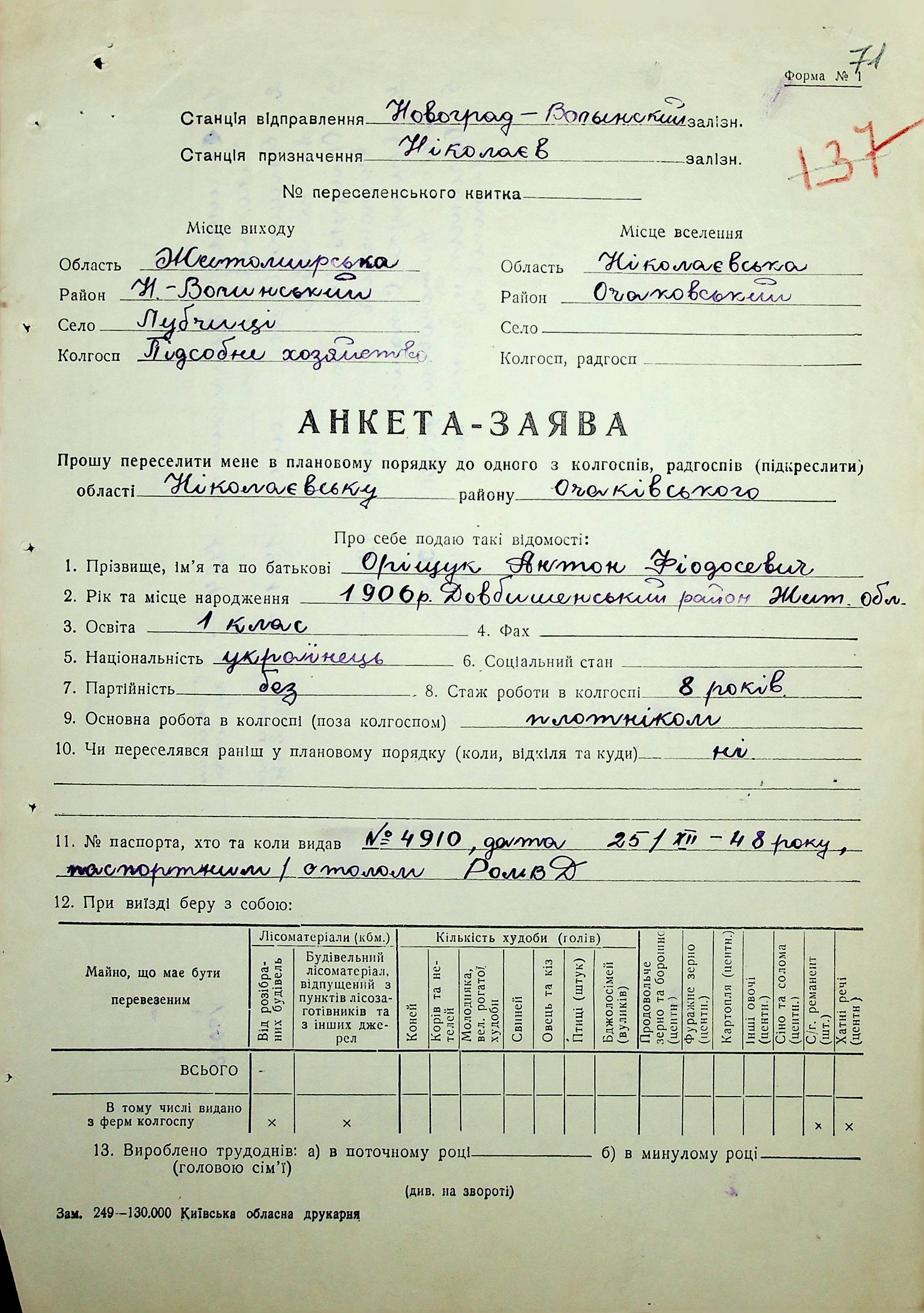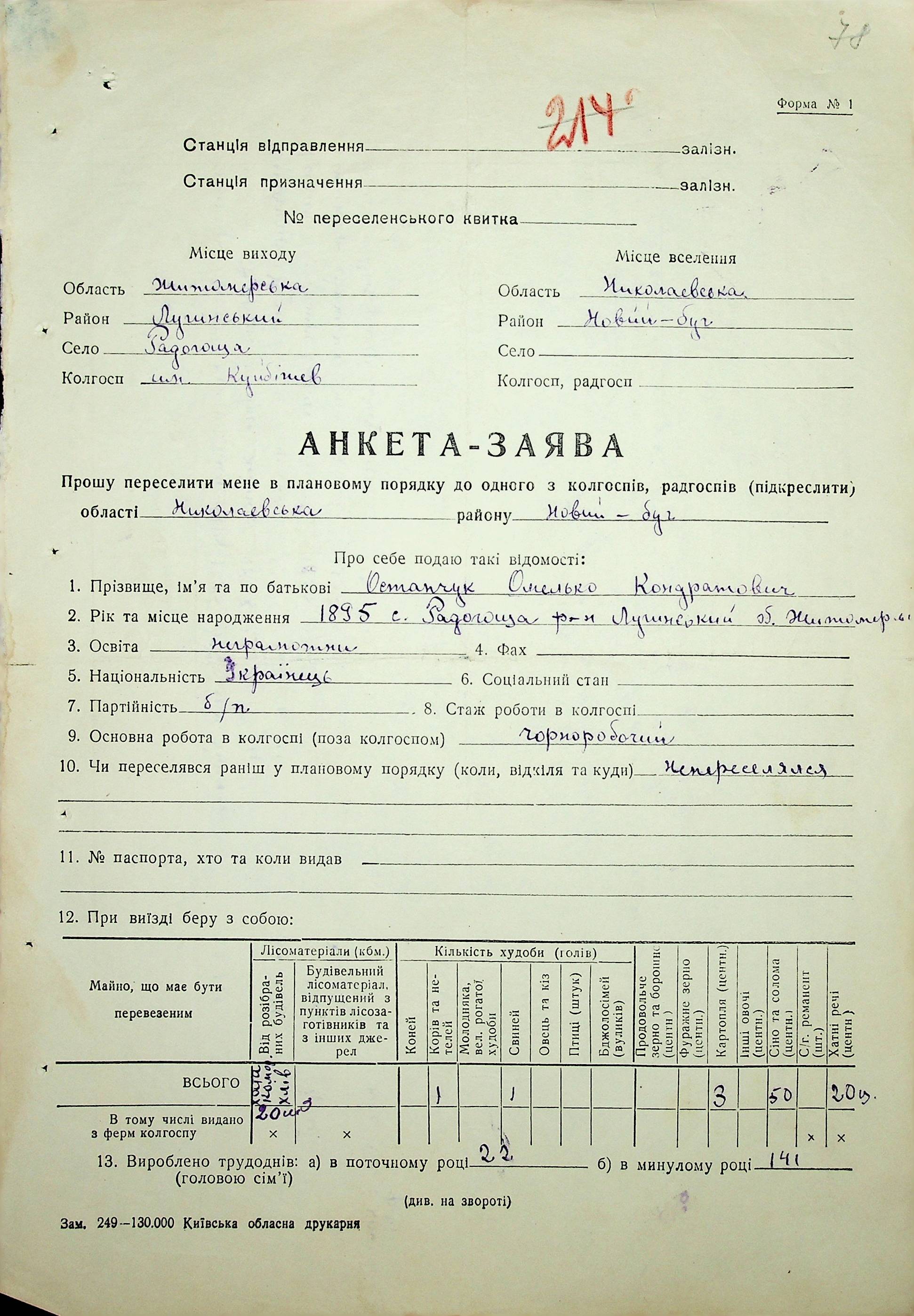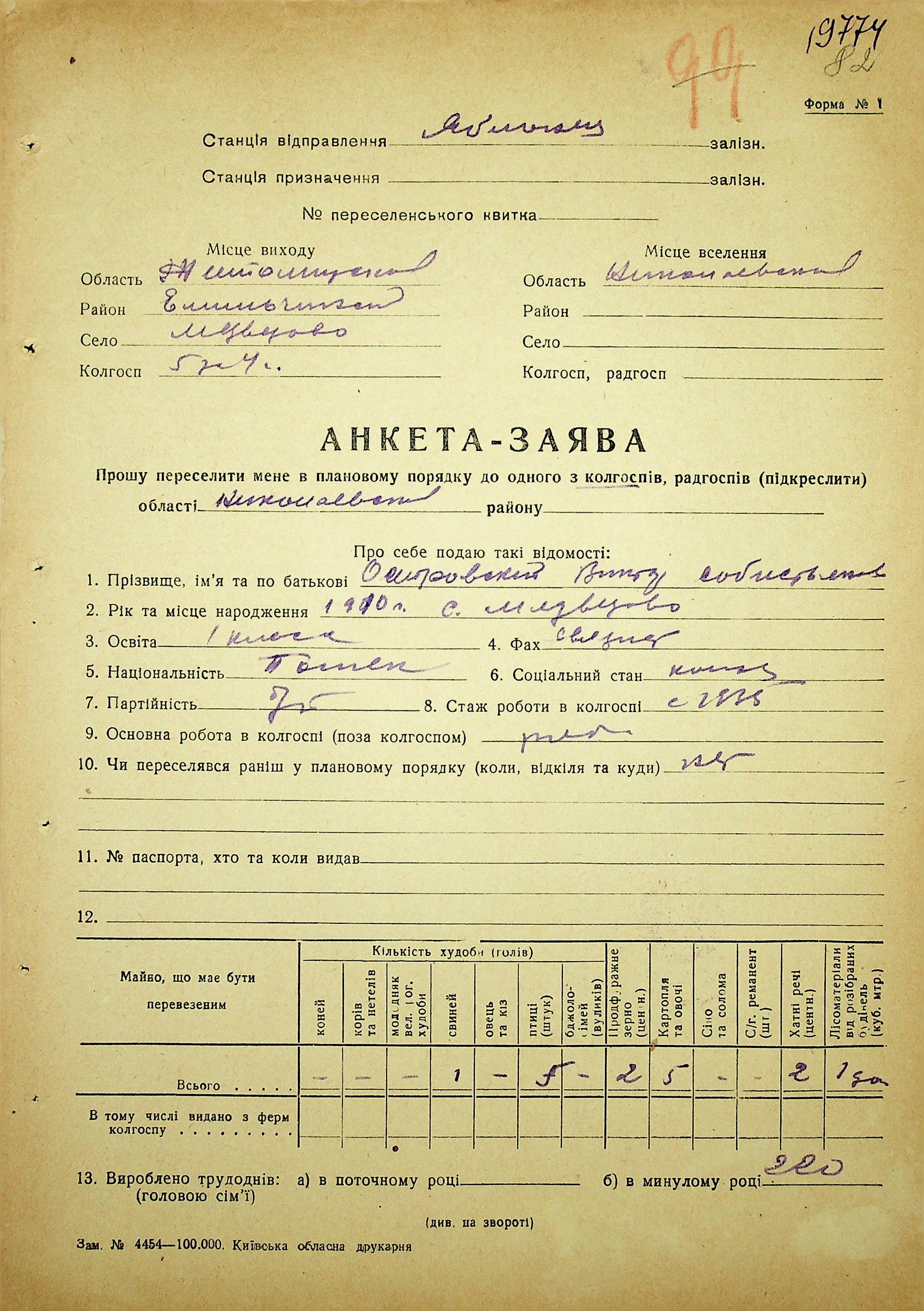 • • • • Справа № 37 “Анкети-заяви про планове переселення сімей з Житомирської до Миколаївської області, прізвища з літери «М» по літеру «Я»”