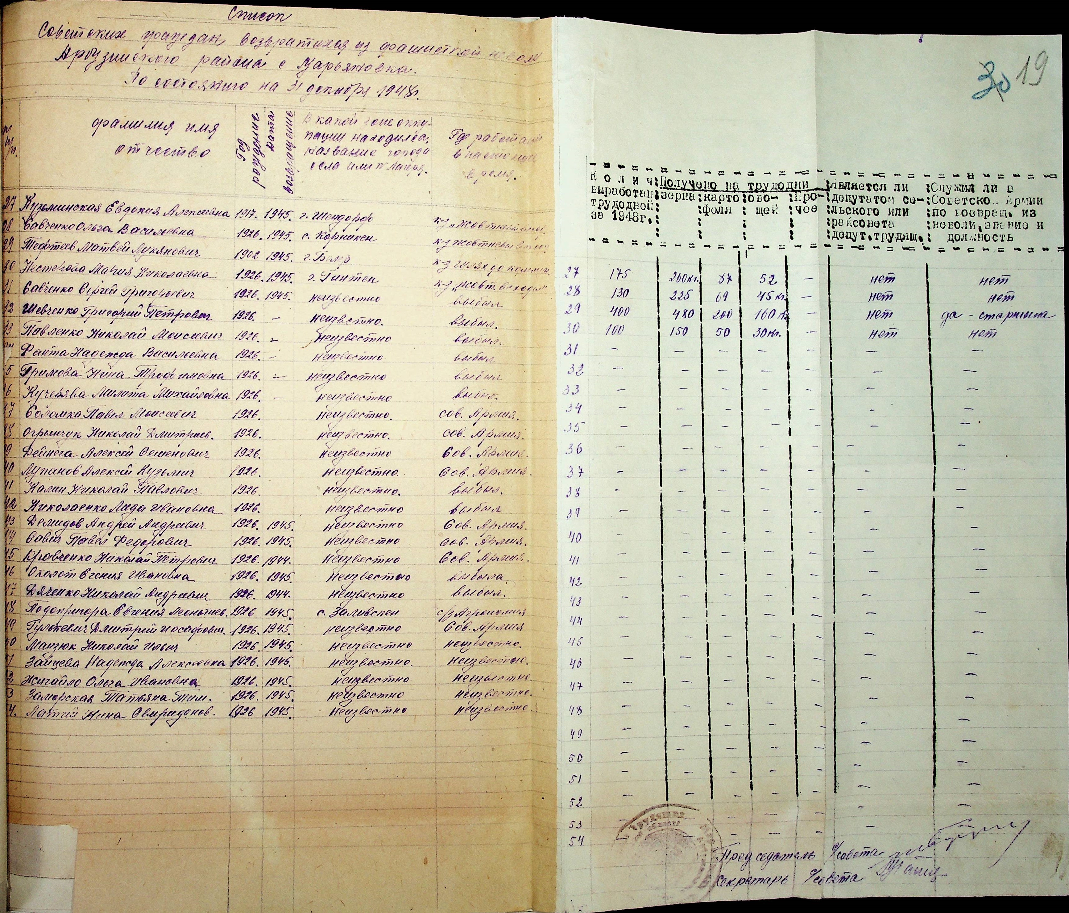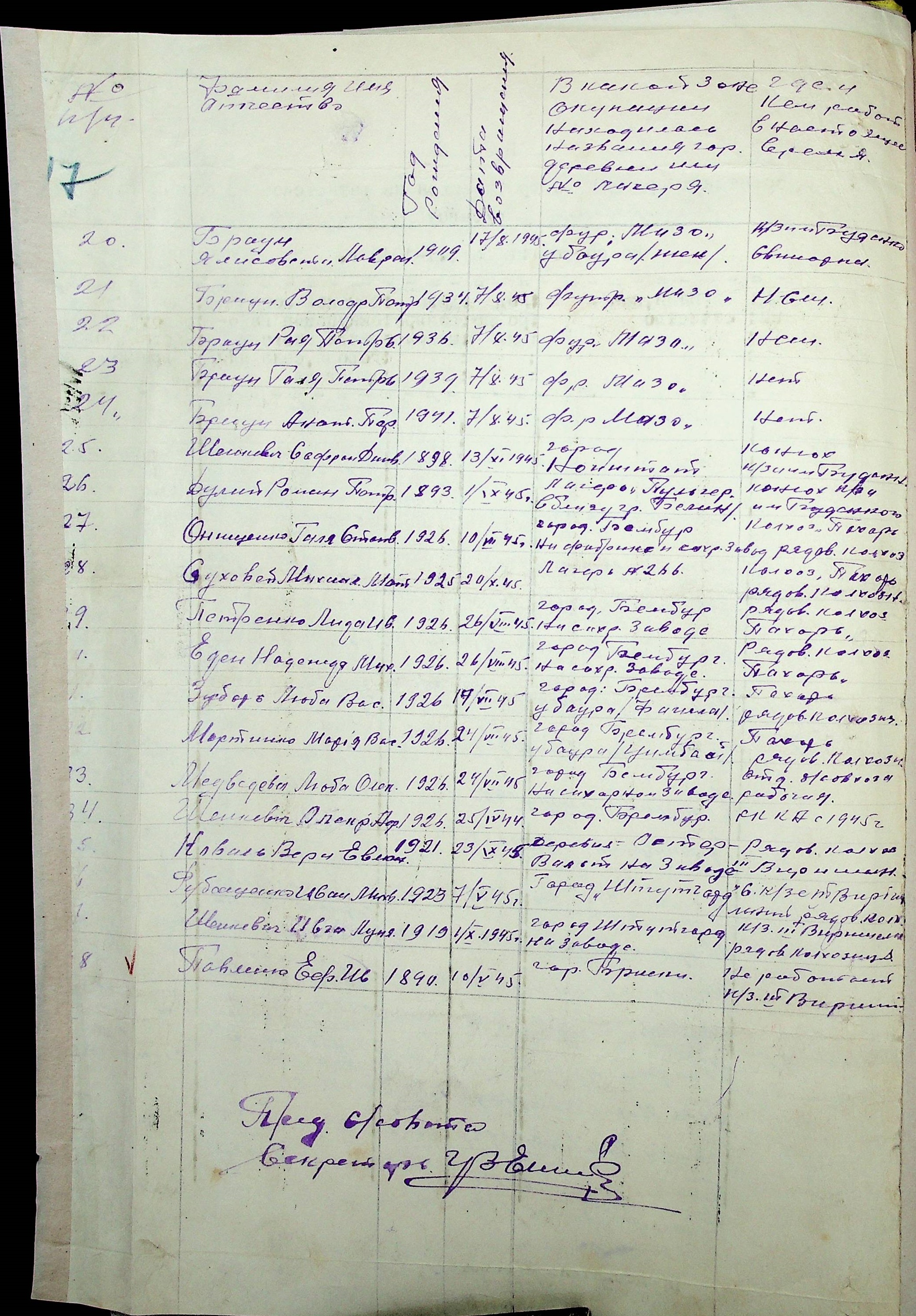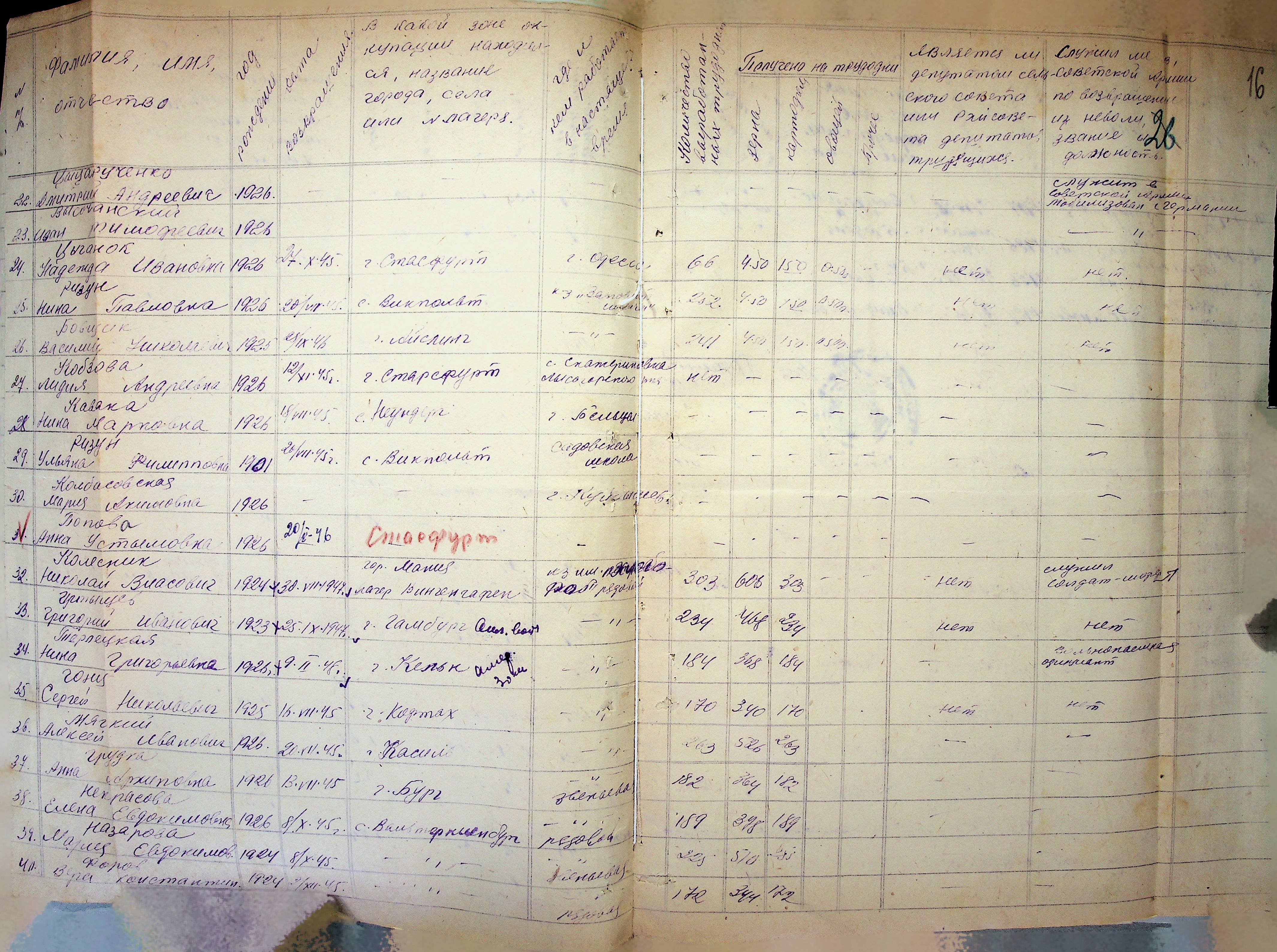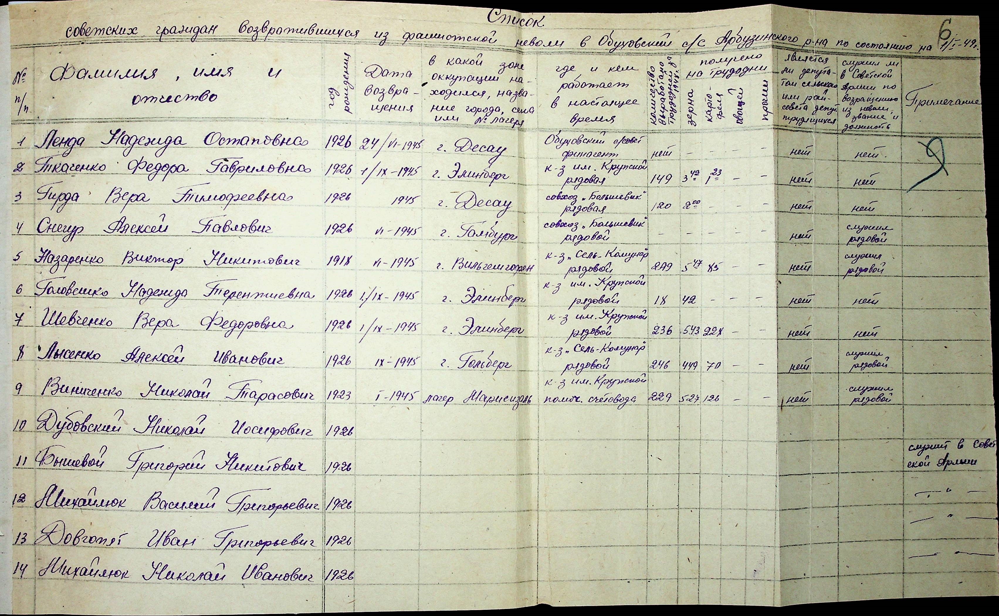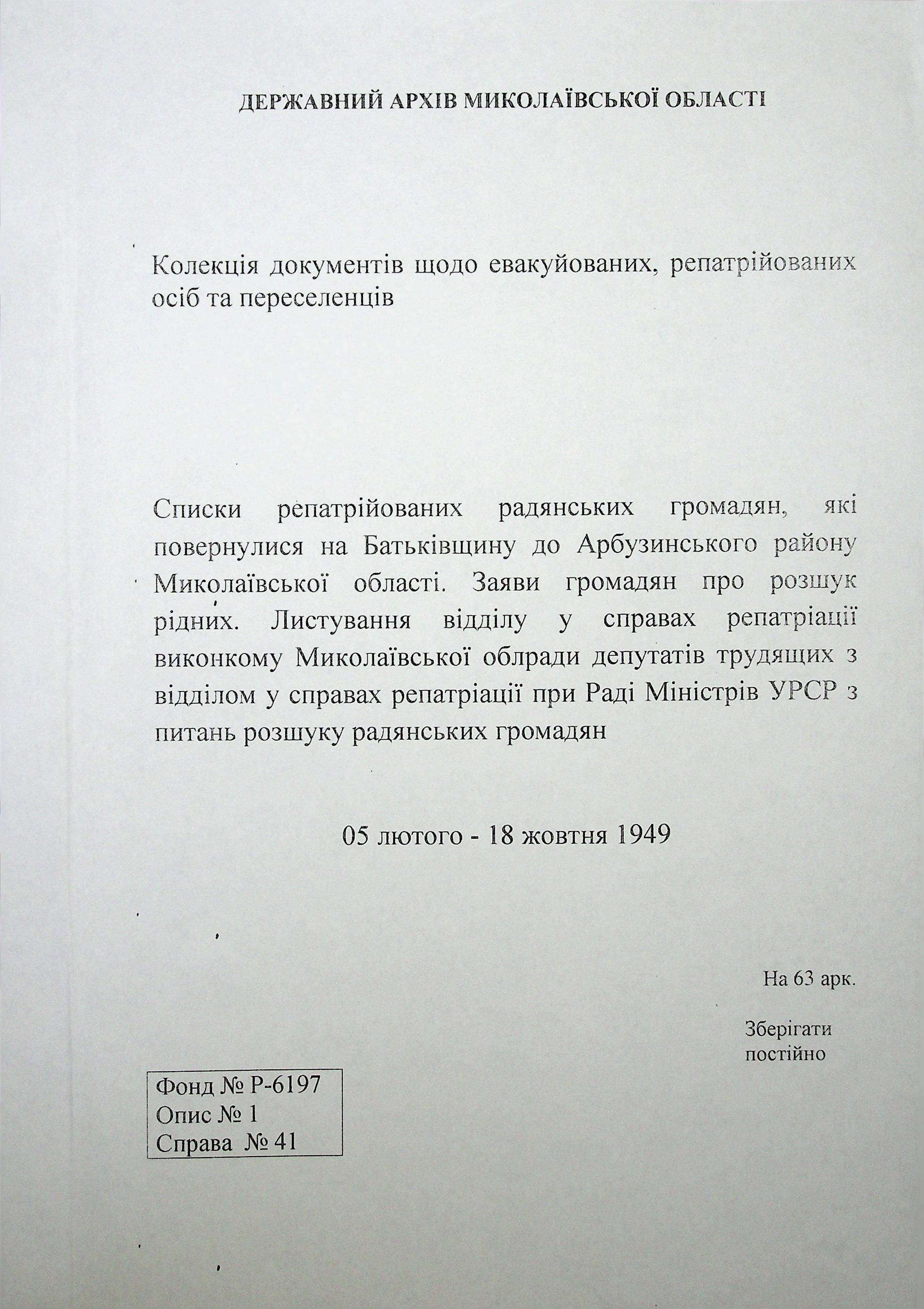 • • • • Справа № 41 “Списки репатрійованих радянських громадян, які повернулися на Батьківщину до Арбузинського району Миколаївської області.