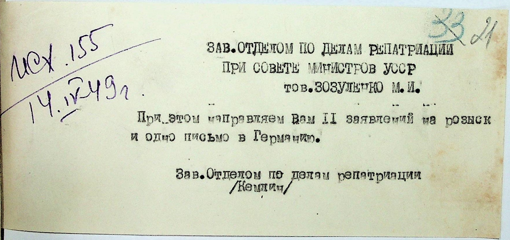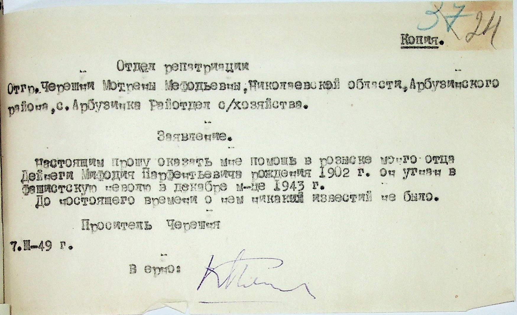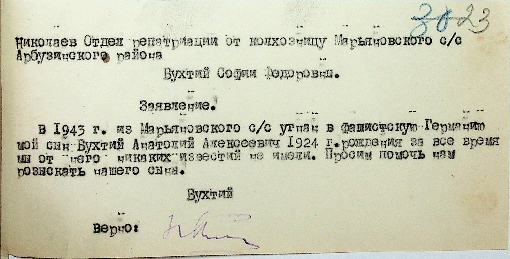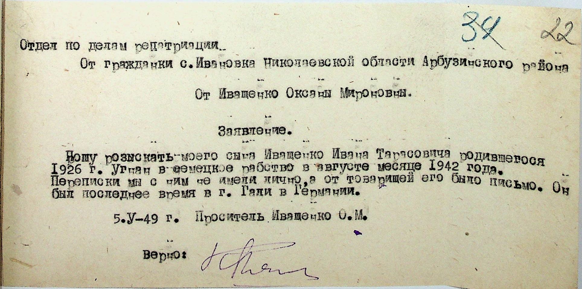 Заяви громадян про розшук рідних. Листування відділу у справах репатріації виконкому Микола-ївської облради депутатів трудящих з відділом у справах репатріації при Раді Міністрів УРСР з питань розшуку радянських громадян”