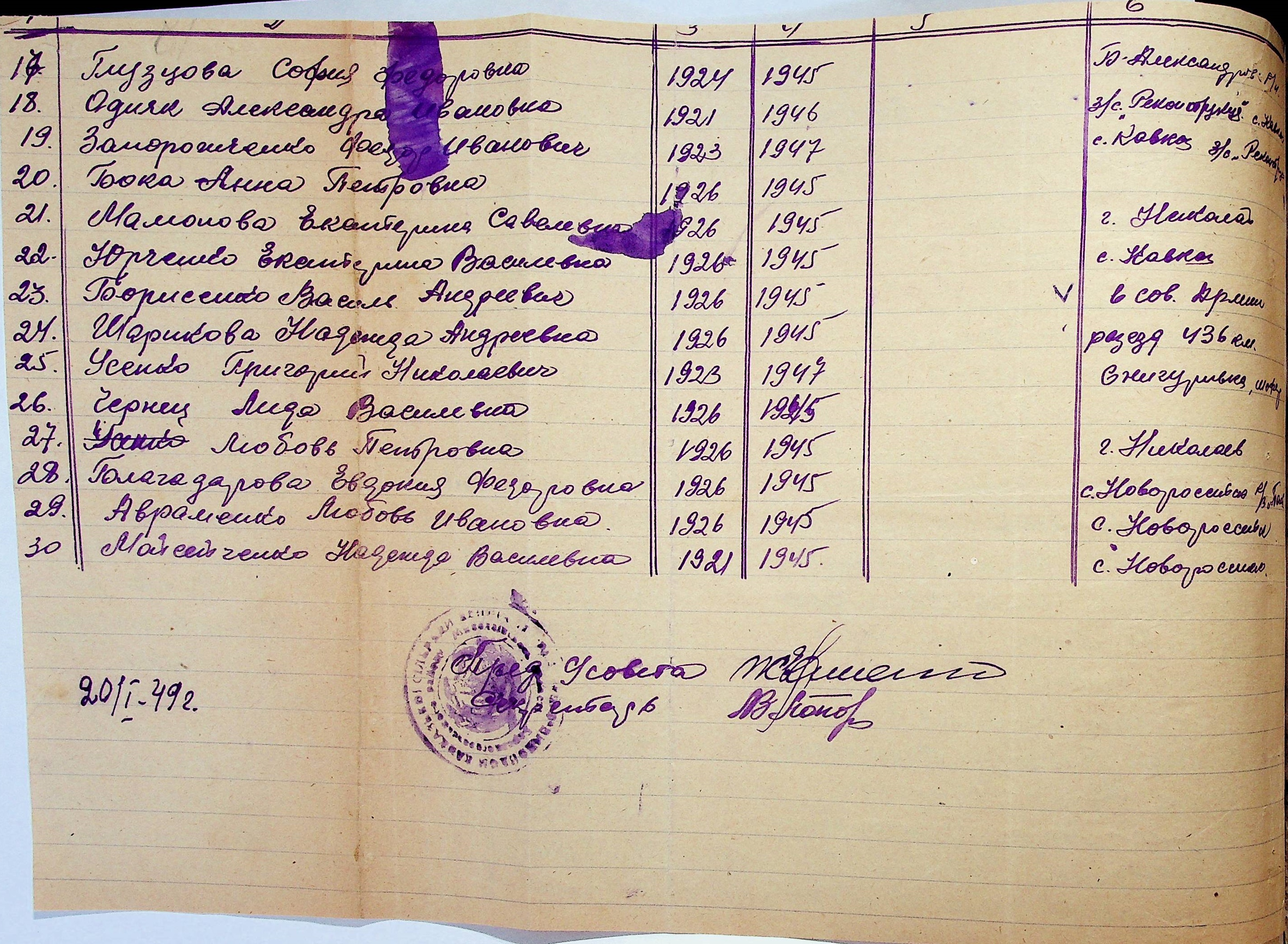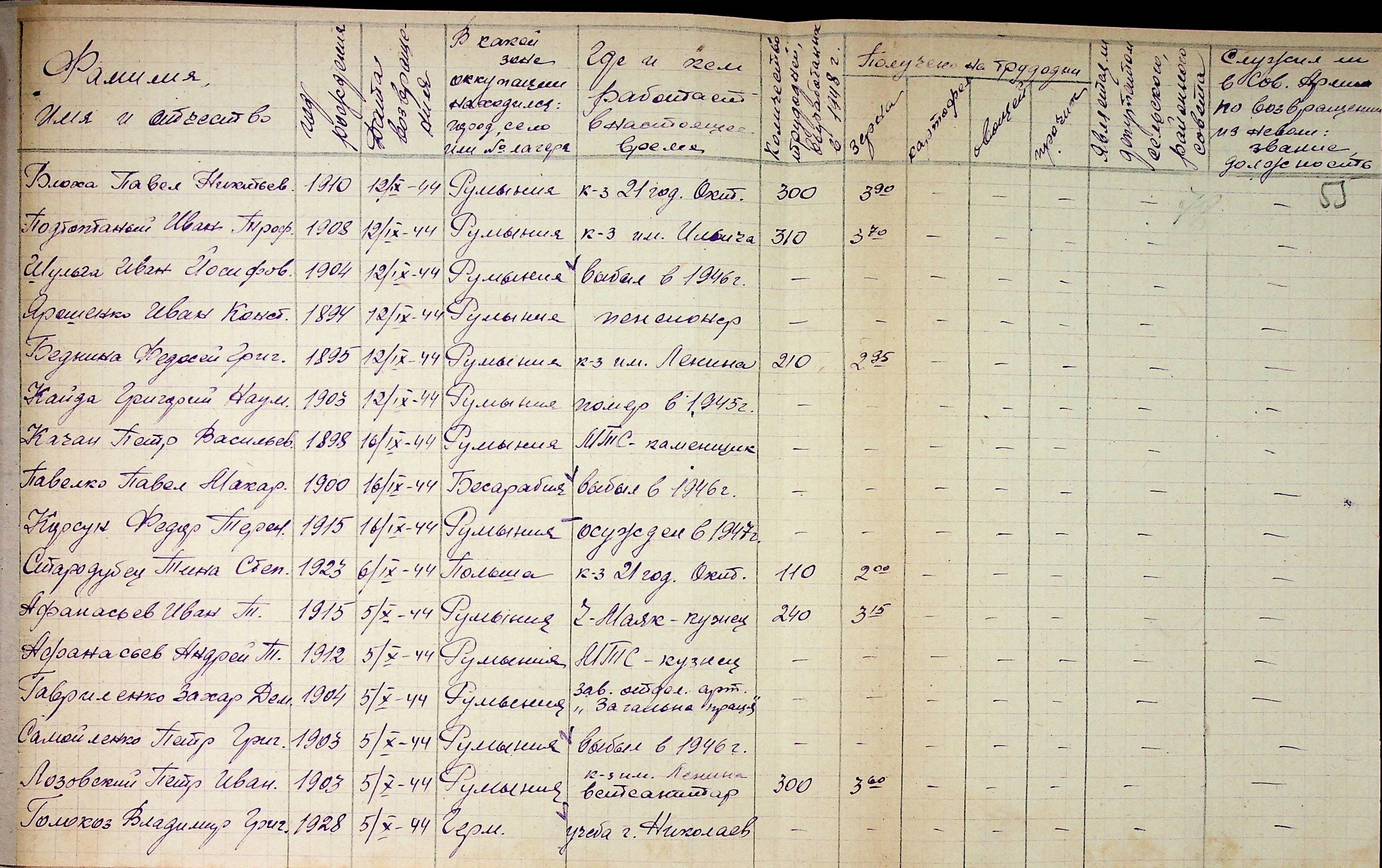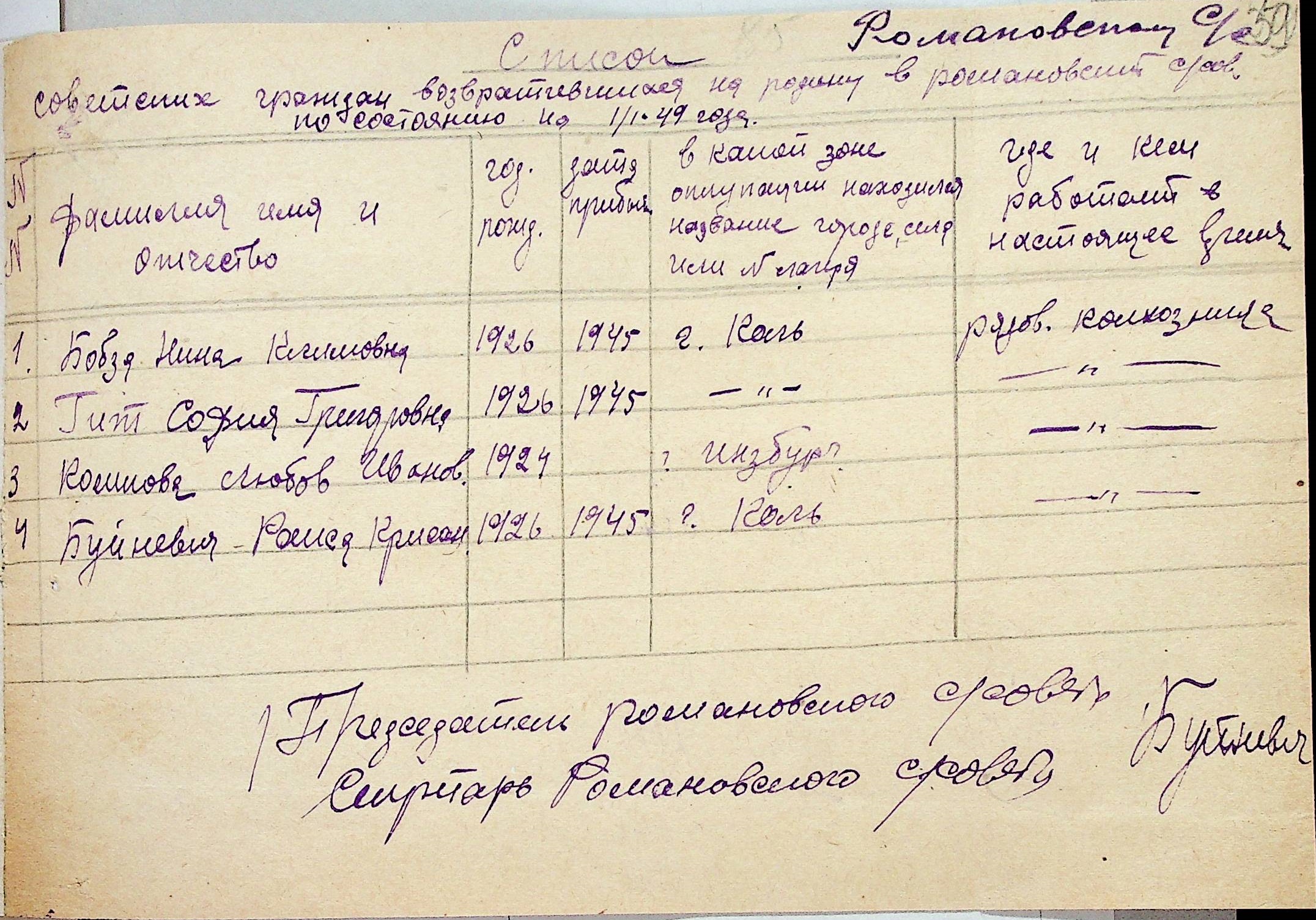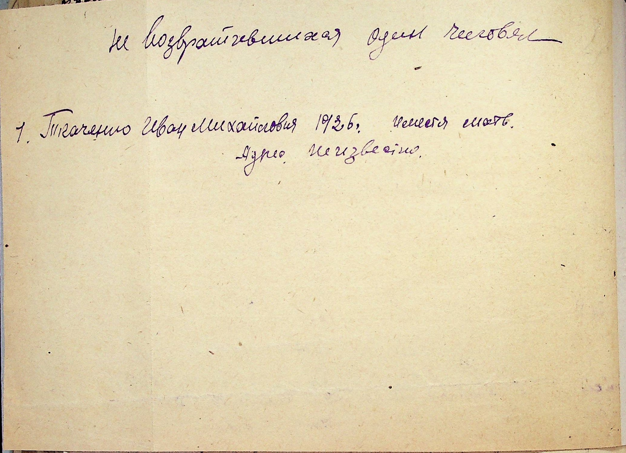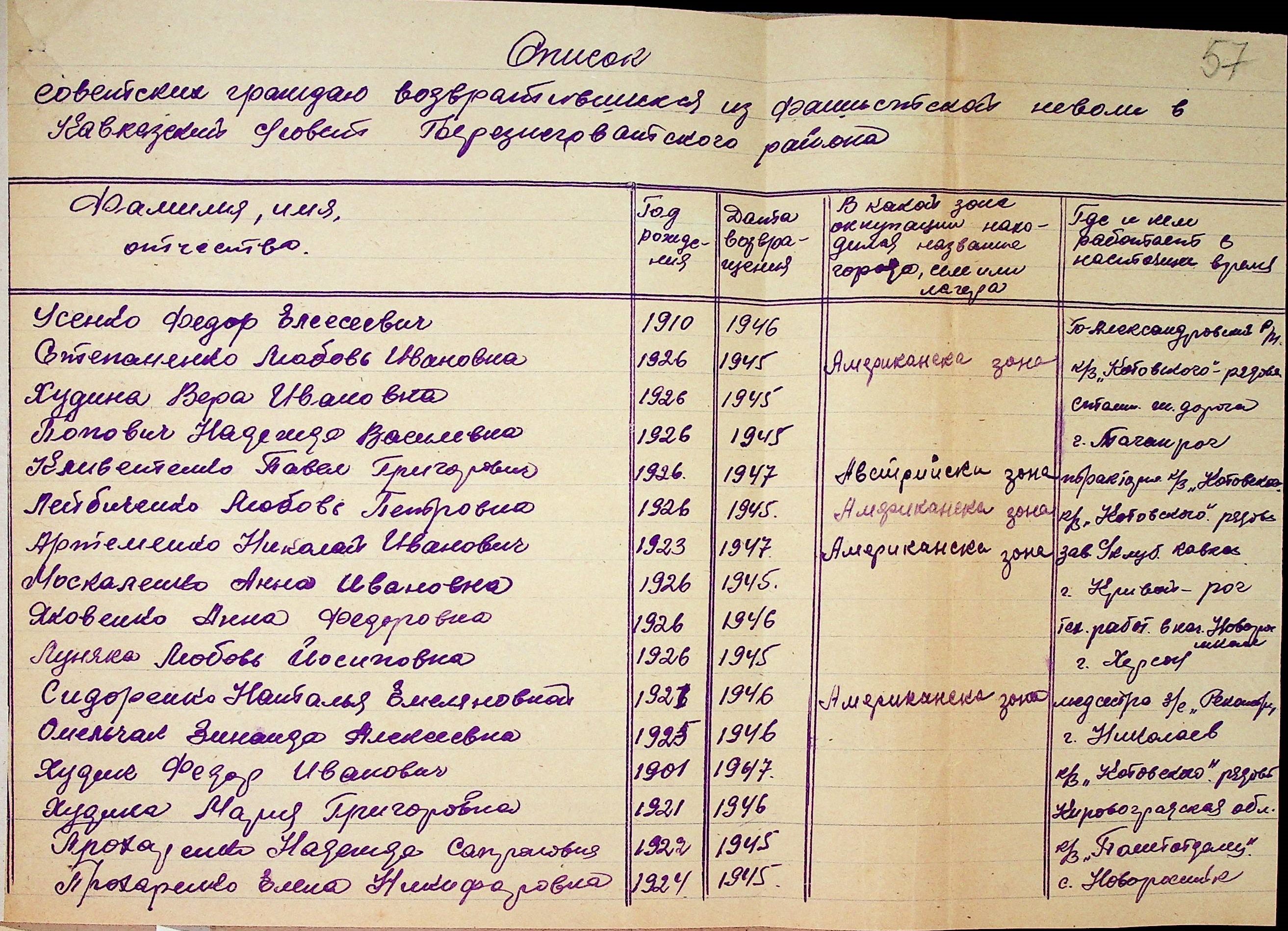• • • • Справа № 43 “Списки репатрійованих радянських громадян, які повернулися на Батьківщину до Березнегуватського району Миколаївської області. Листування відділу у справах репатріації виконкому Микола-ївської облради депутатів трудящих з виконкомом Березнегуватської райради депутатів трудящих з питань обліку репатріантів”
