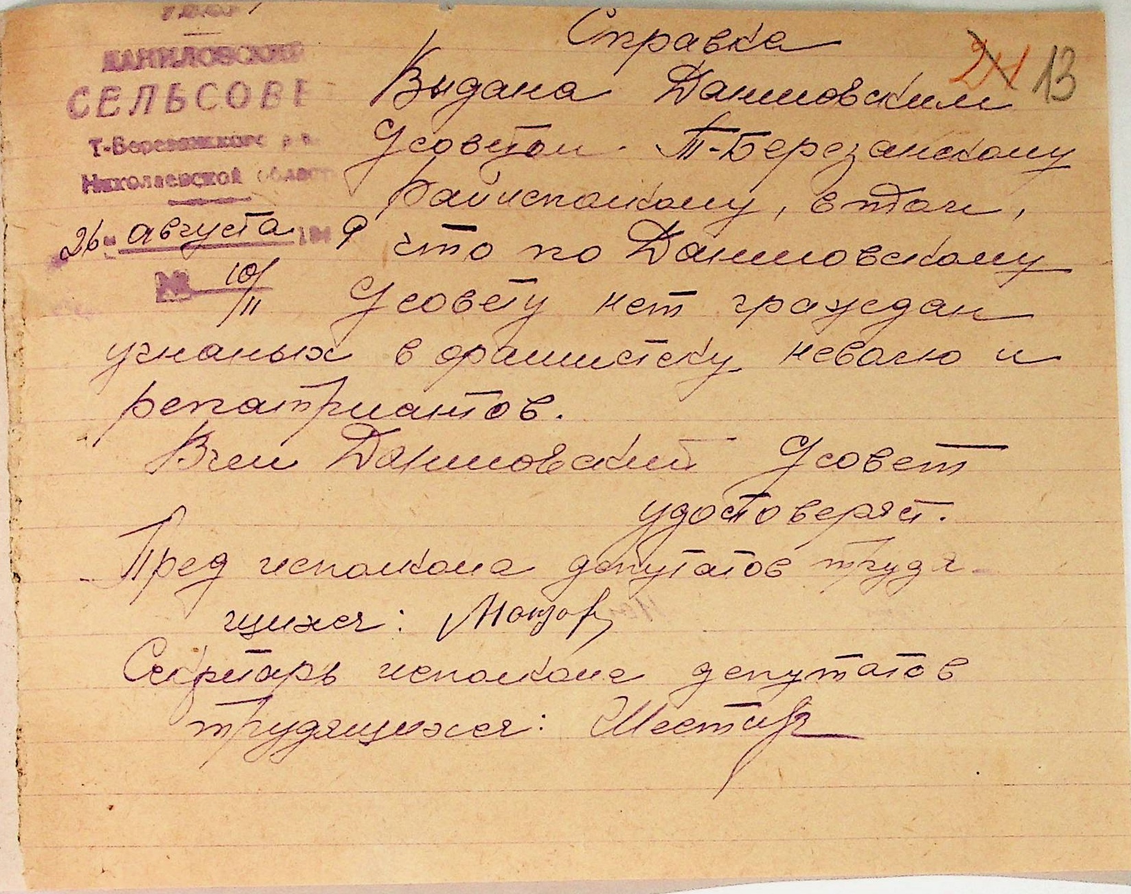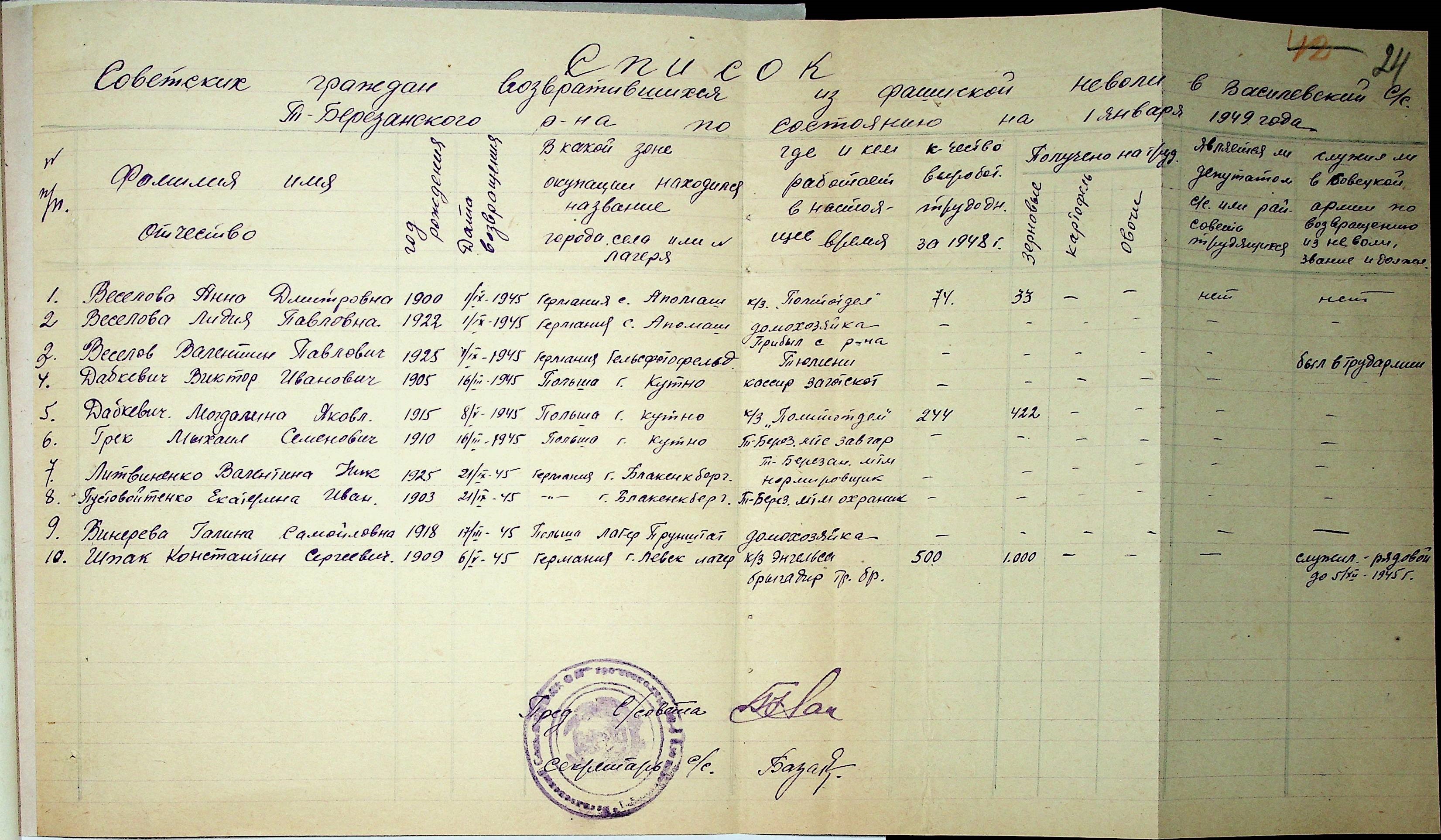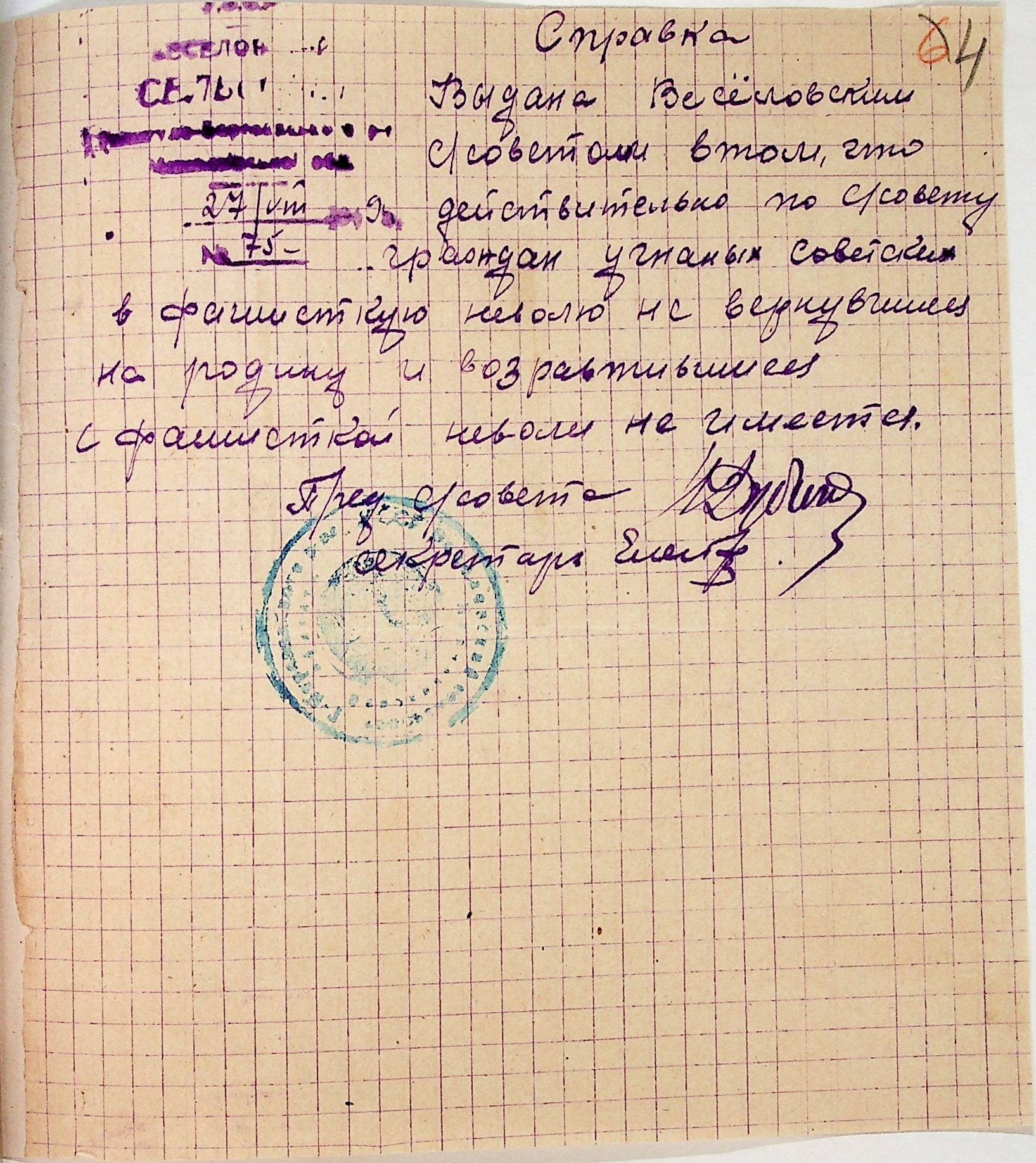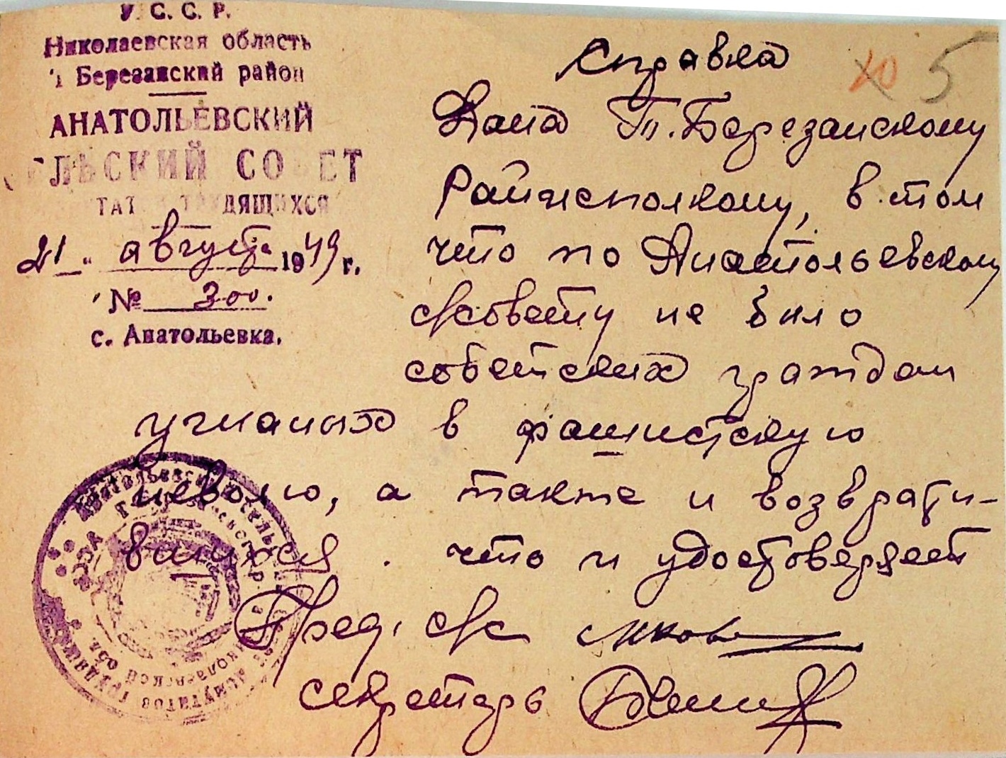 Довідки, надані сільськими Радами Тилігуло-Березанського району про відсутність осіб, які були насильно вивезені до Німеччини і не повернулись на Батьківщину”