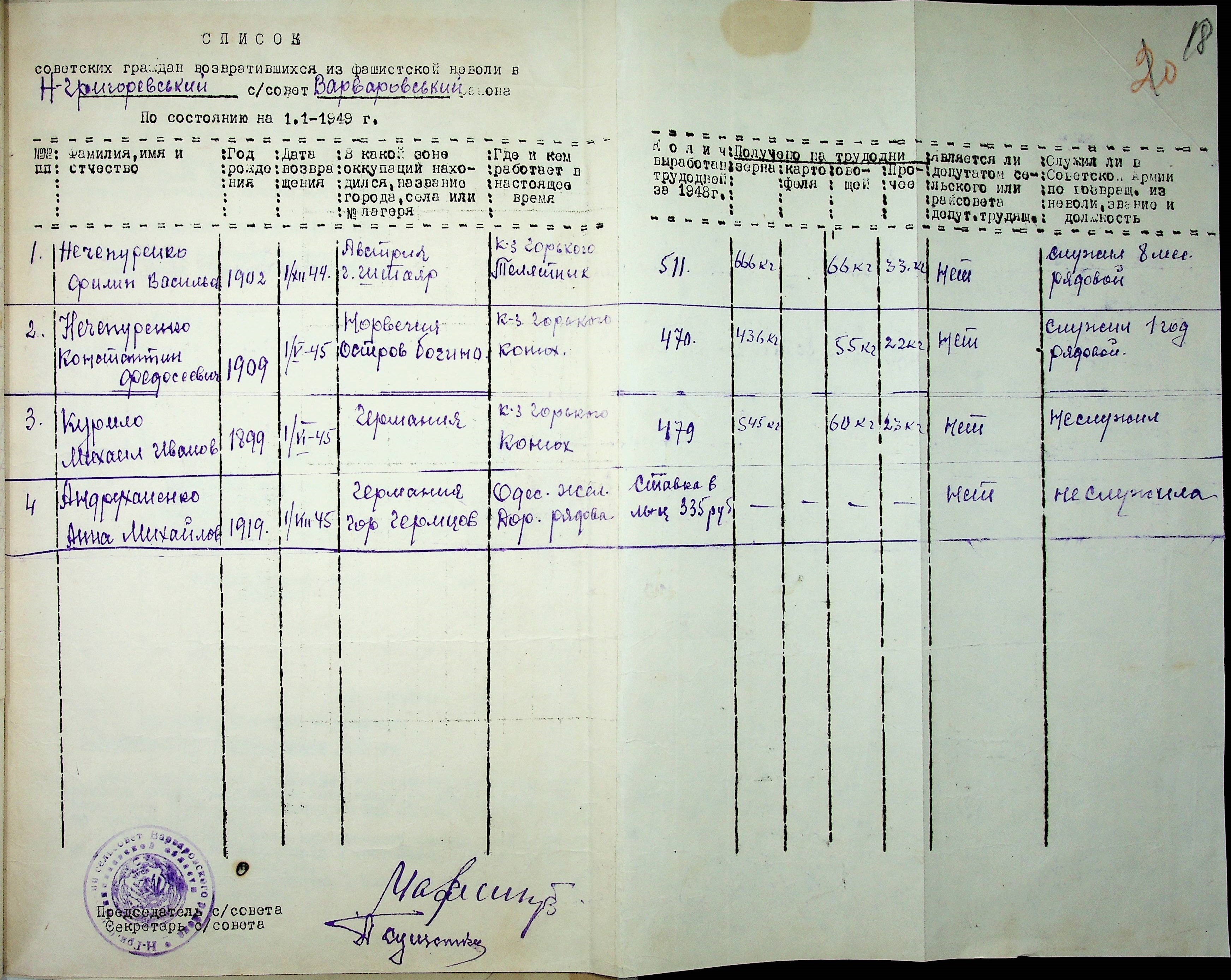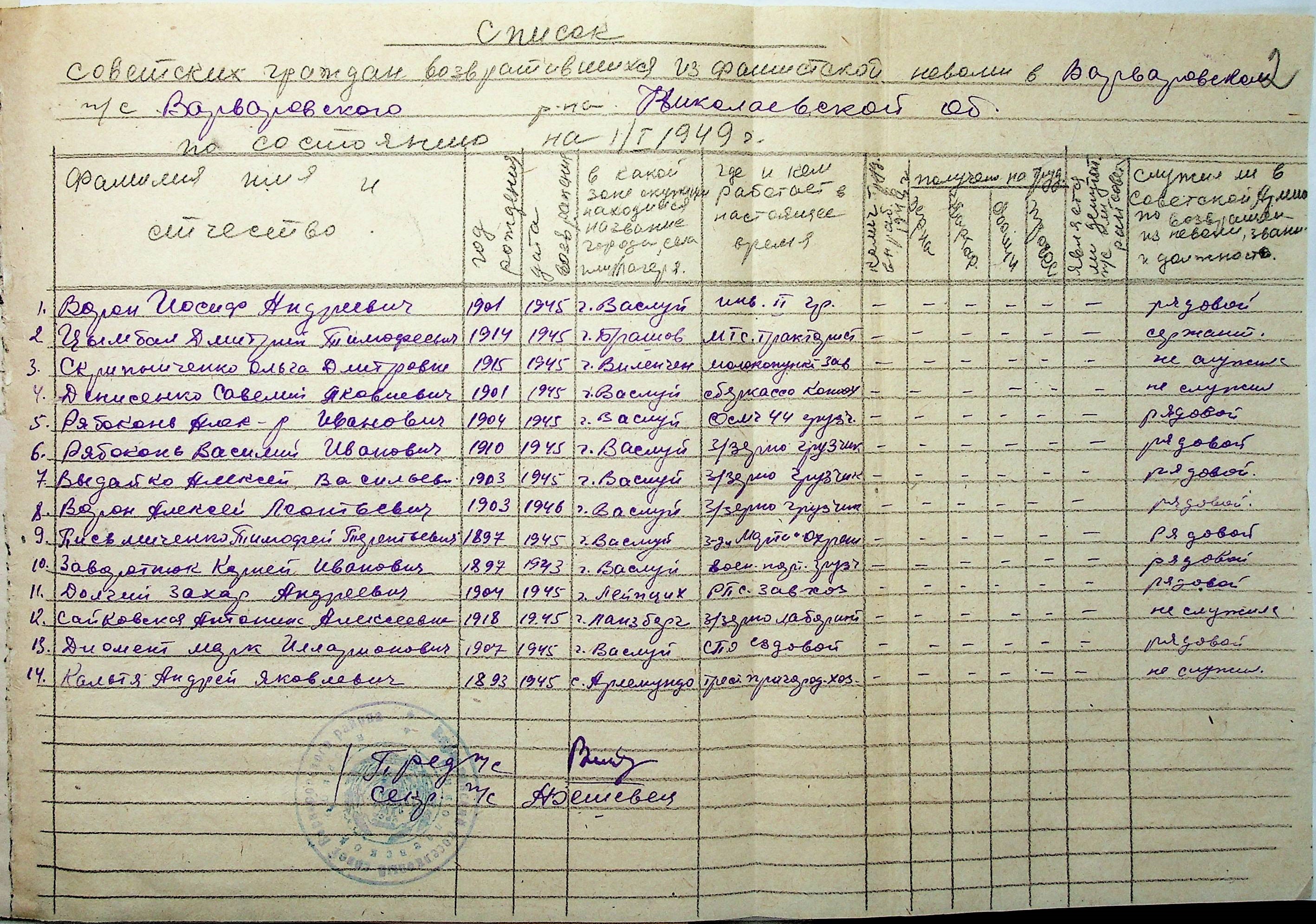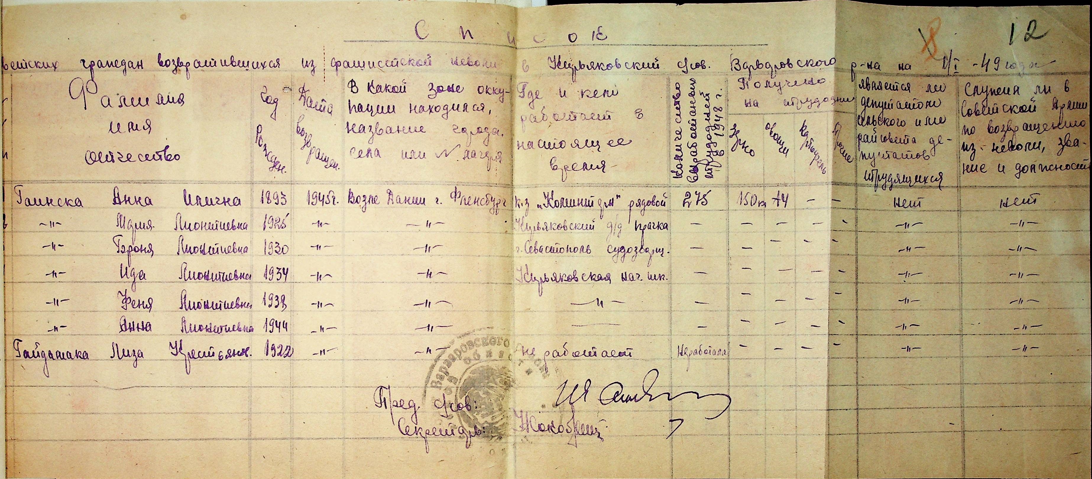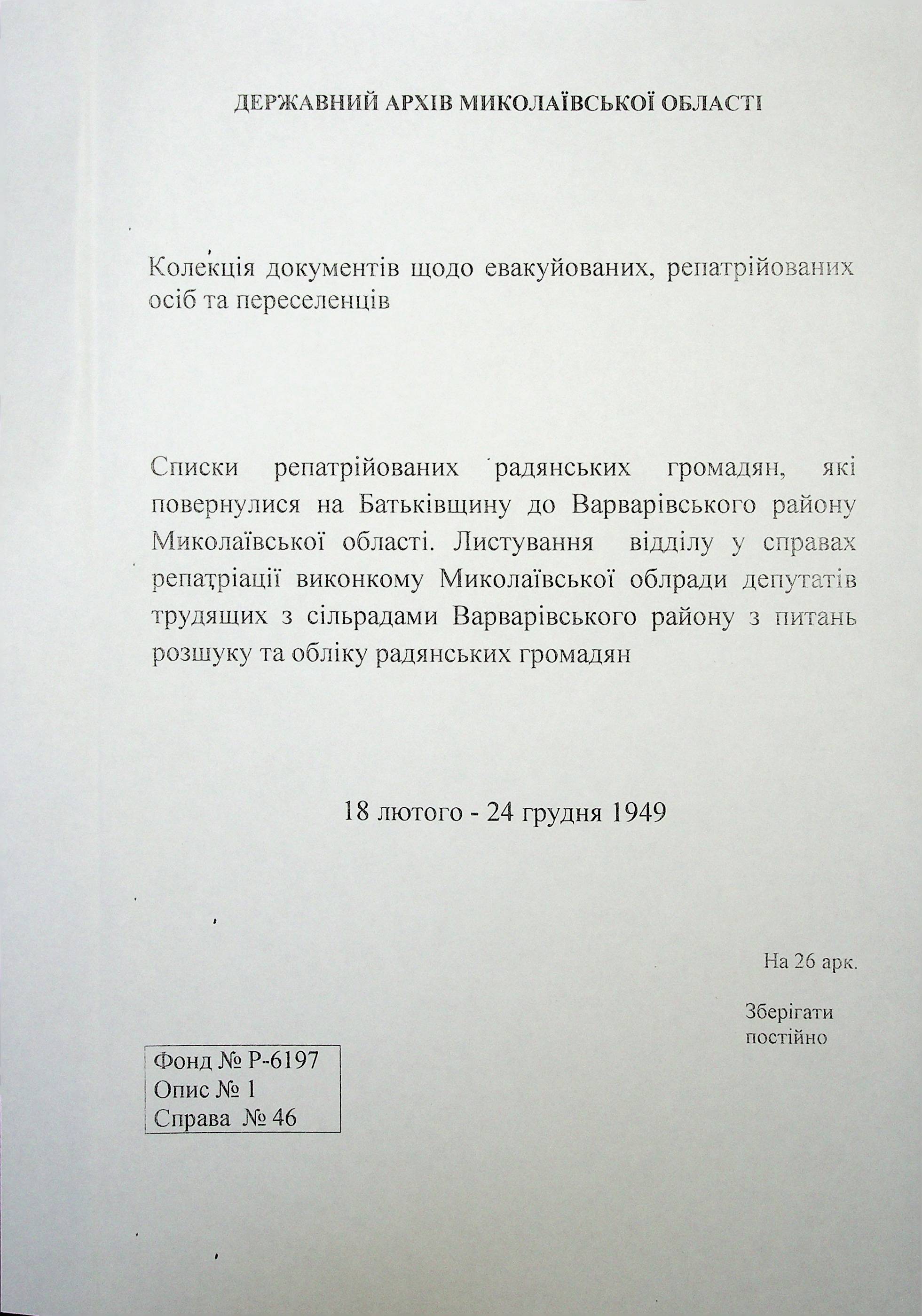 • • • • Справа № 46 “Списки репатрійованих радянських громадян, які повернулися на Батьківщину до Варварівського району Миколаївської області.