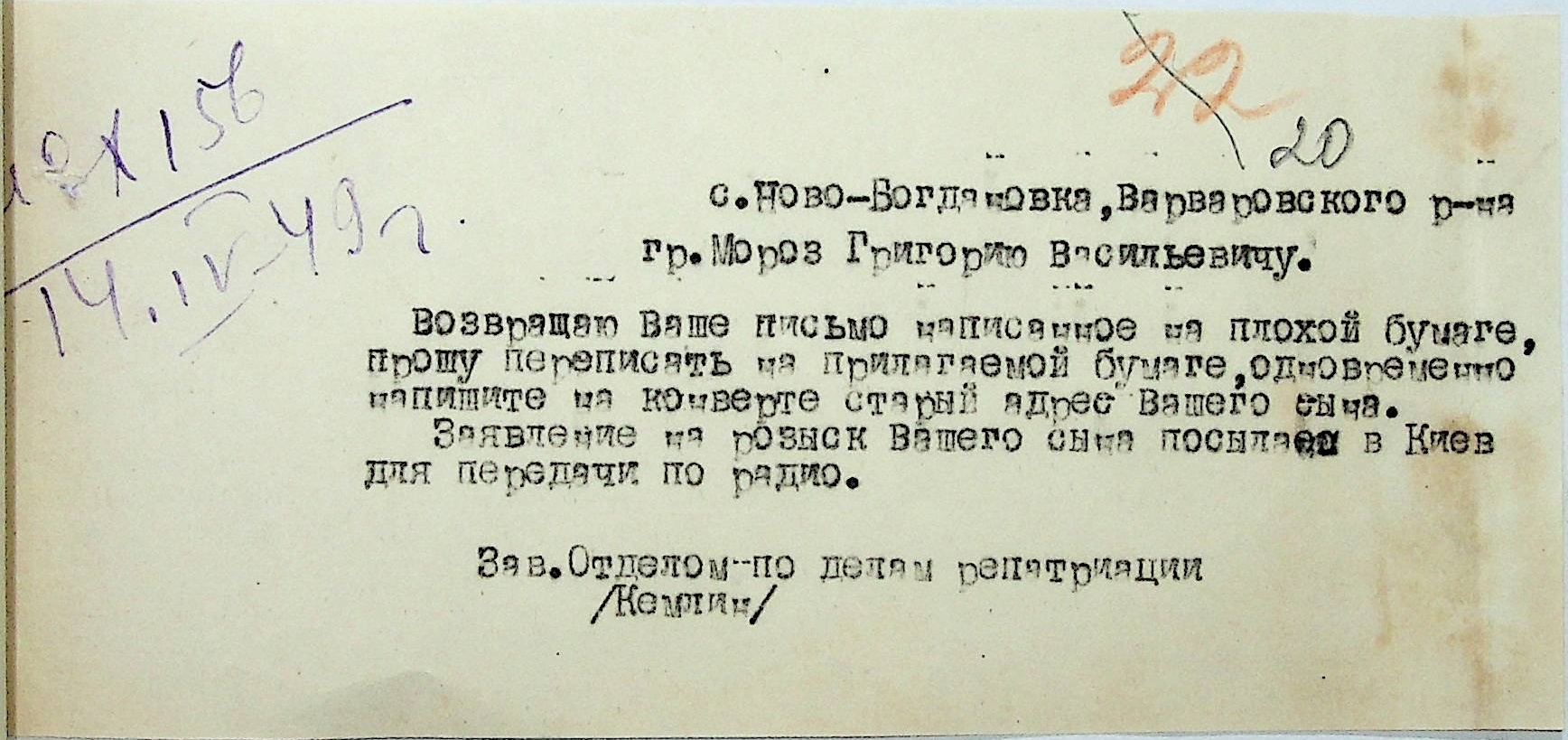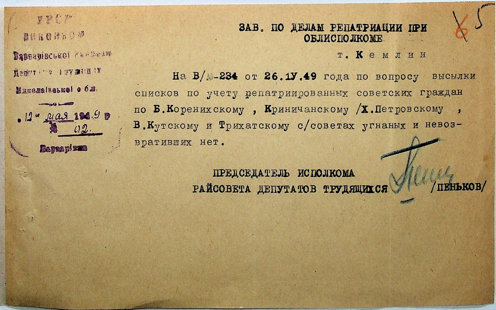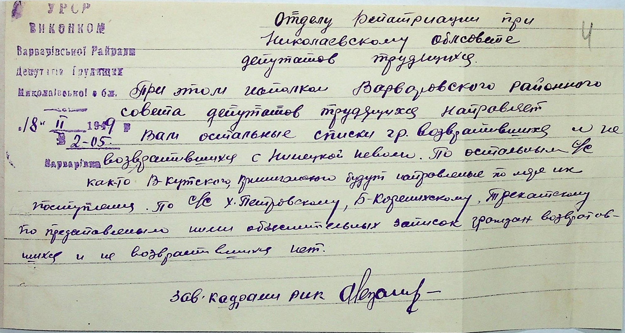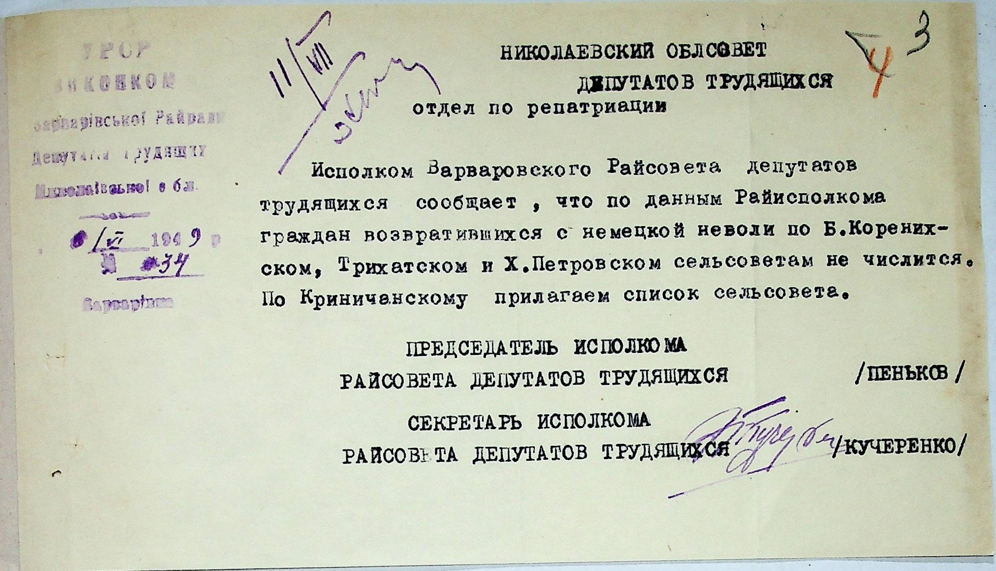 Листування відділу у справах репатріації виконкому Микола-ївської облради депутатів трудящих з сільрадами Варварівського району з питань розшуку та обліку радянських громадян”
