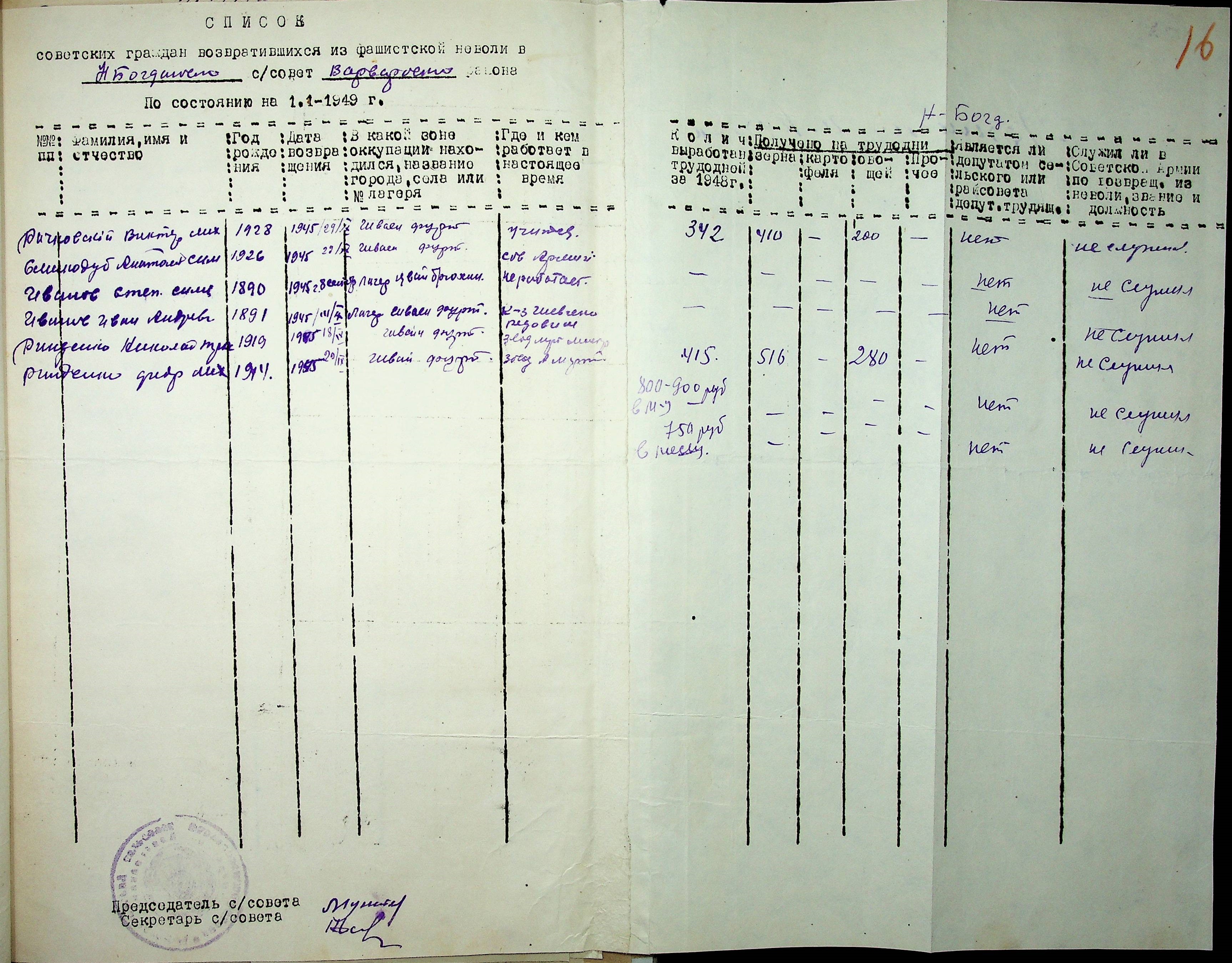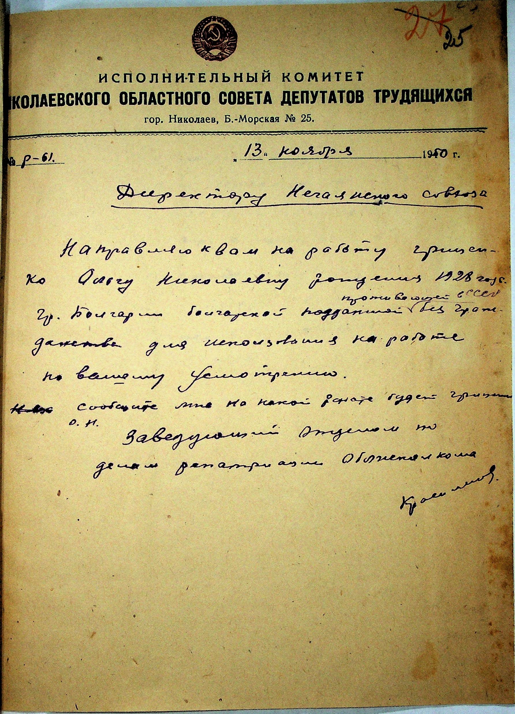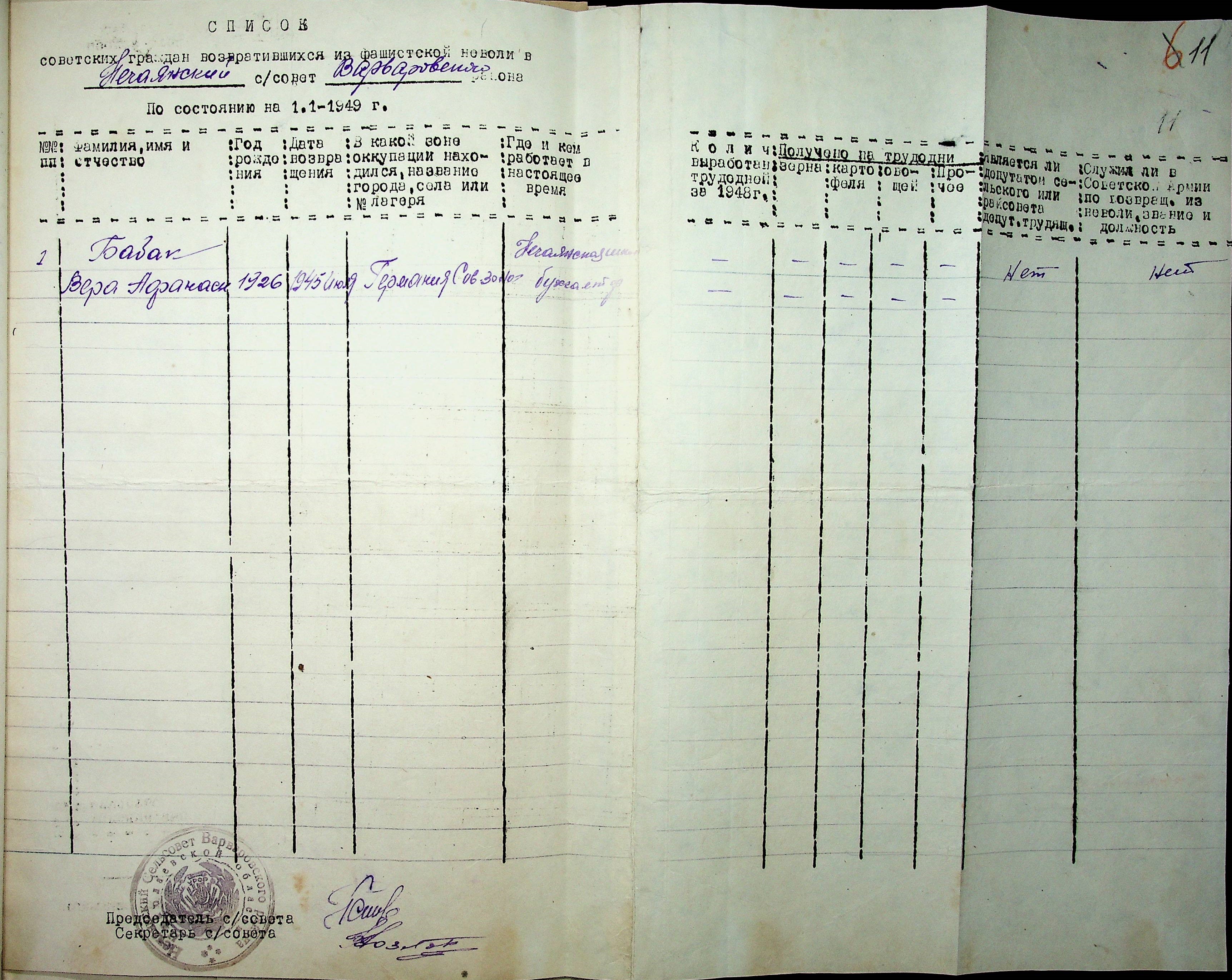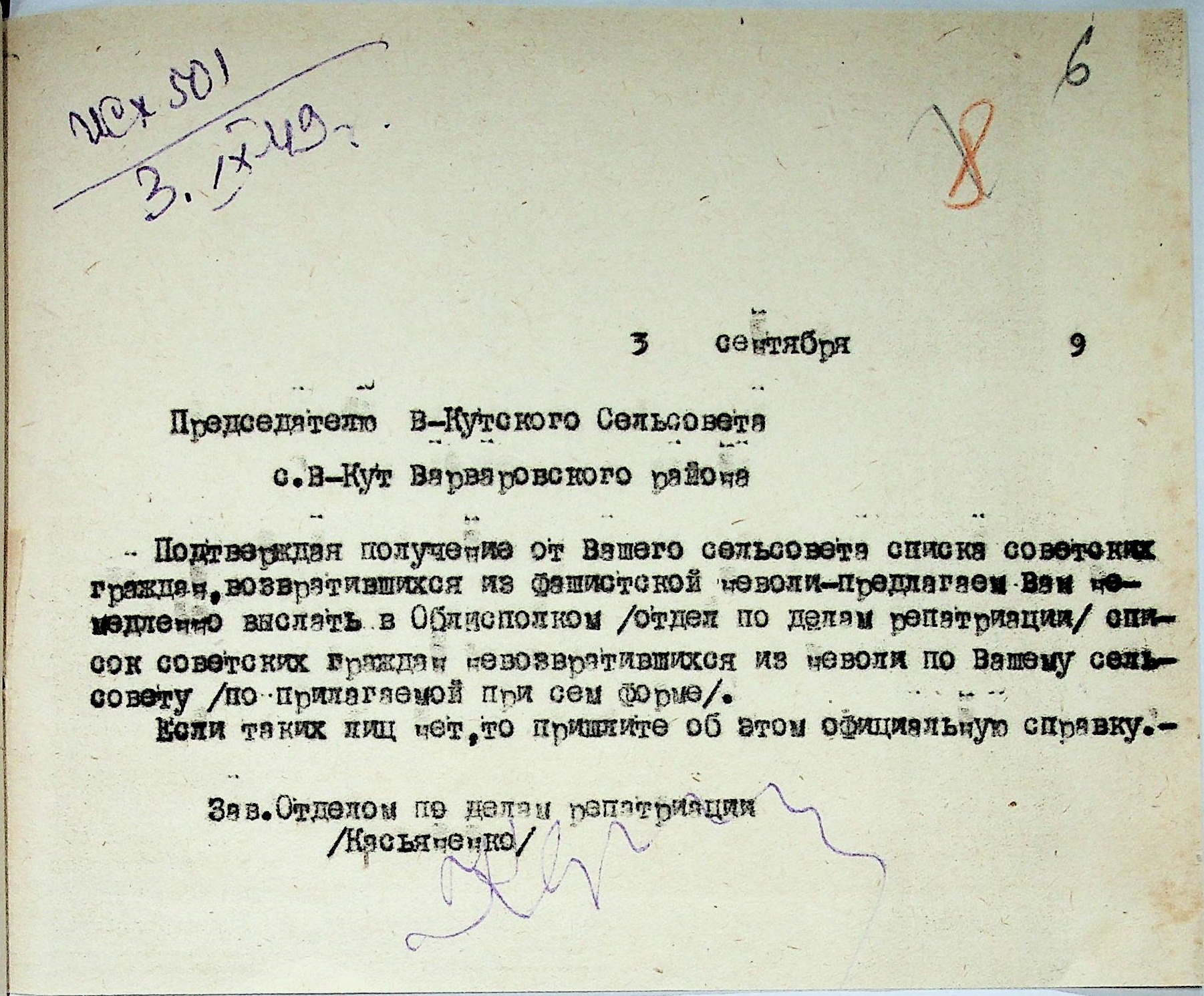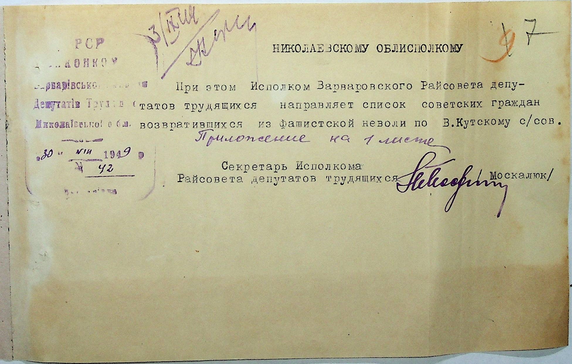 Листування відділу у справах репатріації виконкому Микола-ївської облради депутатів трудящих з сільрадами Варварівського району з питань розшуку та обліку радянських громадян”