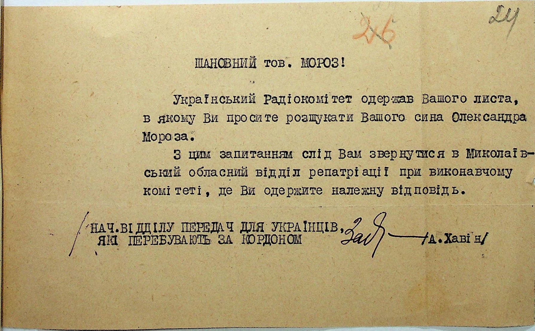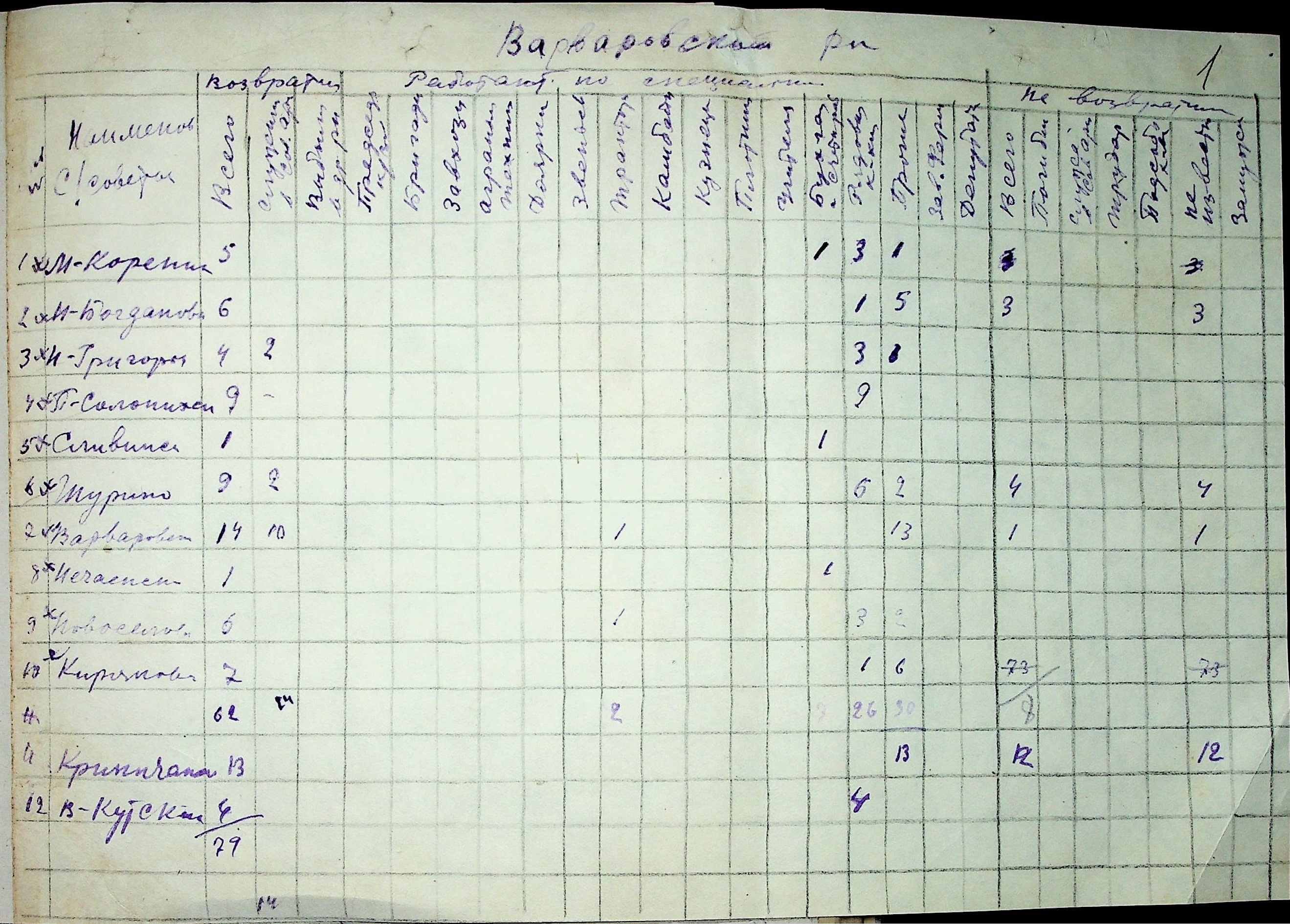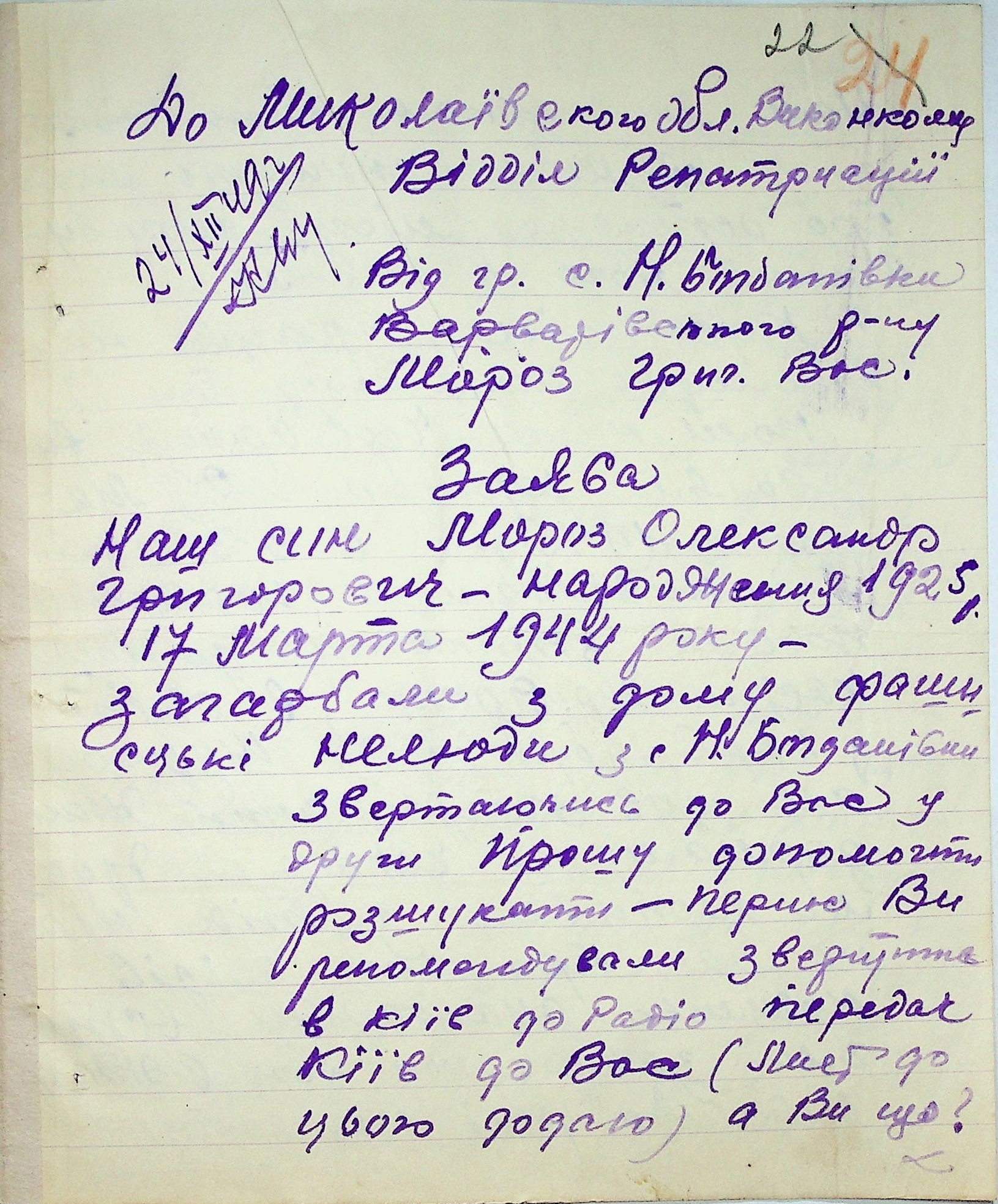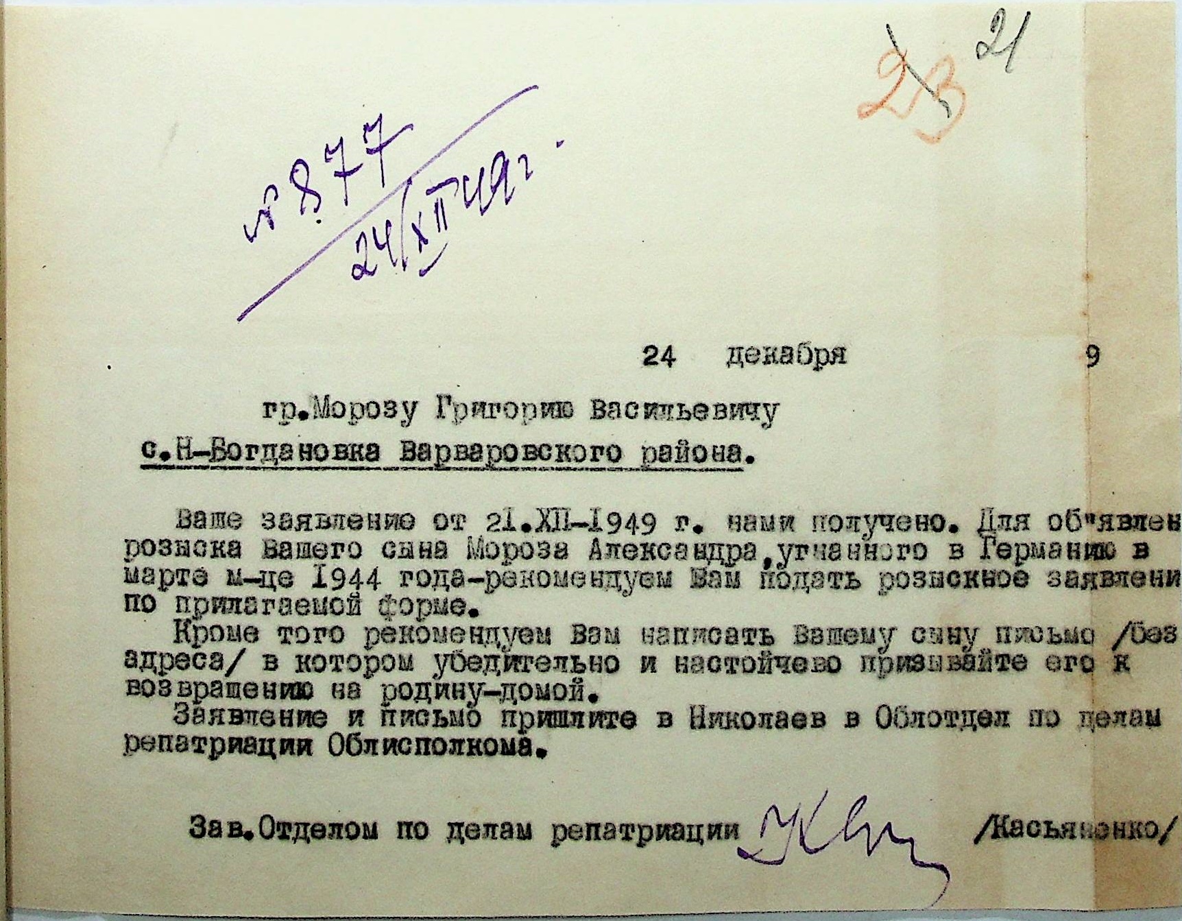 Листування відділу у справах репатріації виконкому Микола-ївської облради депутатів трудящих з сільрадами Варварівського району з питань розшуку та обліку радянських громадян”