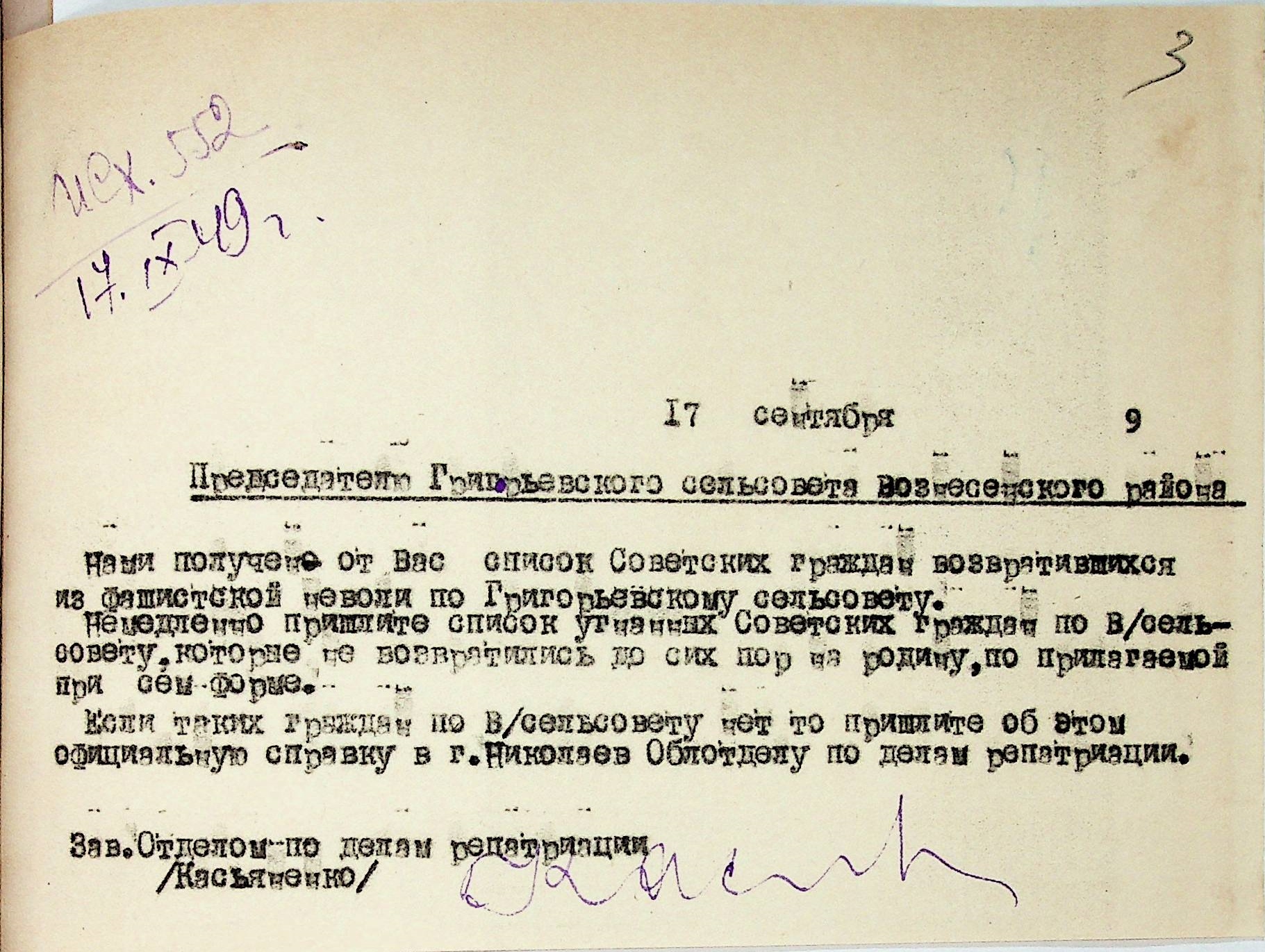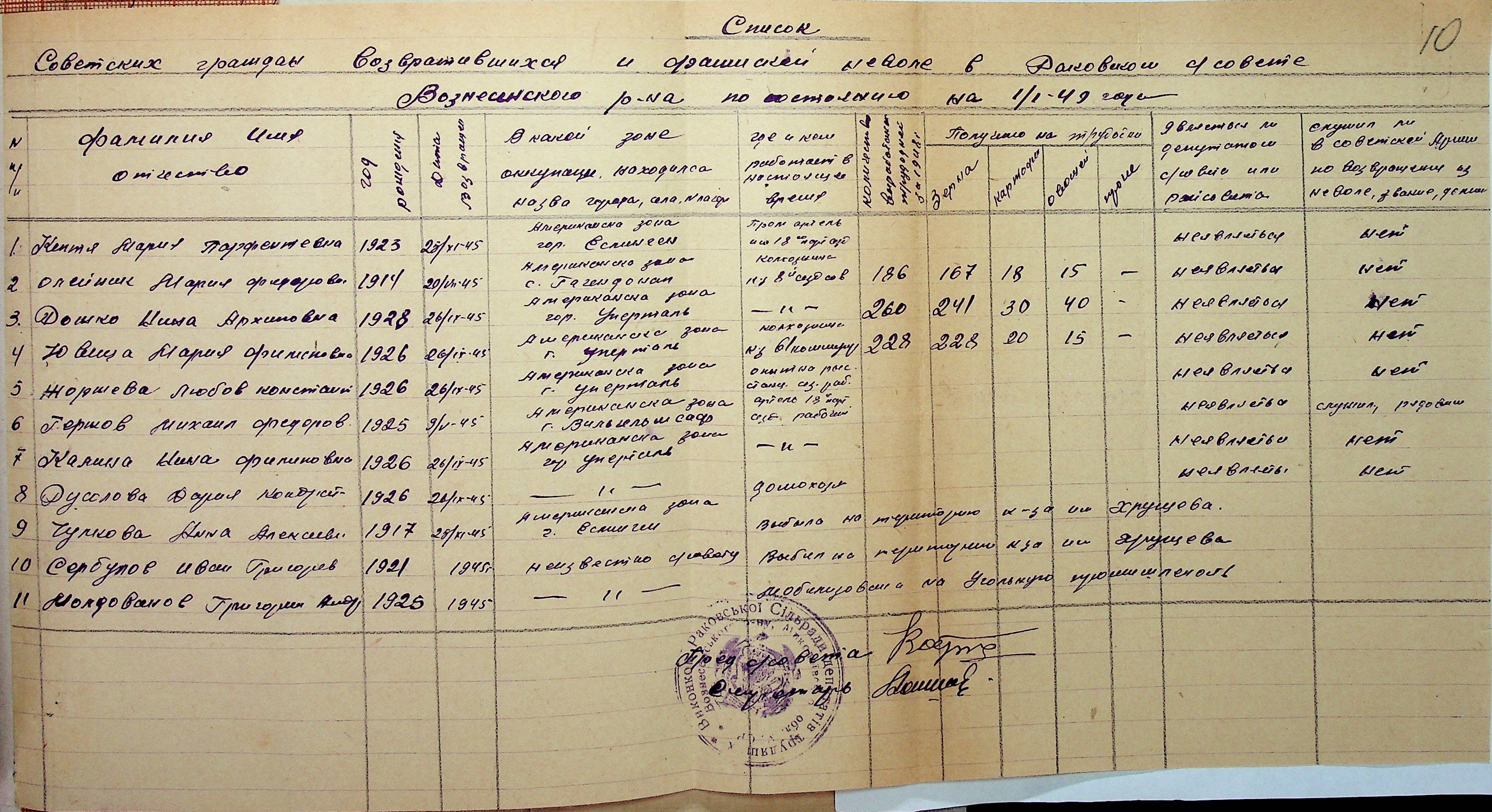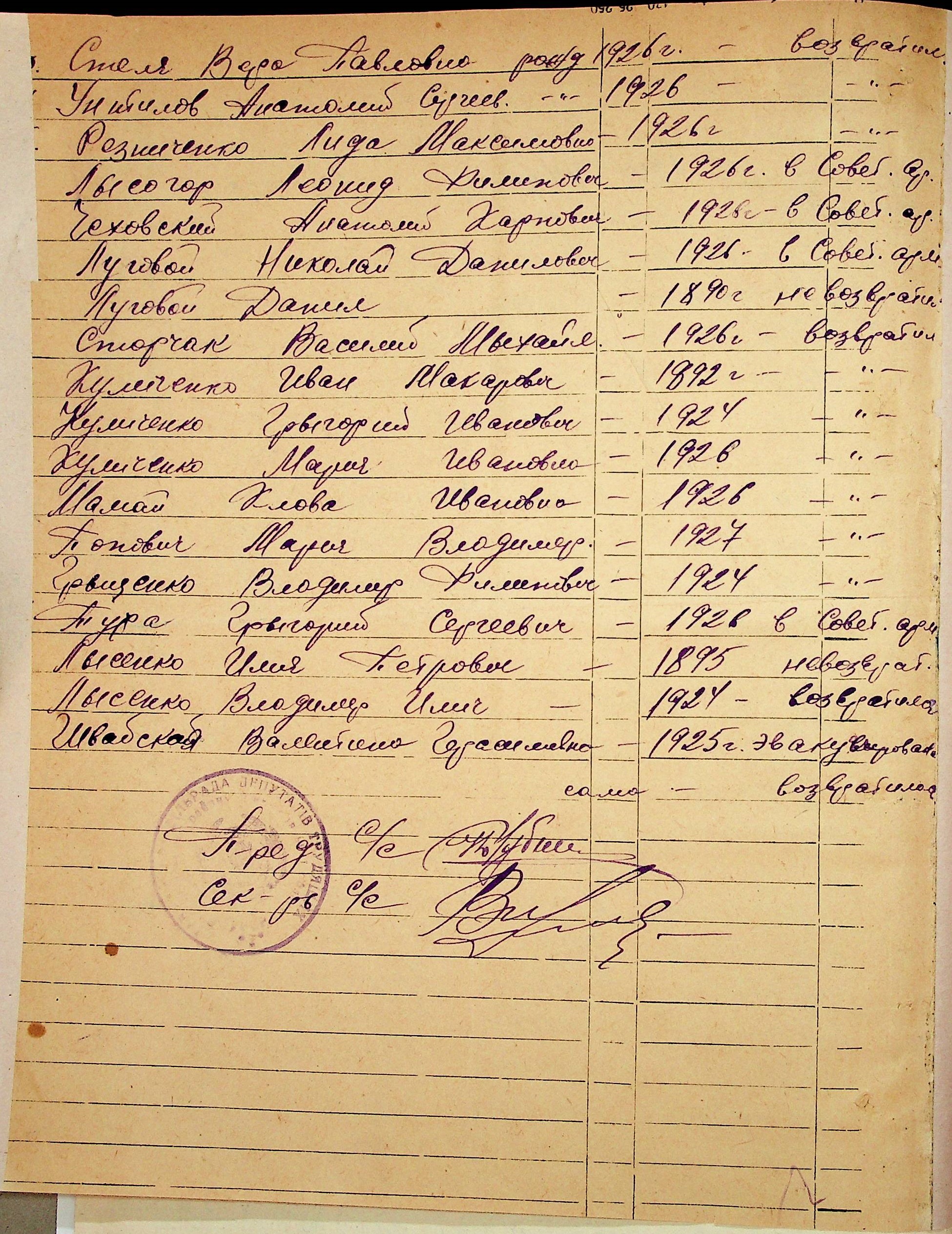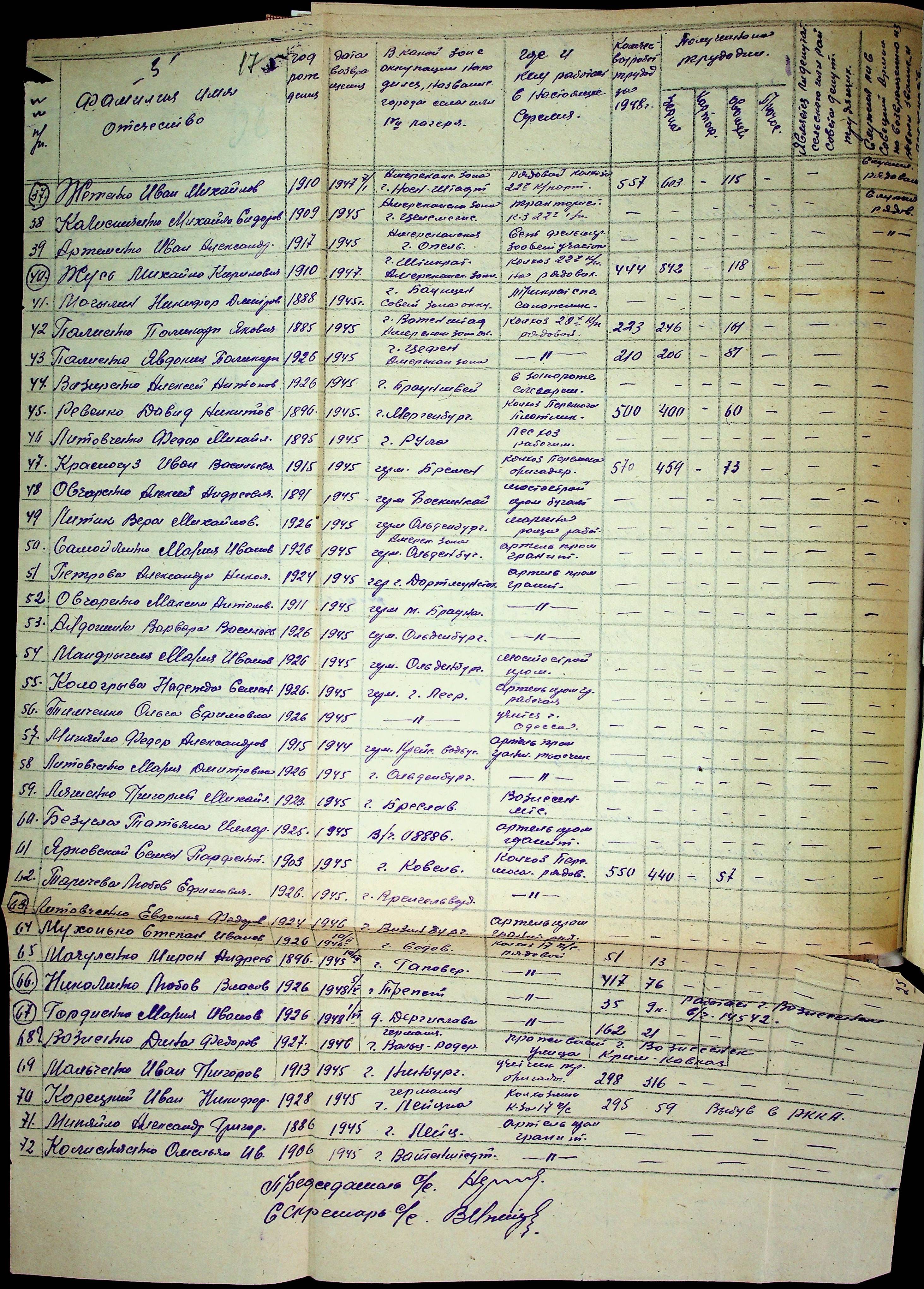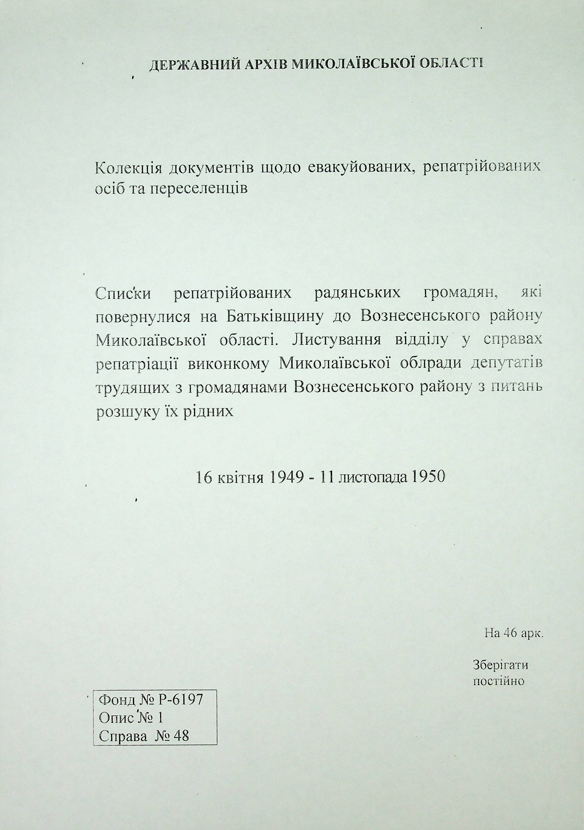 • • • • Справа № 48 “Списки репатрійованих радянських громадян, які повернулися на Батьківщину до Вознесенського району Миколаївської області.