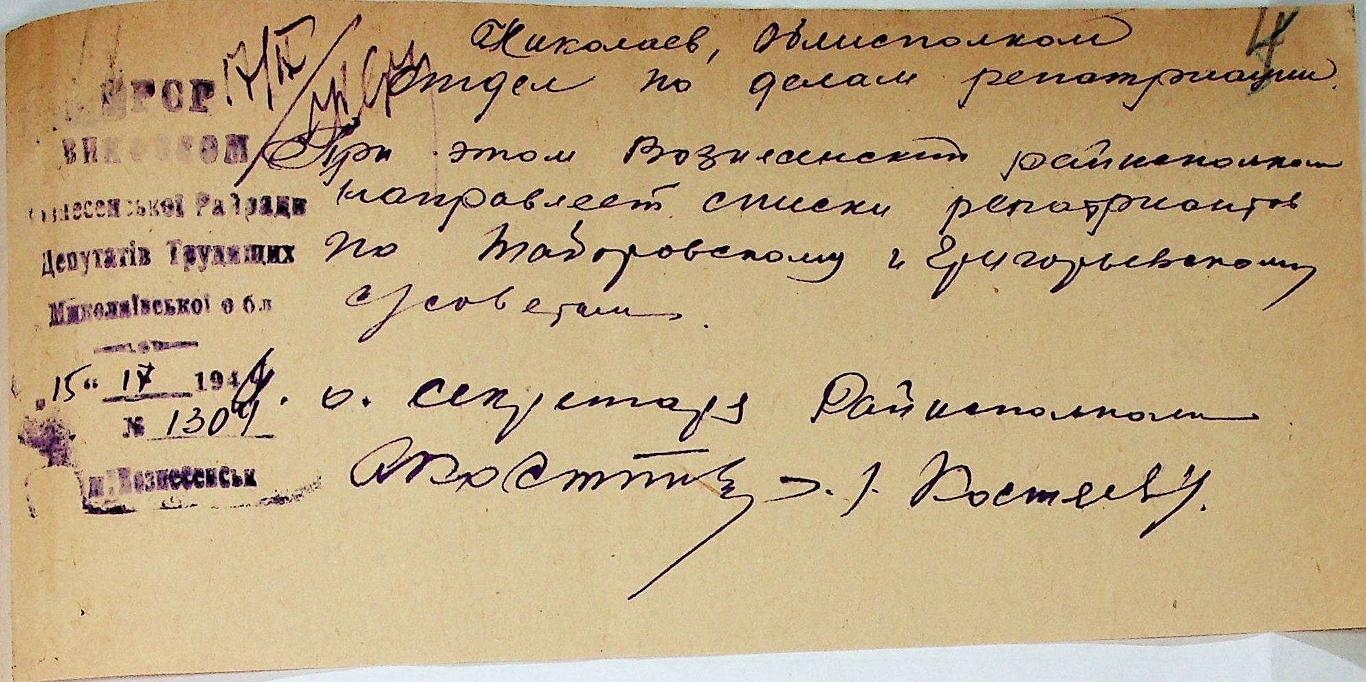 Листування відділу у справах репатріації виконкому Микола-ївської облради депутатів трудящих з громадянами Вознесенського району з питань розшуку їх рідних”