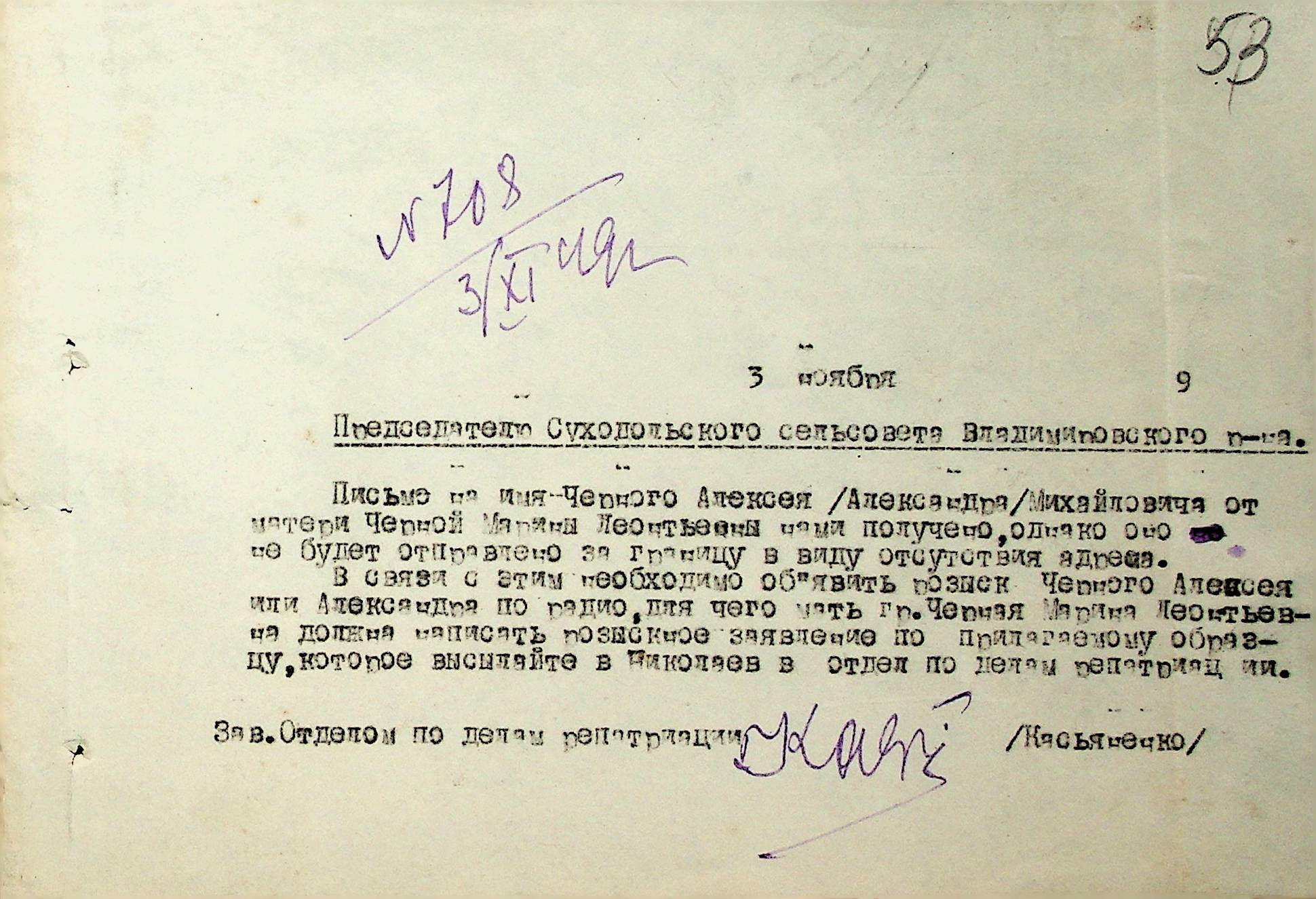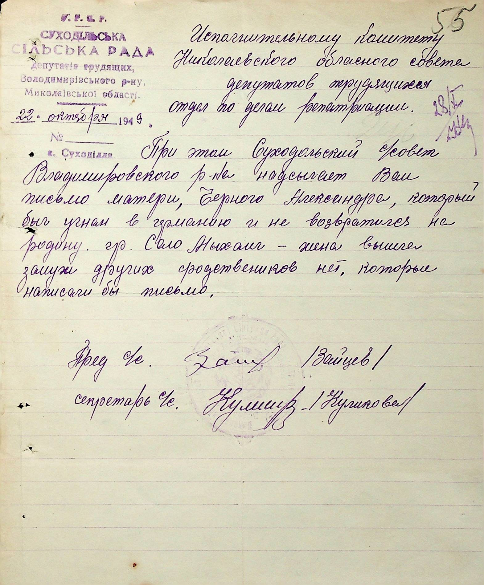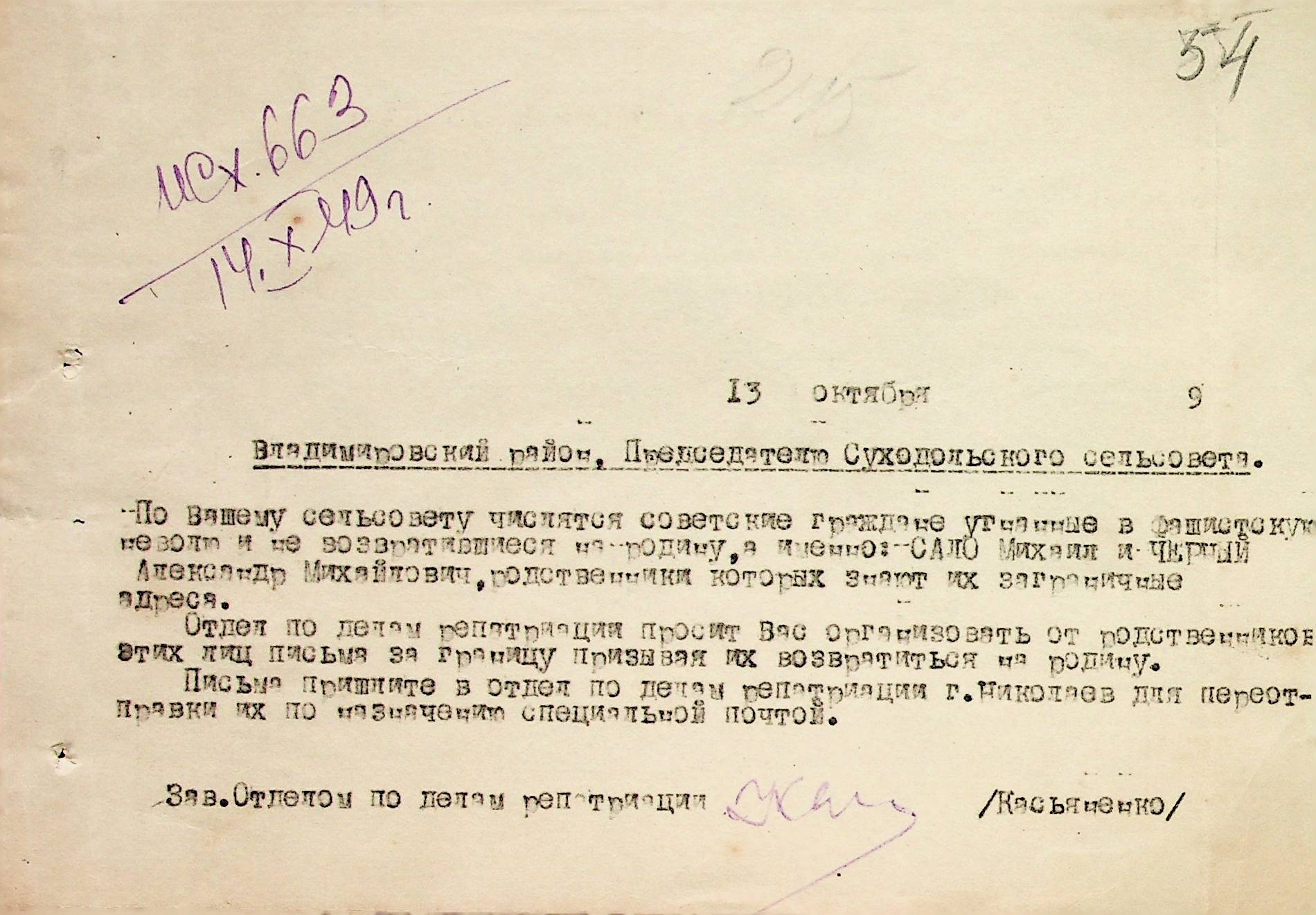 Листування відділу у справах репатріації виконкому Микола-ївської облради депутатів трудящих з сільрадами Володимирівського району з питань розшуку та обліку радянських громадян”