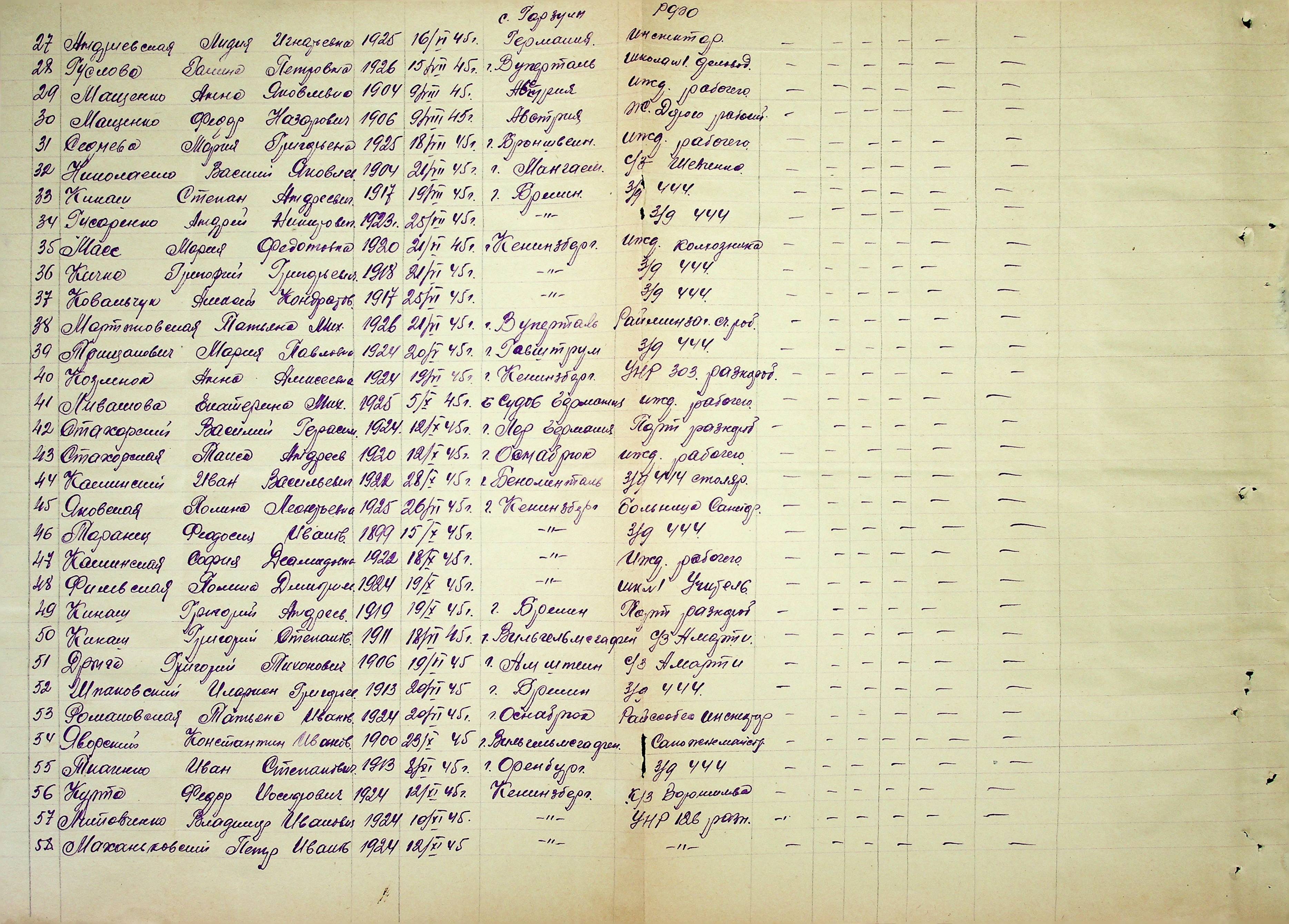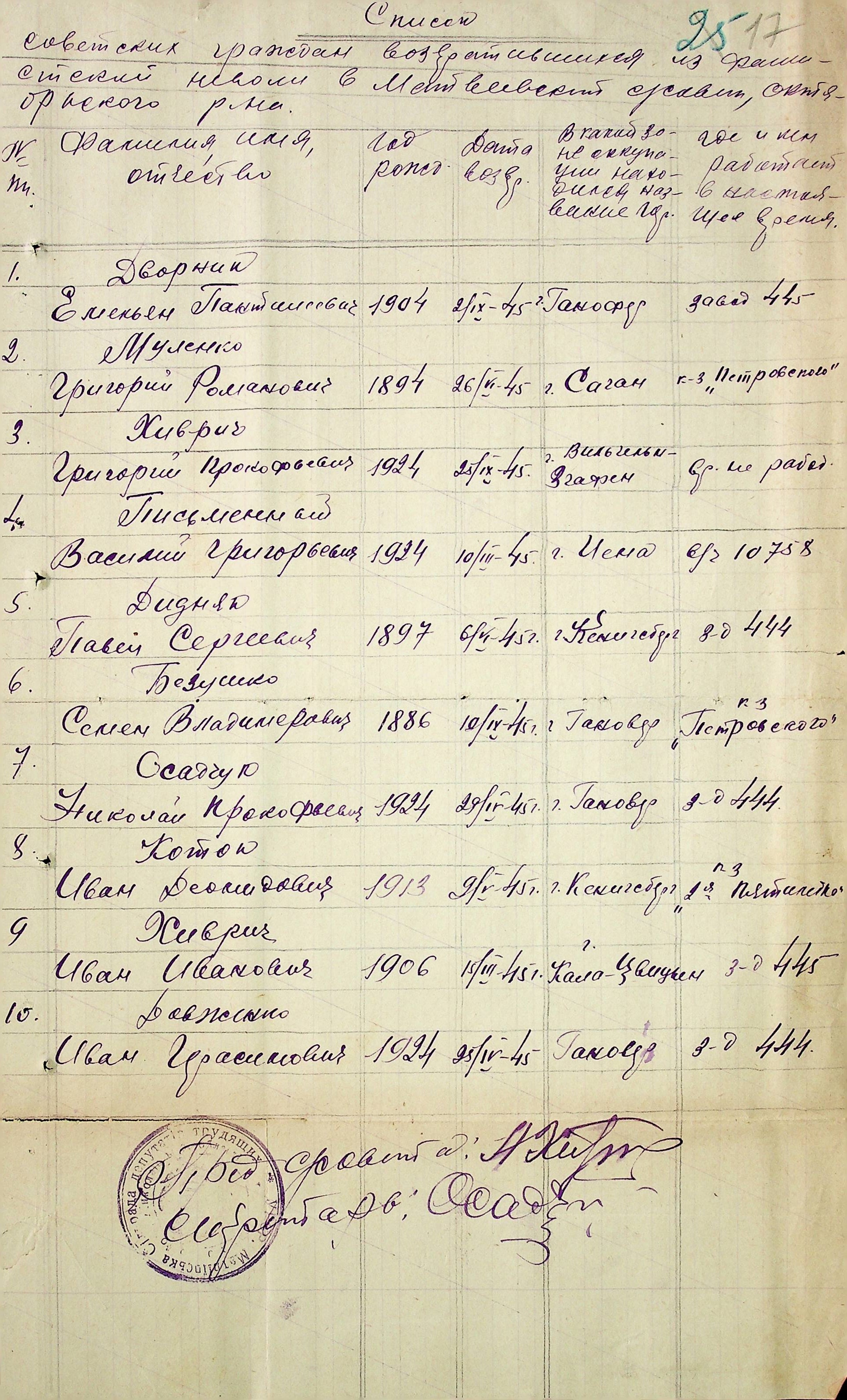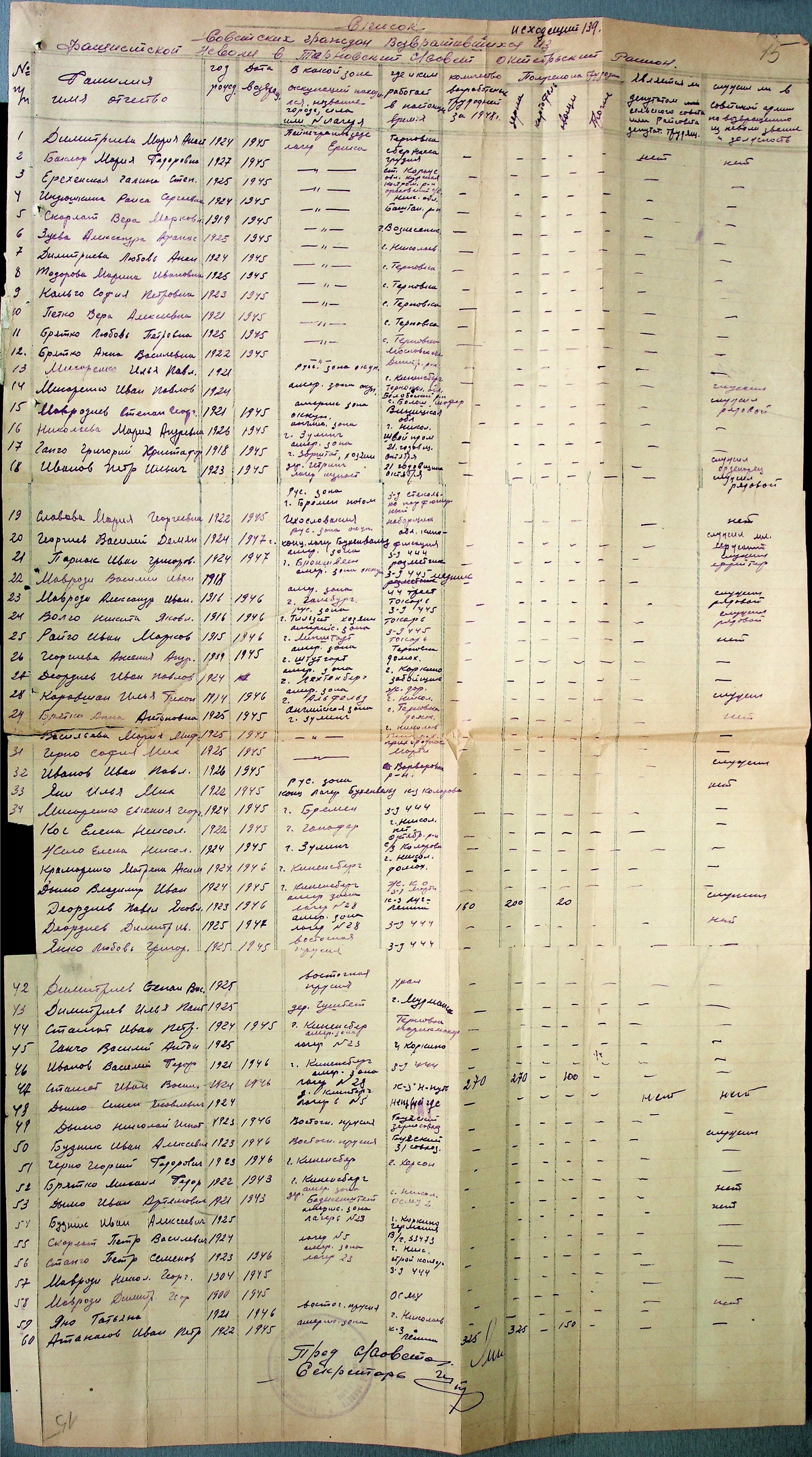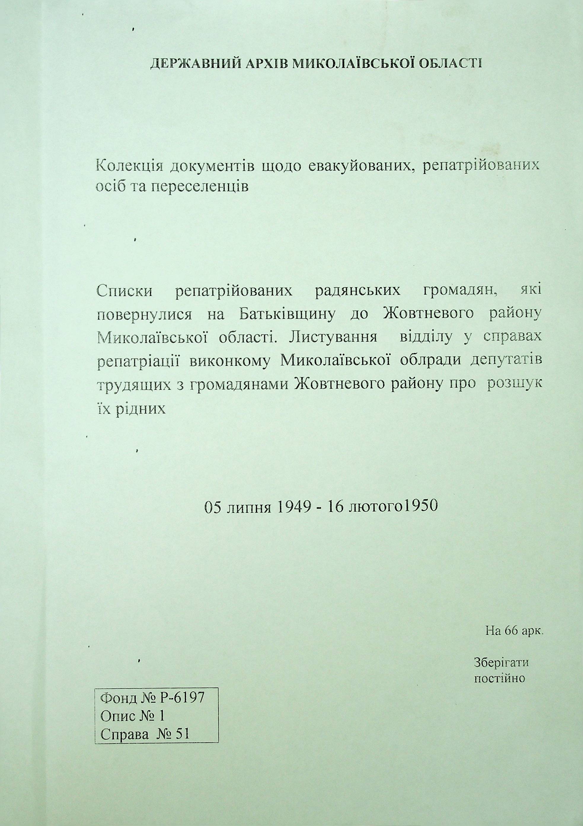 • • • • Справа № 51 “Списки репатрійованих радянських громадян, які повернулися на Батьківщину до Жовтневого району Миколаївської області.