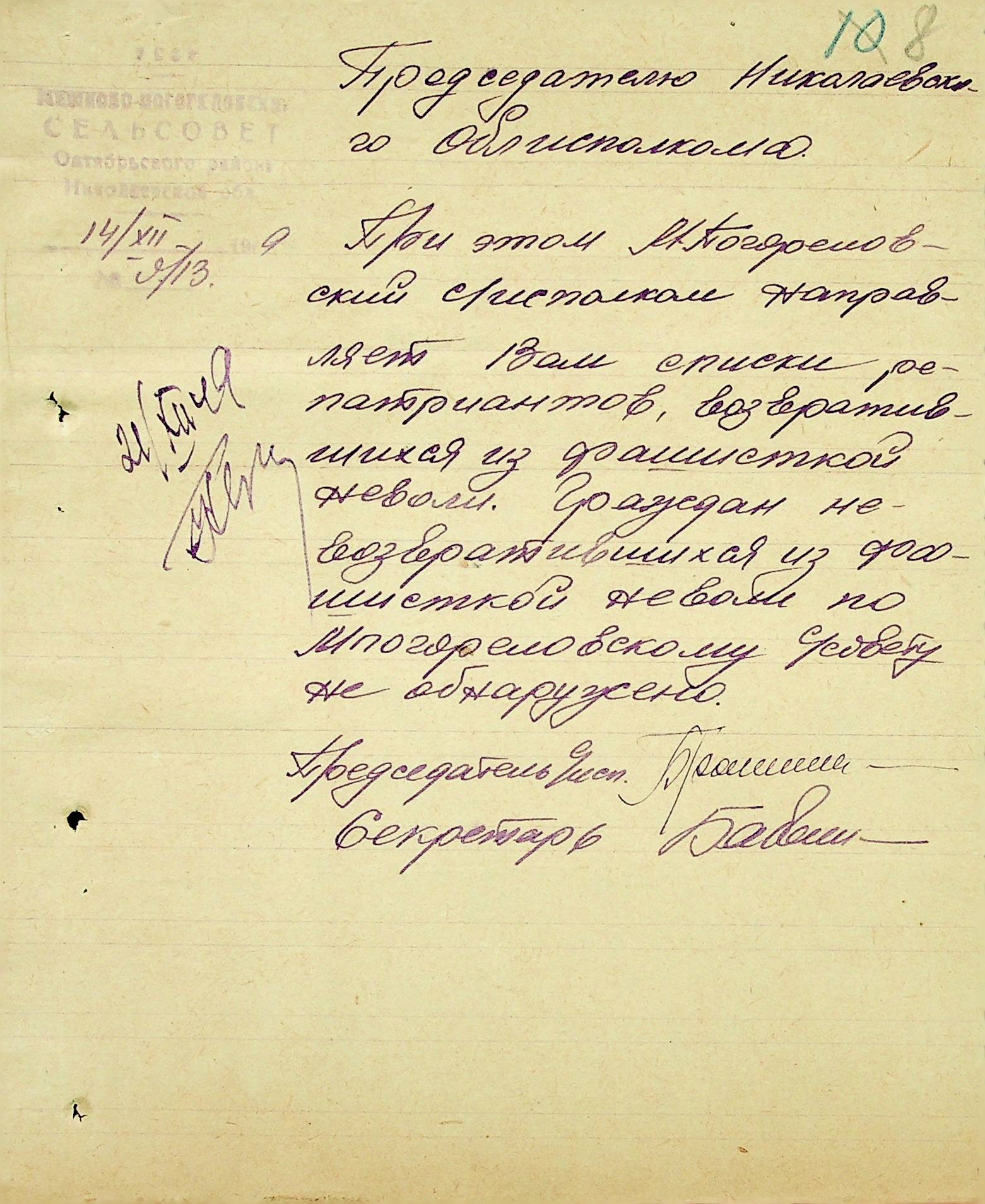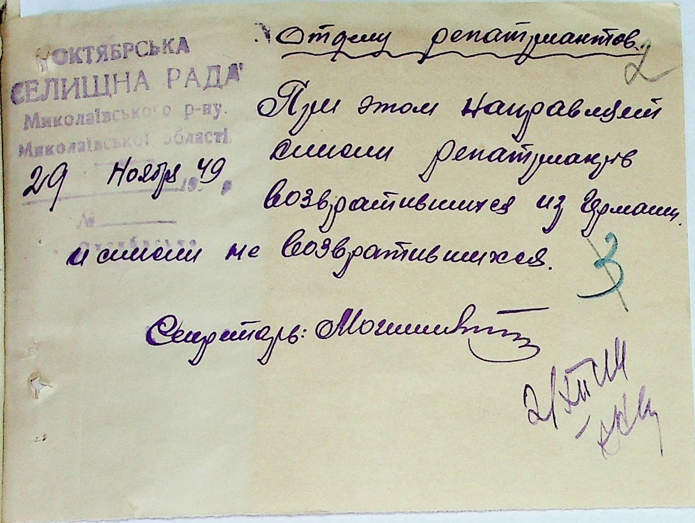 Листування відділу у справах репатріації виконкому Микола-ївської облради депутатів трудящих з громадянами Жовтневого району про розшук їх рідних”
