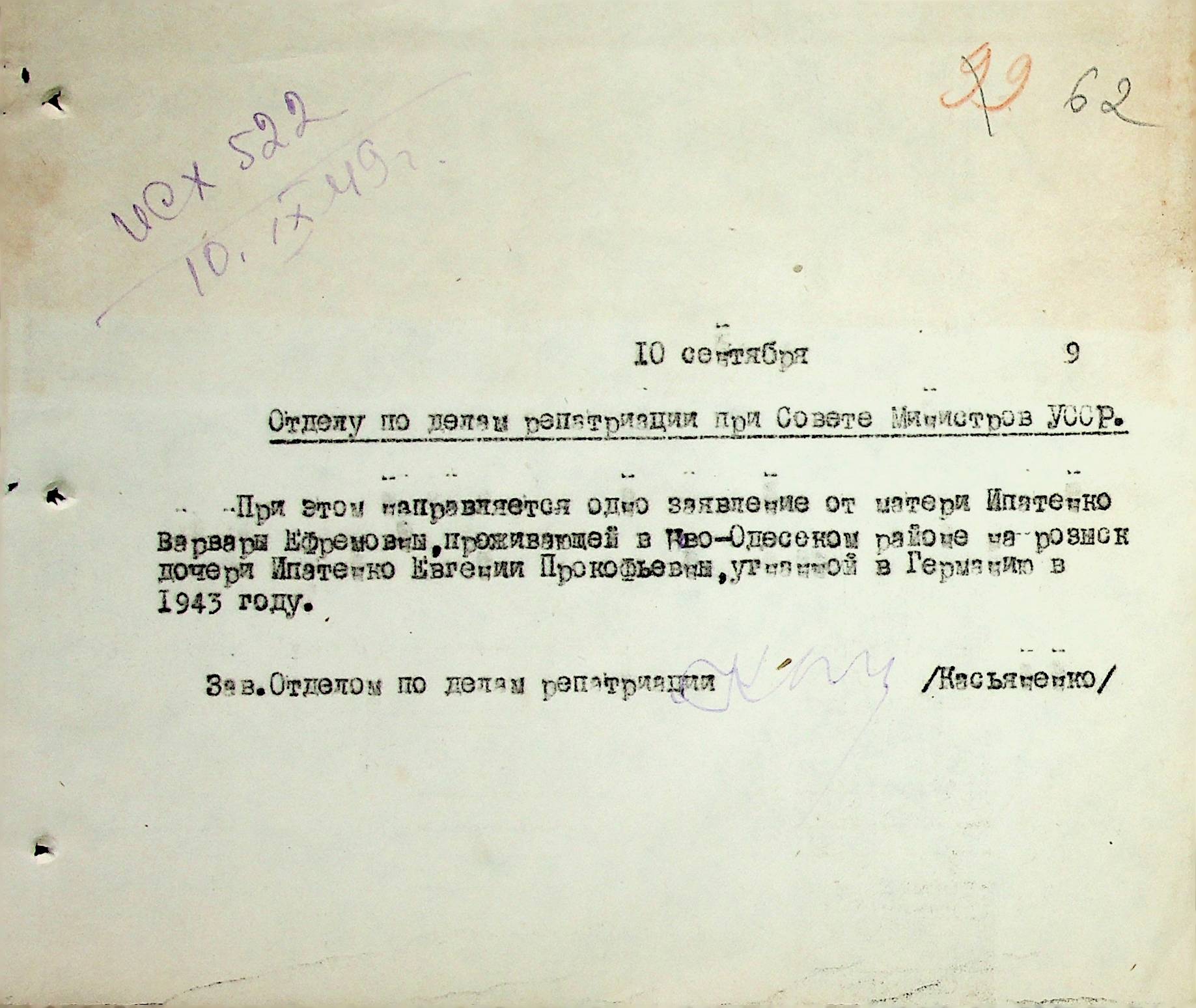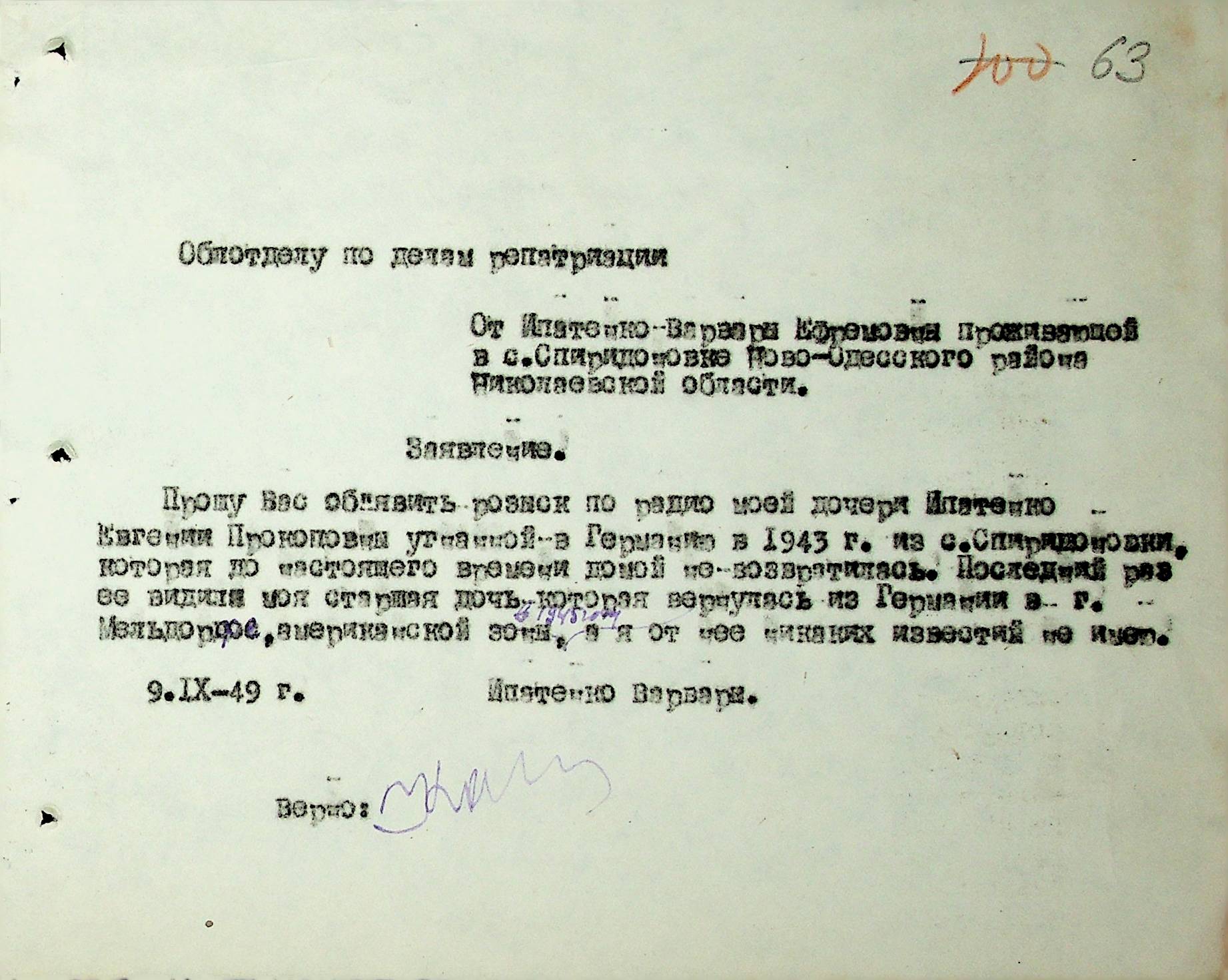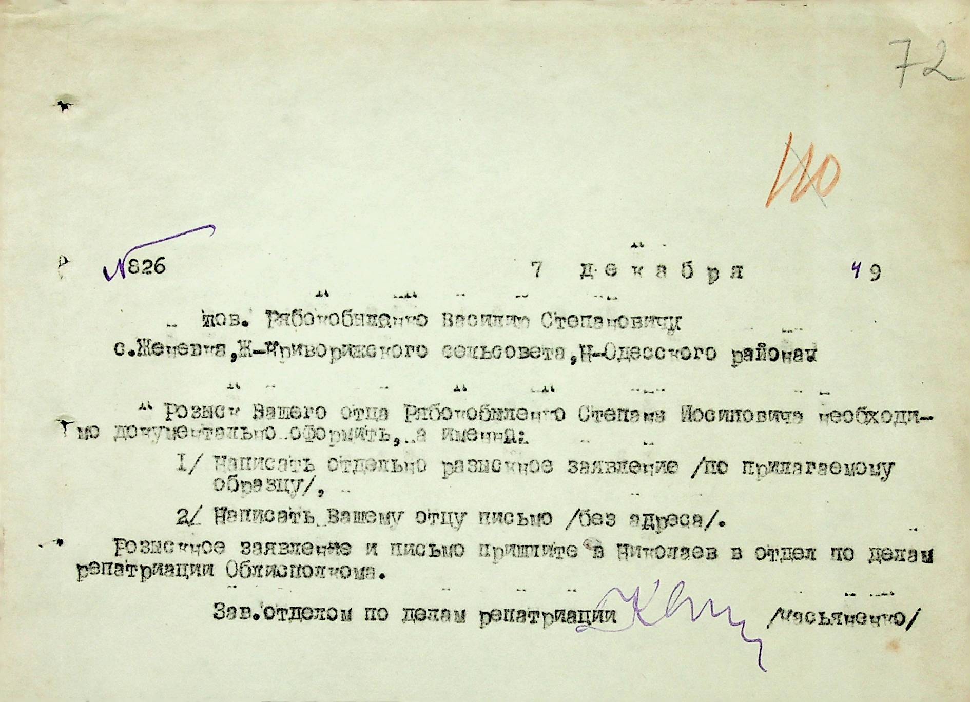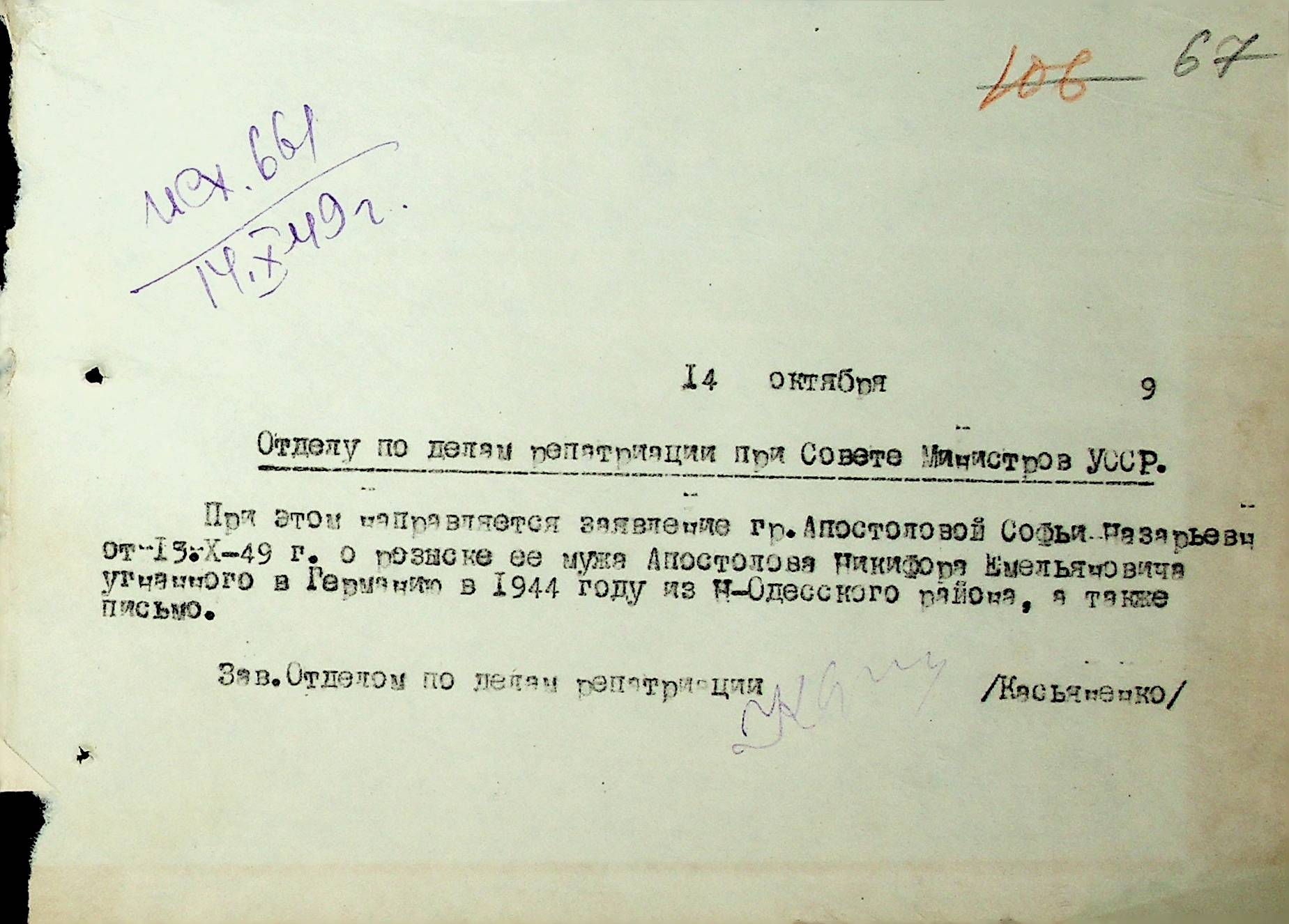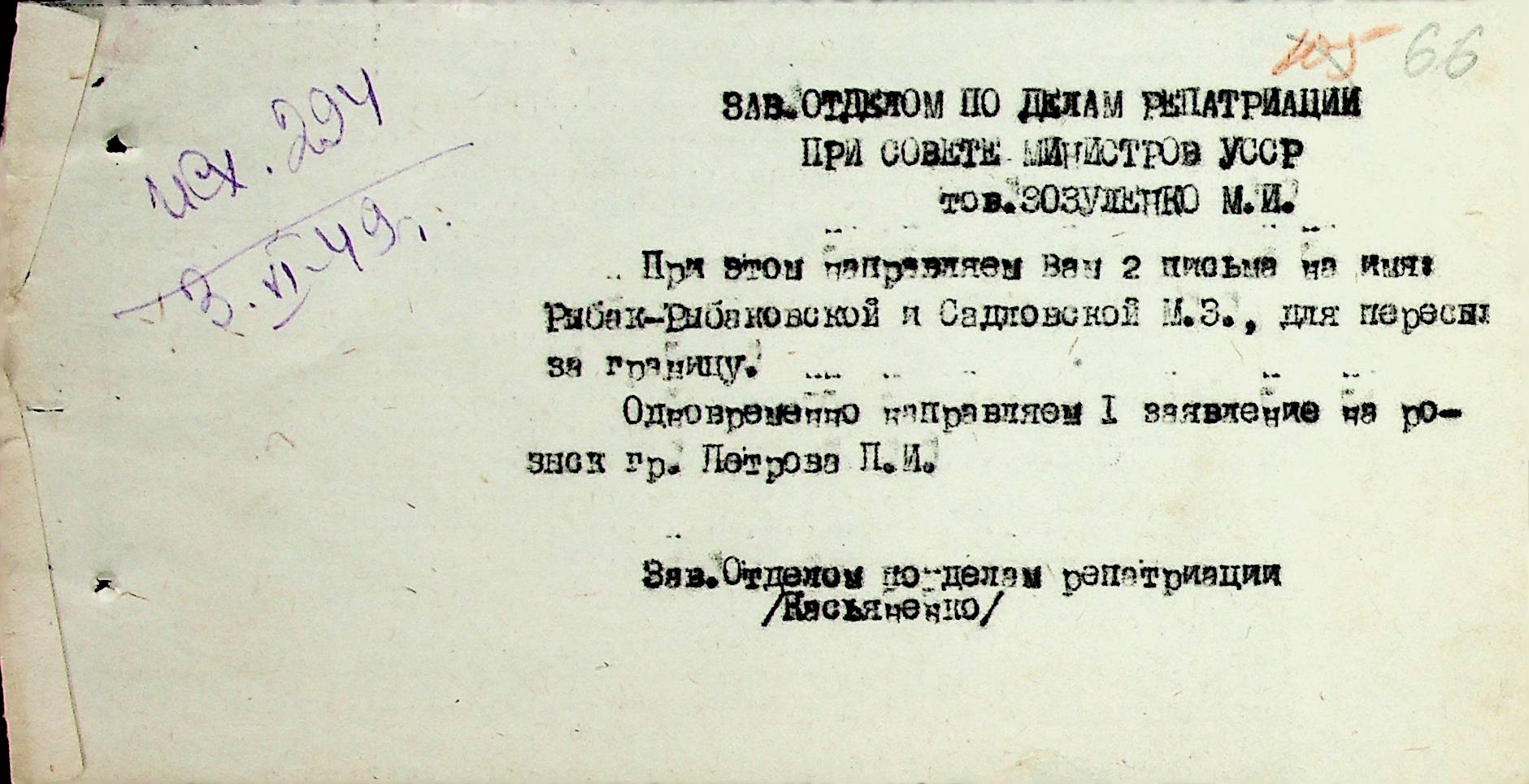 Листування відділу у справах репатріації виконкому Микола-ївської облради депутатів трудящих з відділом у справах репатріації при Раді Міністрів УРСР з питань розшуку та обліку радянських громадян”