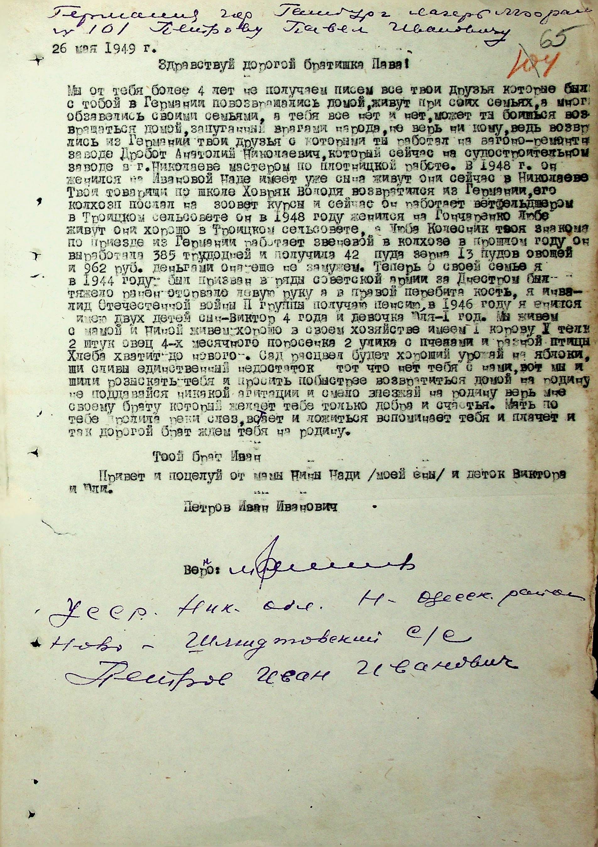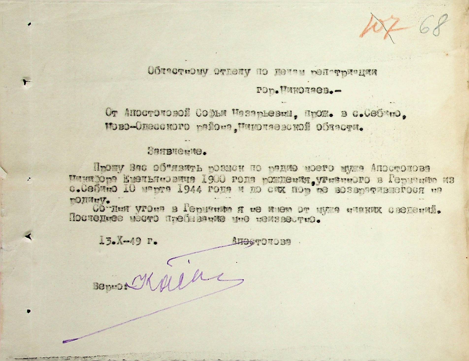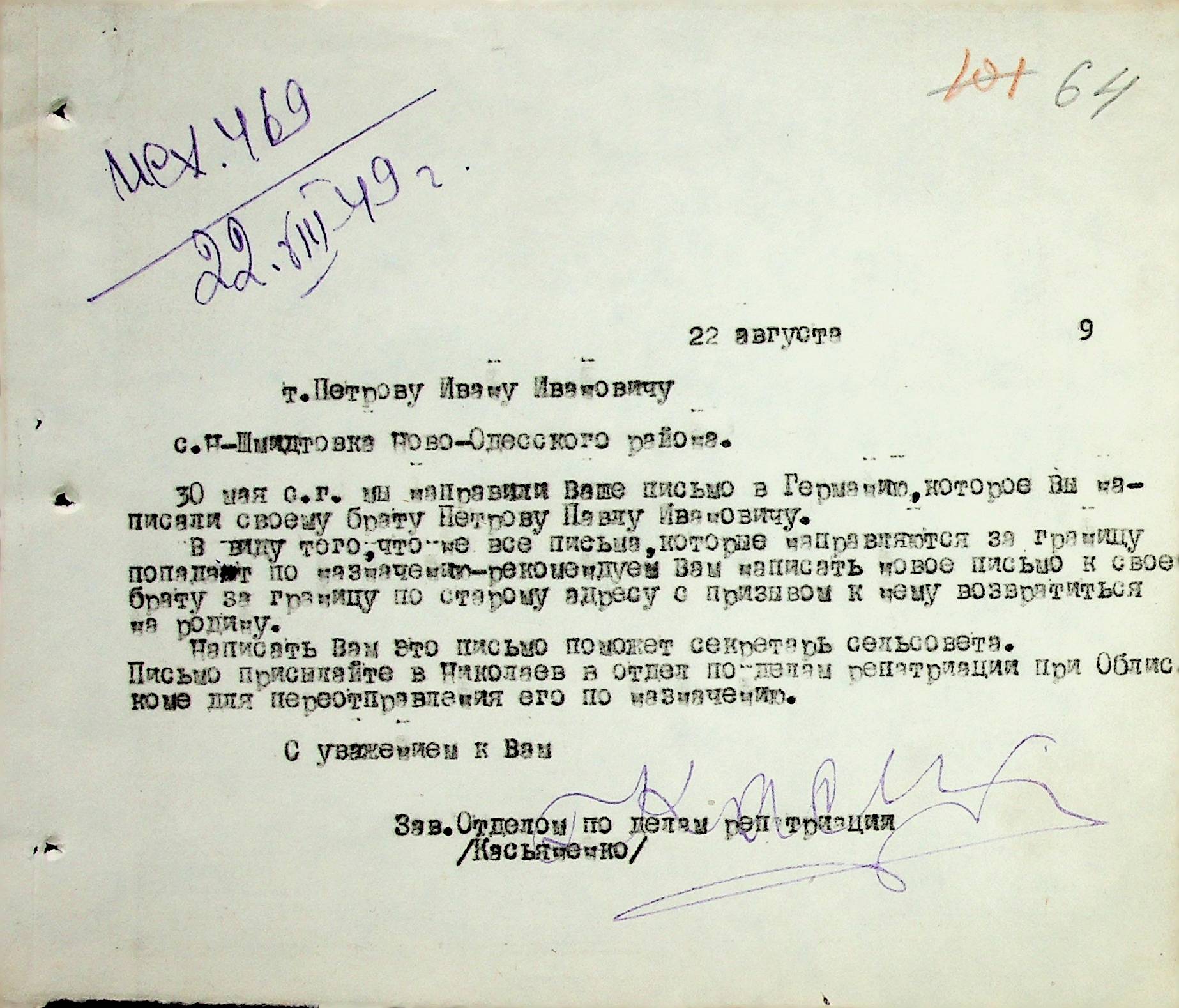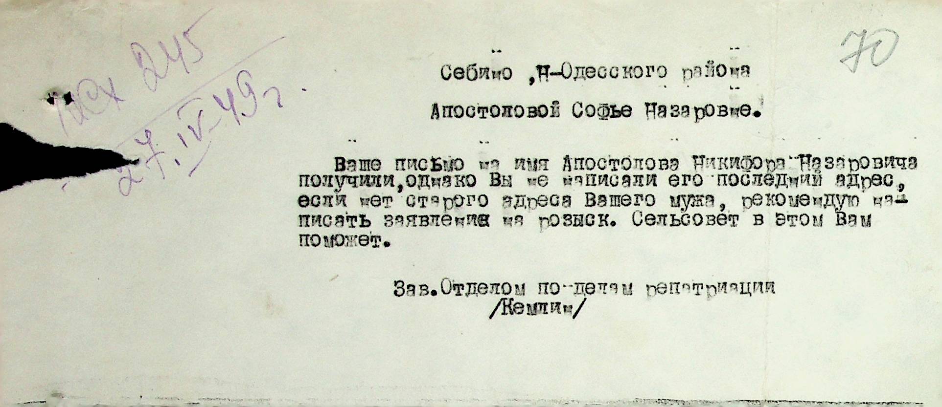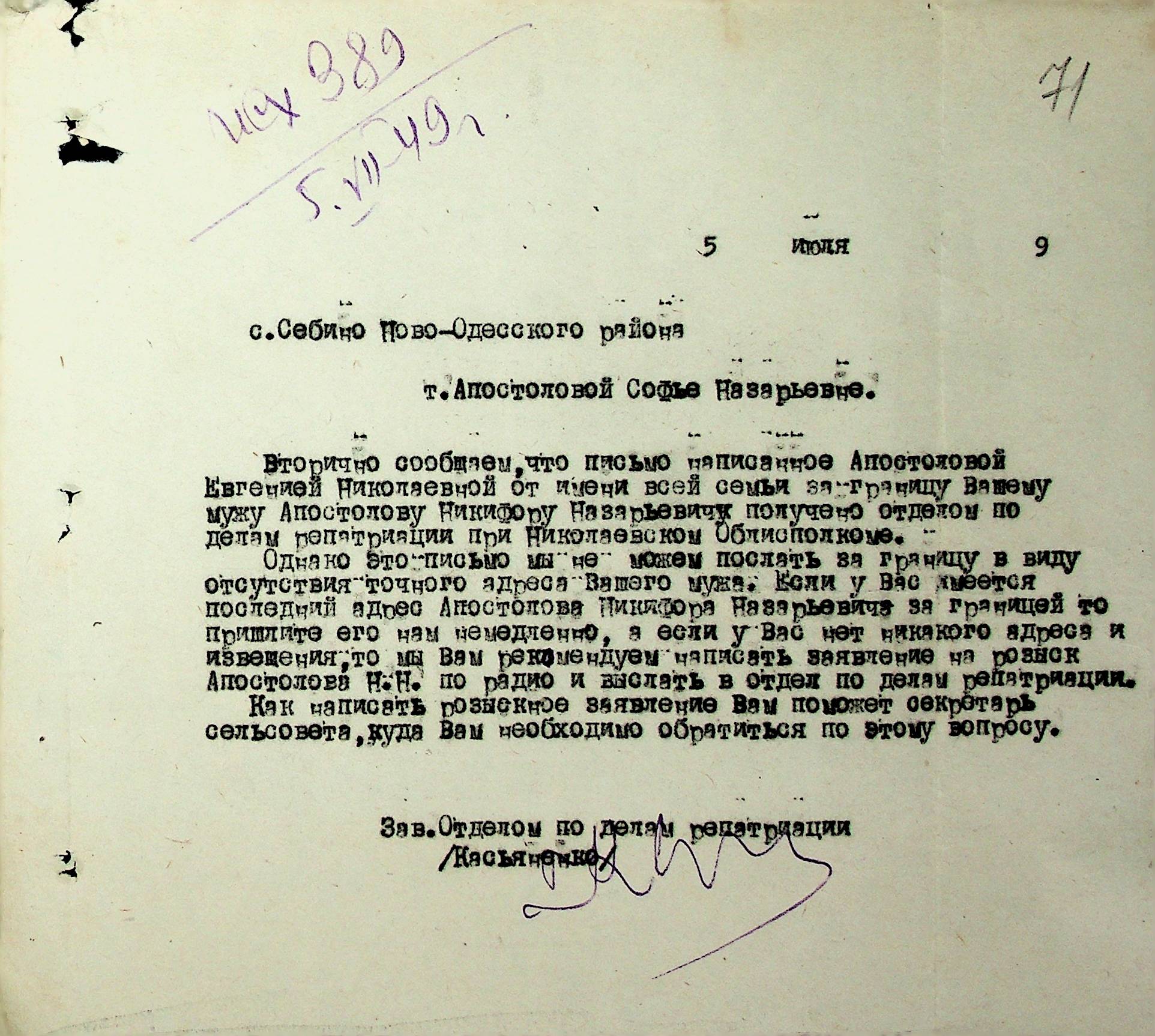 Листування відділу у справах репатріації виконкому Микола-ївської облради депутатів трудящих з відділом у справах репатріації при Раді Міністрів УРСР з питань розшуку та обліку радянських громадян”