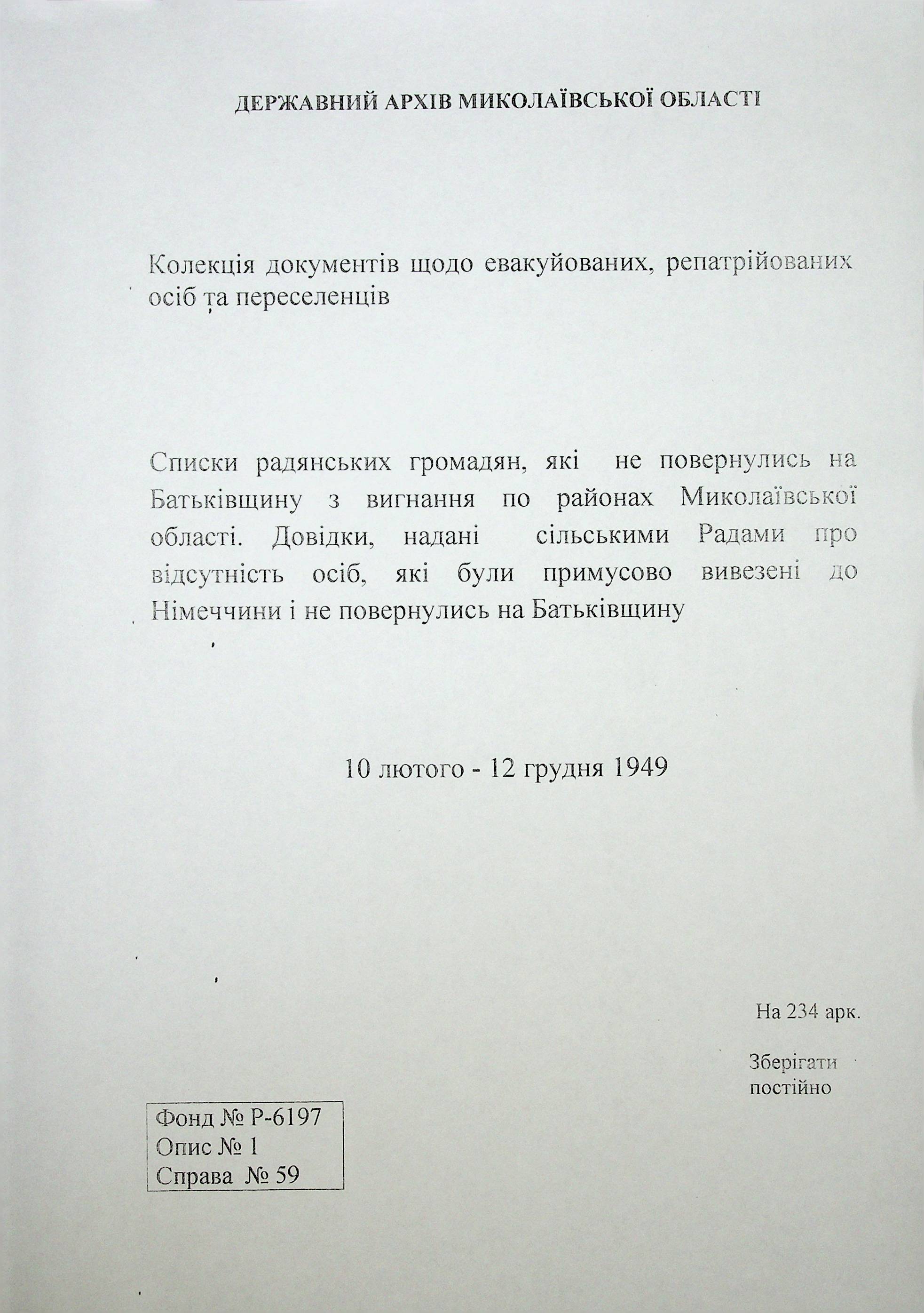 ◦ ◦ Фонд № Р-6197 “Колекція документів щодо евакуйованих, репатрійованих осіб та переселенців”