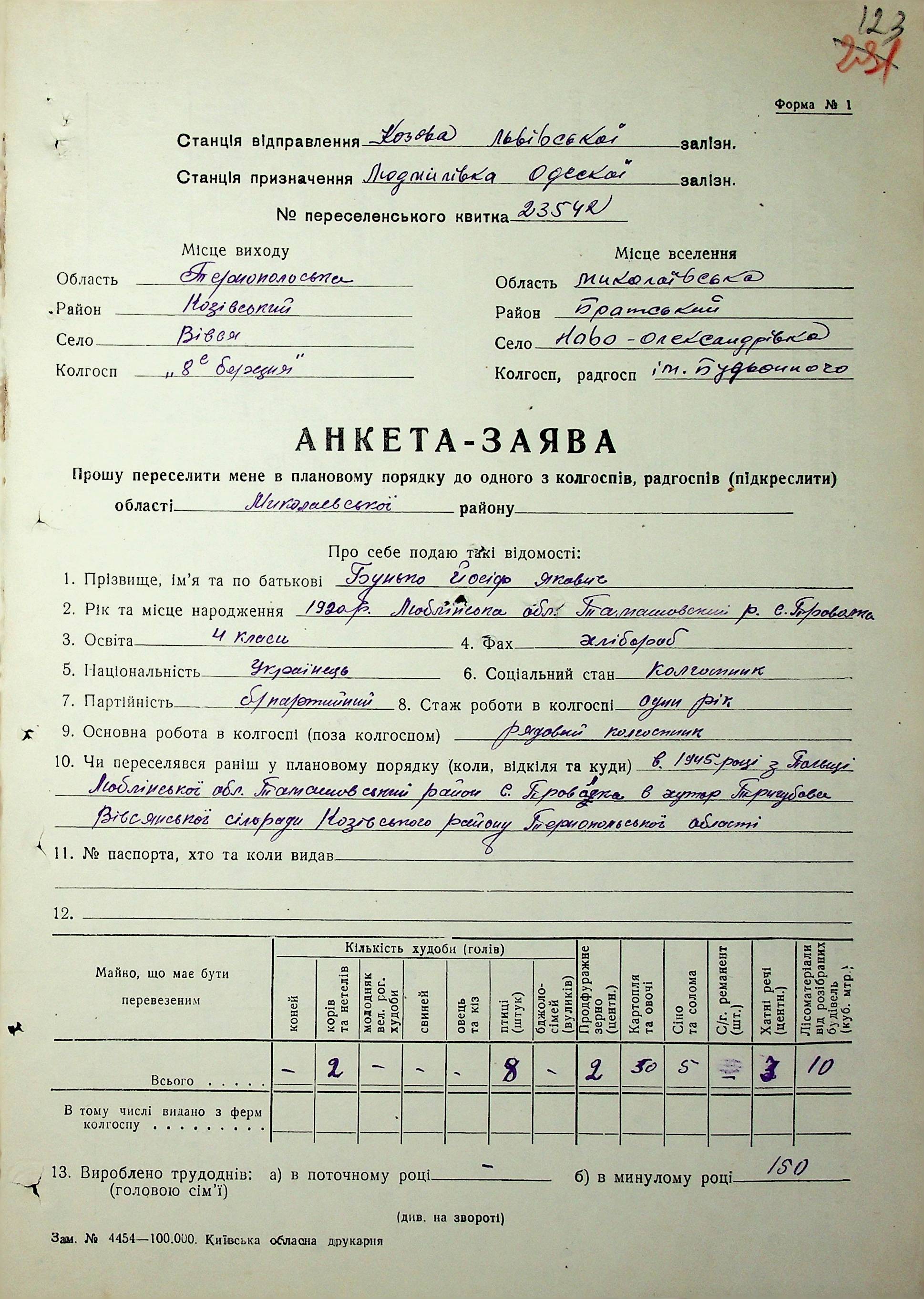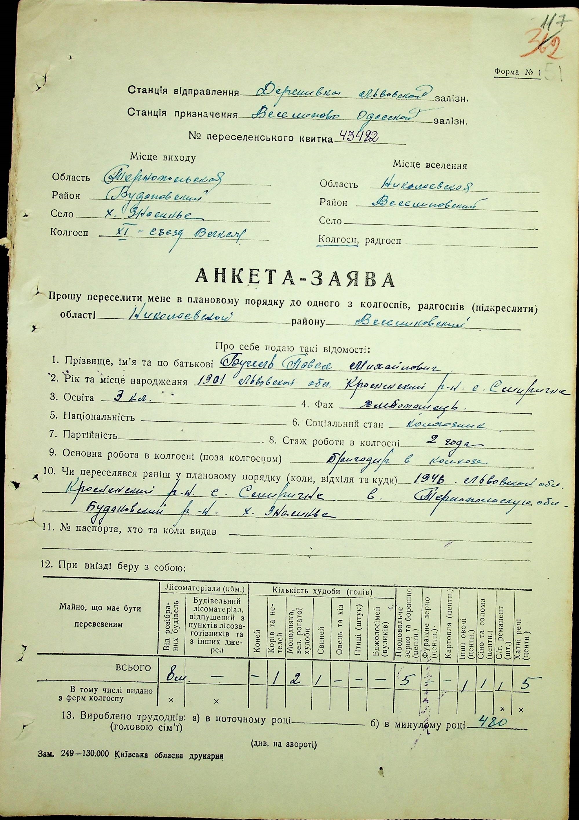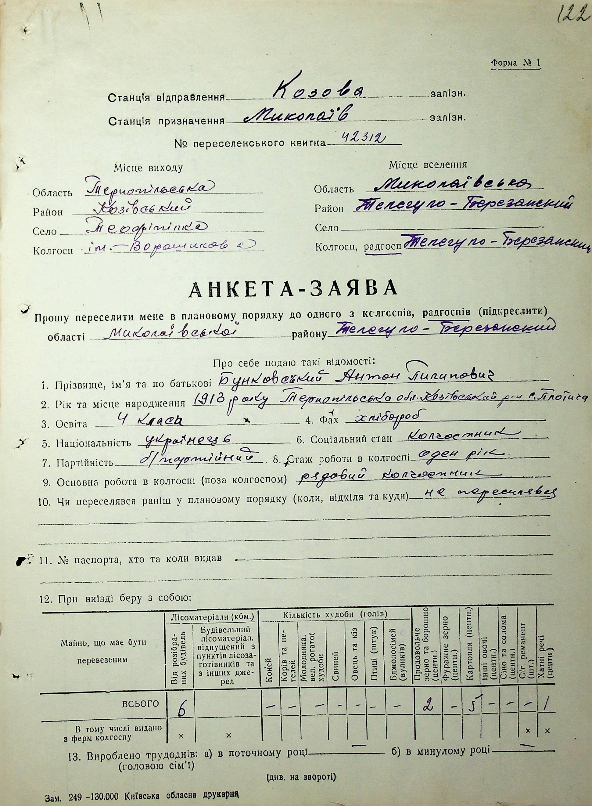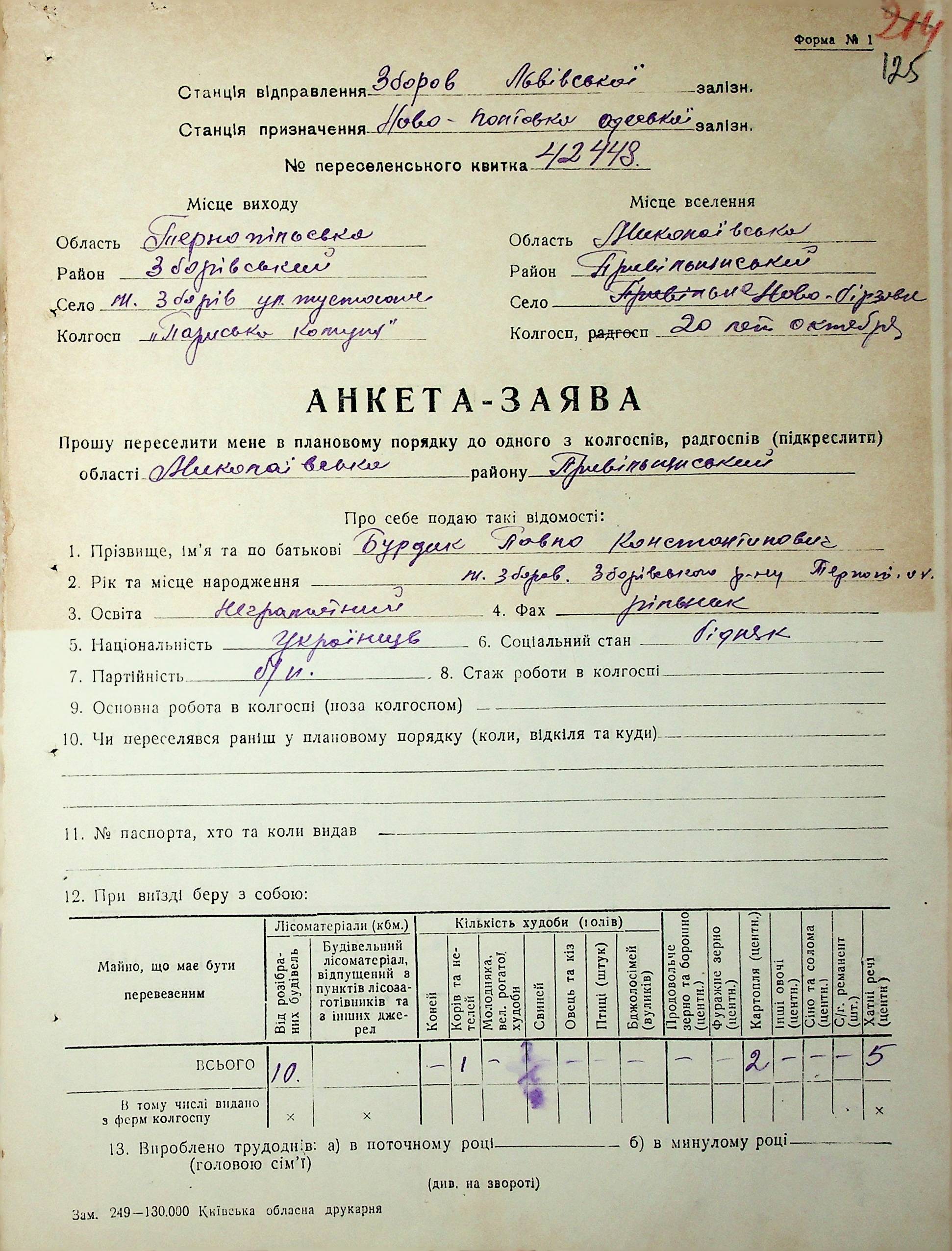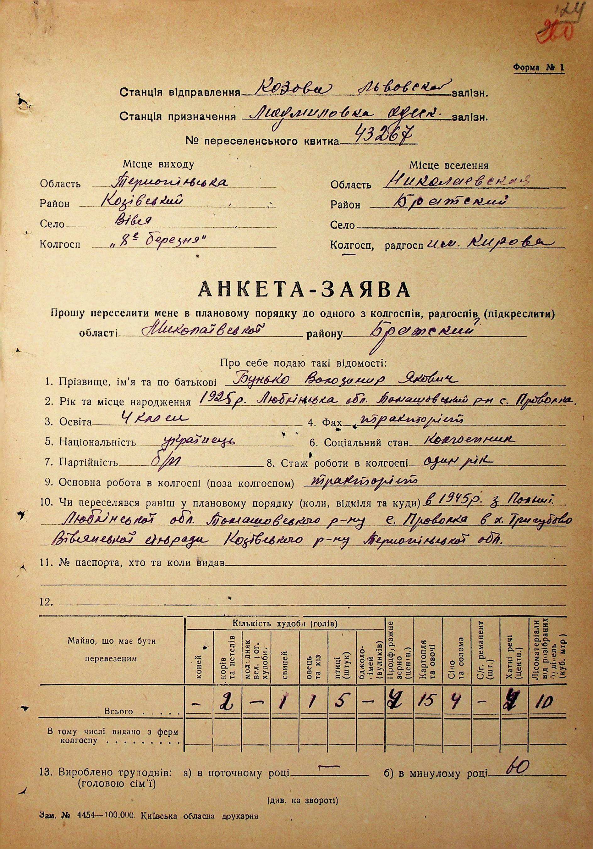 • • • • Справа № 62 “Анкети-заяви про планове переселення сімей з Тернопільської до Миколаївської області, прізвища з літери «А» по літеру «В».