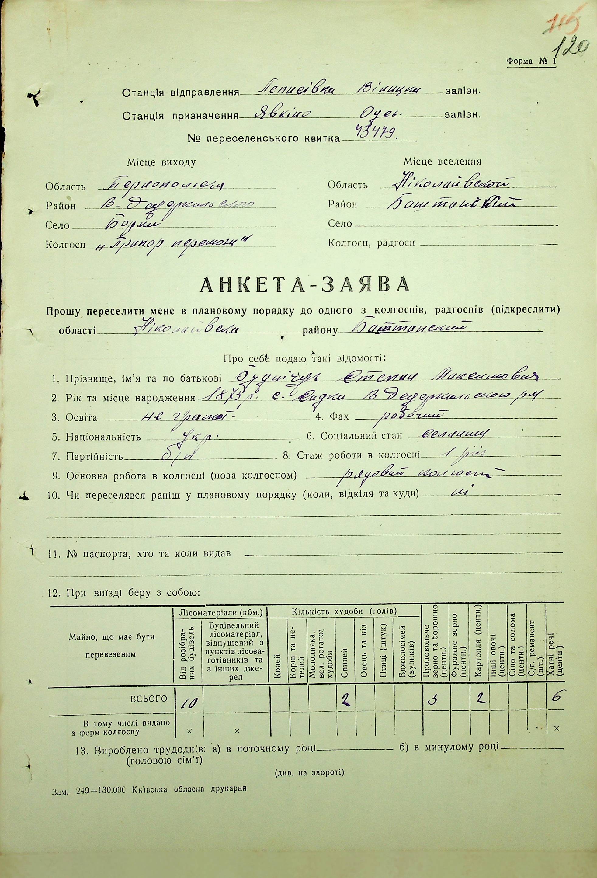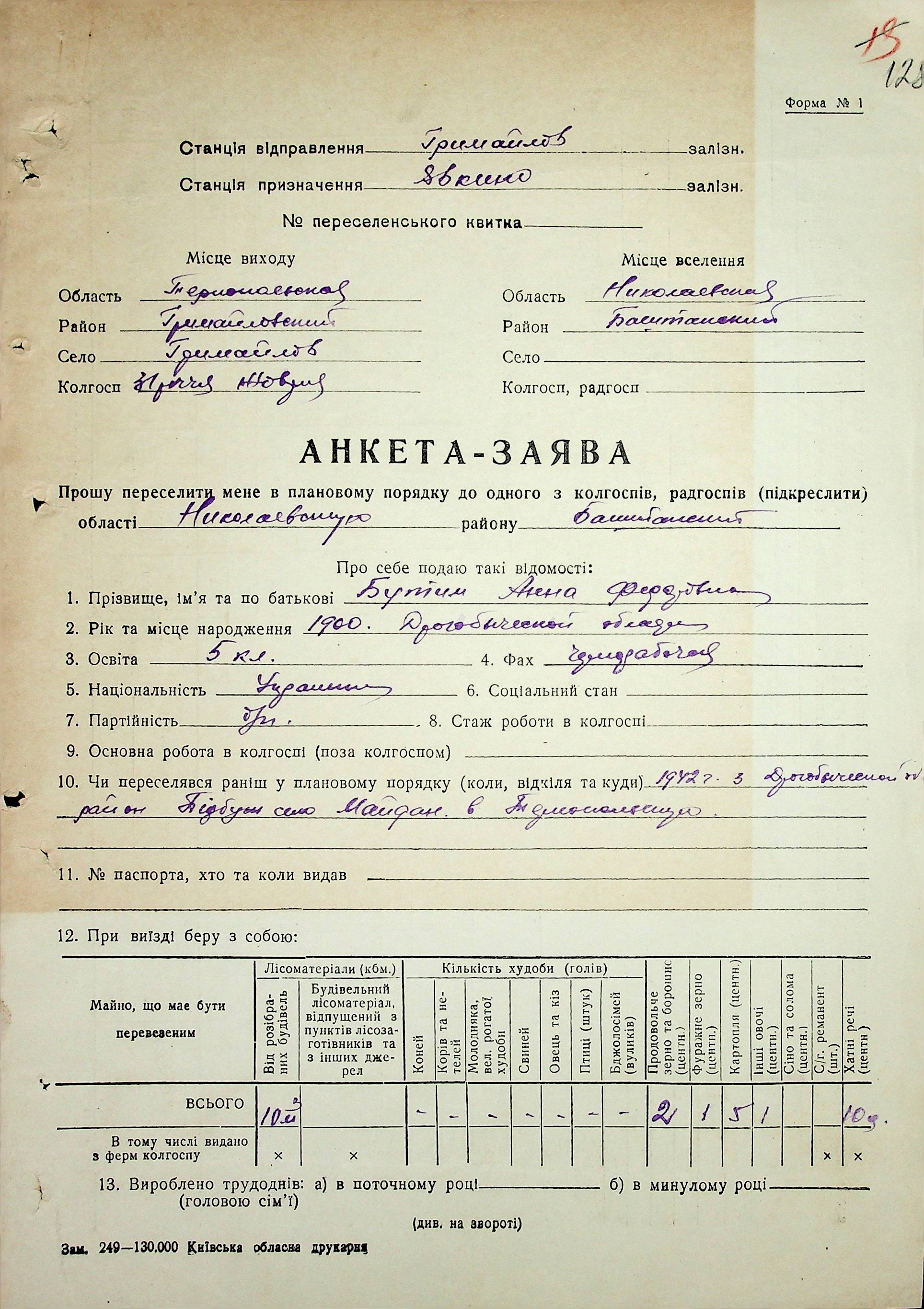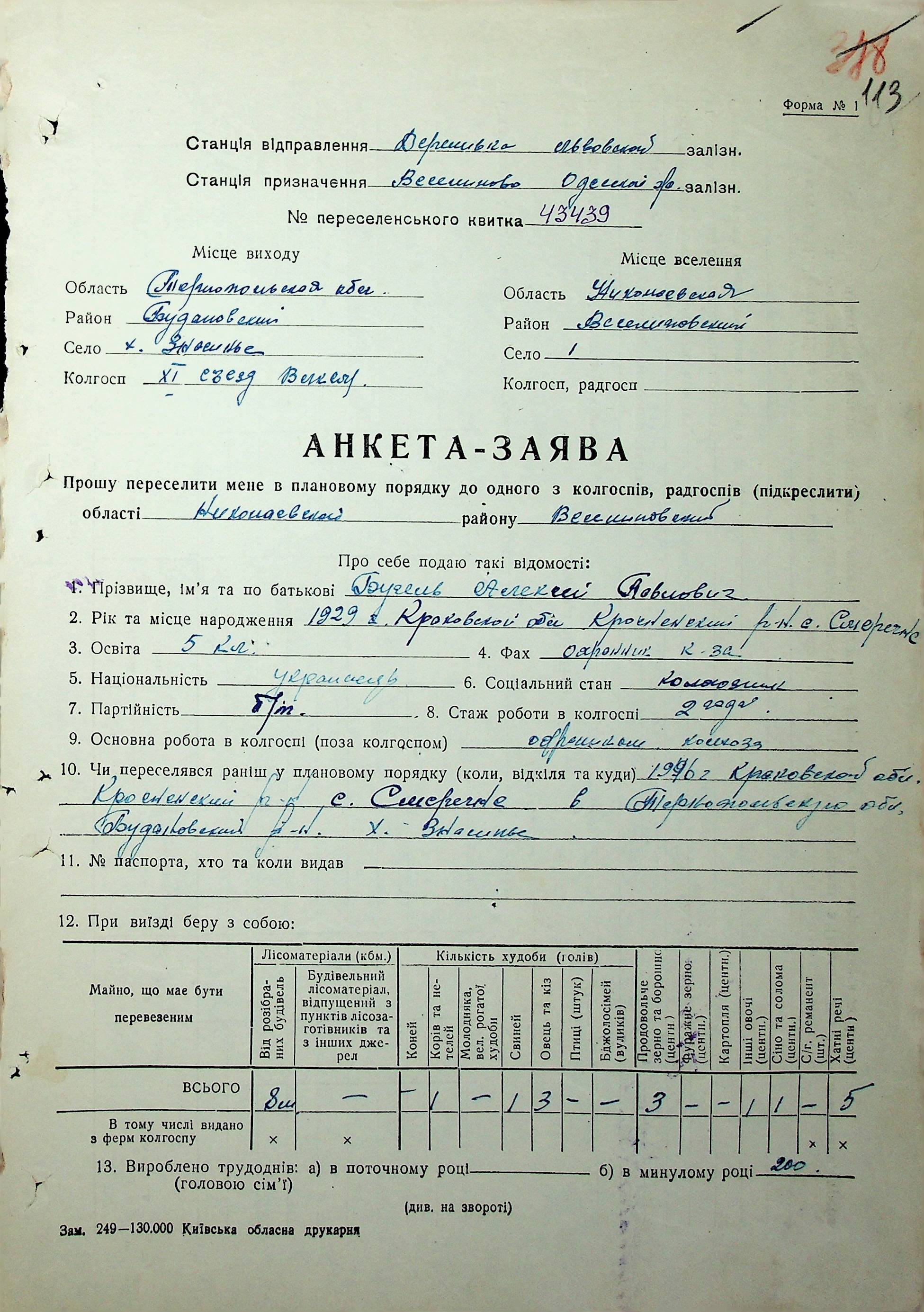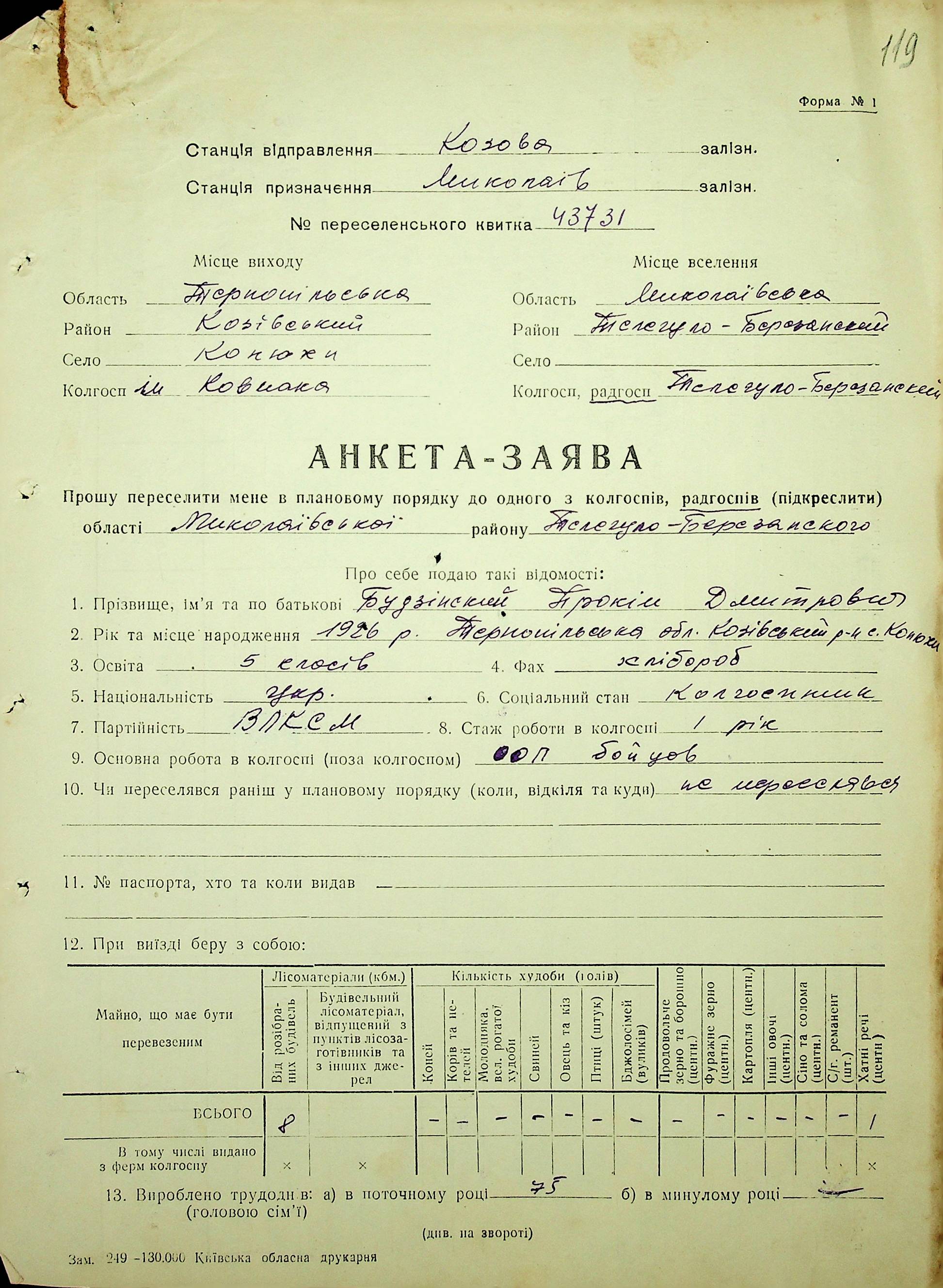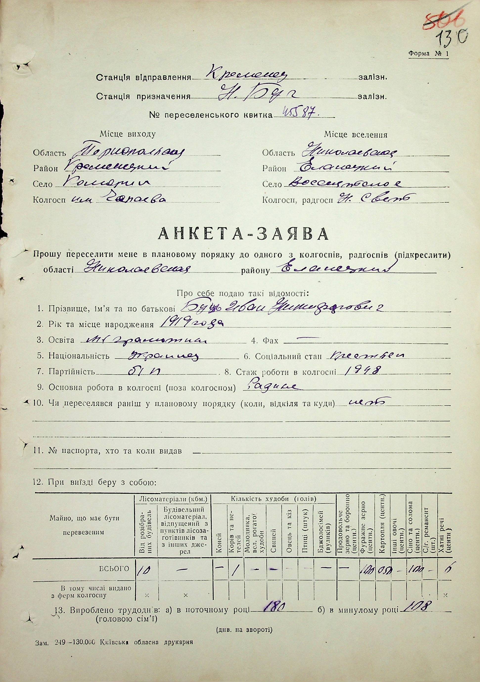 • • • • Справа № 62 “Анкети-заяви про планове переселення сімей з Тернопільської до Миколаївської області, прізвища з літери «А» по літеру «В».