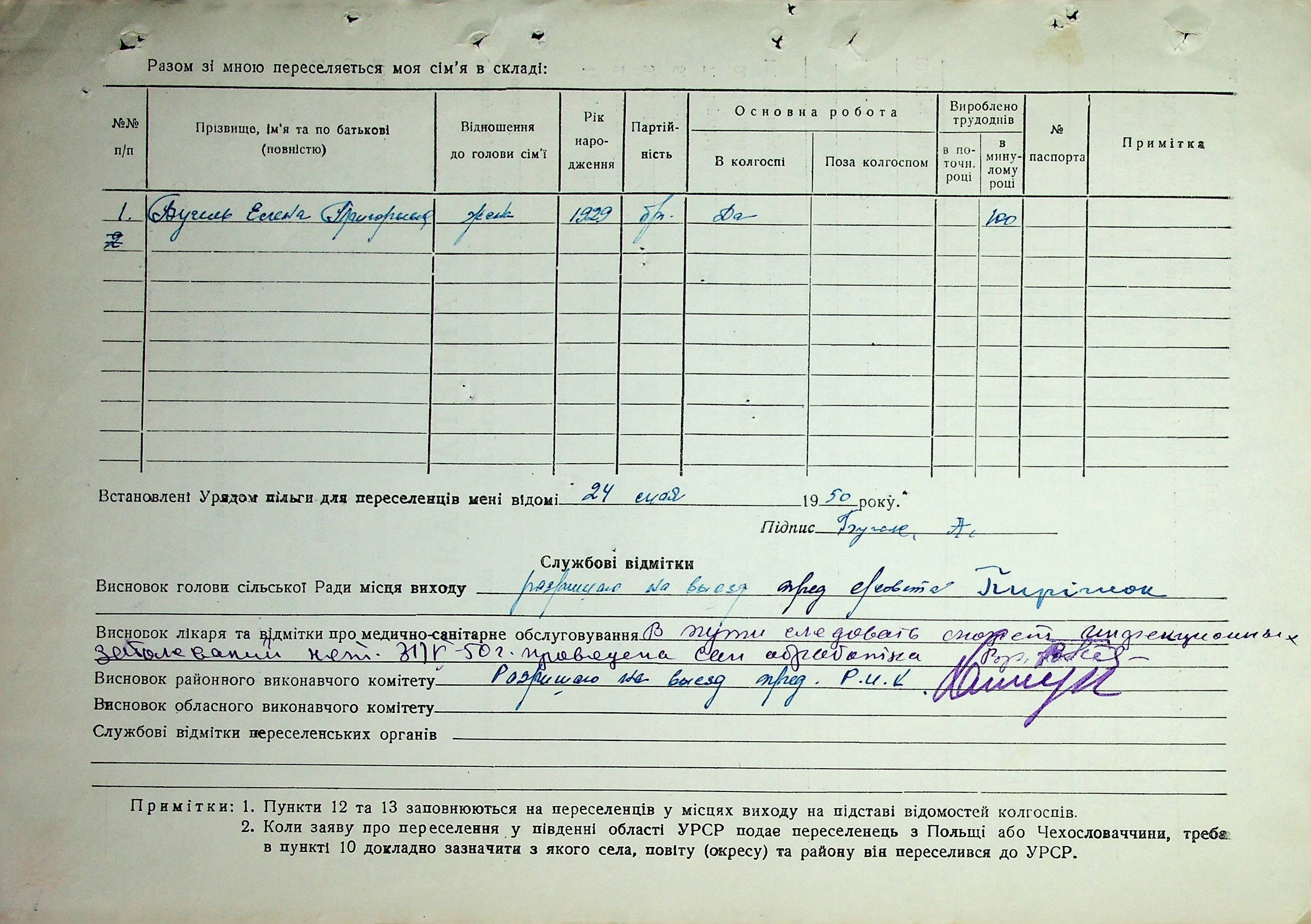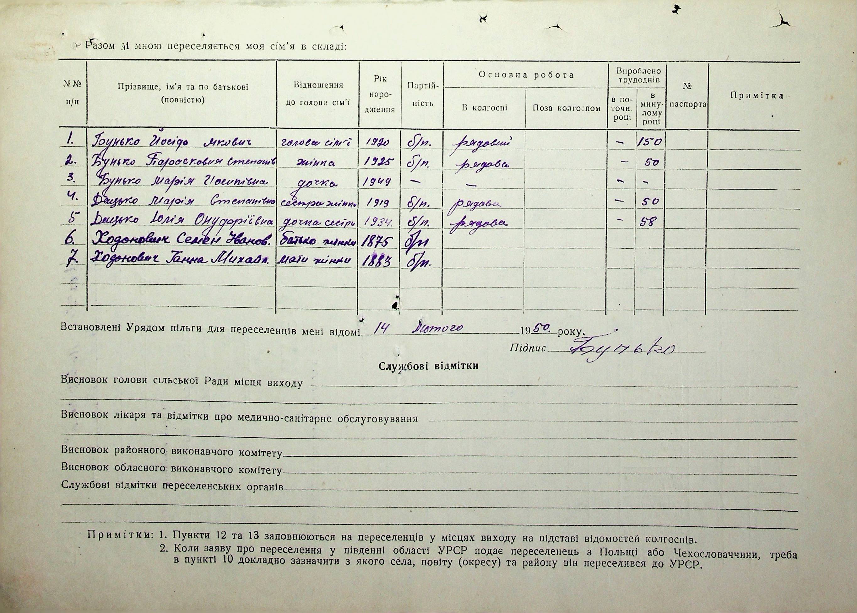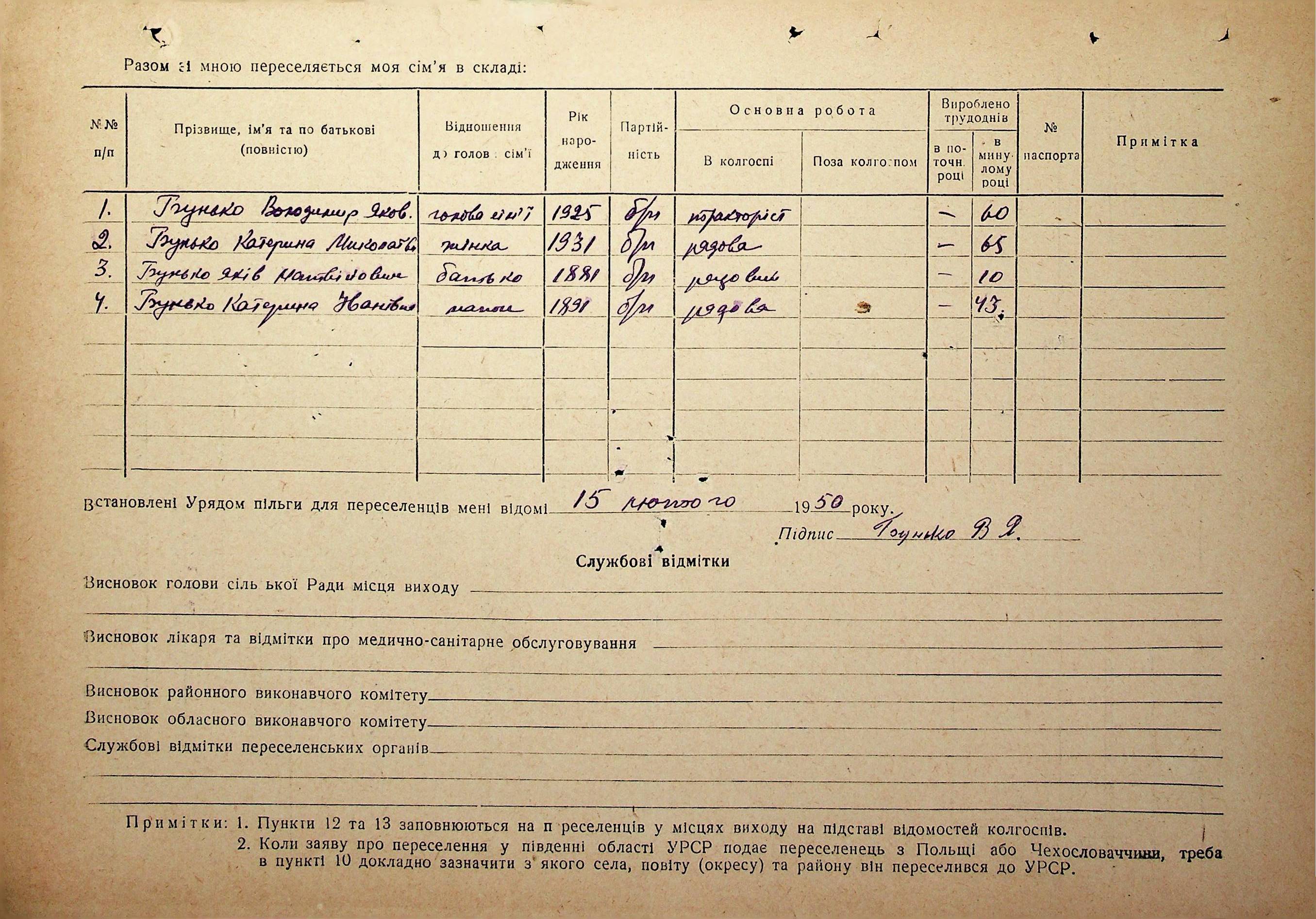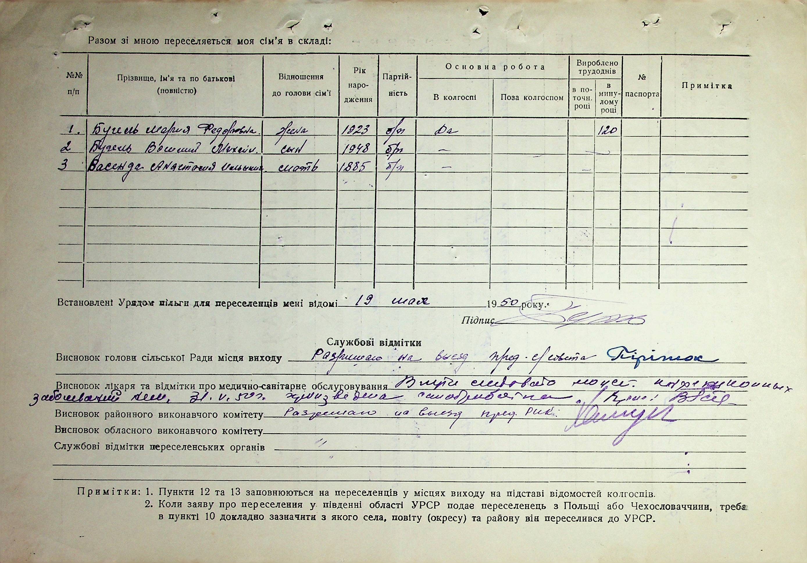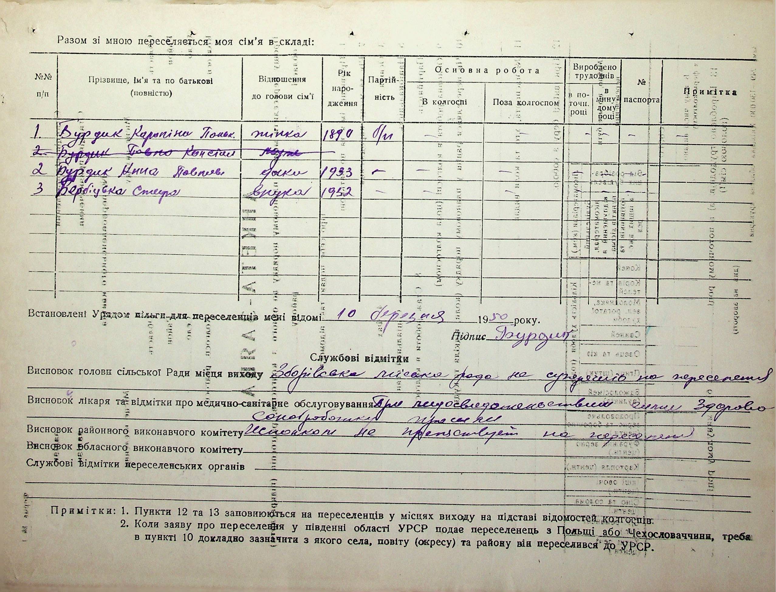 Довідки-характеристики, надані сільськими та селищними Радами депутатів трудящих на від’їжджаючих голів сімей та склад їх родин”